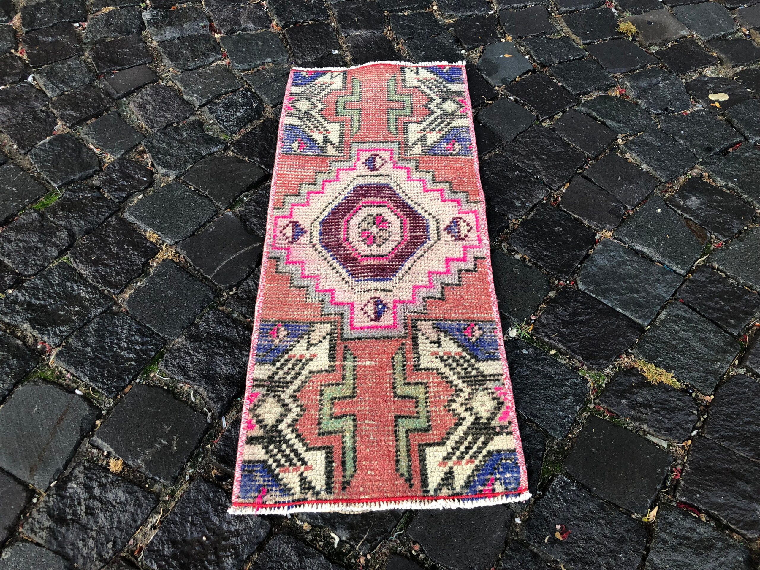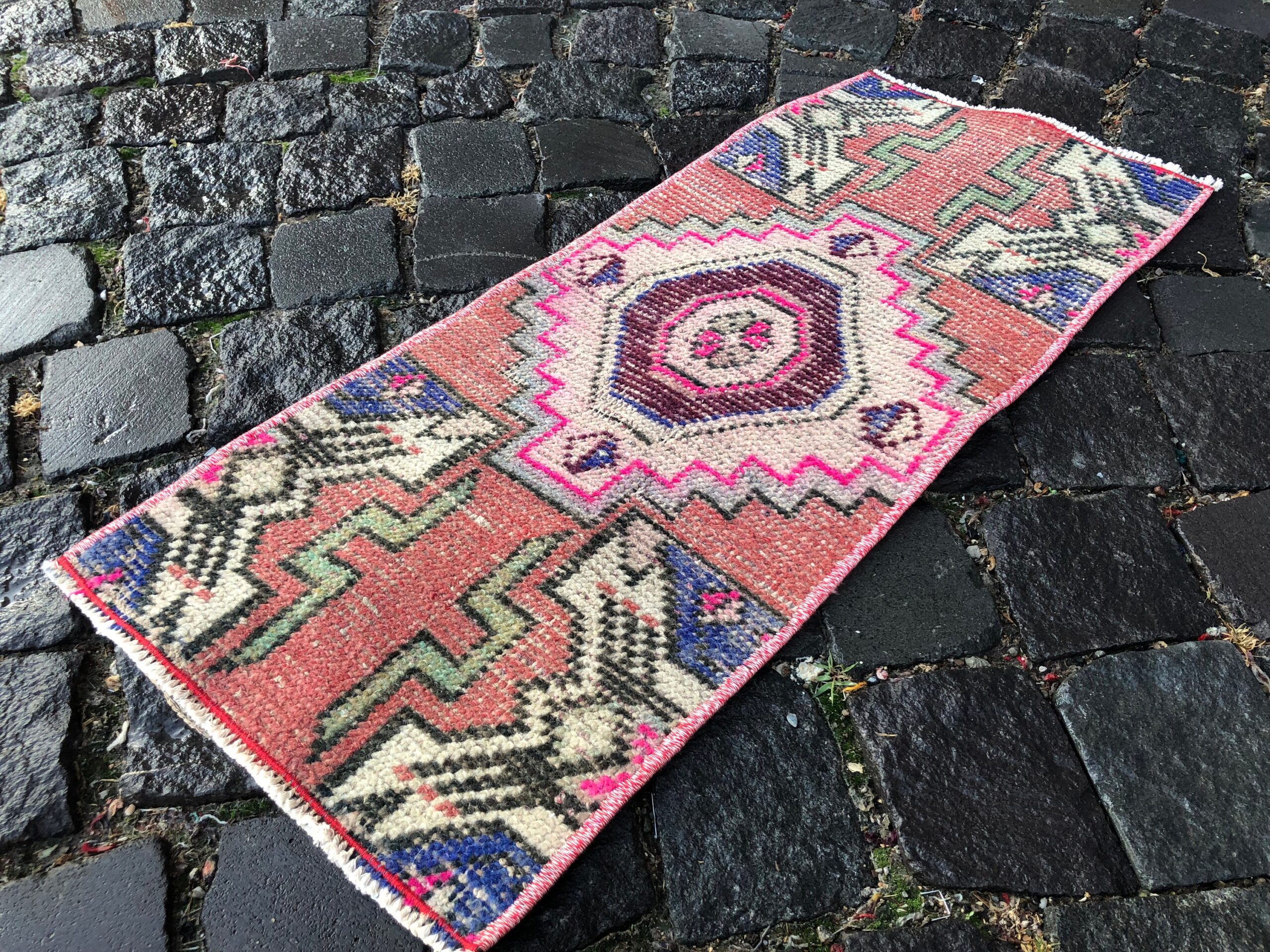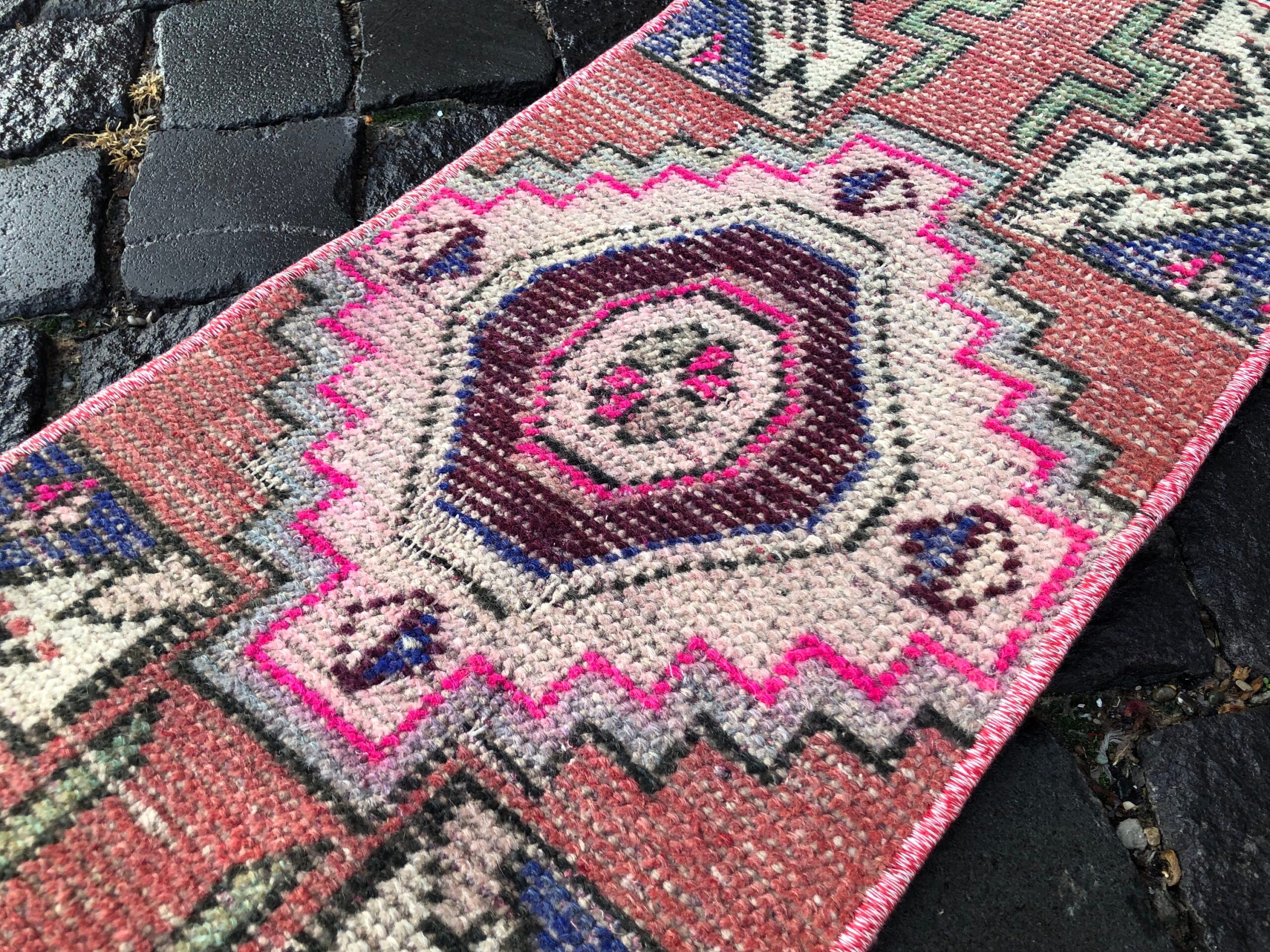 Lovely and unique 1.1 ft. x 2.6 ft. (33 cm x 80 cm) vintage Turkish rug hand-knotted in Turkey from organic wool. This is an authentic vintage Turkish rug from the 1990s that has worn beautifully to perfection.