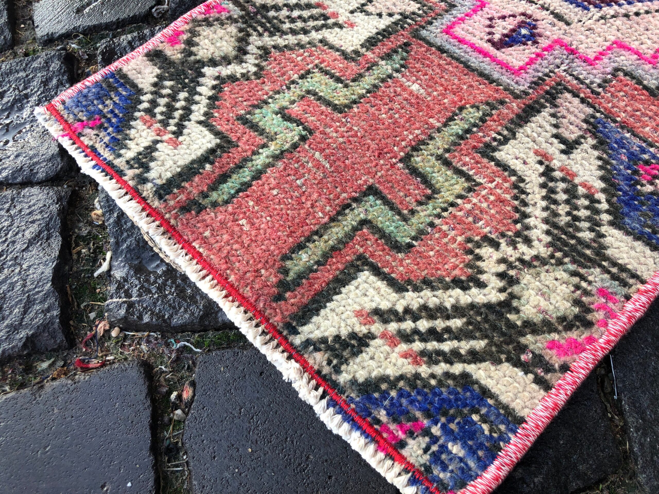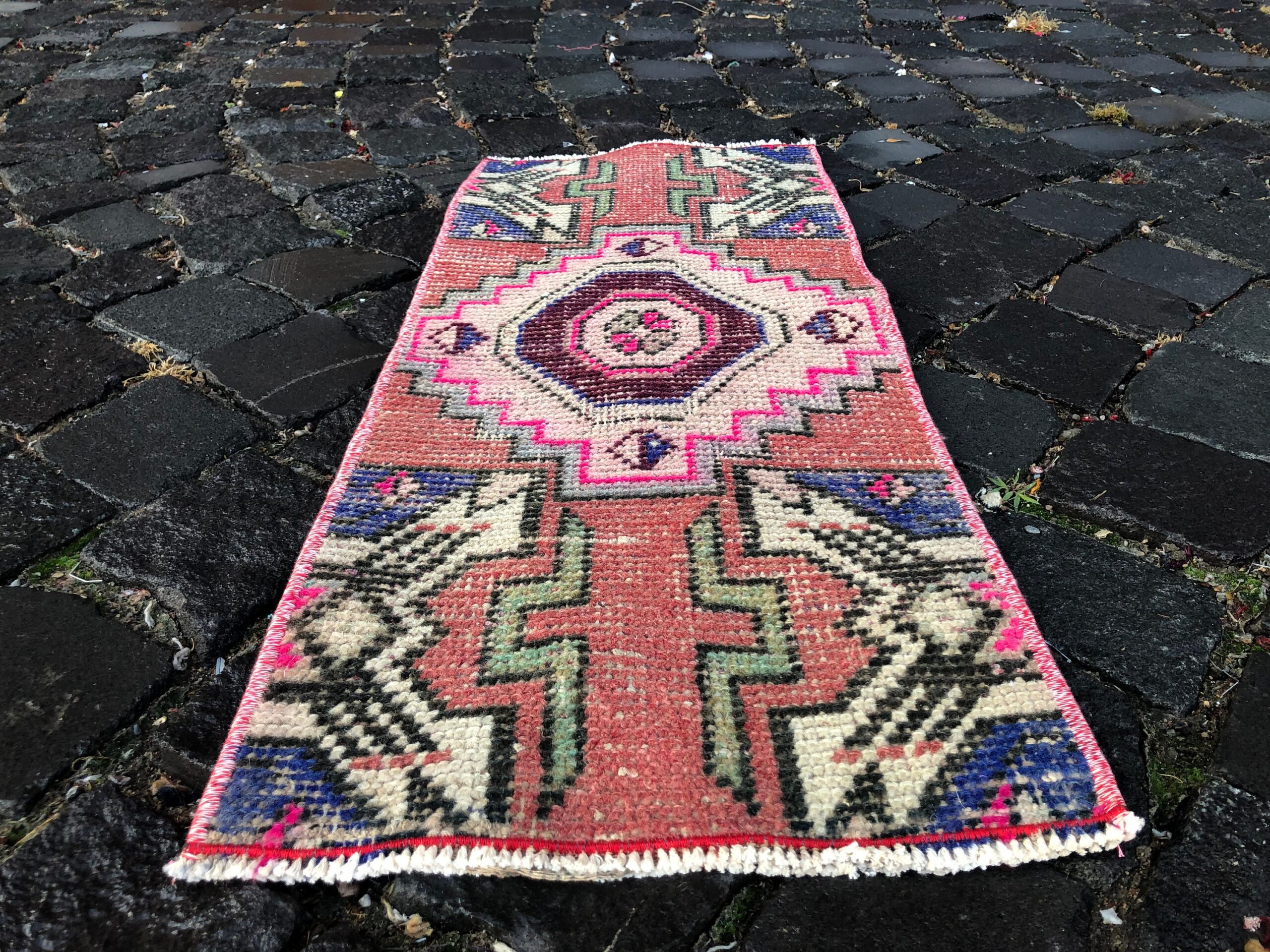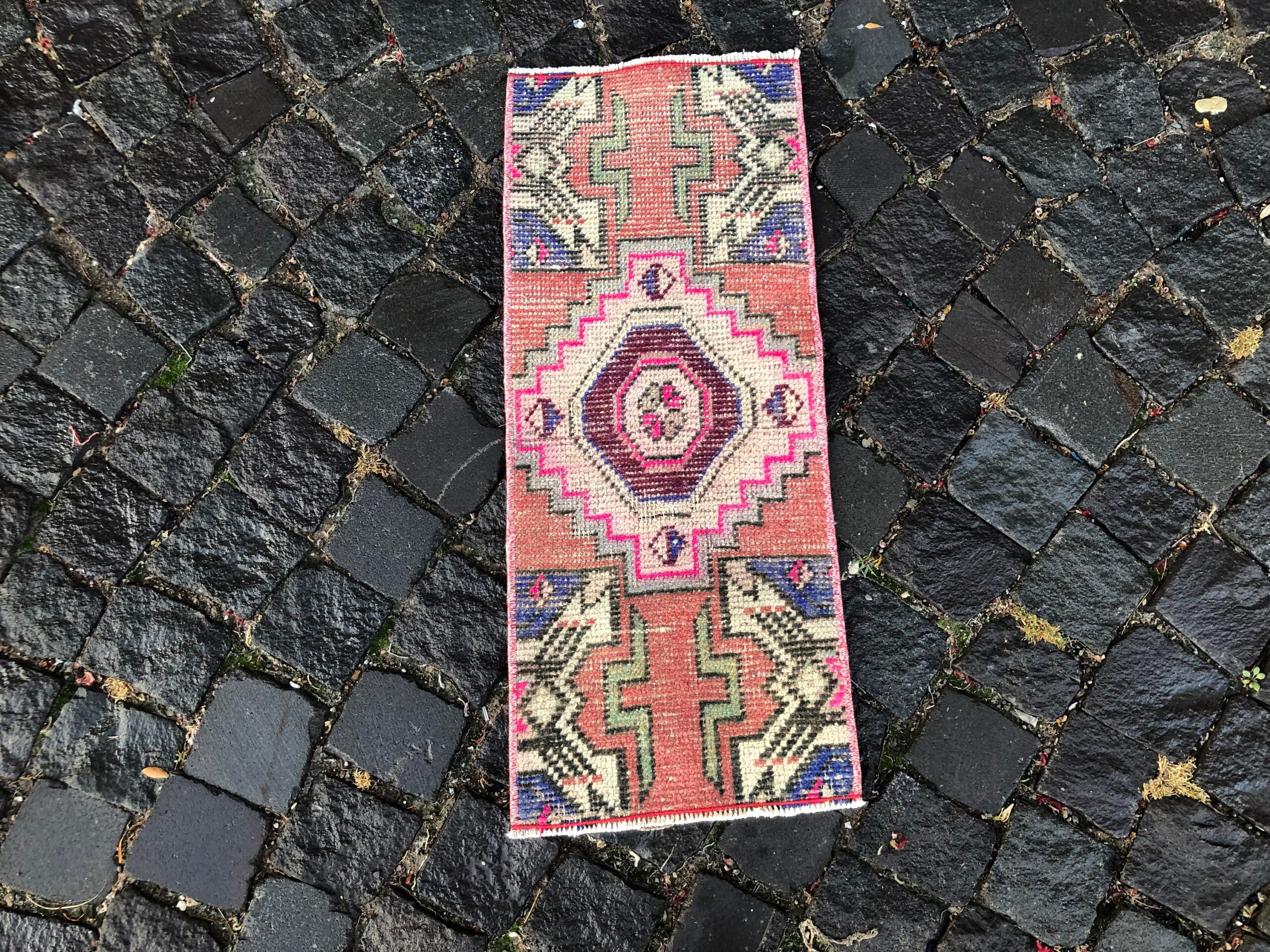 Lovely and unique 1.1 ft. x 2.6 ft. (33 cm x 80 cm) vintage Turkish rug hand-knotted in Turkey from organic wool. This is an authentic vintage Turkish rug from the 1990s that has worn beautifully to perfection.