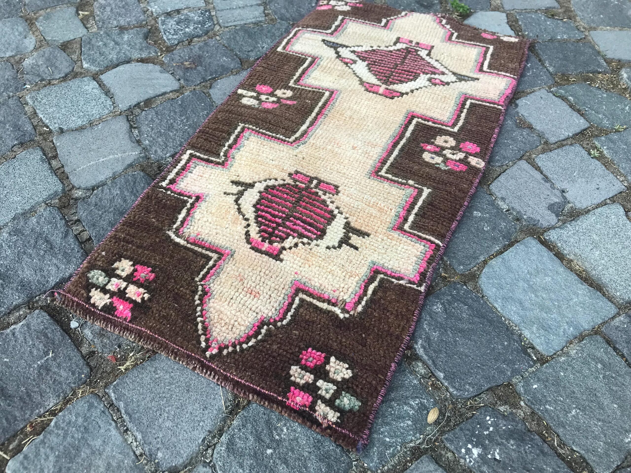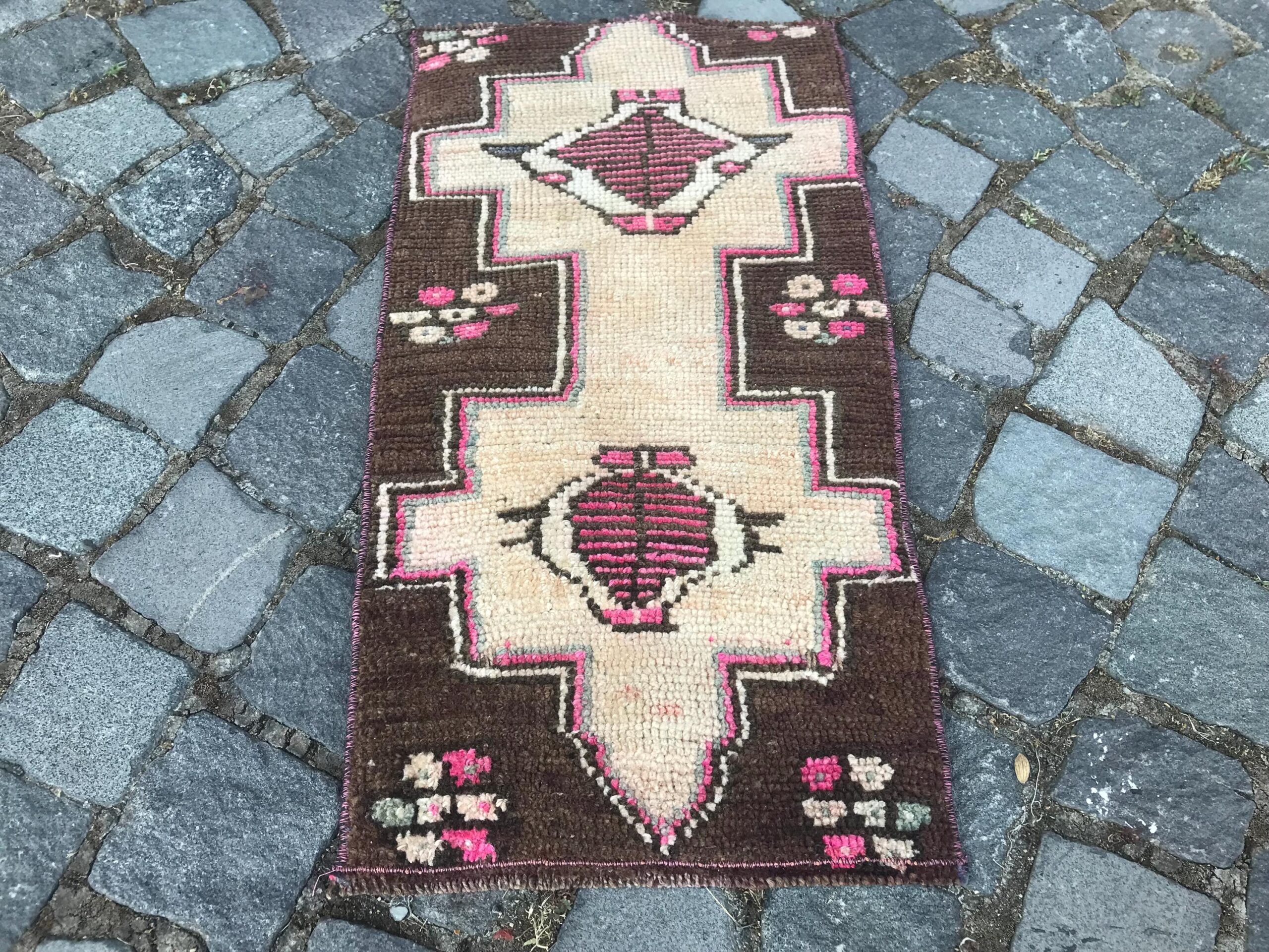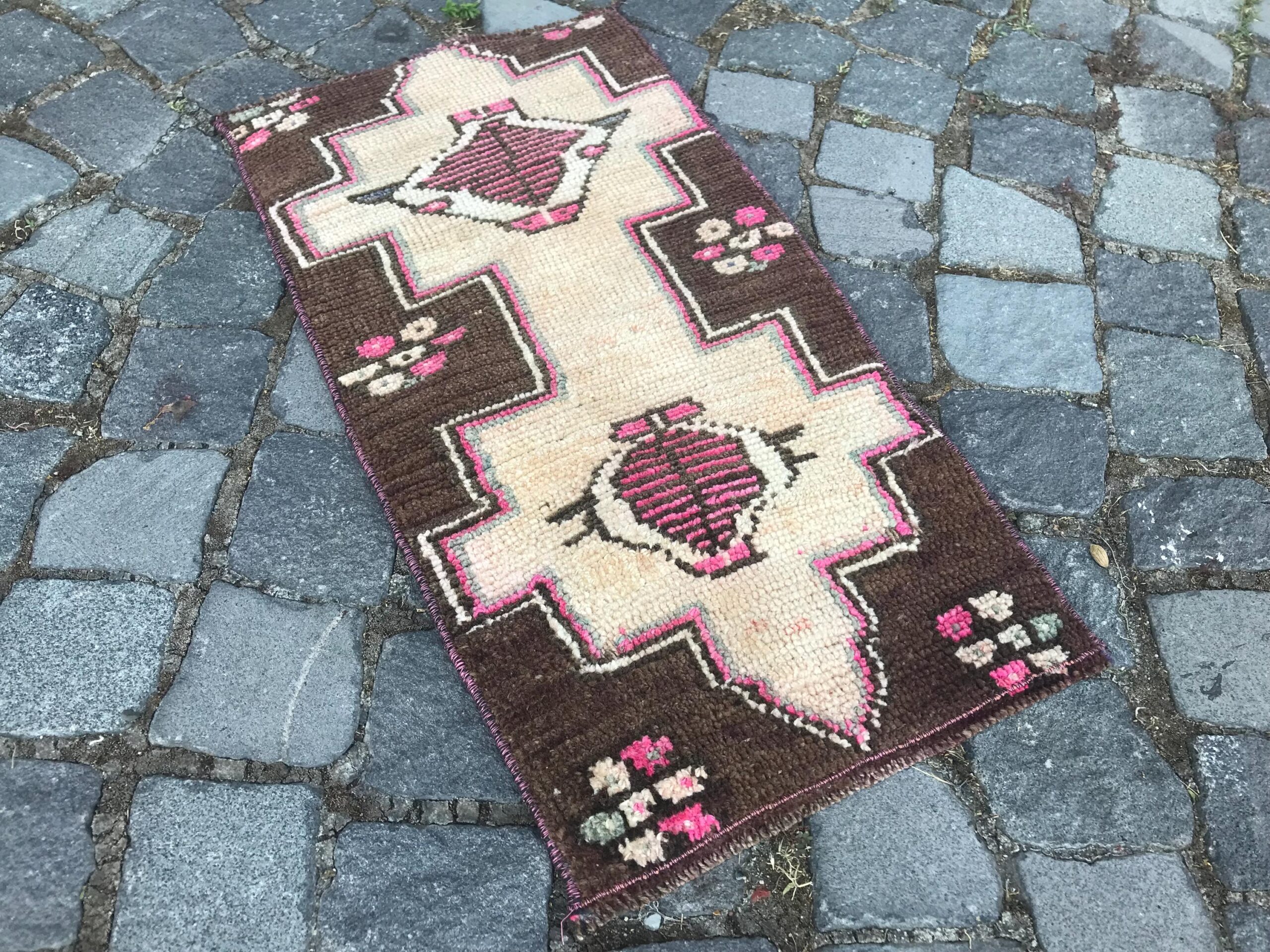 Beautiful and one-of-a-kind 1.2 ft. x 2.3 ft. (36 cm x 70 cm) vintage Turkish rug hand-knotted in Turkey from organic wool. This is an authentic vintage Turkish rug from the 1980s that has worn admirably to perfection.
