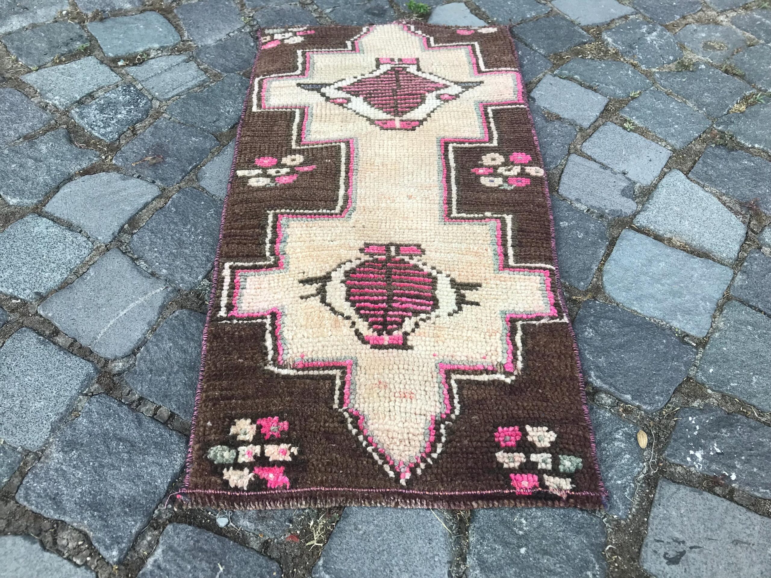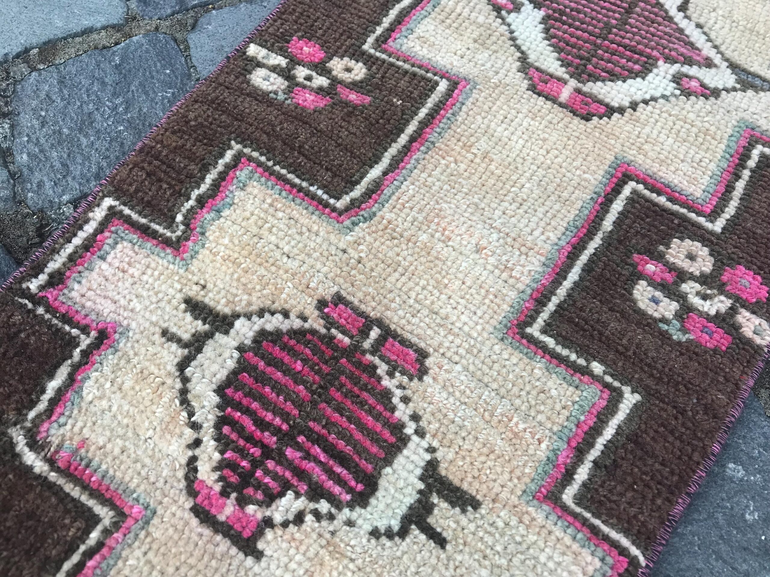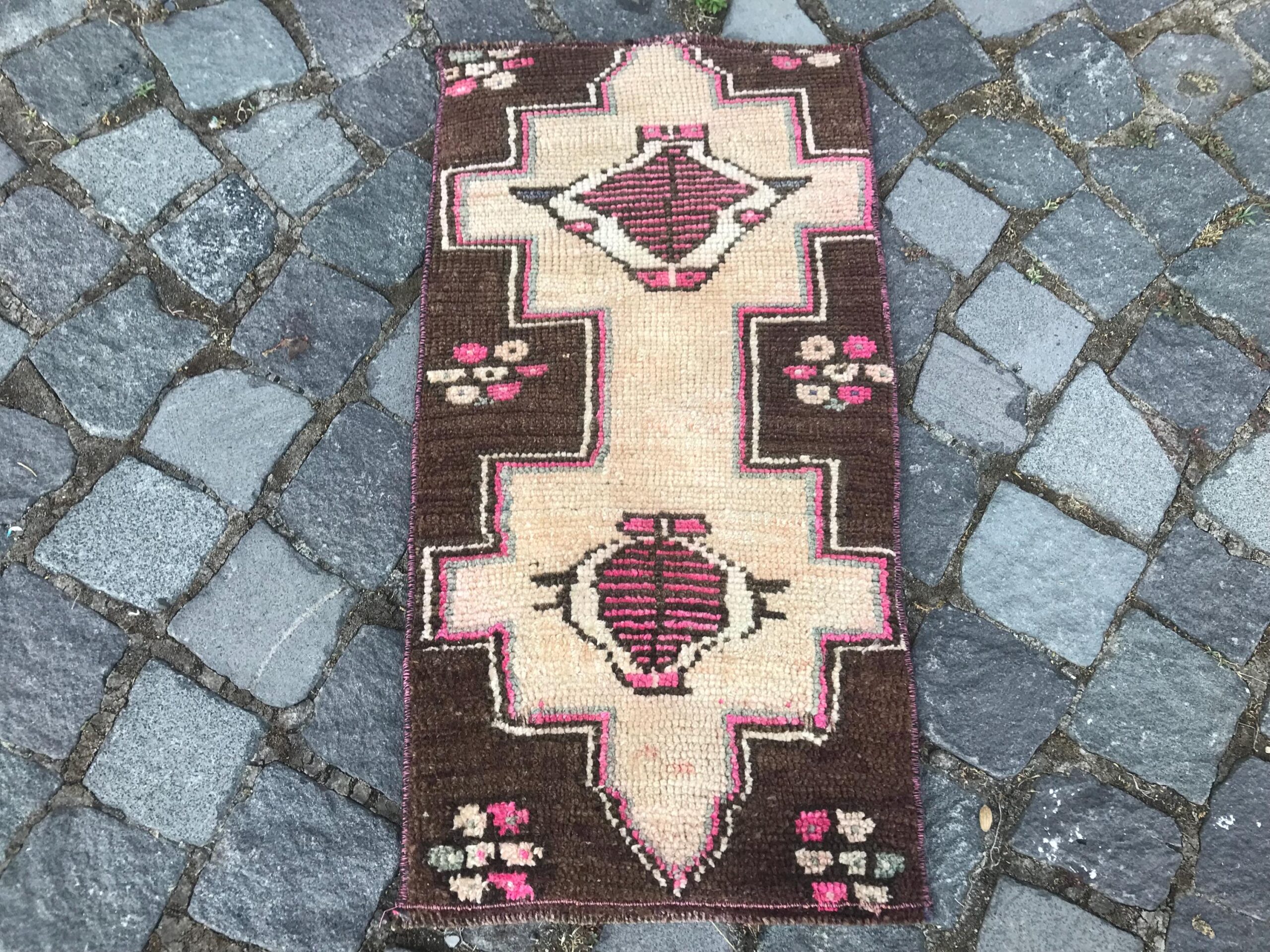 Beautiful and one-of-a-kind 1.2 ft. x 2.3 ft. (36 cm x 70 cm) vintage Turkish rug hand-knotted in Turkey from organic wool. This is an authentic vintage Turkish rug from the 1980s that has worn admirably to perfection.