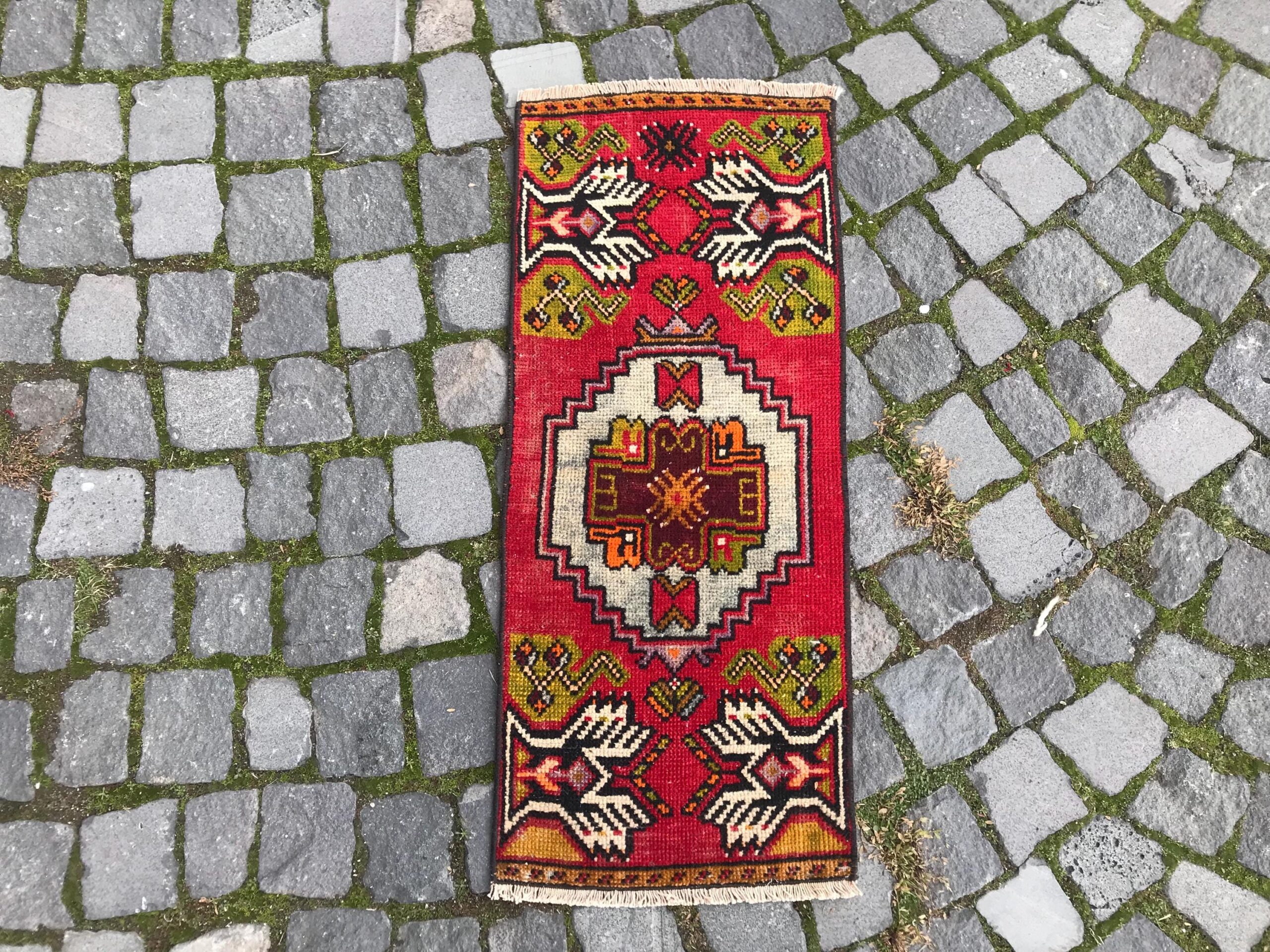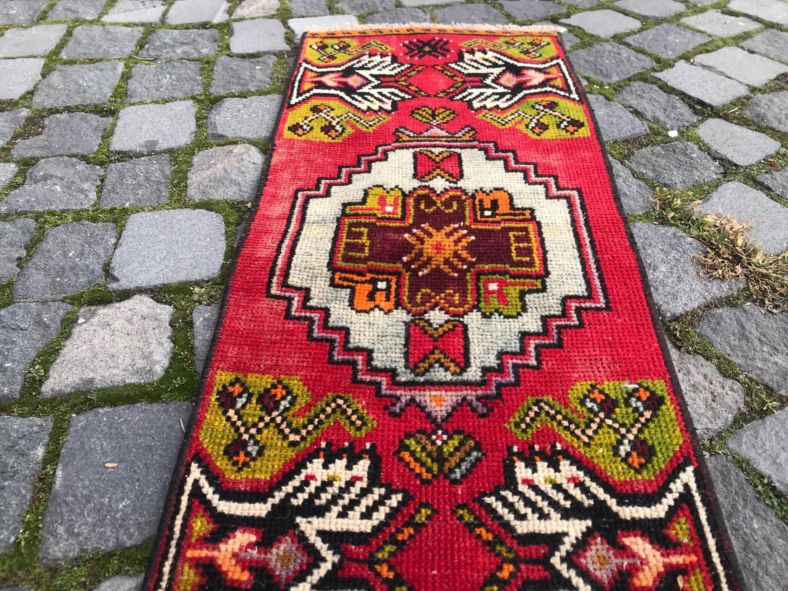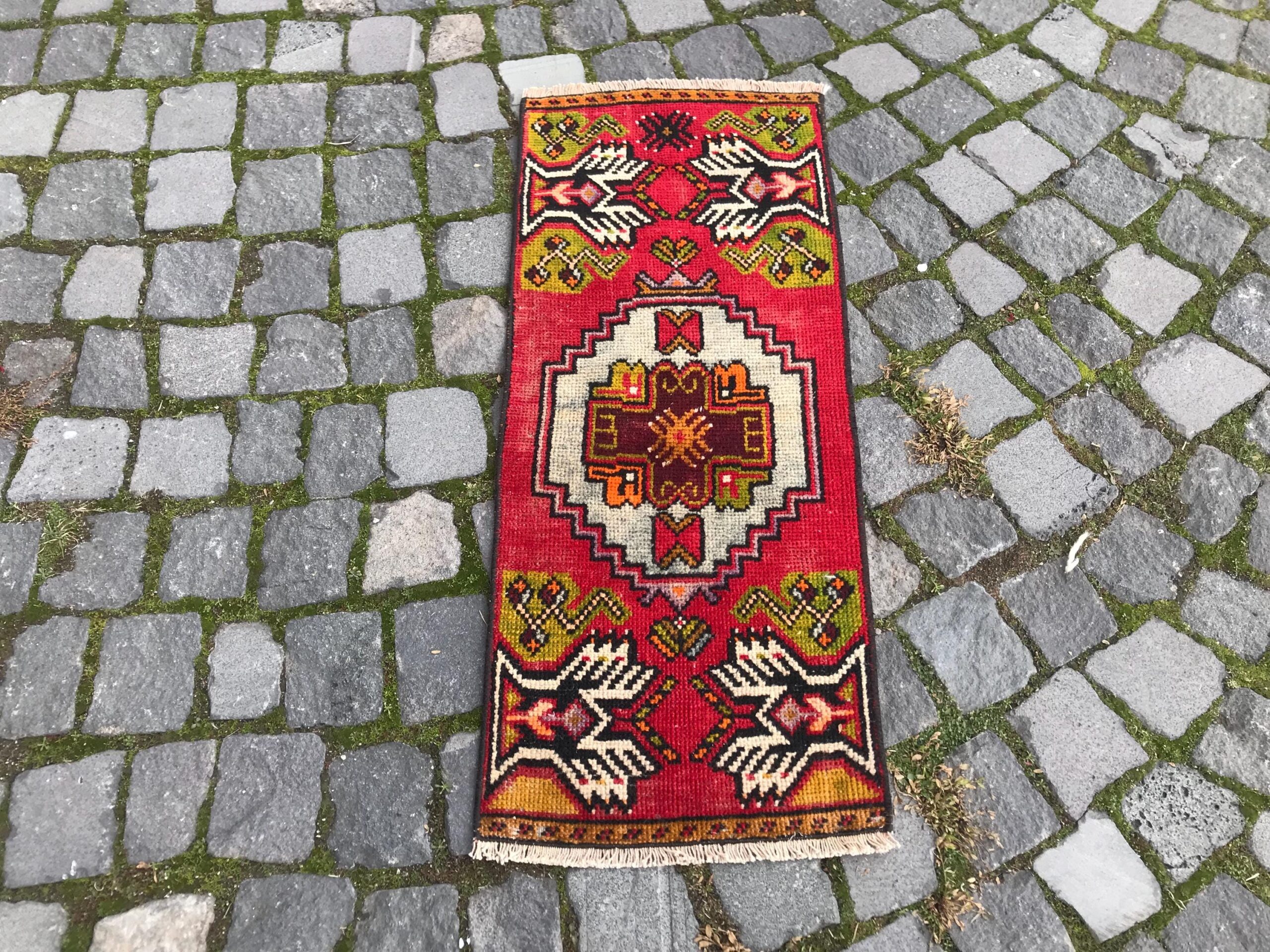 Beautiful and one-of-a-kind 1.2 ft. x 2.9 ft. (37 cm x 89 cm) vintage Turkish rug hand-knotted in Turkey from organic wool. This is an authentic vintage Turkish rug from the 1990s that has worn admirably to perfection.
