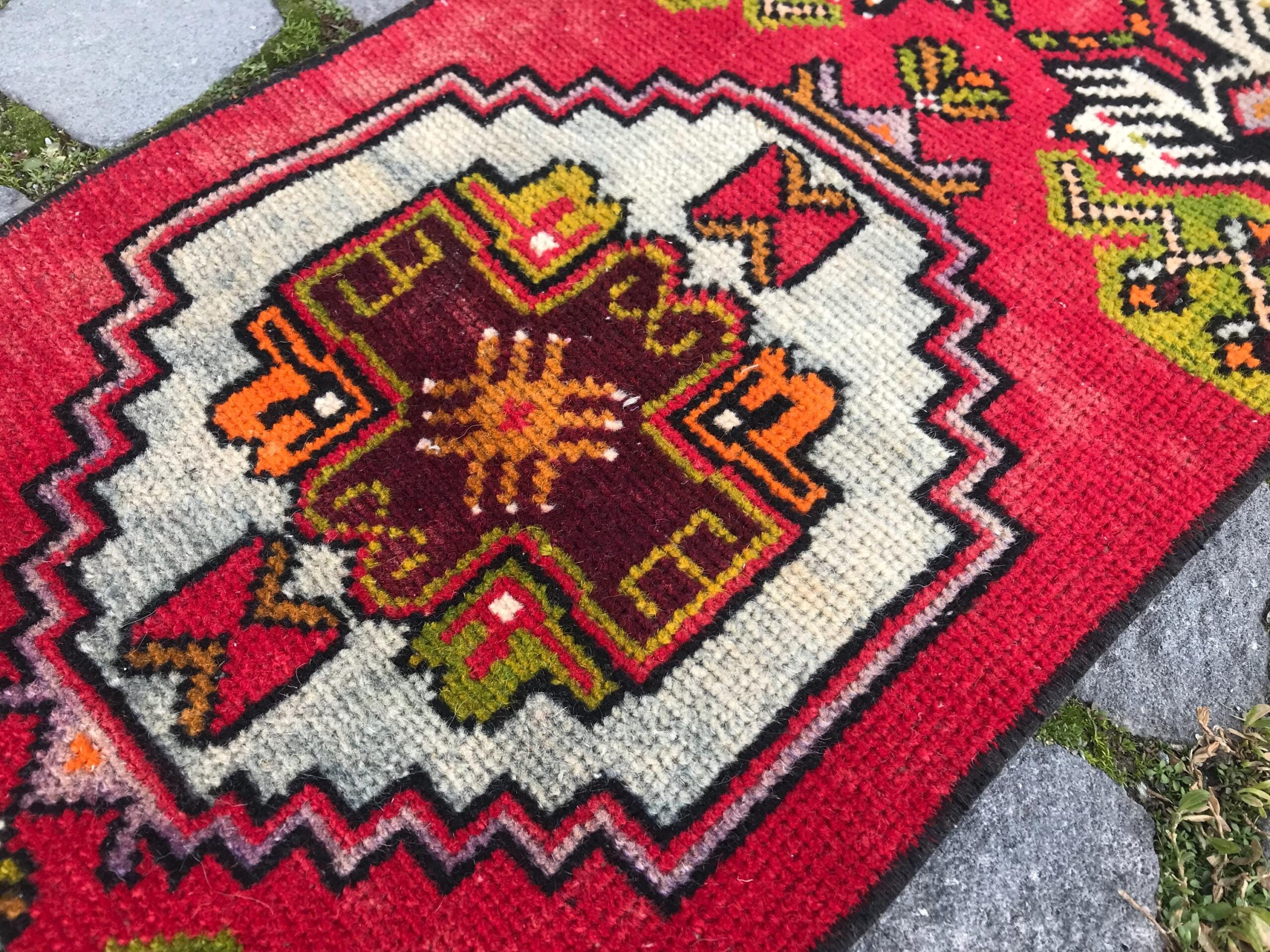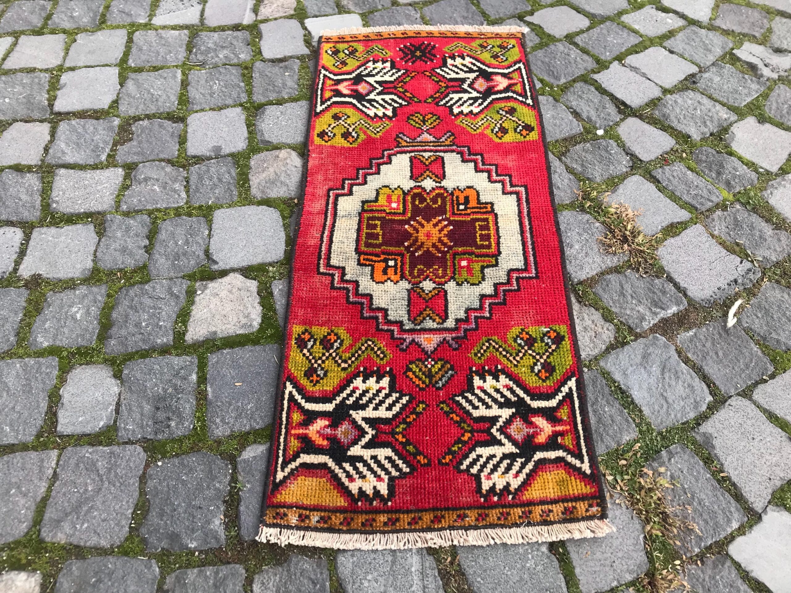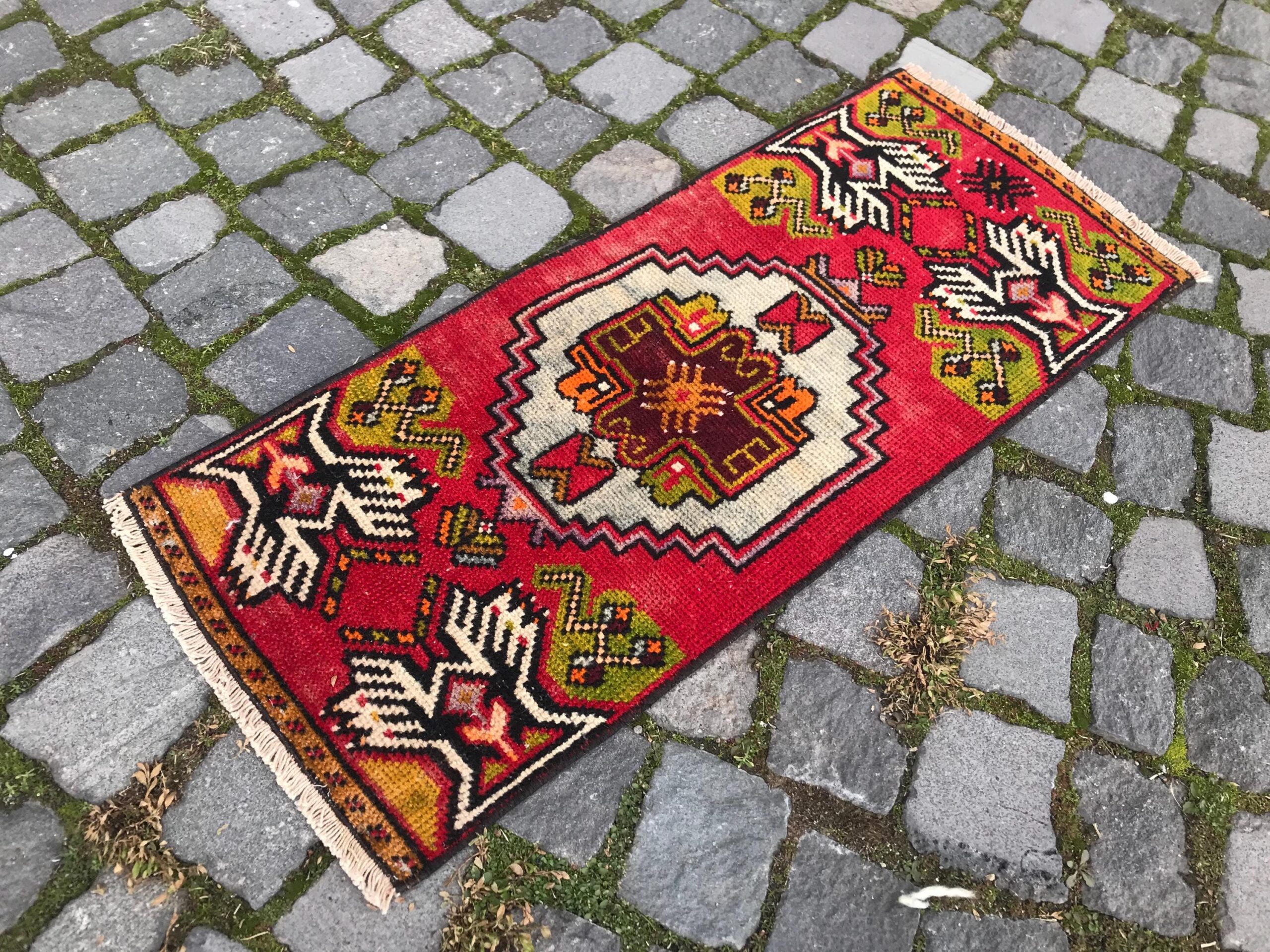 Beautiful and one-of-a-kind 1.2 ft. x 2.9 ft. (37 cm x 89 cm) vintage Turkish rug hand-knotted in Turkey from organic wool. This is an authentic vintage Turkish rug from the 1990s that has worn admirably to perfection.