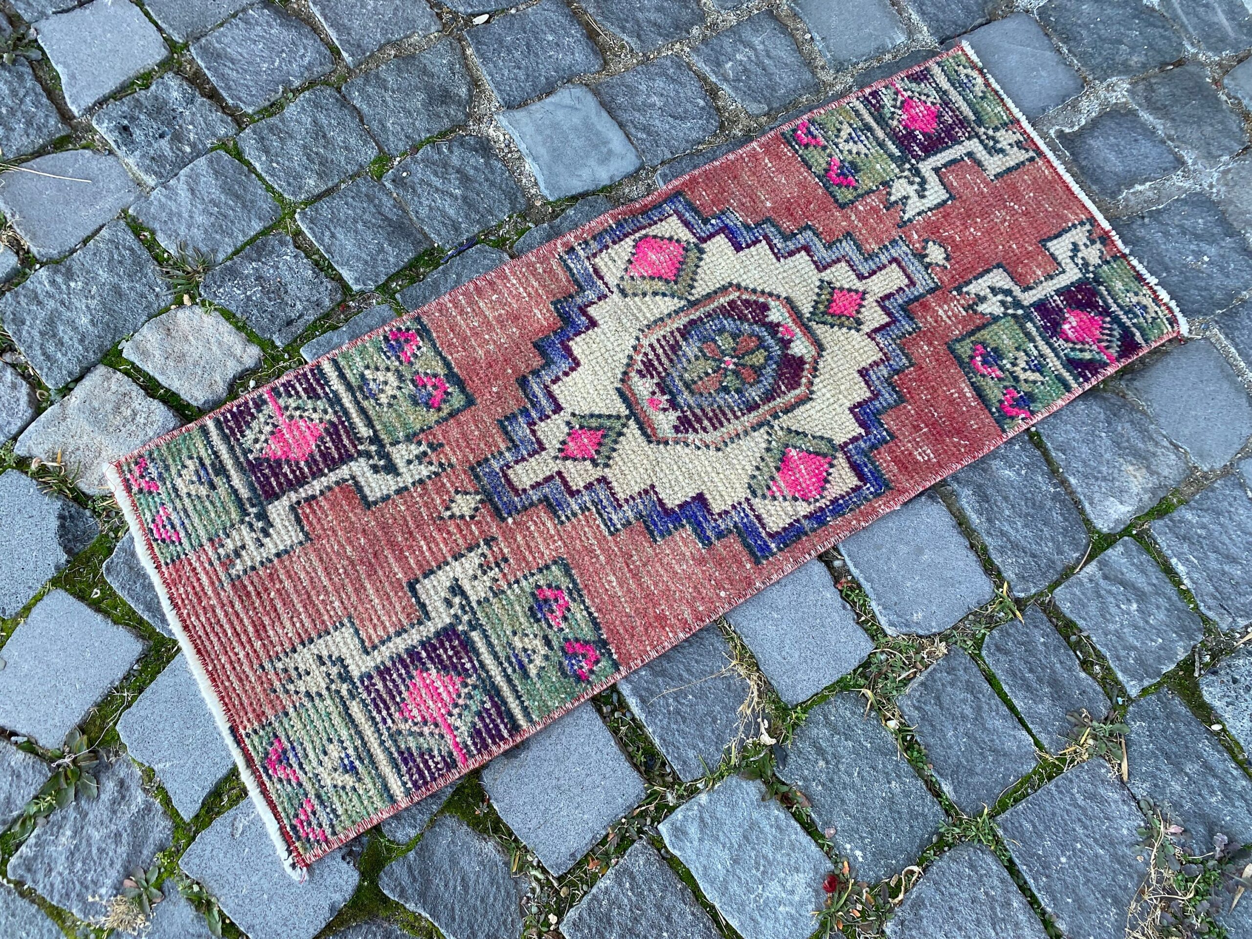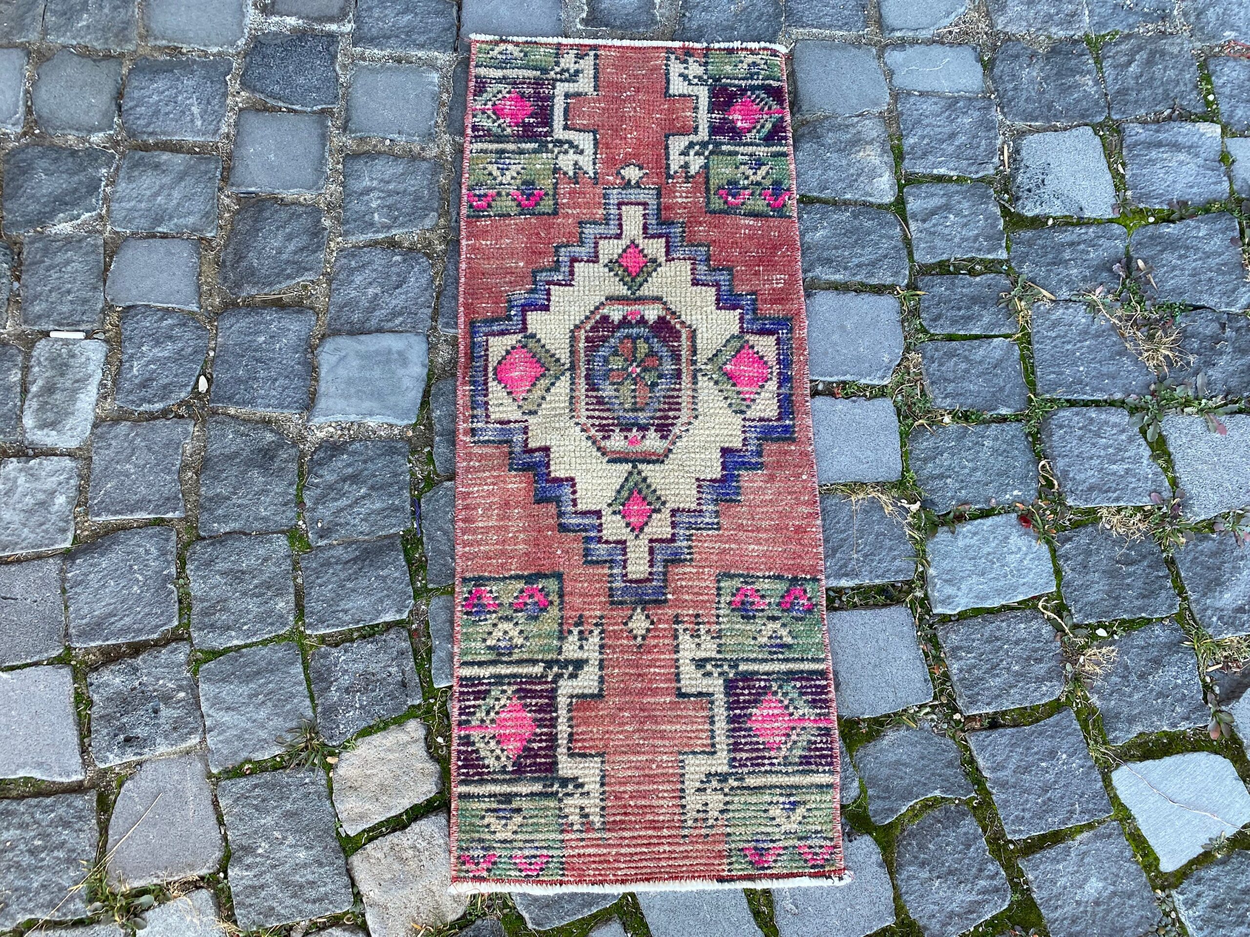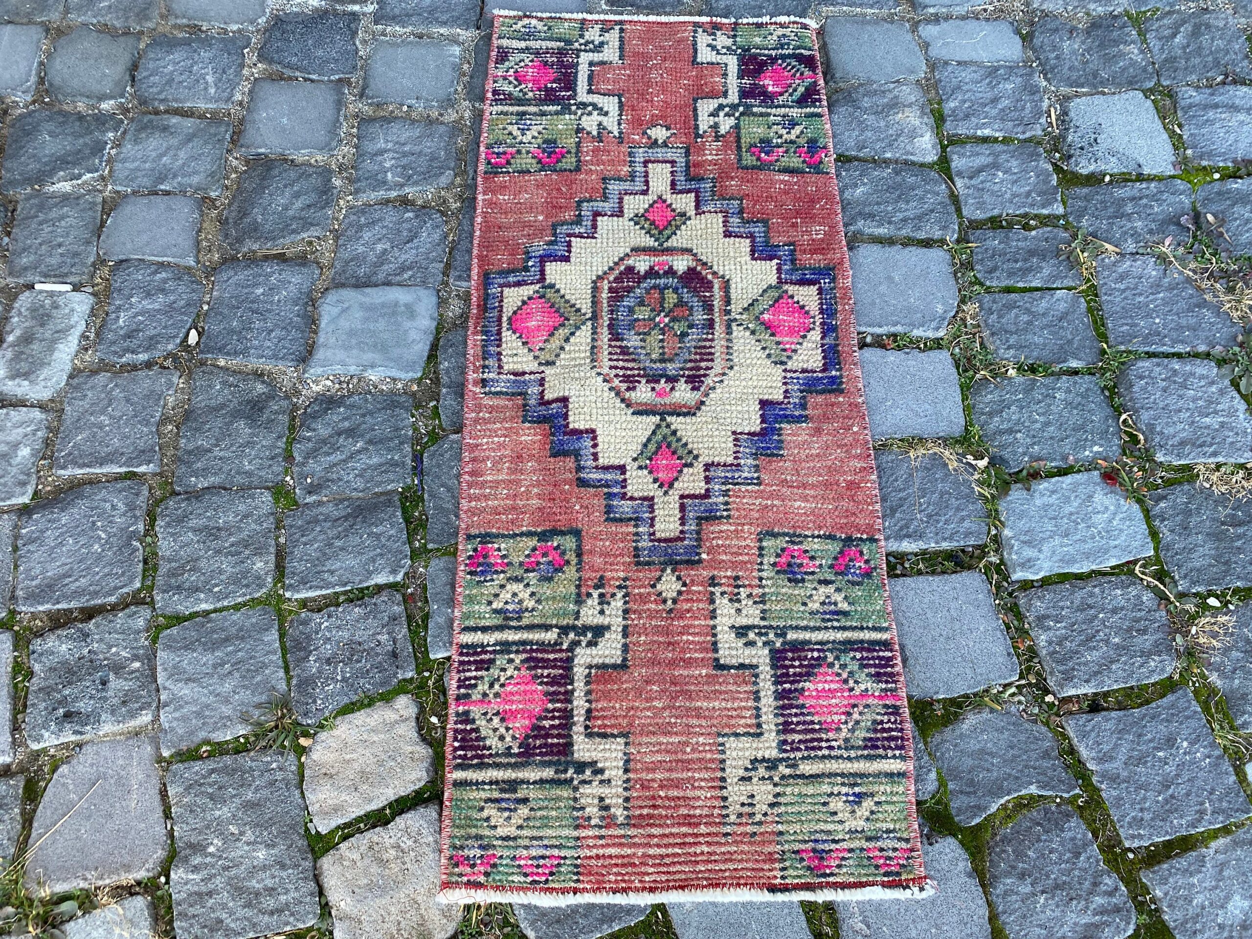Beautiful and one-of-a-kind 1.2 ft. x 2.9 ft. (36 cm x 87 cm) vintage Turkish rug hand-knotted in Turkey from organic wool. This is an authentic vintage Turkish rug from the 1980s that has worn admirably to perfection.