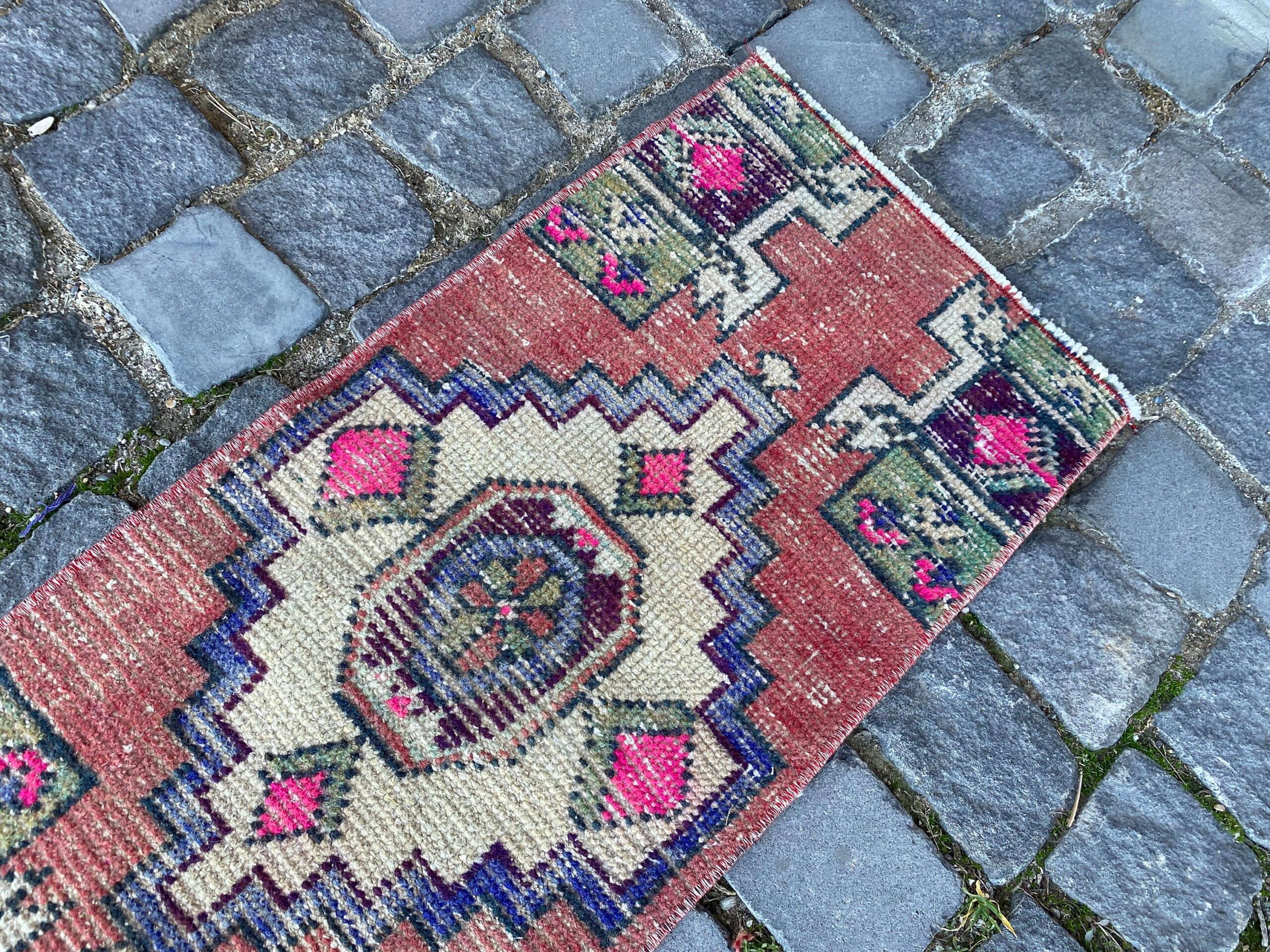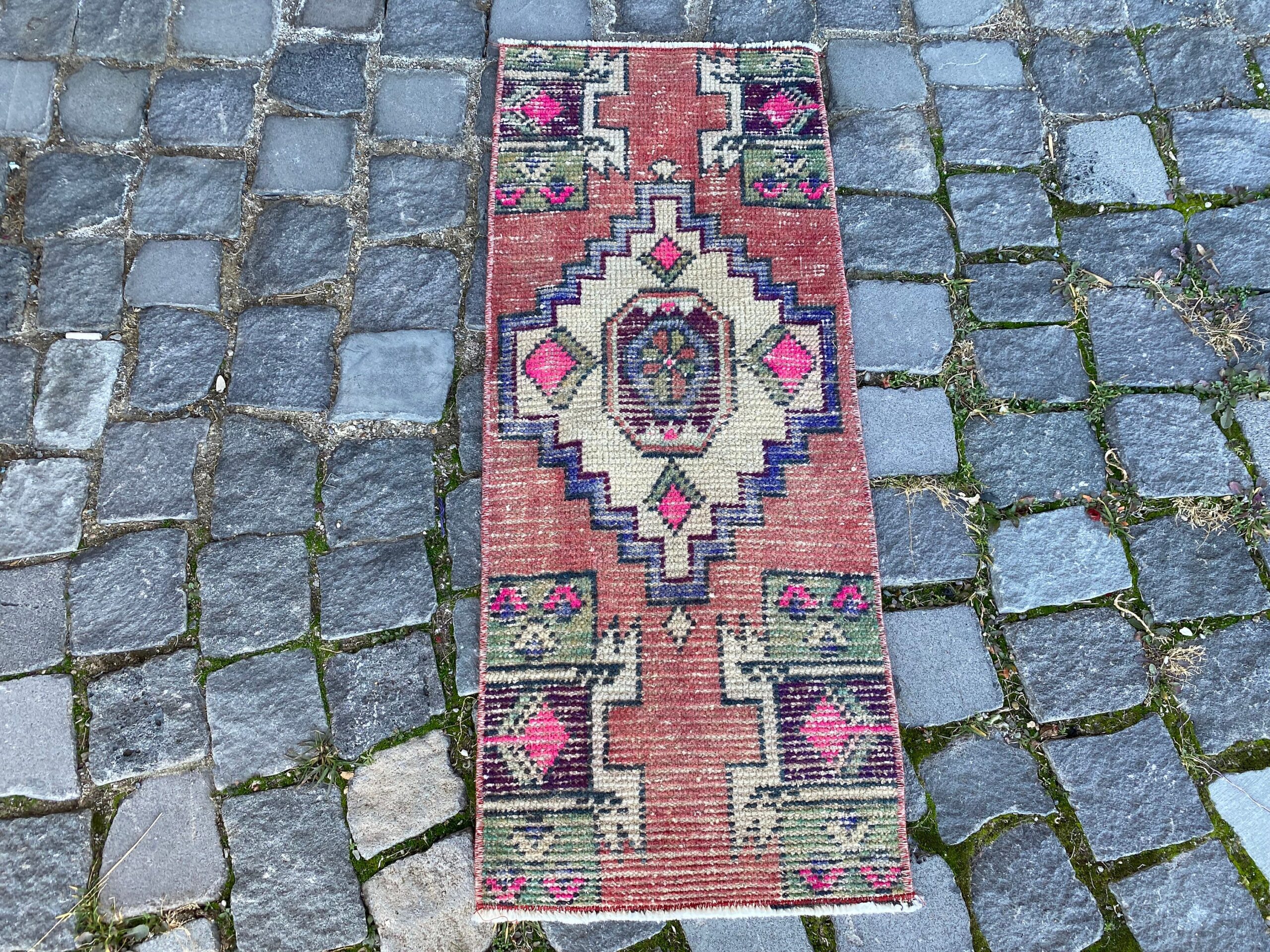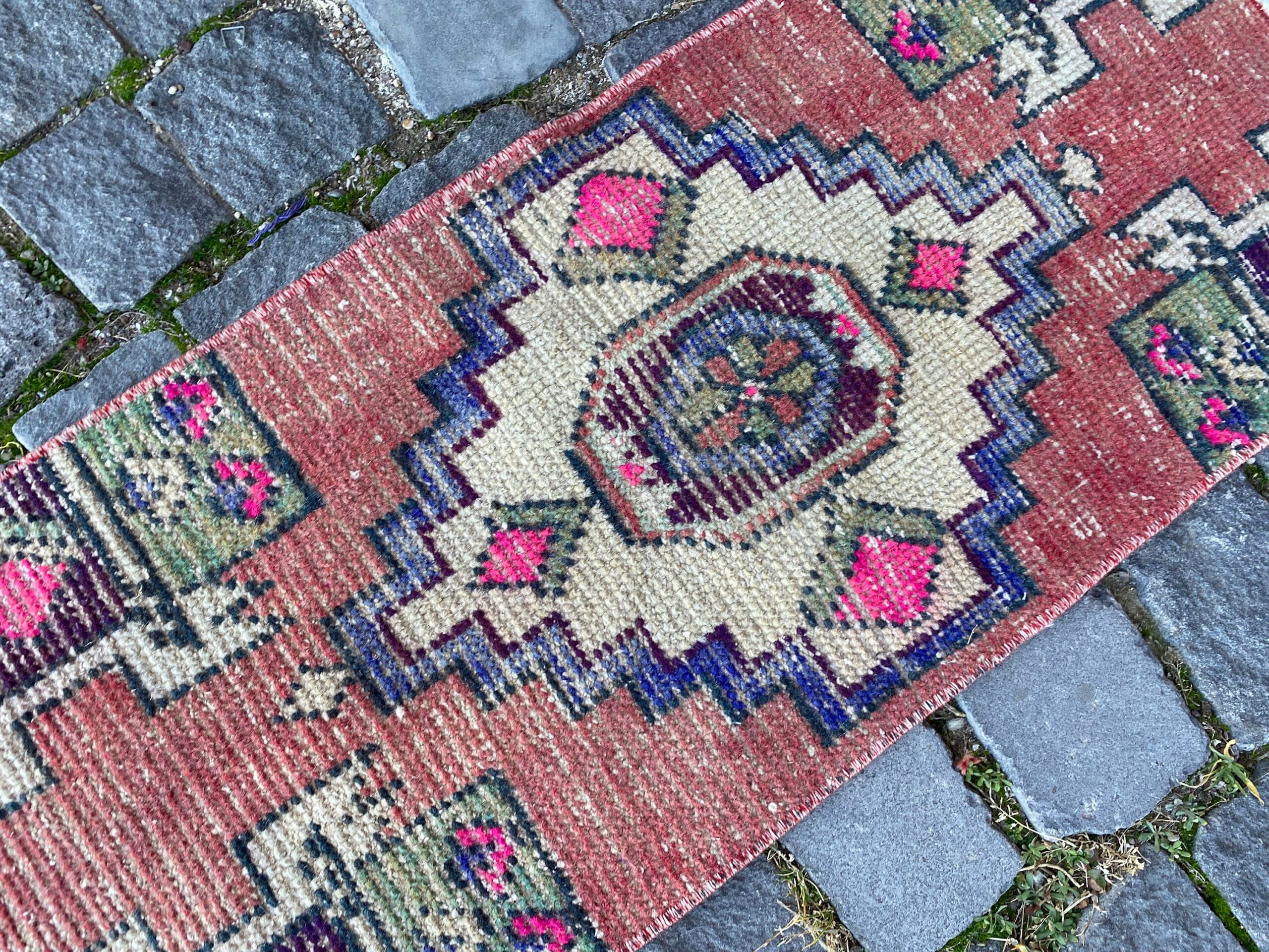 Beautiful and one-of-a-kind 1.2 ft. x 2.9 ft. (36 cm x 87 cm) vintage Turkish rug hand-knotted in Turkey from organic wool. This is an authentic vintage Turkish rug from the 1980s that has worn admirably to perfection.