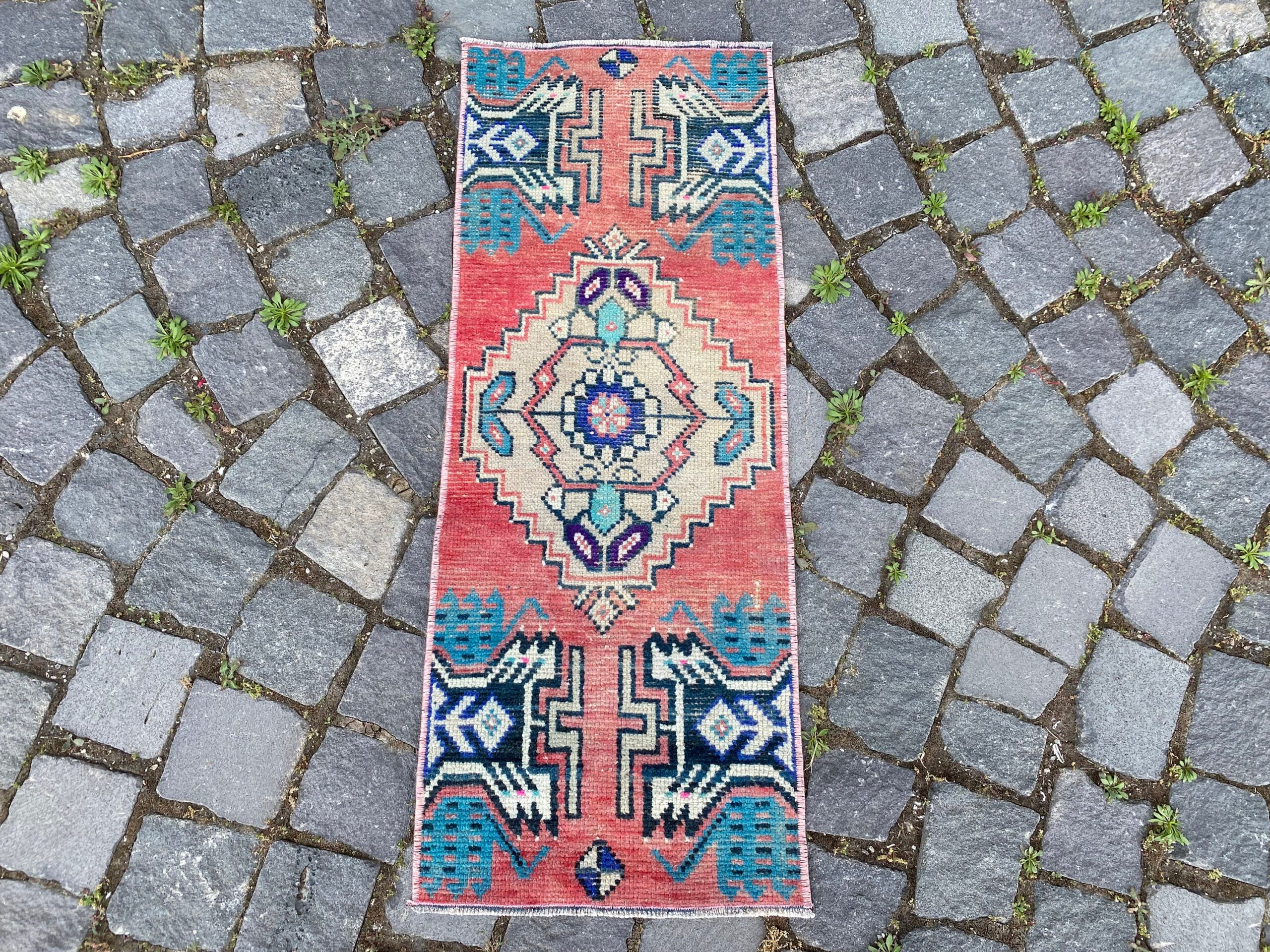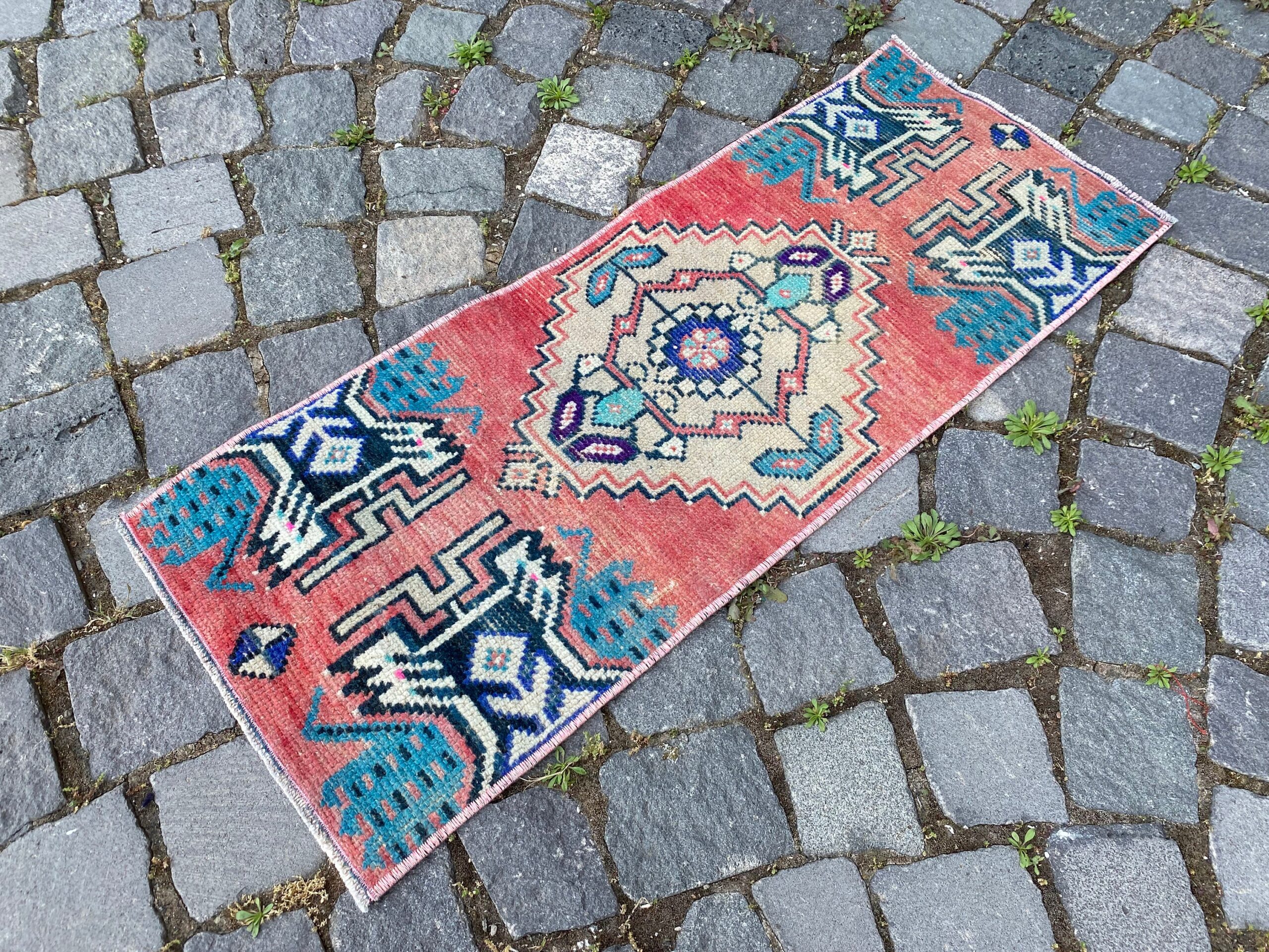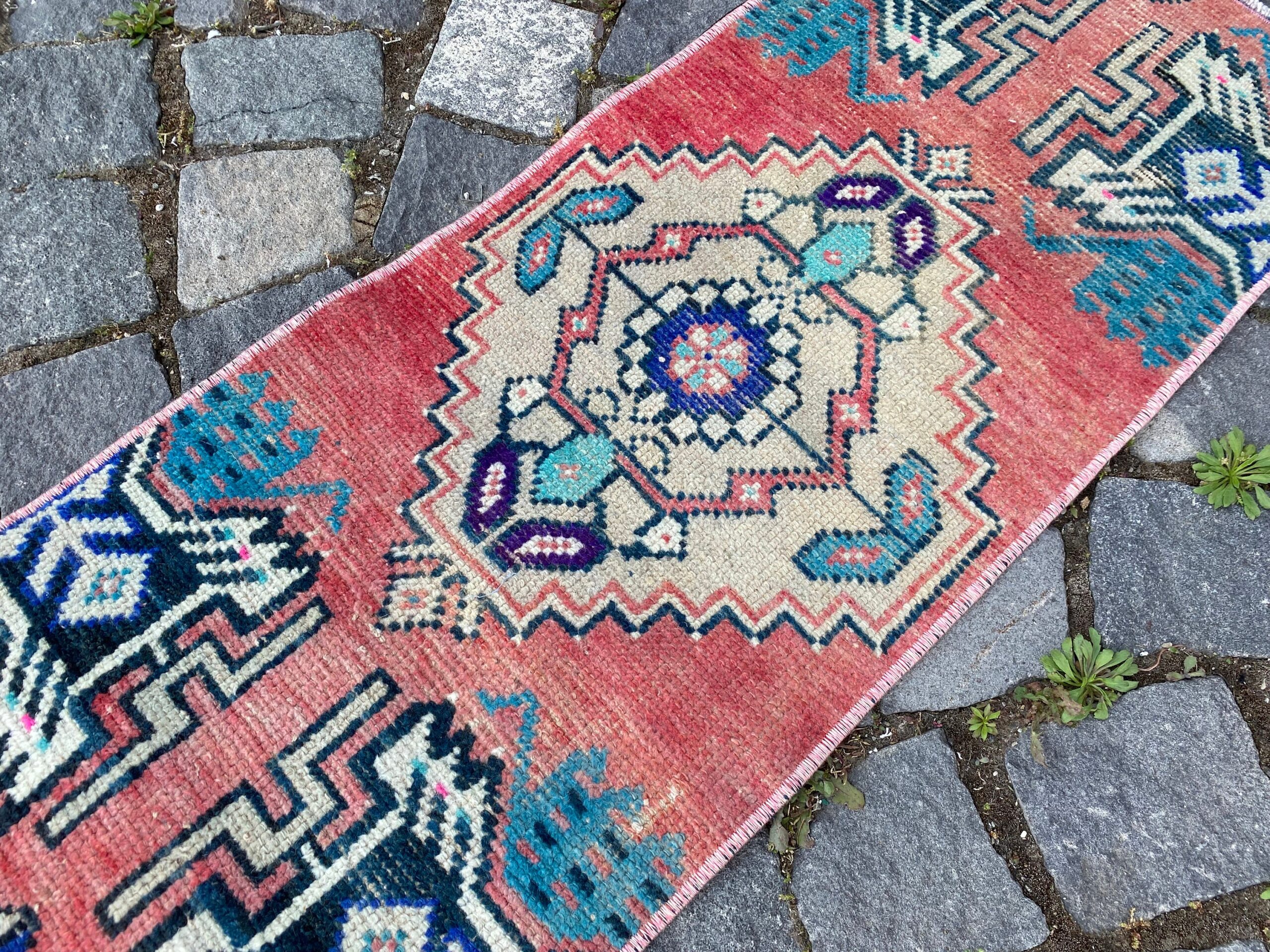 Pretty and one-of-a-kind 1.2 ft. x 3 ft. (36 cm x 90 cm) vintage Turkish rug hand-knotted in Turkey from organic wool. This is an authentic vintage Turkish rug from the 1980s that has worn splendidly to perfection.