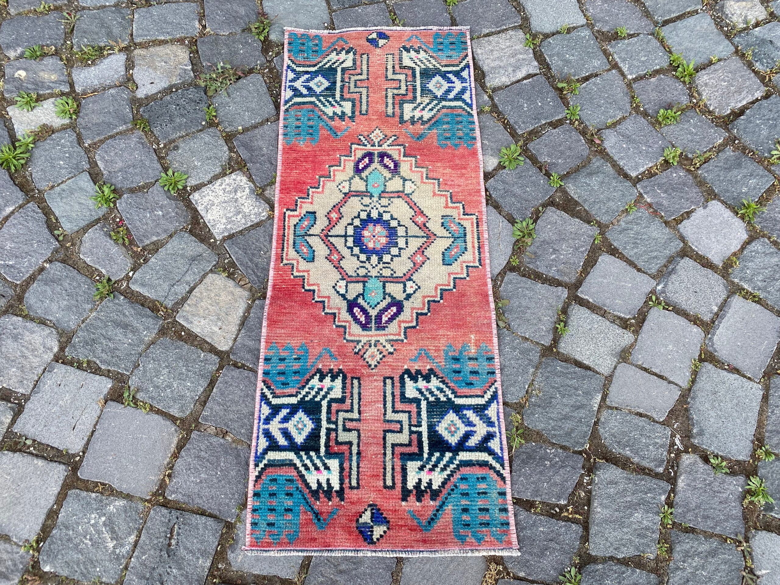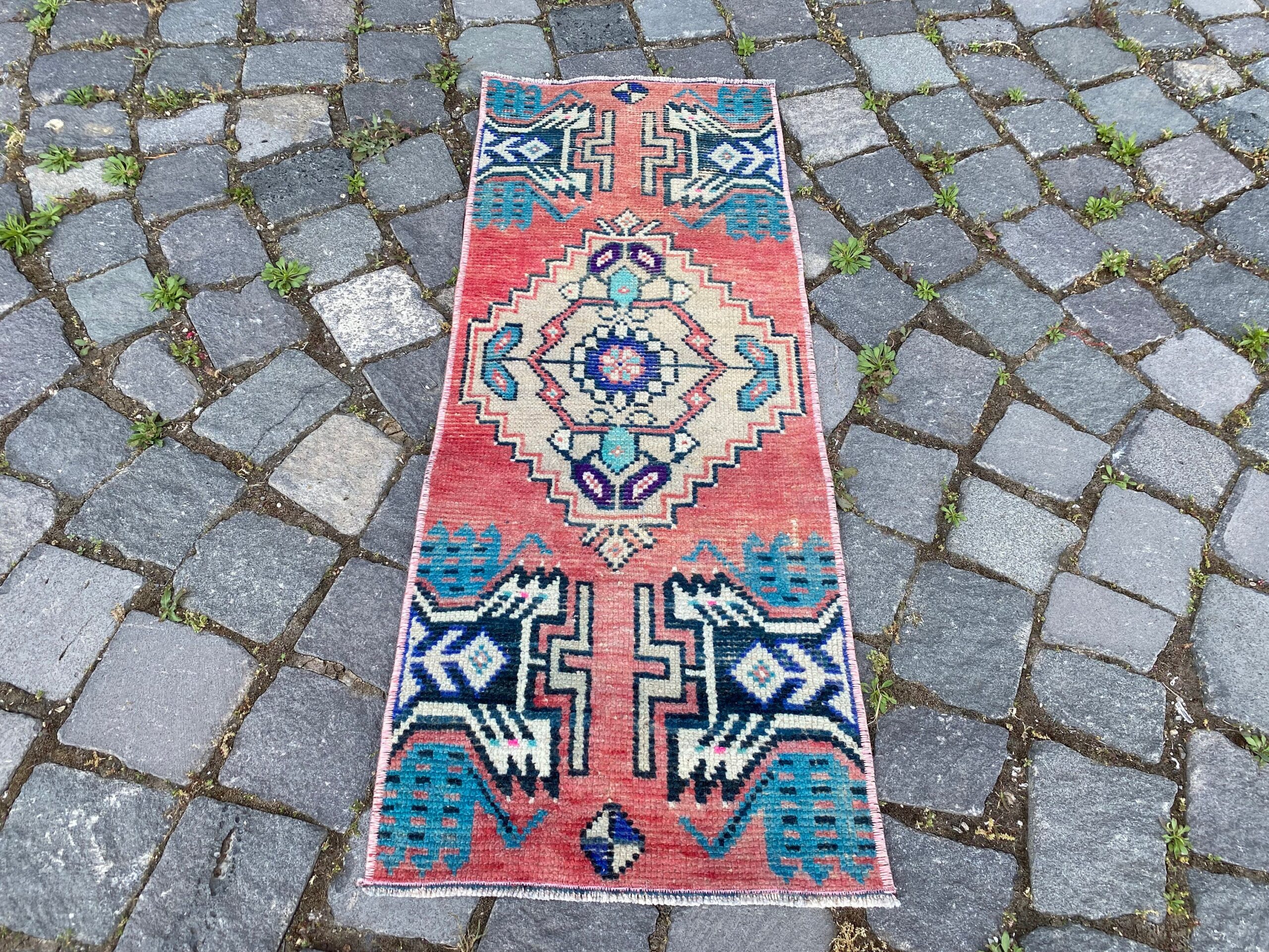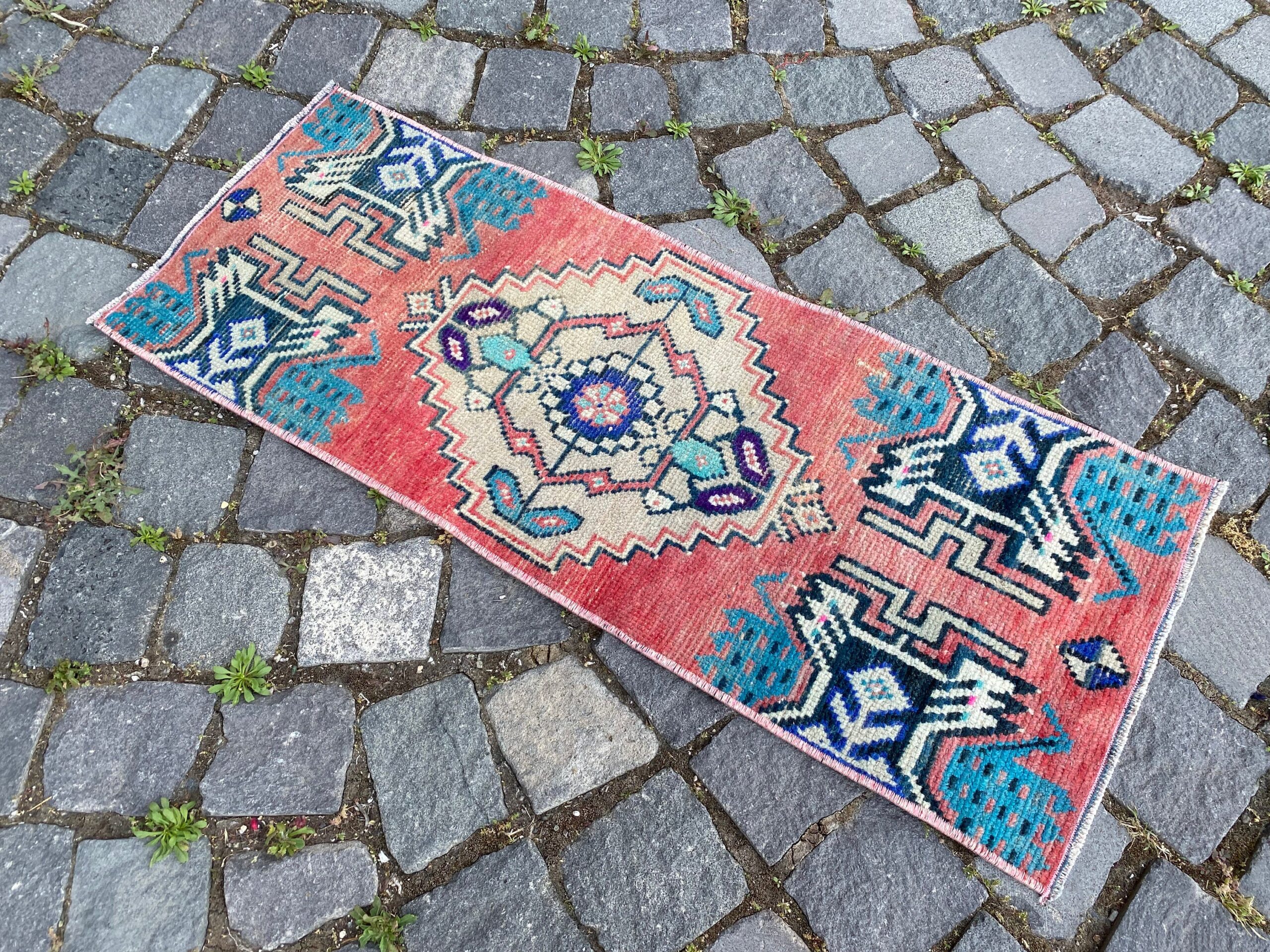 Pretty and one-of-a-kind 1.2 ft. x 3 ft. (36 cm x 90 cm) vintage Turkish rug hand-knotted in Turkey from organic wool. This is an authentic vintage Turkish rug from the 1980s that has worn splendidly to perfection.