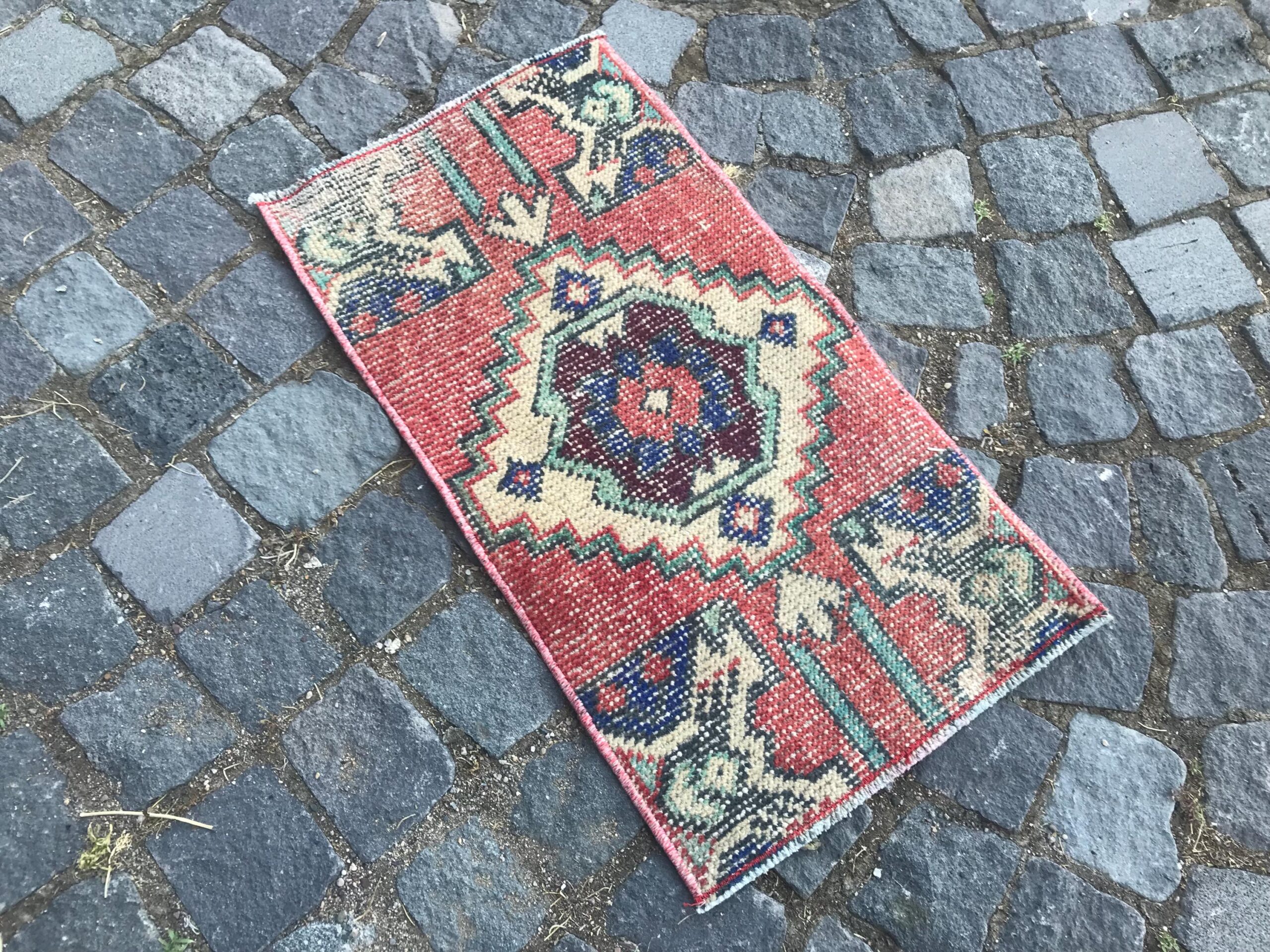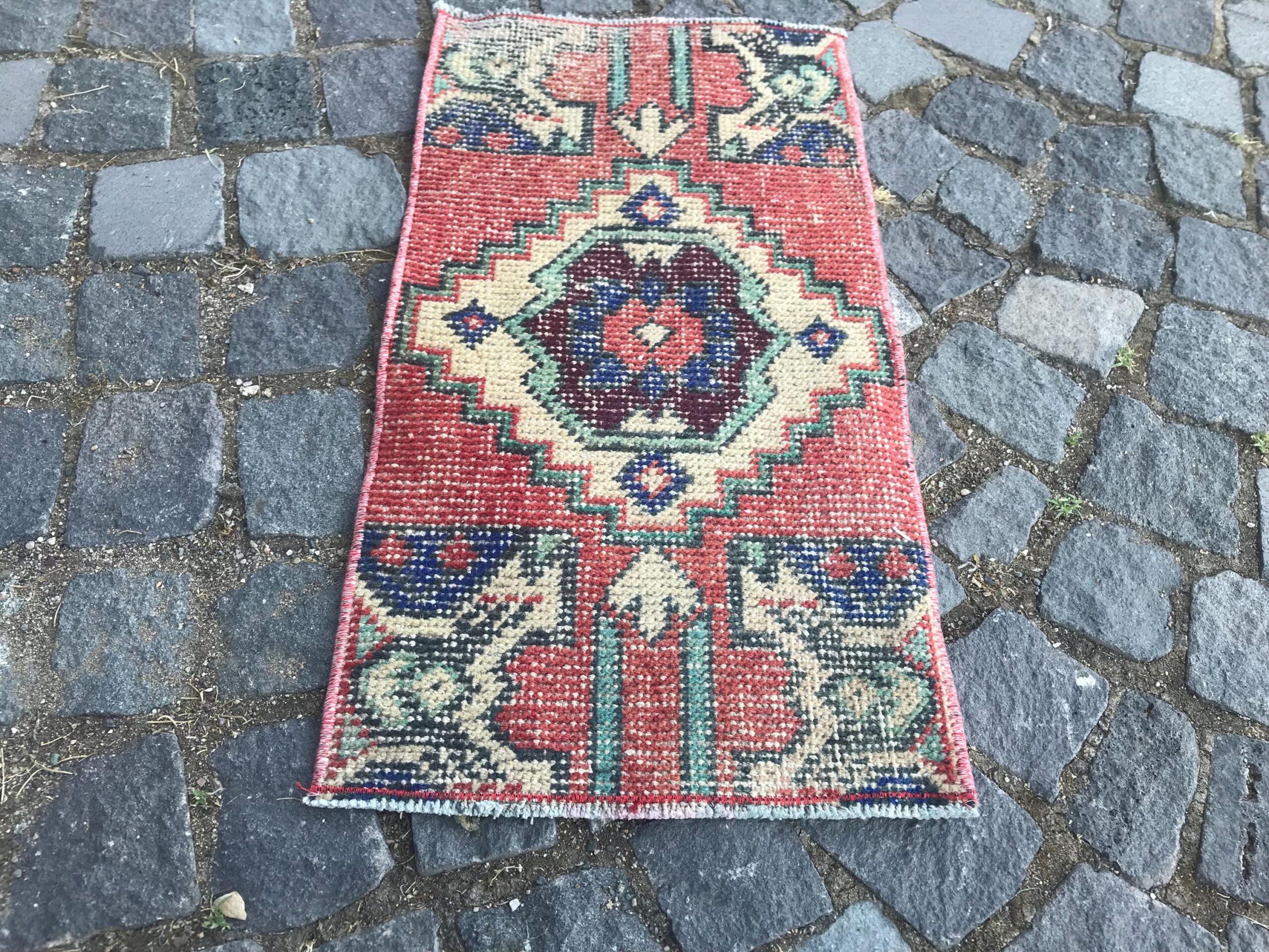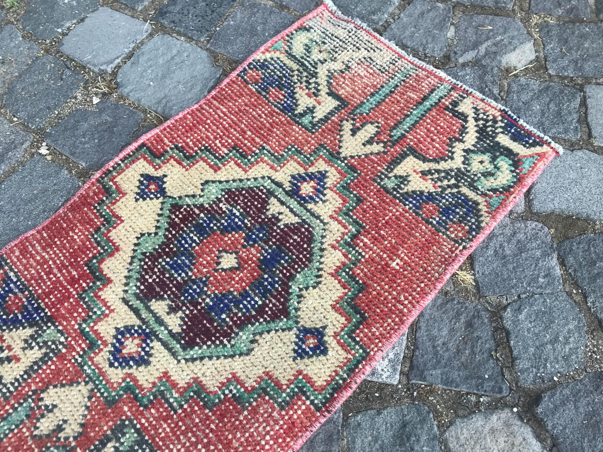 Lovely and unique 1.3 ft. x 2.4 ft. (39 cm x 72 cm) vintage Turkish rug hand-knotted in Turkey from organic wool. This is an authentic vintage Turkish rug from the 1980s that has worn beautifully to perfection.