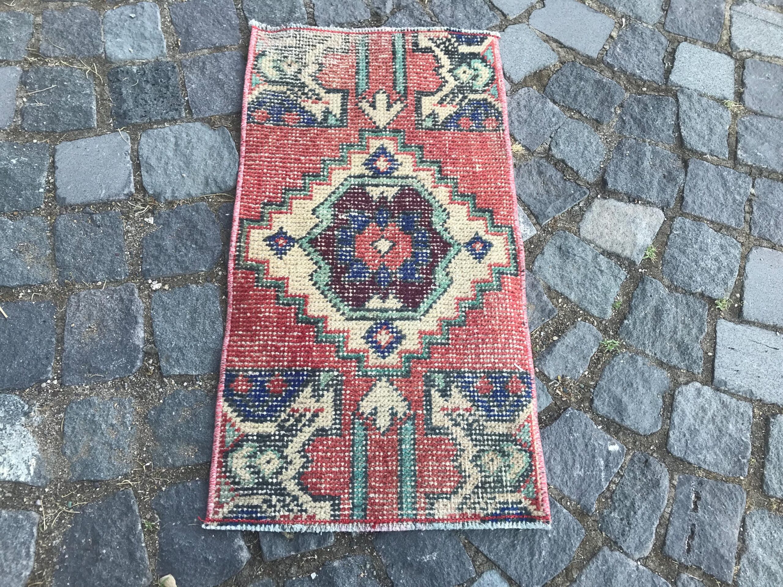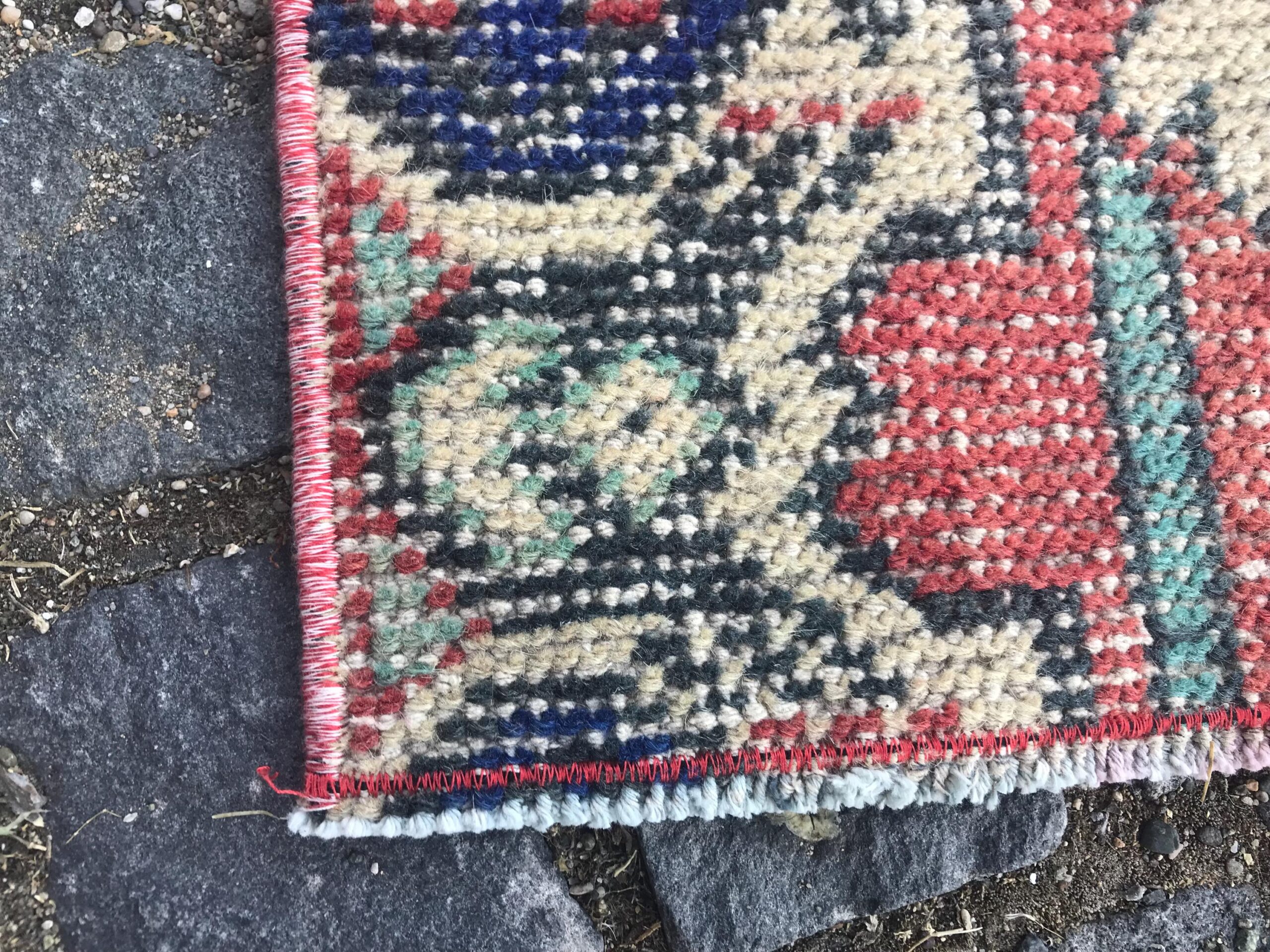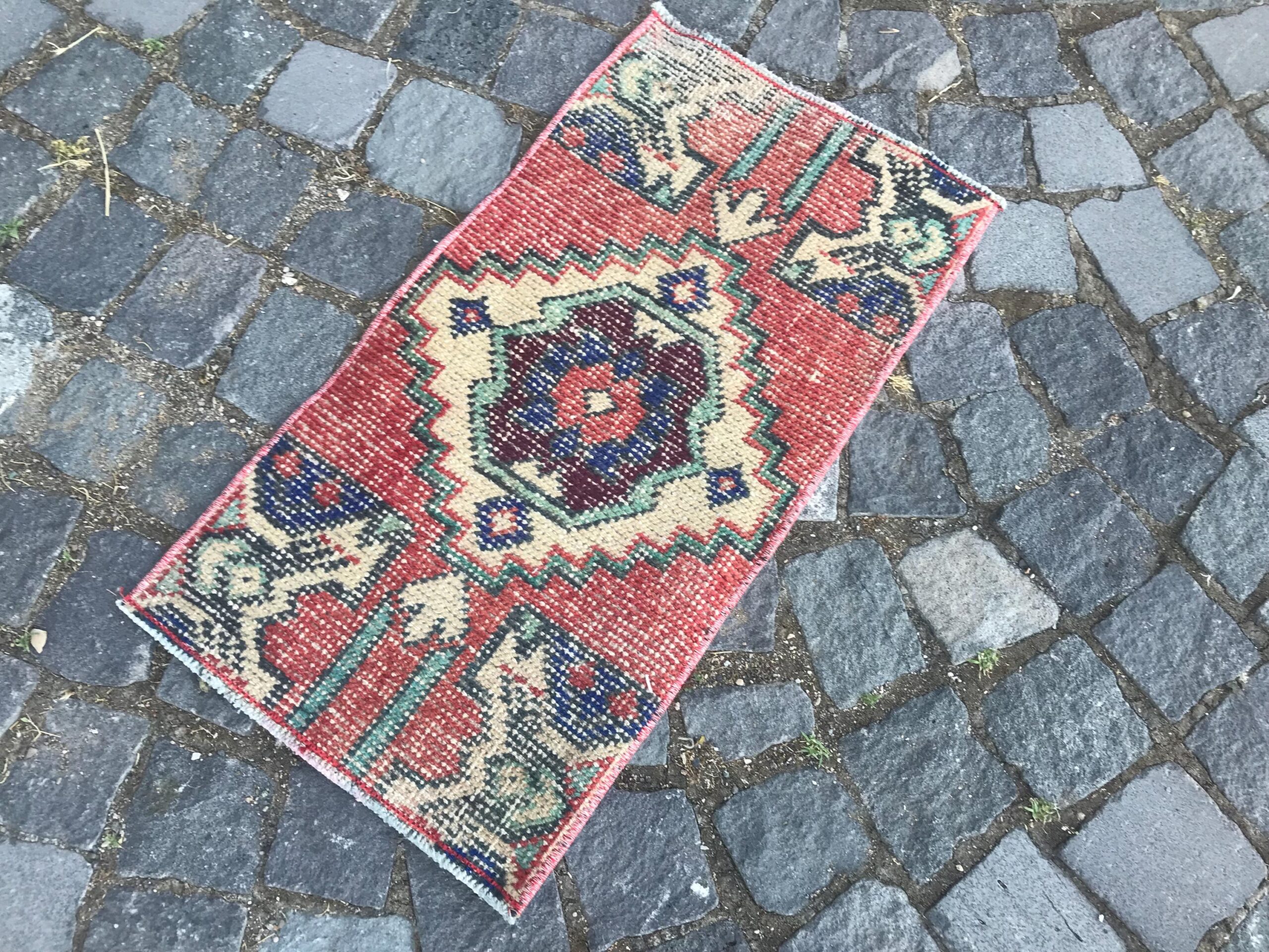 Lovely and unique 1.3 ft. x 2.4 ft. (39 cm x 72 cm) vintage Turkish rug hand-knotted in Turkey from organic wool. This is an authentic vintage Turkish rug from the 1980s that has worn beautifully to perfection.