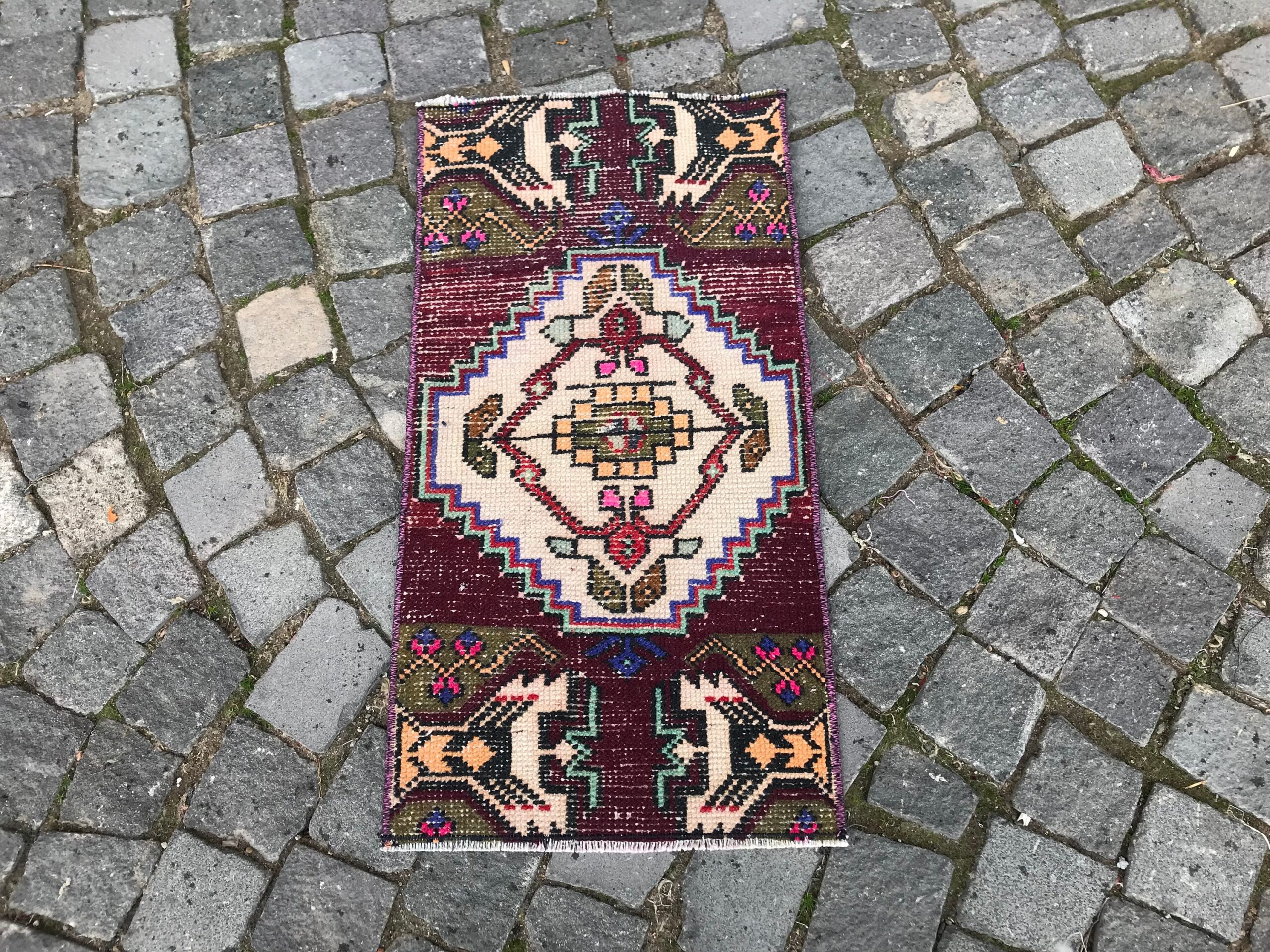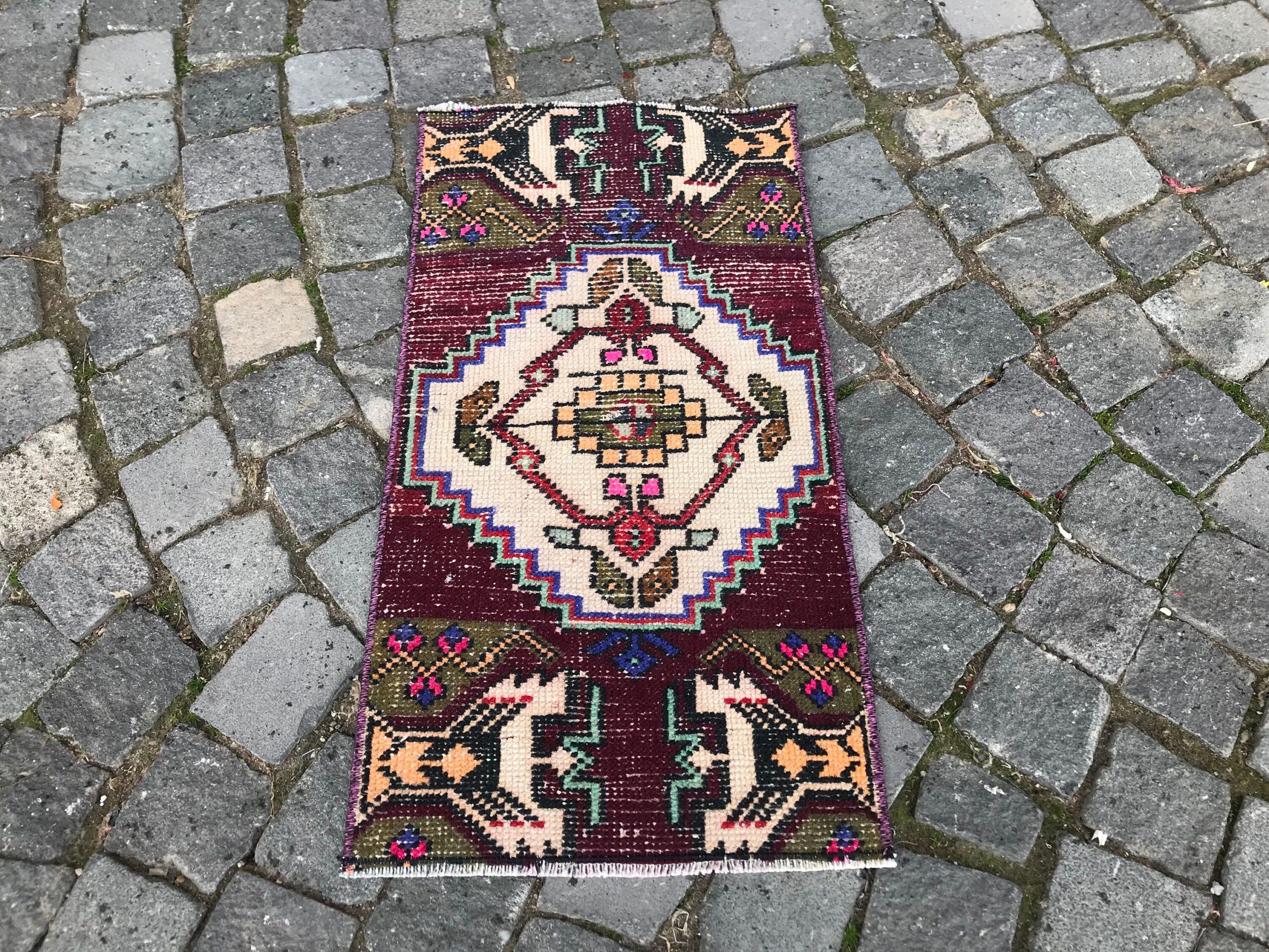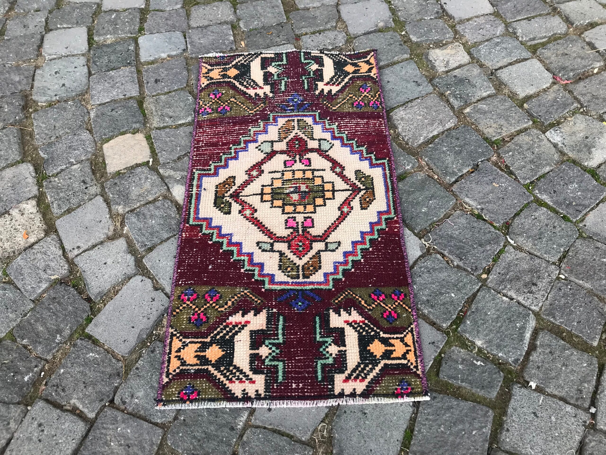 Lovely and unique 1.3 ft. x 2.5 ft. (40 cm x 77 cm) vintage Turkish rug hand-knotted in Turkey from organic wool. This is an authentic vintage Turkish rug from the 1990s that has worn beautifully to perfection.