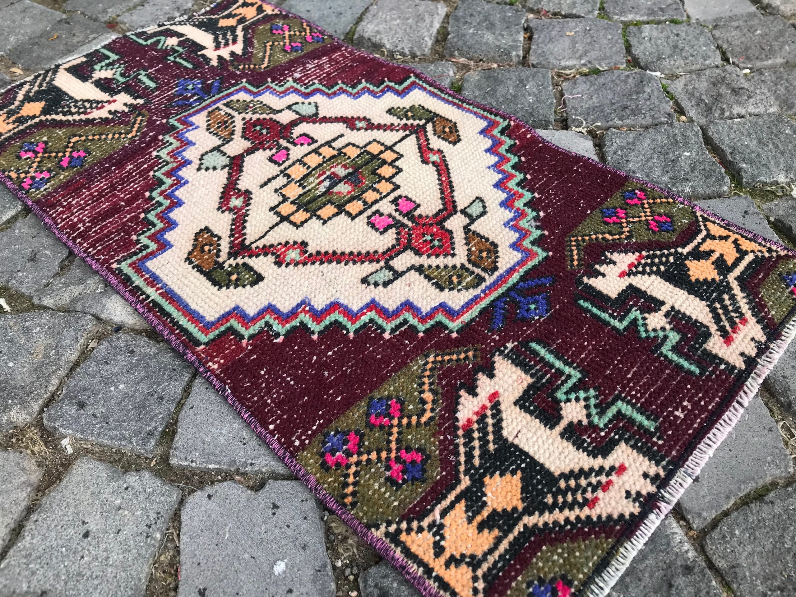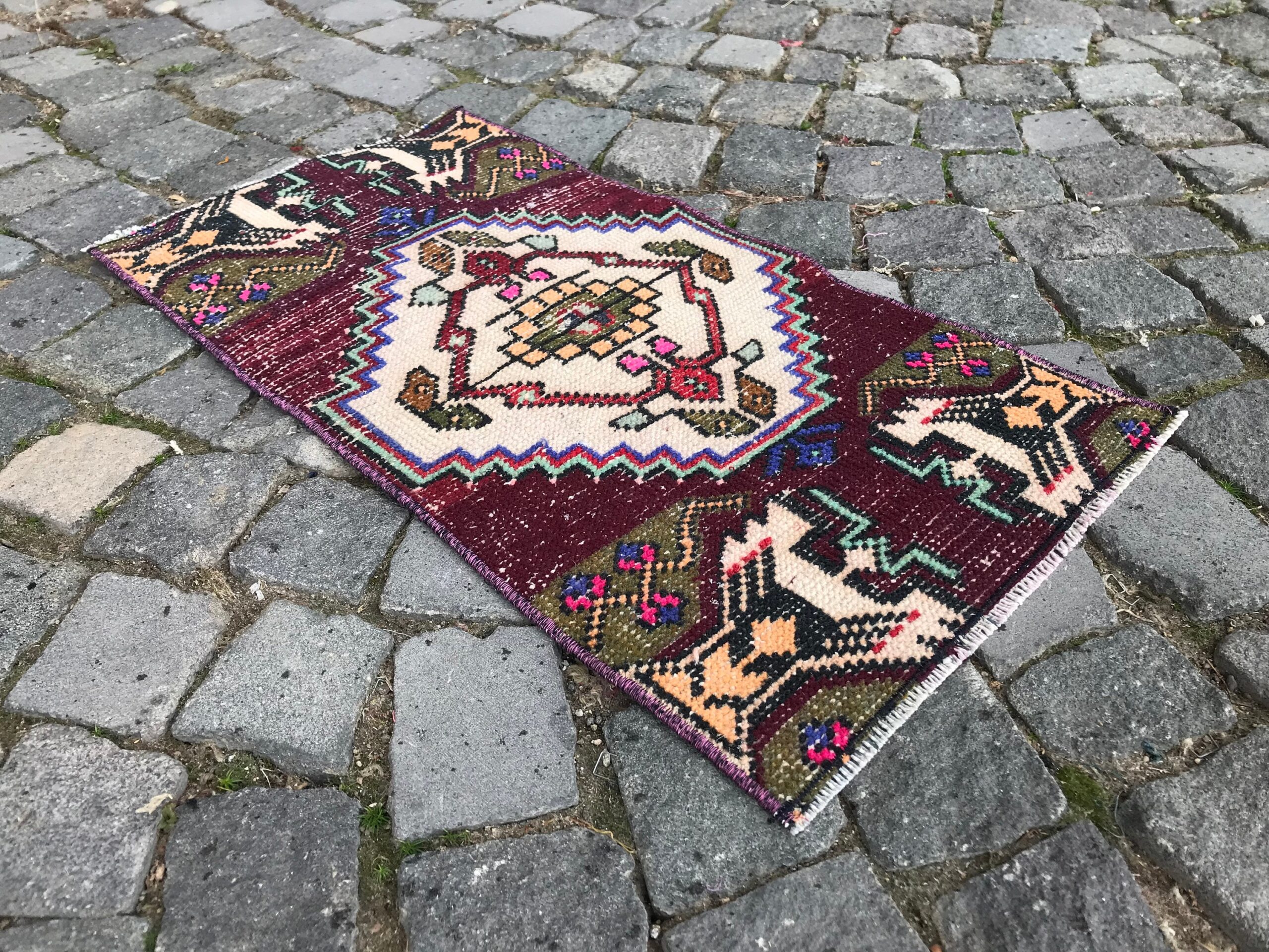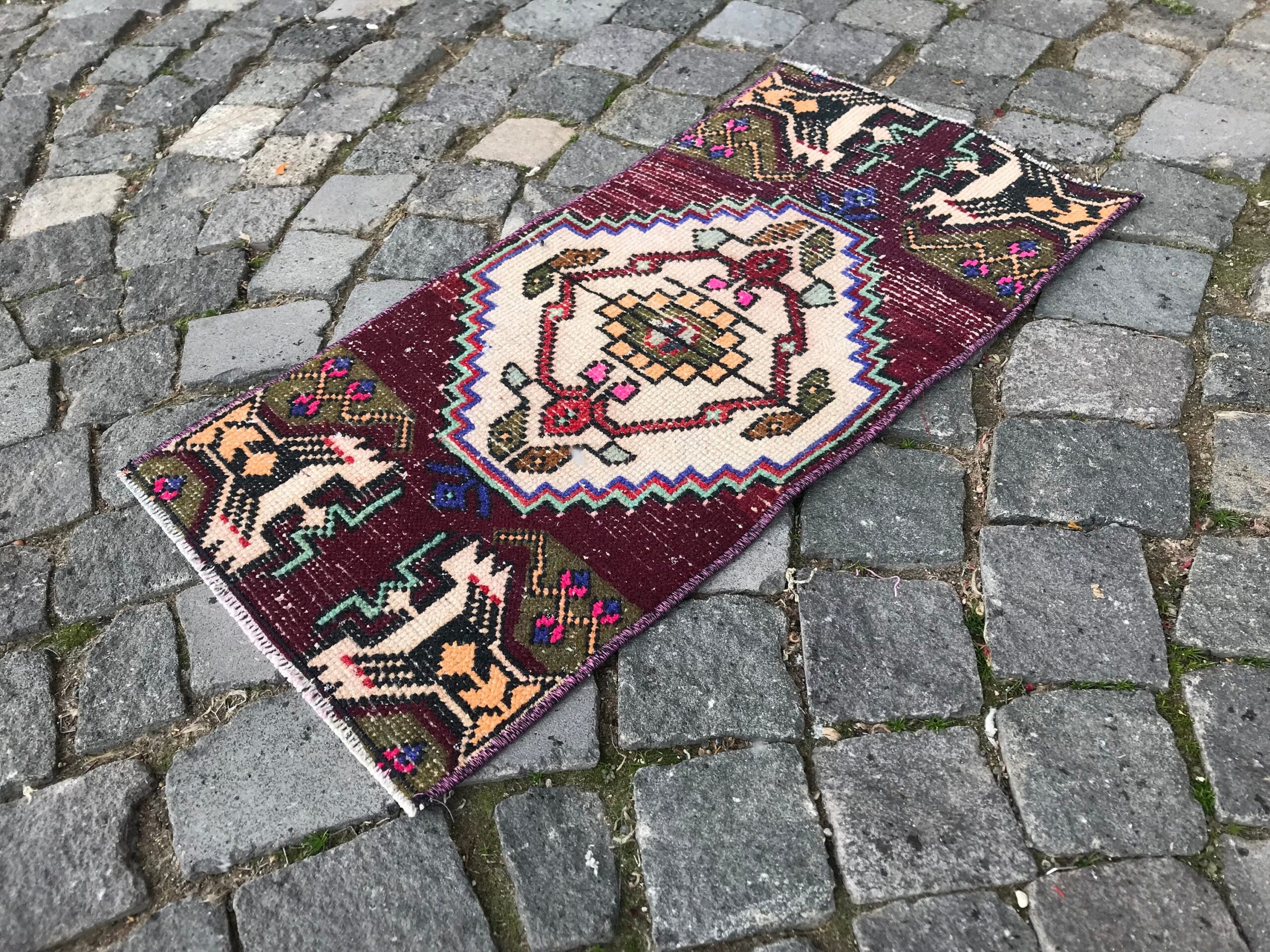 Lovely and unique 1.3 ft. x 2.5 ft. (40 cm x 77 cm) vintage Turkish rug hand-knotted in Turkey from organic wool. This is an authentic vintage Turkish rug from the 1990s that has worn beautifully to perfection.