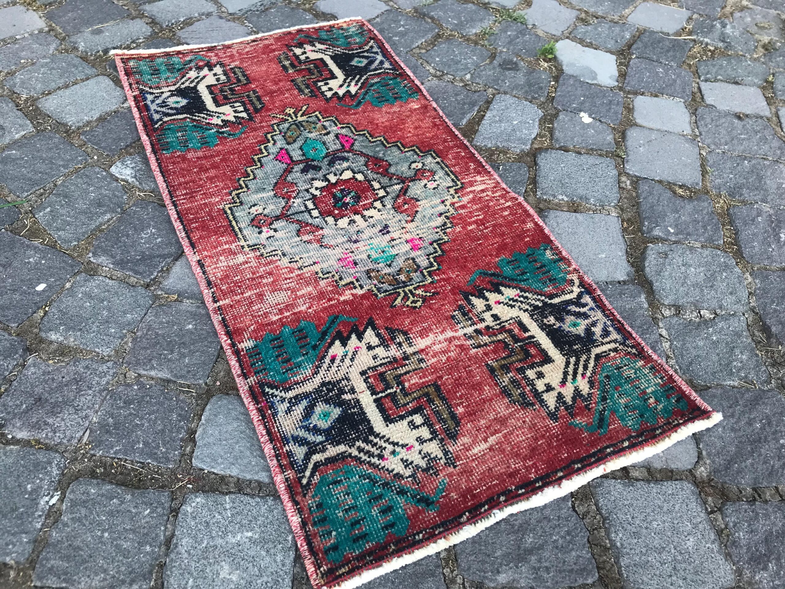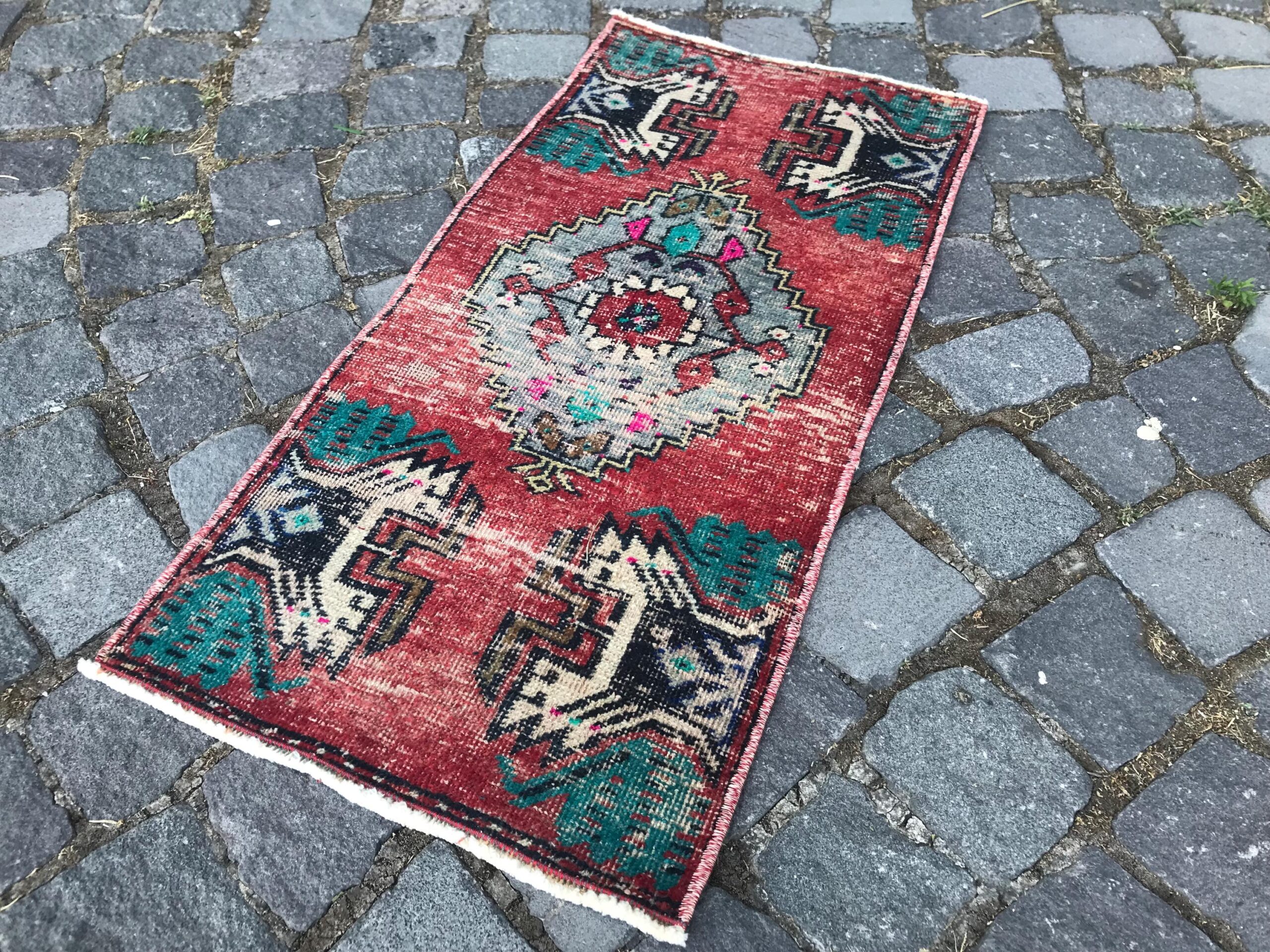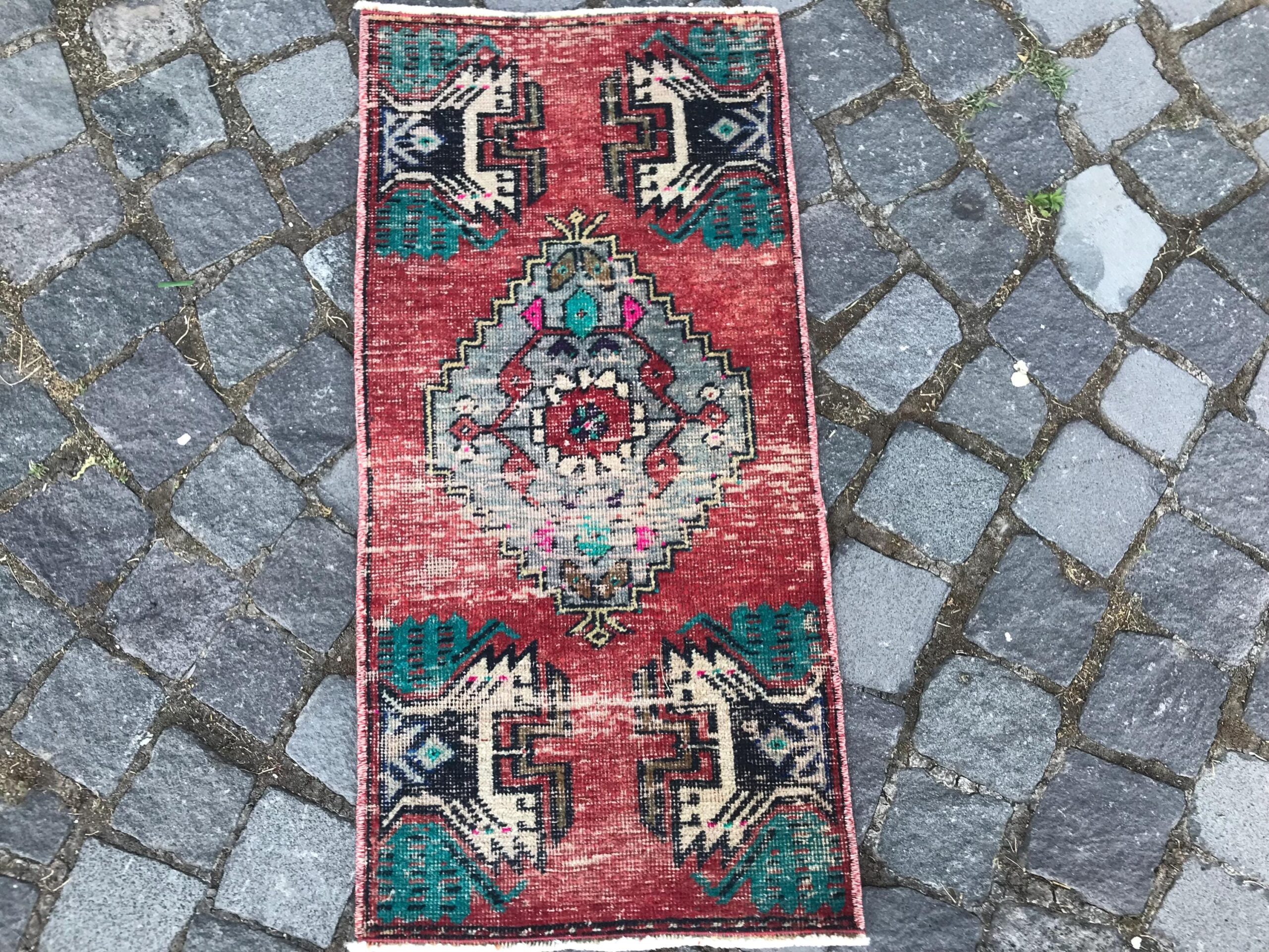Beautiful and one-of-a-kind 1.3 ft. x 2.7 ft. (40 cm x 82 cm) vintage Turkish rug hand-knotted in Turkey from organic wool. This is an authentic vintage Turkish rug from the 1990s that has worn admirably to perfection.
