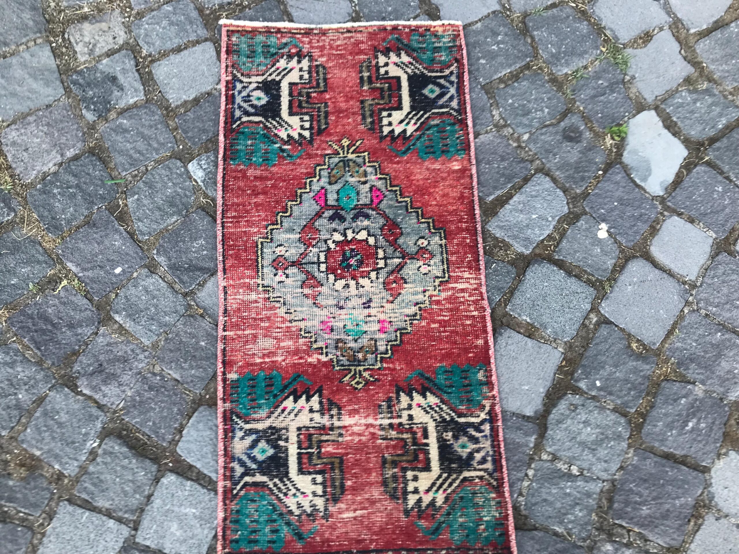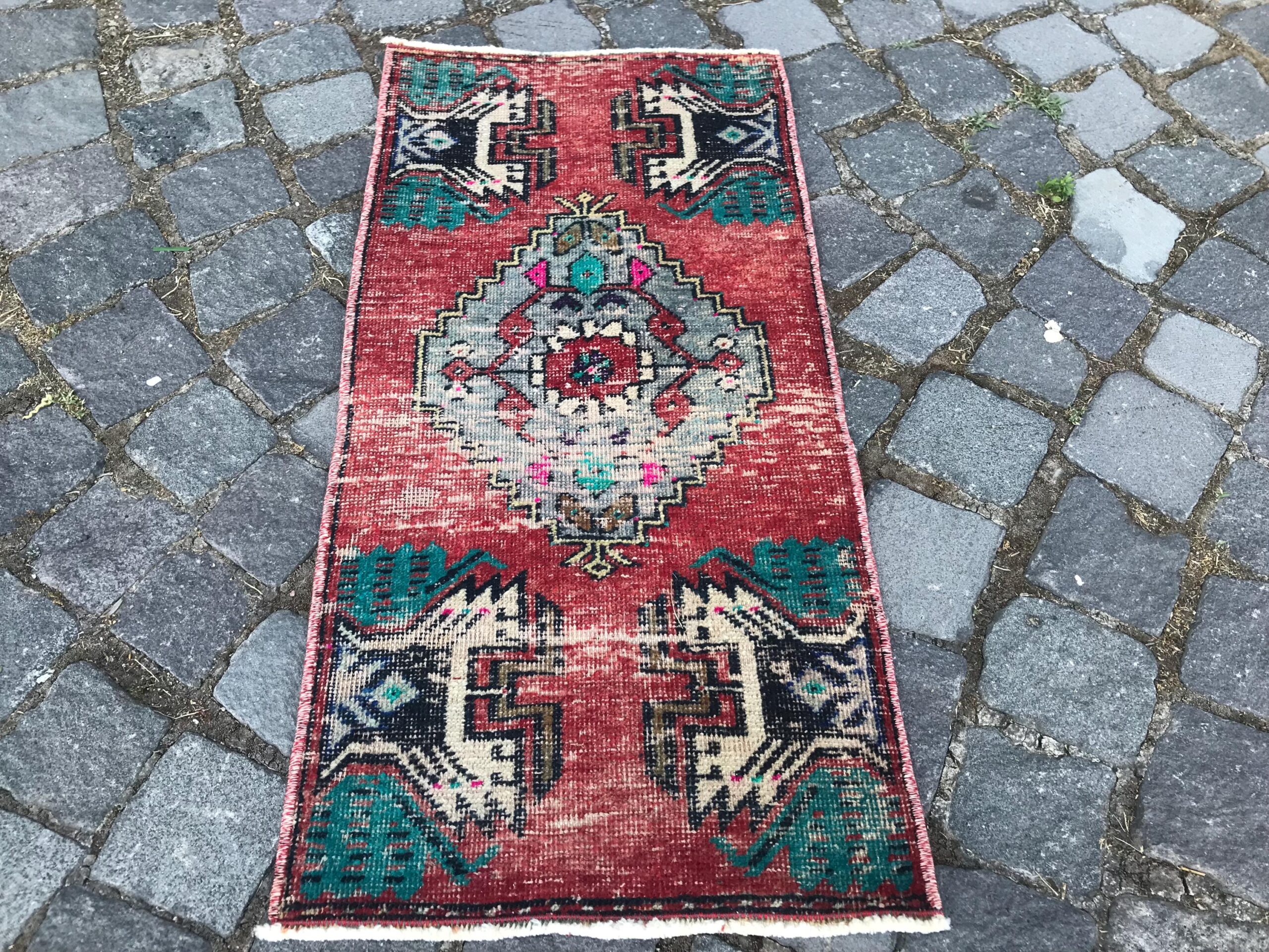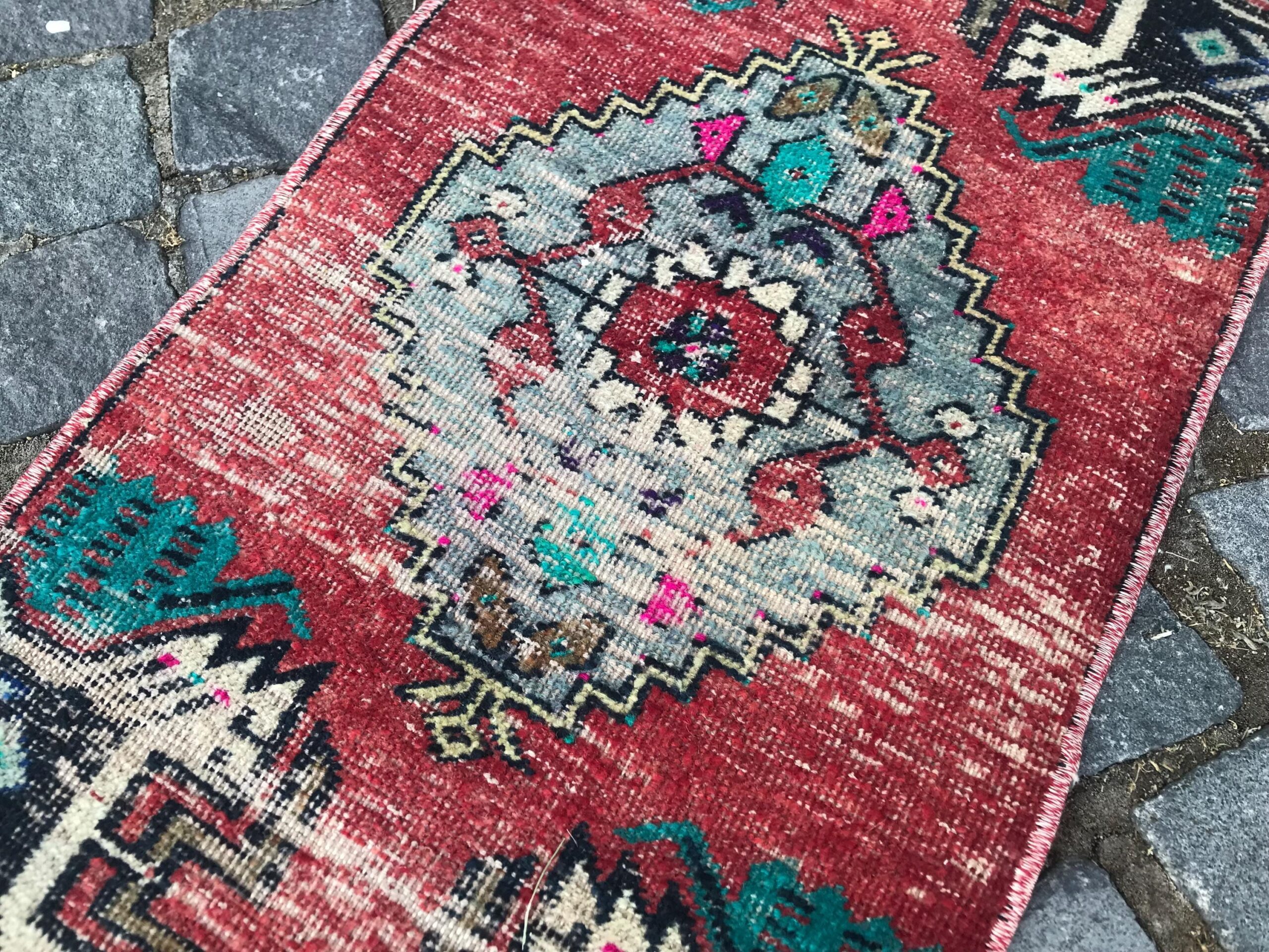 Beautiful and one-of-a-kind 1.3 ft. x 2.7 ft. (40 cm x 82 cm) vintage Turkish rug hand-knotted in Turkey from organic wool. This is an authentic vintage Turkish rug from the 1990s that has worn admirably to perfection.