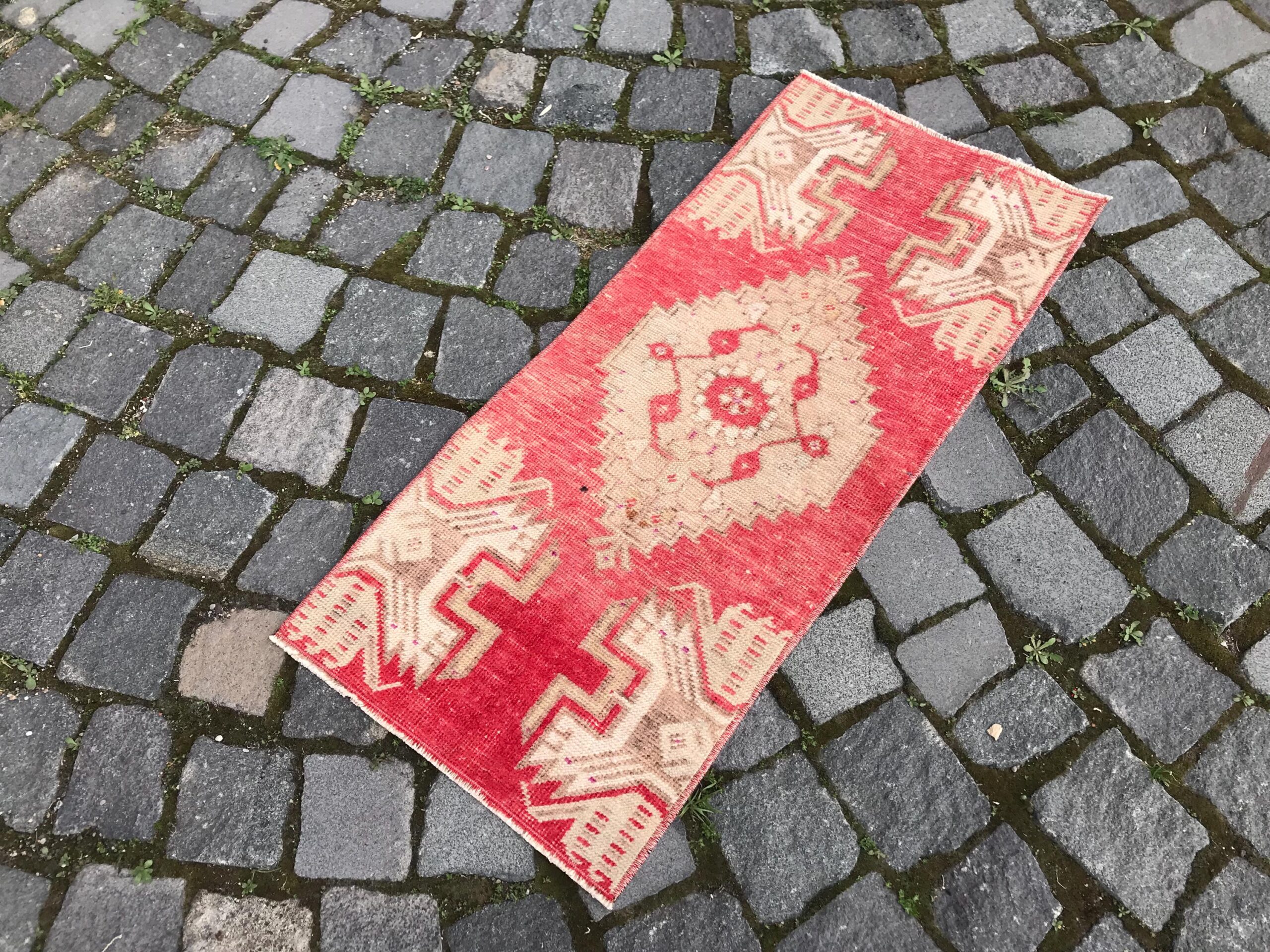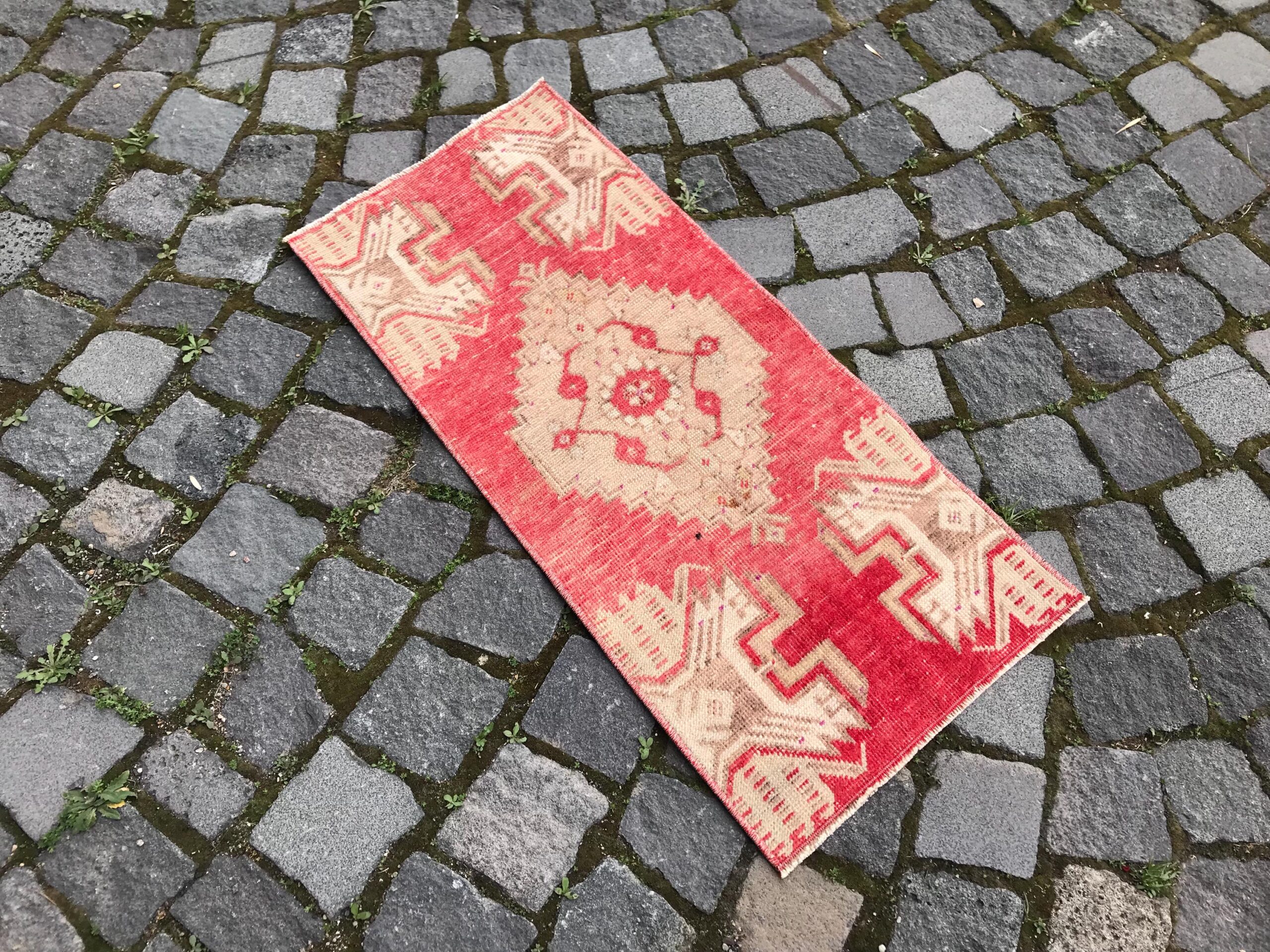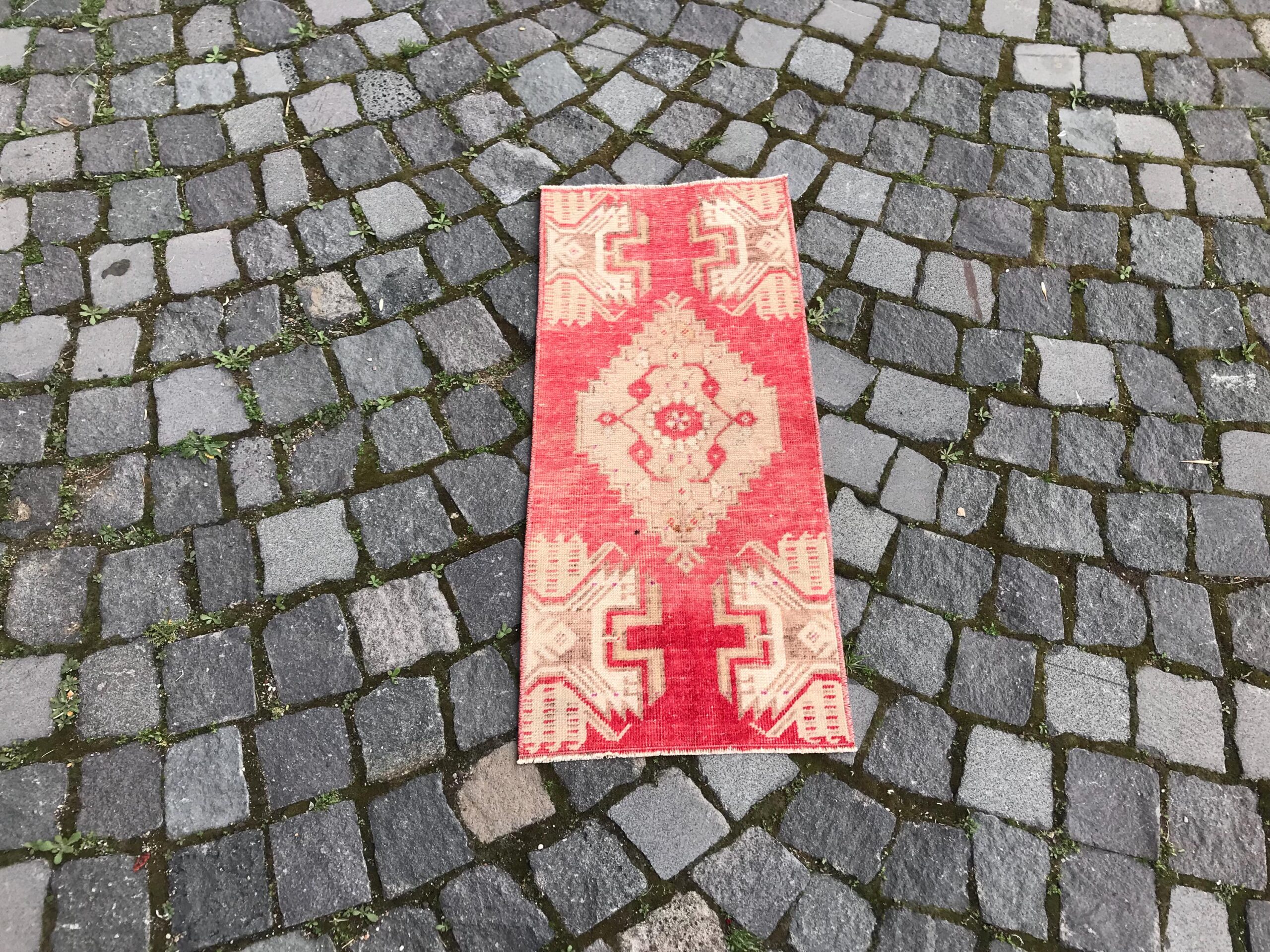 Beautiful and one-of-a-kind 1.3 ft. x 2.7 ft. (39 cm x 83 cm) vintage Turkish rug hand-knotted in Turkey from organic wool. This is an authentic vintage Turkish rug from the 1980s that has worn admirably to perfection.