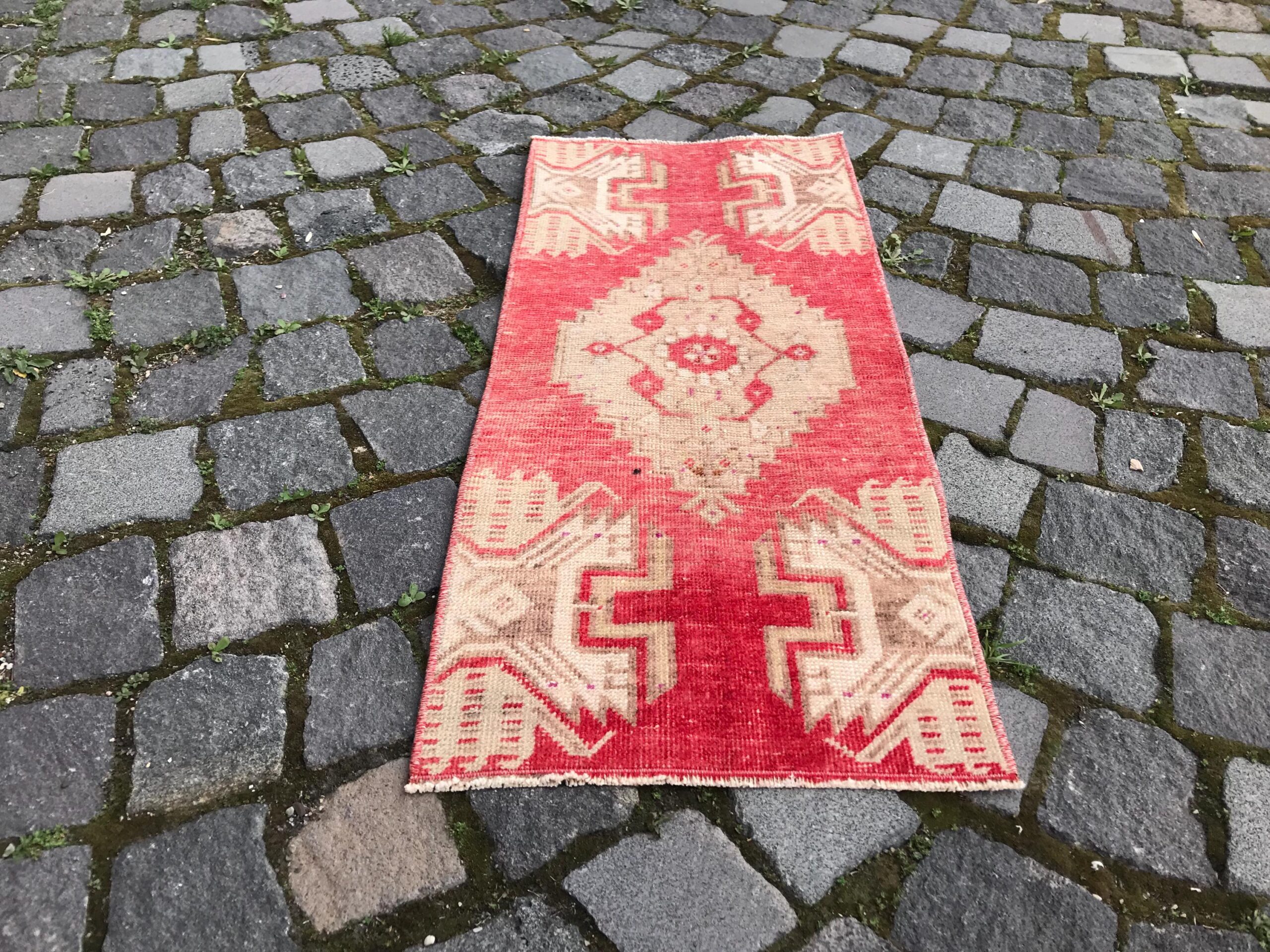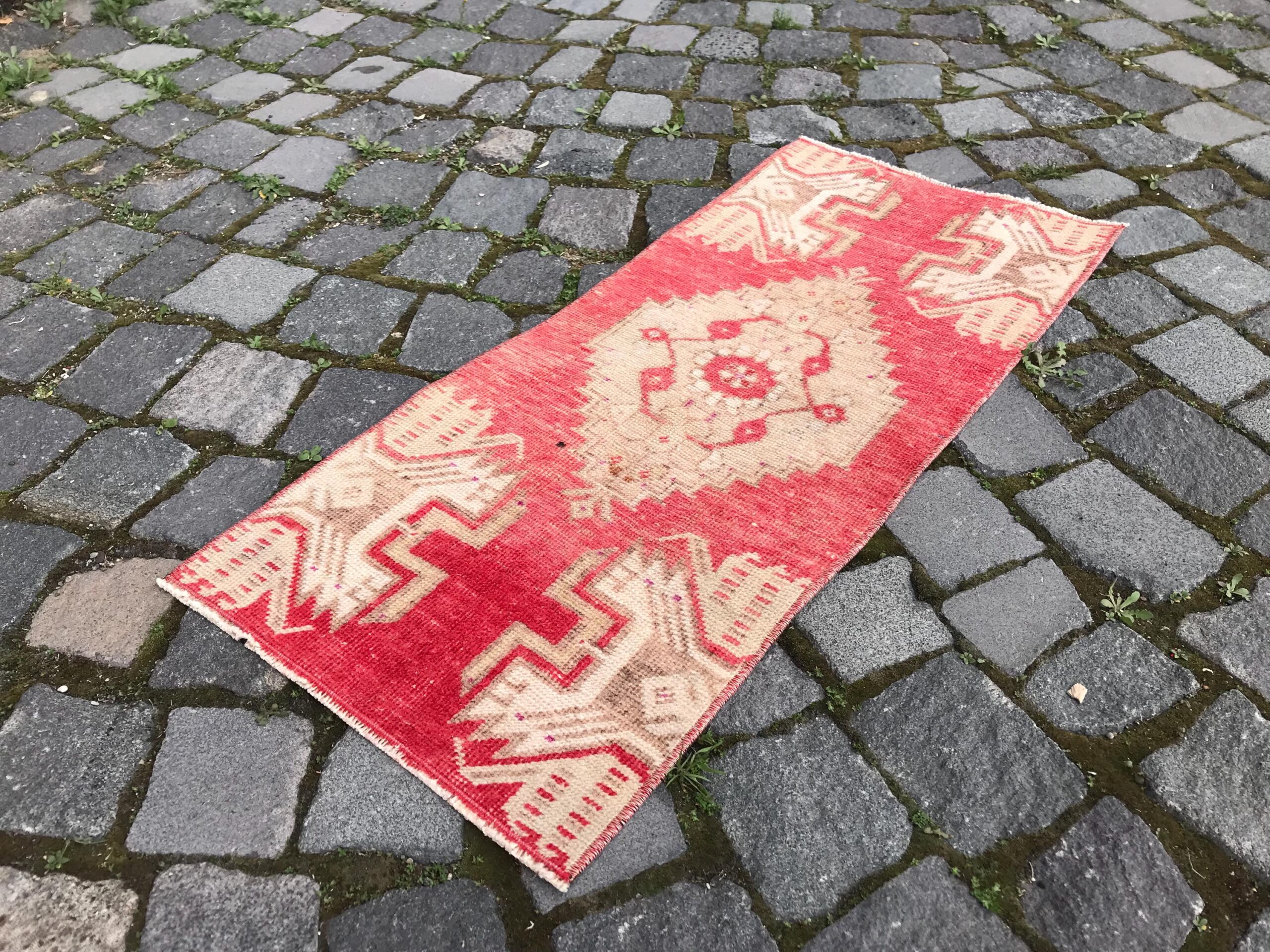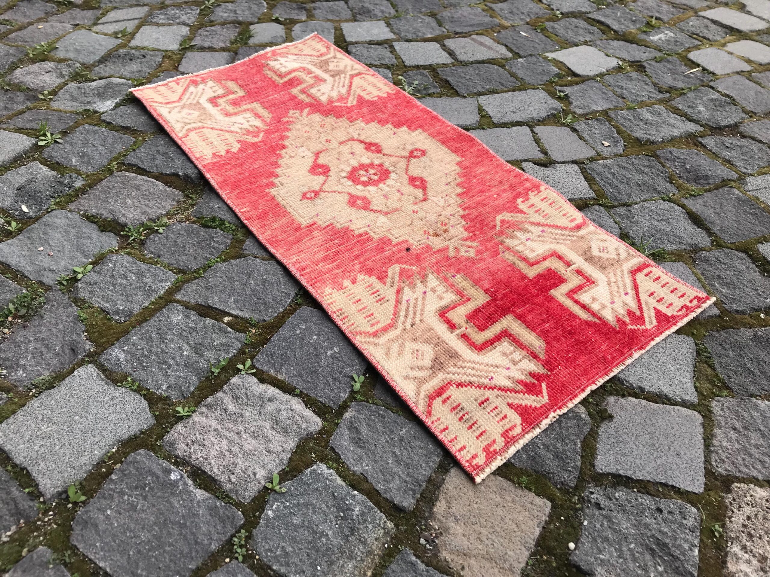 Beautiful and one-of-a-kind 1.3 ft. x 2.7 ft. (39 cm x 83 cm) vintage Turkish rug hand-knotted in Turkey from organic wool. This is an authentic vintage Turkish rug from the 1980s that has worn admirably to perfection.