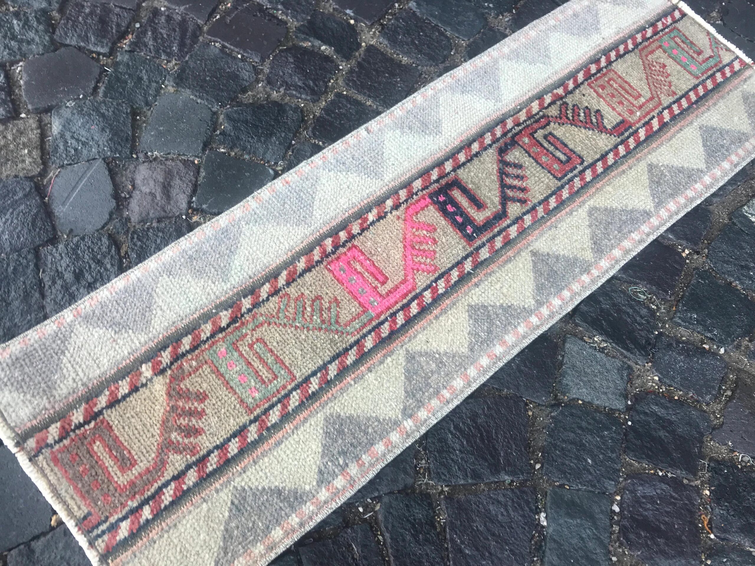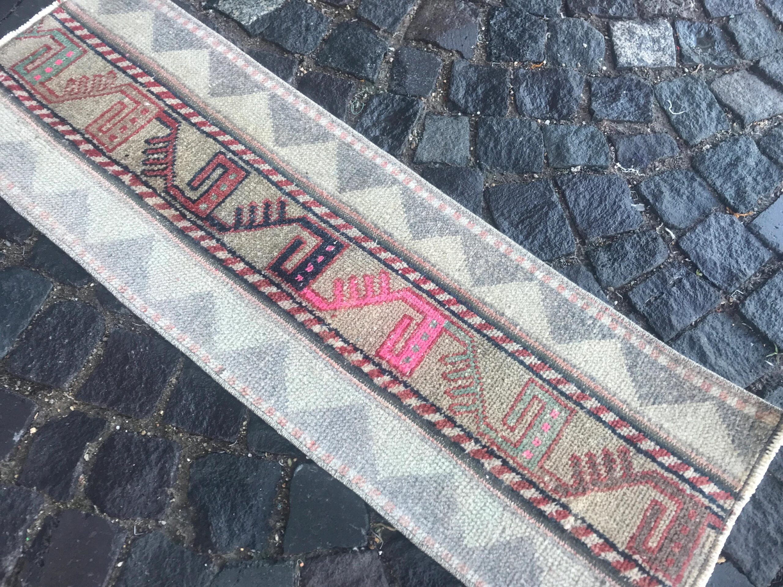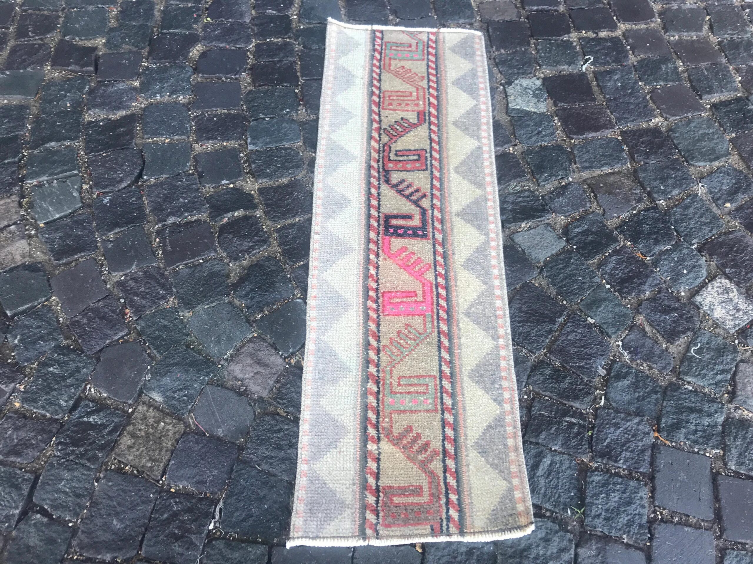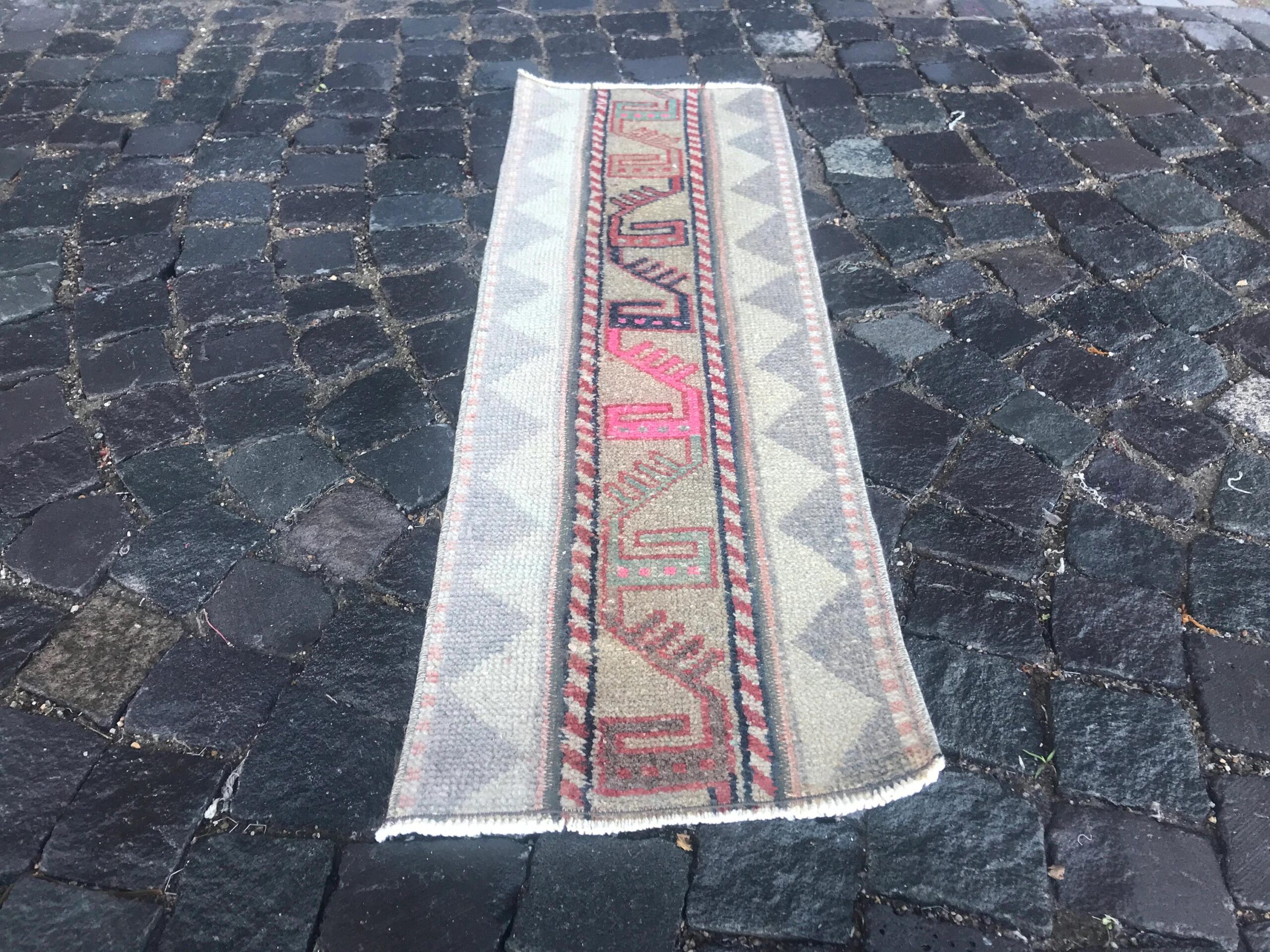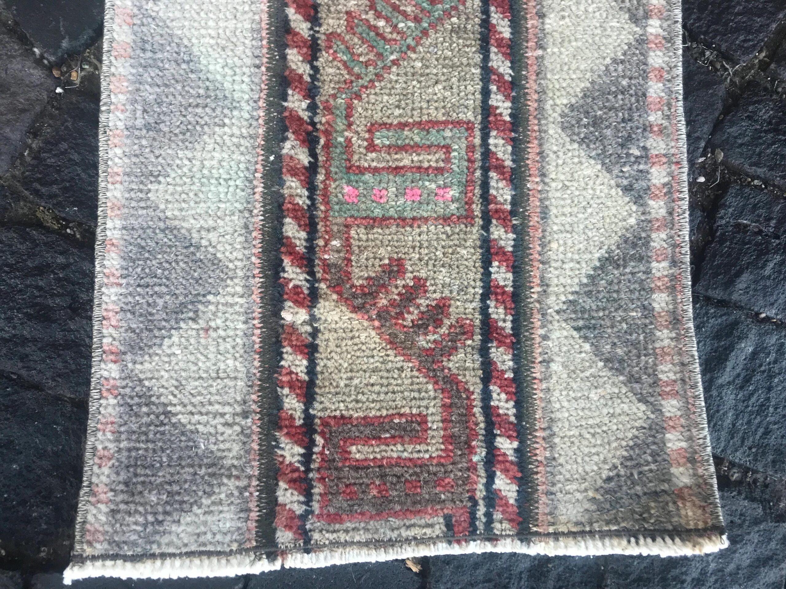 Lovely 1.3 ft. x 4 ft. (41 cm x 123 cm) patchwork rug made from different pieces of hand-knotted vintage Turkish rugs to end-up with a beautiful one-of-a-kind piece of art.