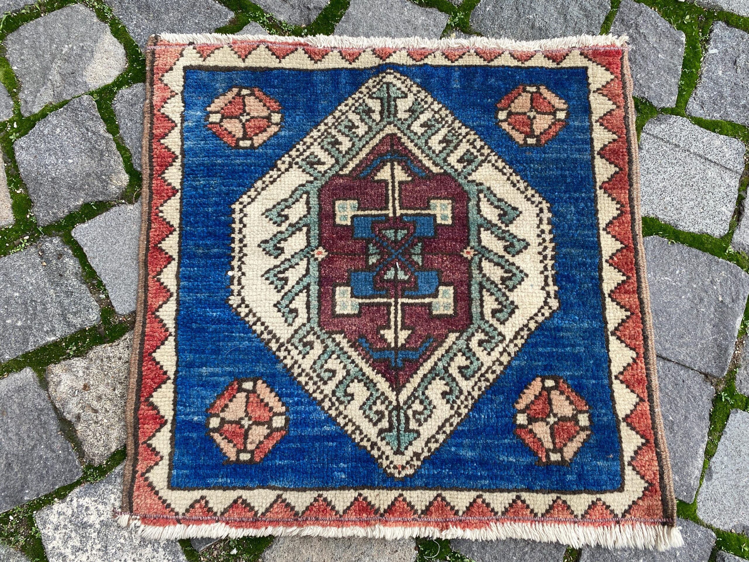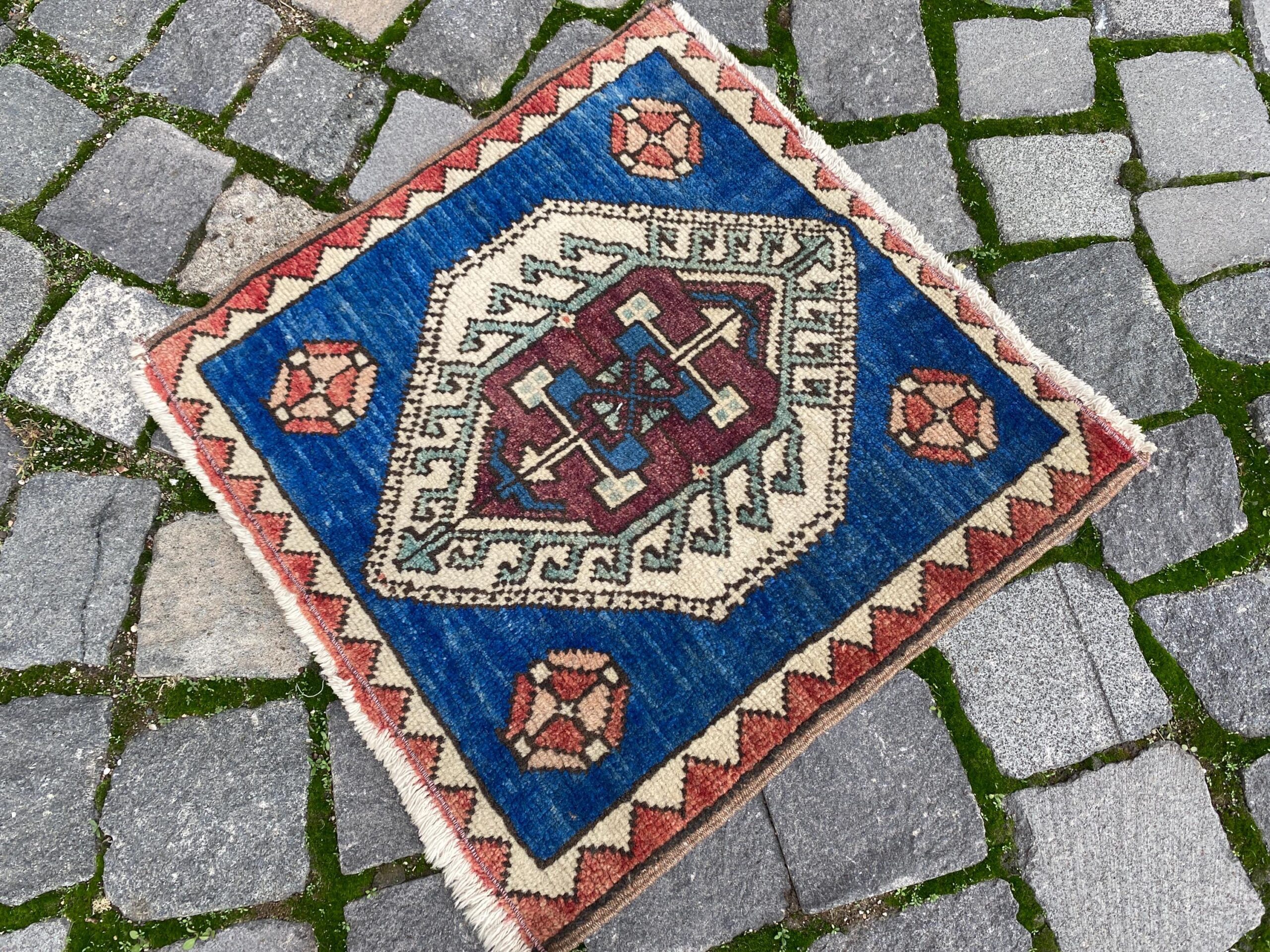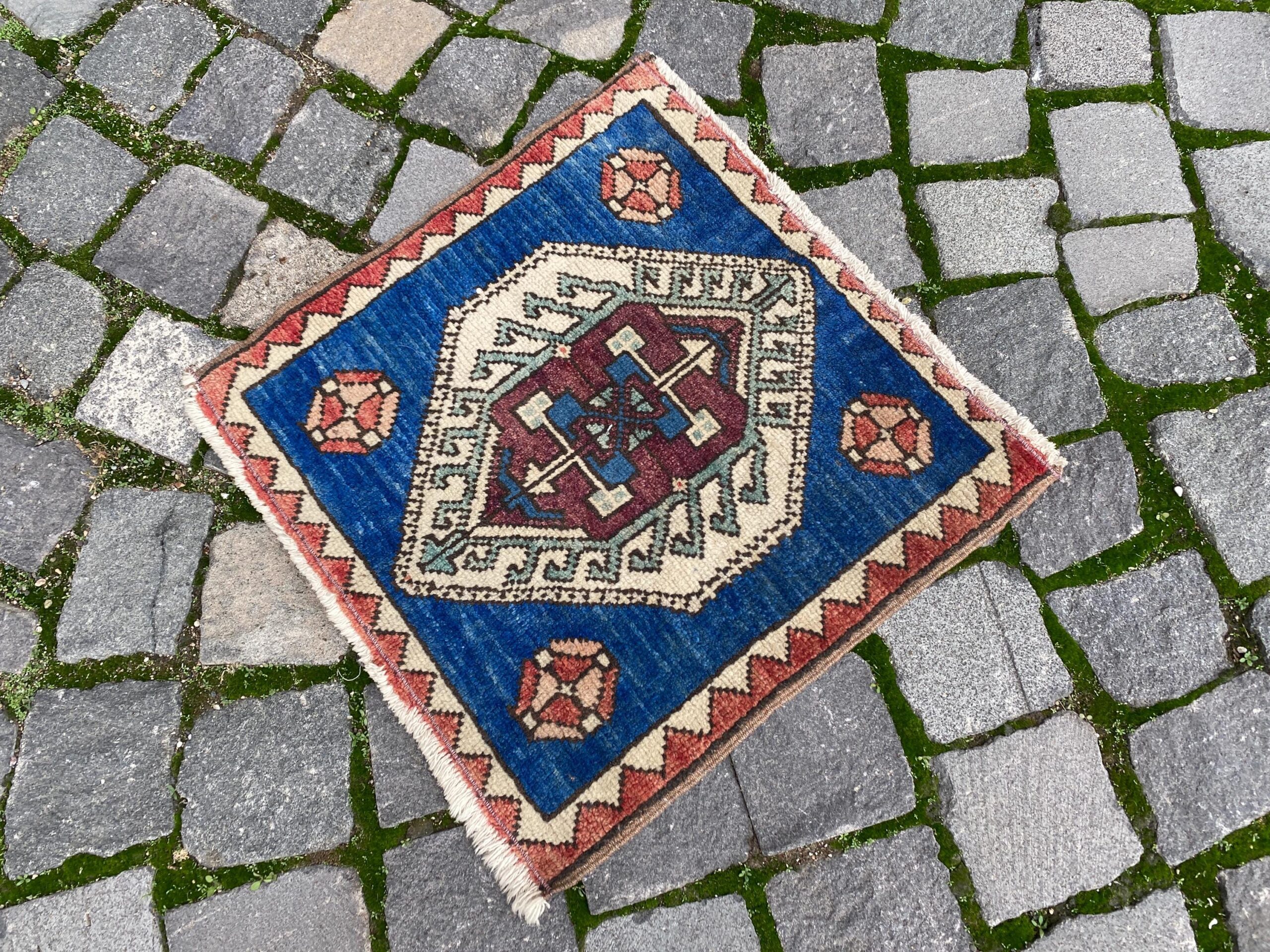 Lovely and unique 1.4 ft. x 1.5 ft. (42 cm x 46 cm) vintage Turkish rug hand-knotted in Turkey from organic wool. This is an authentic vintage Turkish rug from the 1980s that has worn beautifully to perfection.