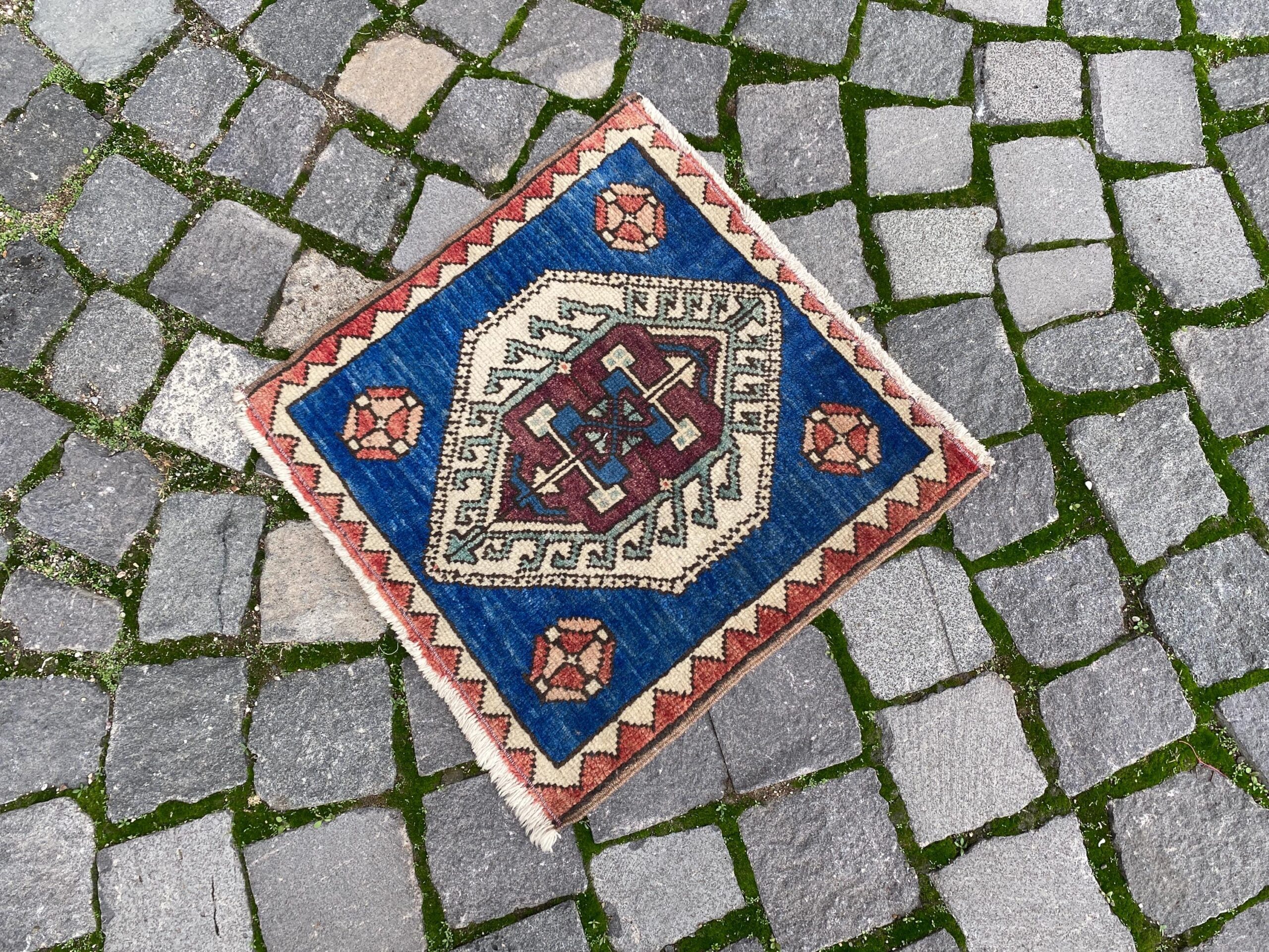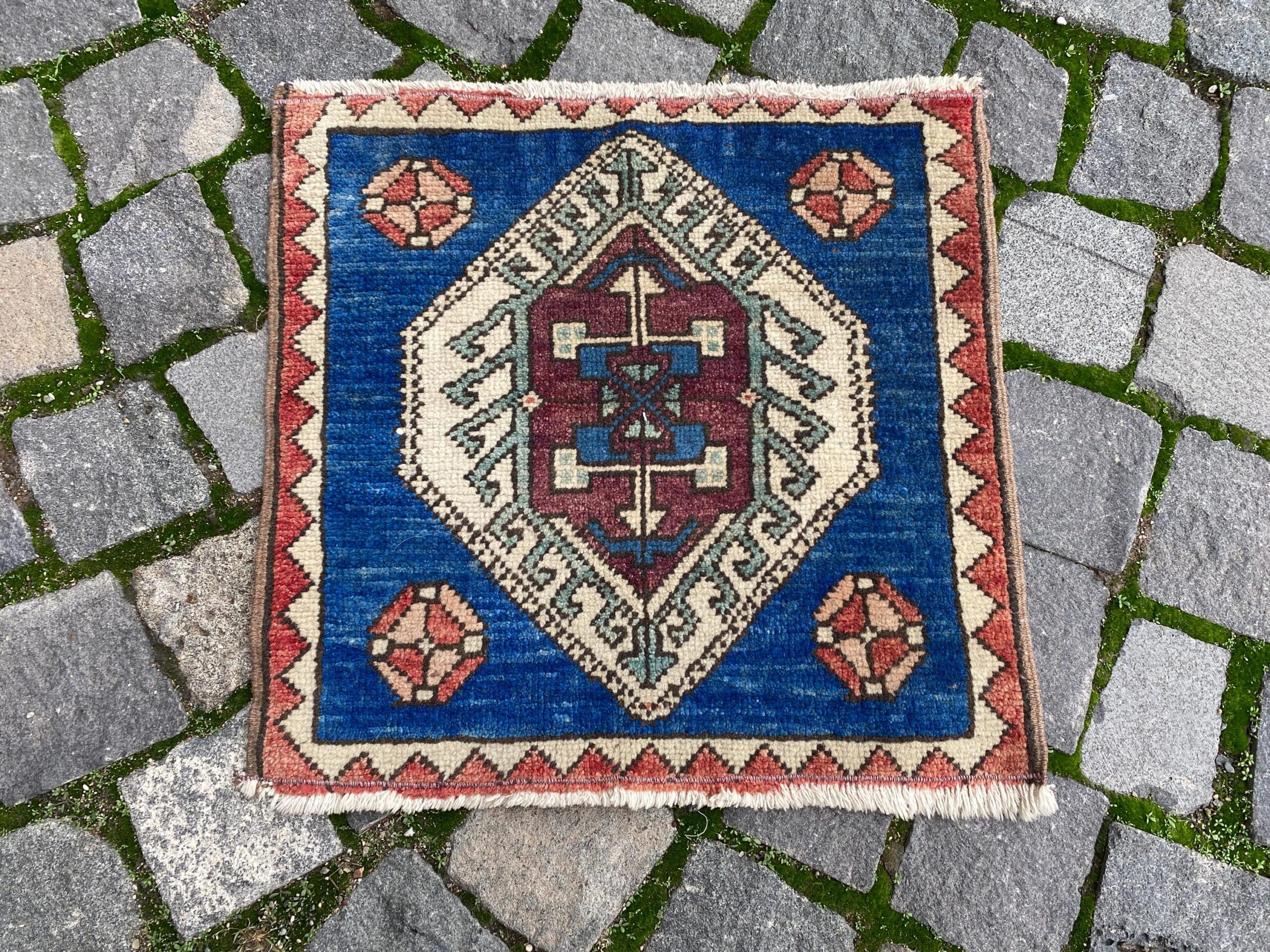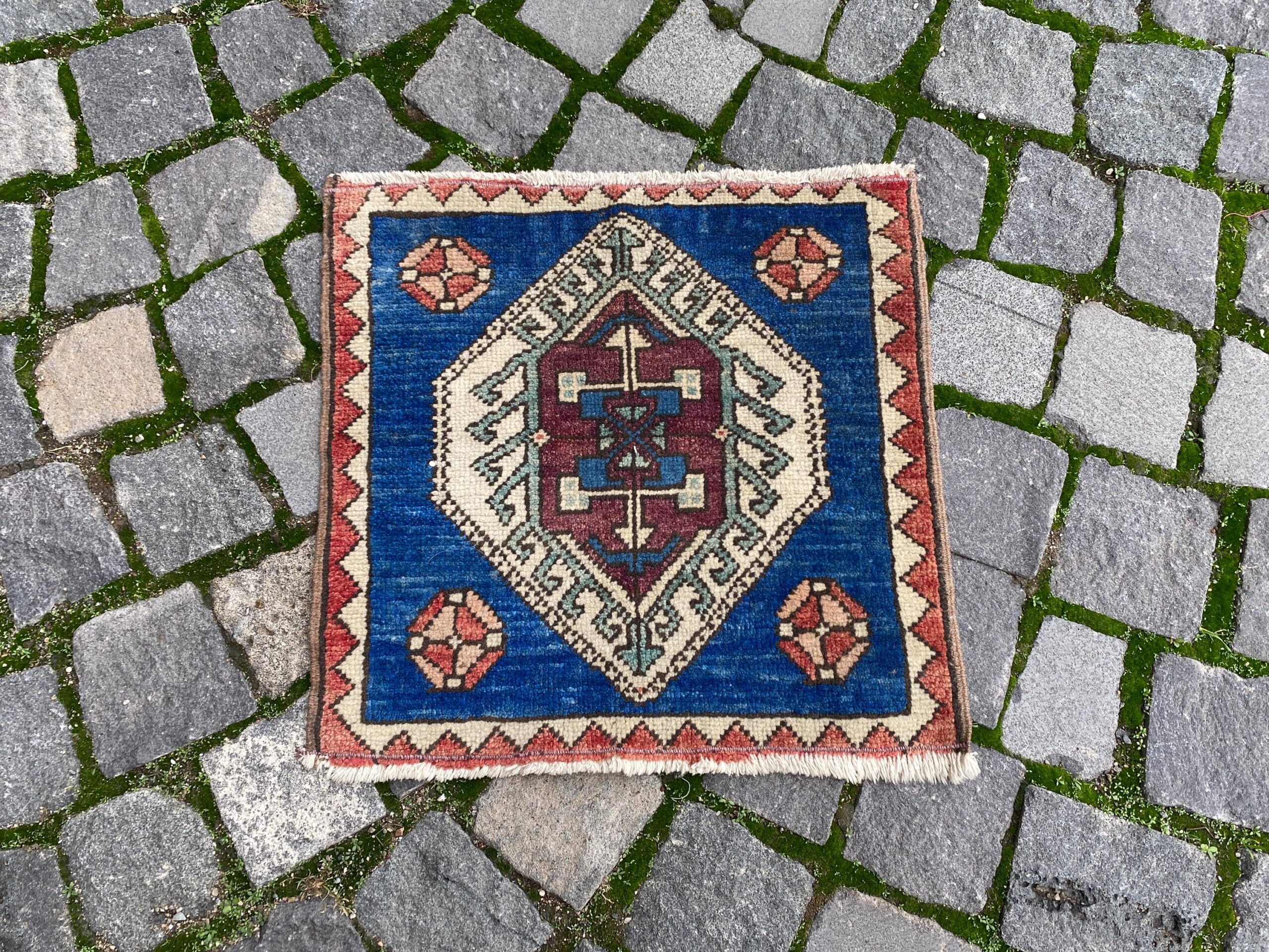 Lovely and unique 1.4 ft. x 1.5 ft. (42 cm x 46 cm) vintage Turkish rug hand-knotted in Turkey from organic wool. This is an authentic vintage Turkish rug from the 1980s that has worn beautifully to perfection.