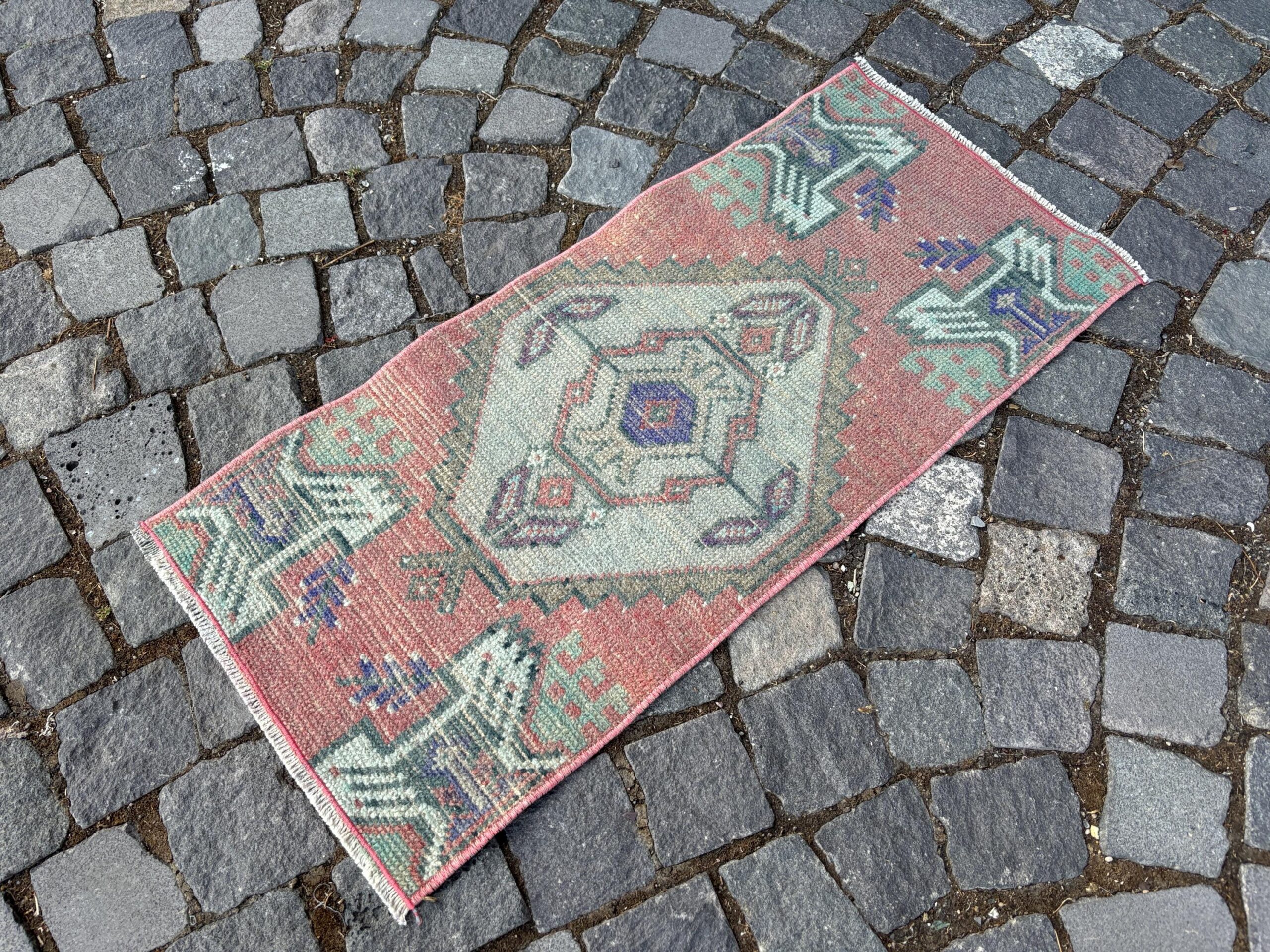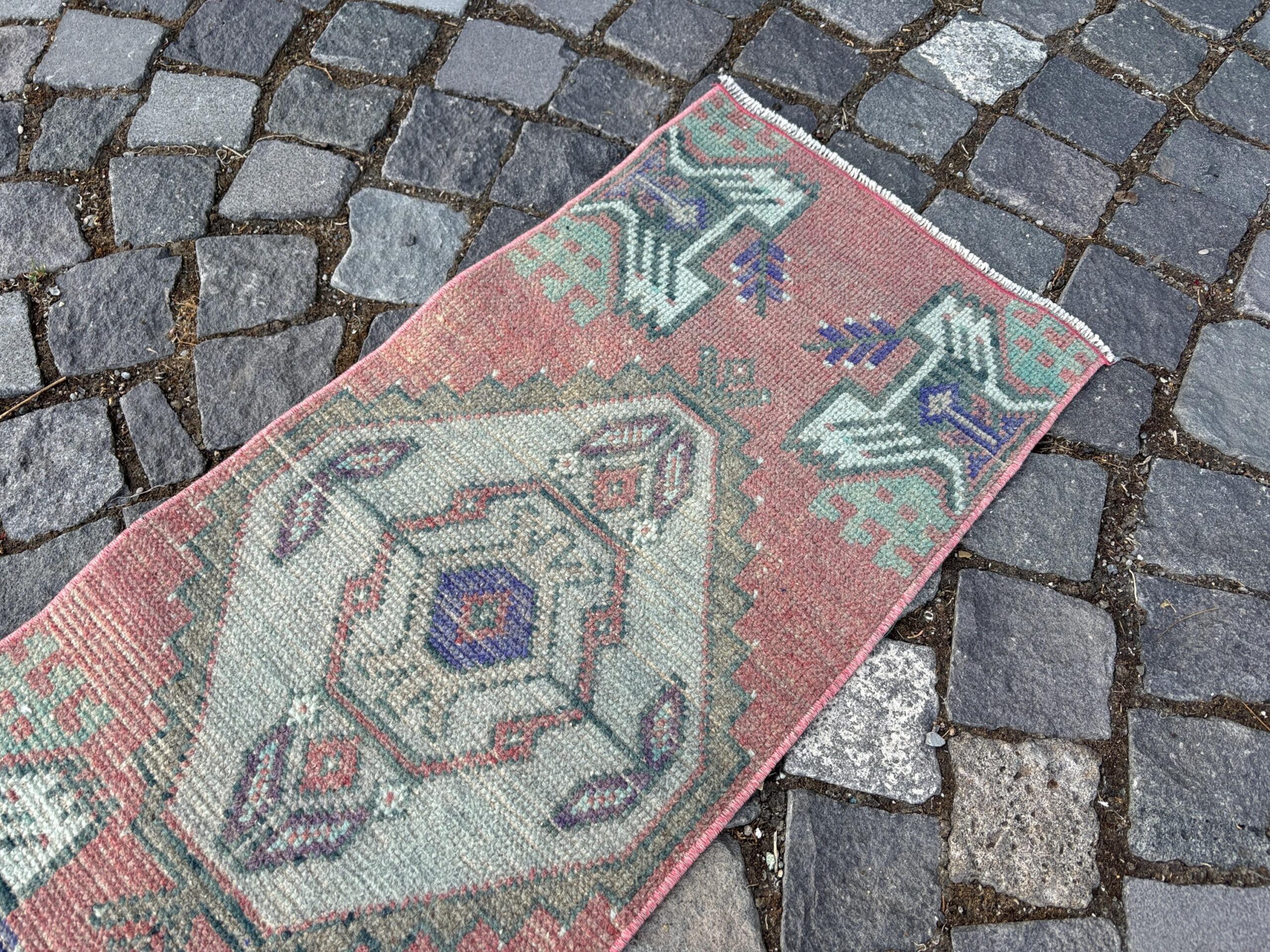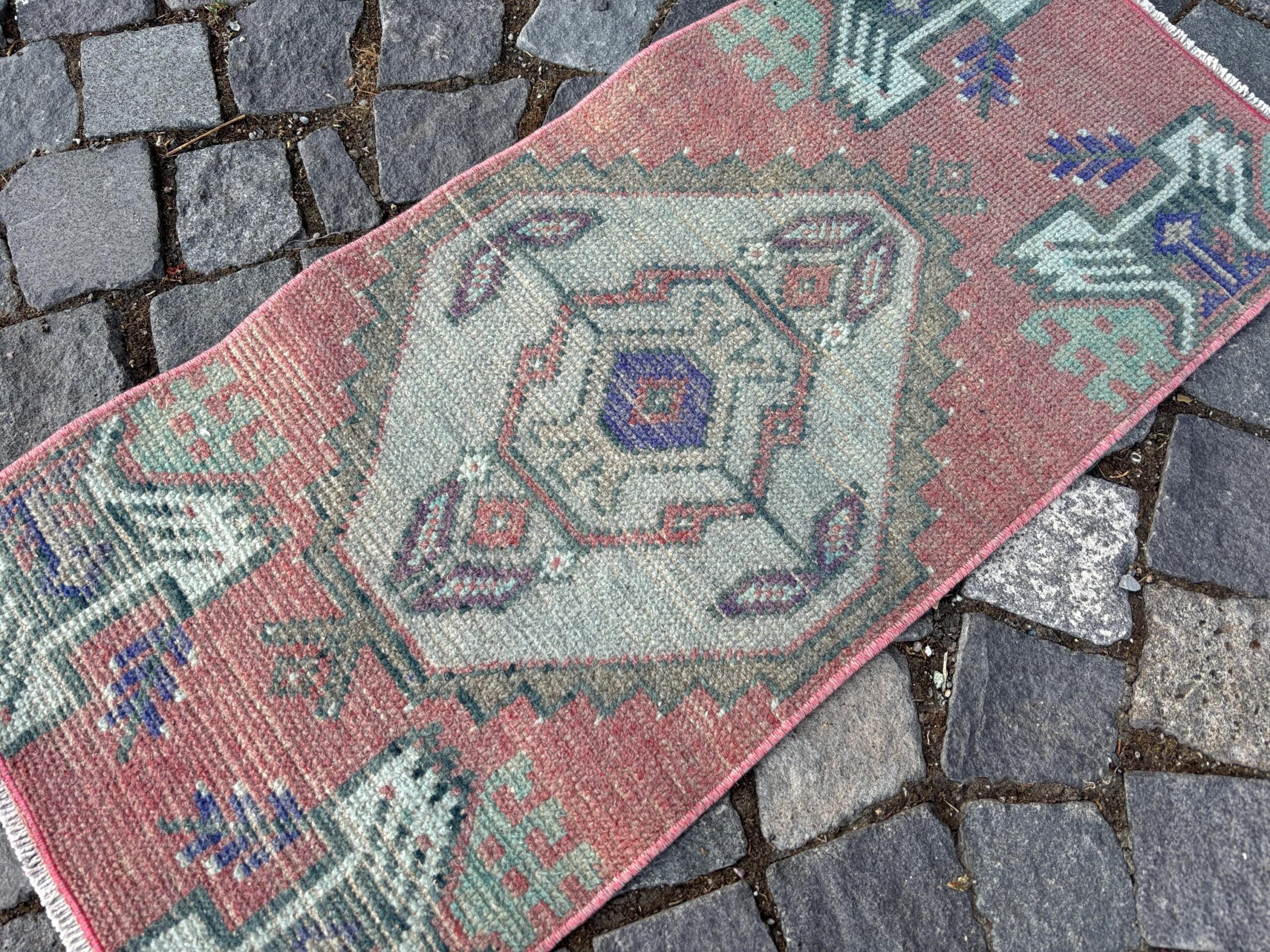 Beautiful and one-of-a-kind 1.4 ft. x 3.1 ft. (42 cm x 93 cm) vintage Turkish rug hand-knotted in Turkey from organic wool. This is an authentic vintage Turkish rug from the 1980s that has worn admirably to perfection.