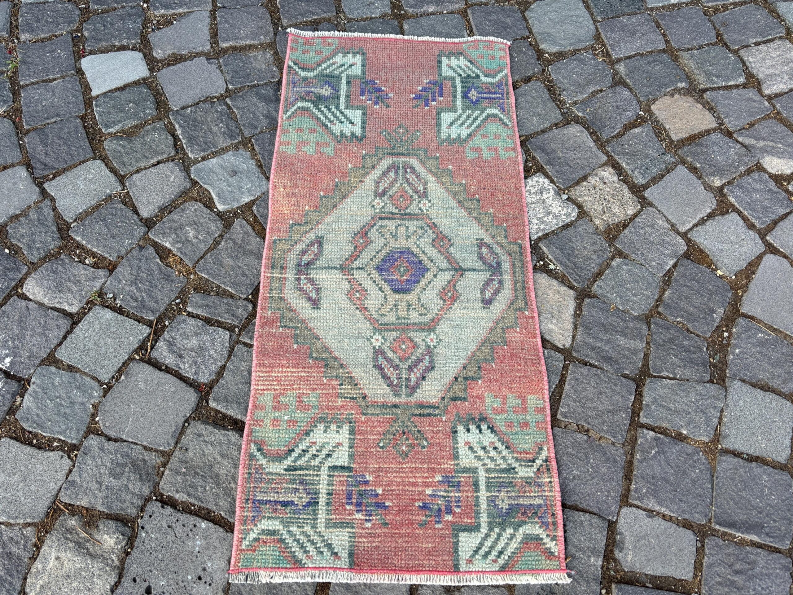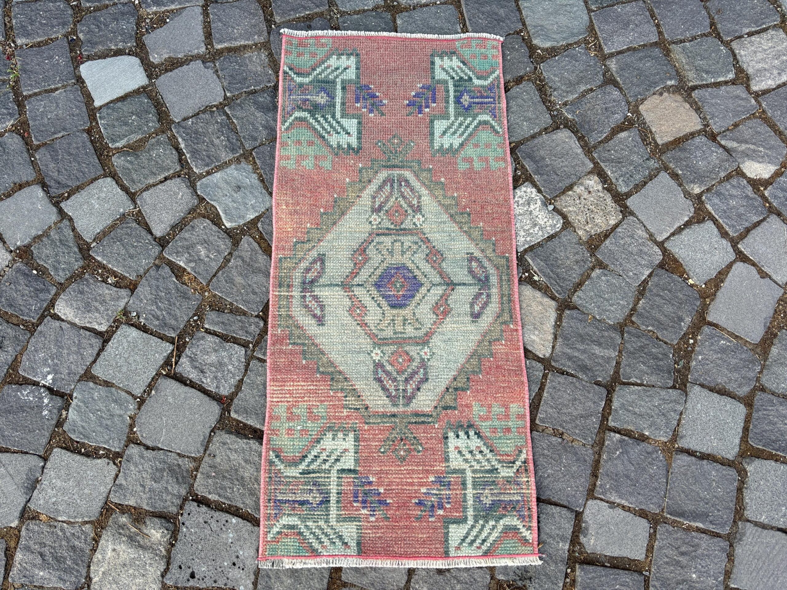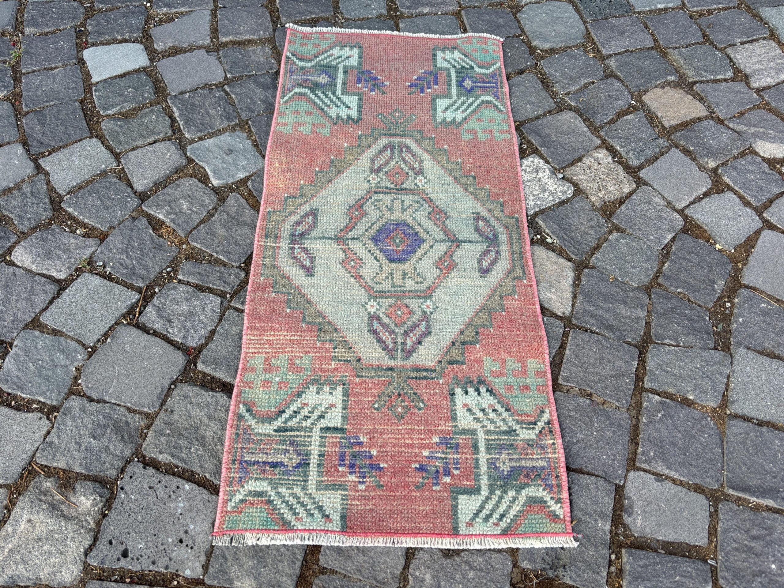 Beautiful and one-of-a-kind 1.4 ft. x 3.1 ft. (42 cm x 93 cm) vintage Turkish rug hand-knotted in Turkey from organic wool. This is an authentic vintage Turkish rug from the 1980s that has worn admirably to perfection.
