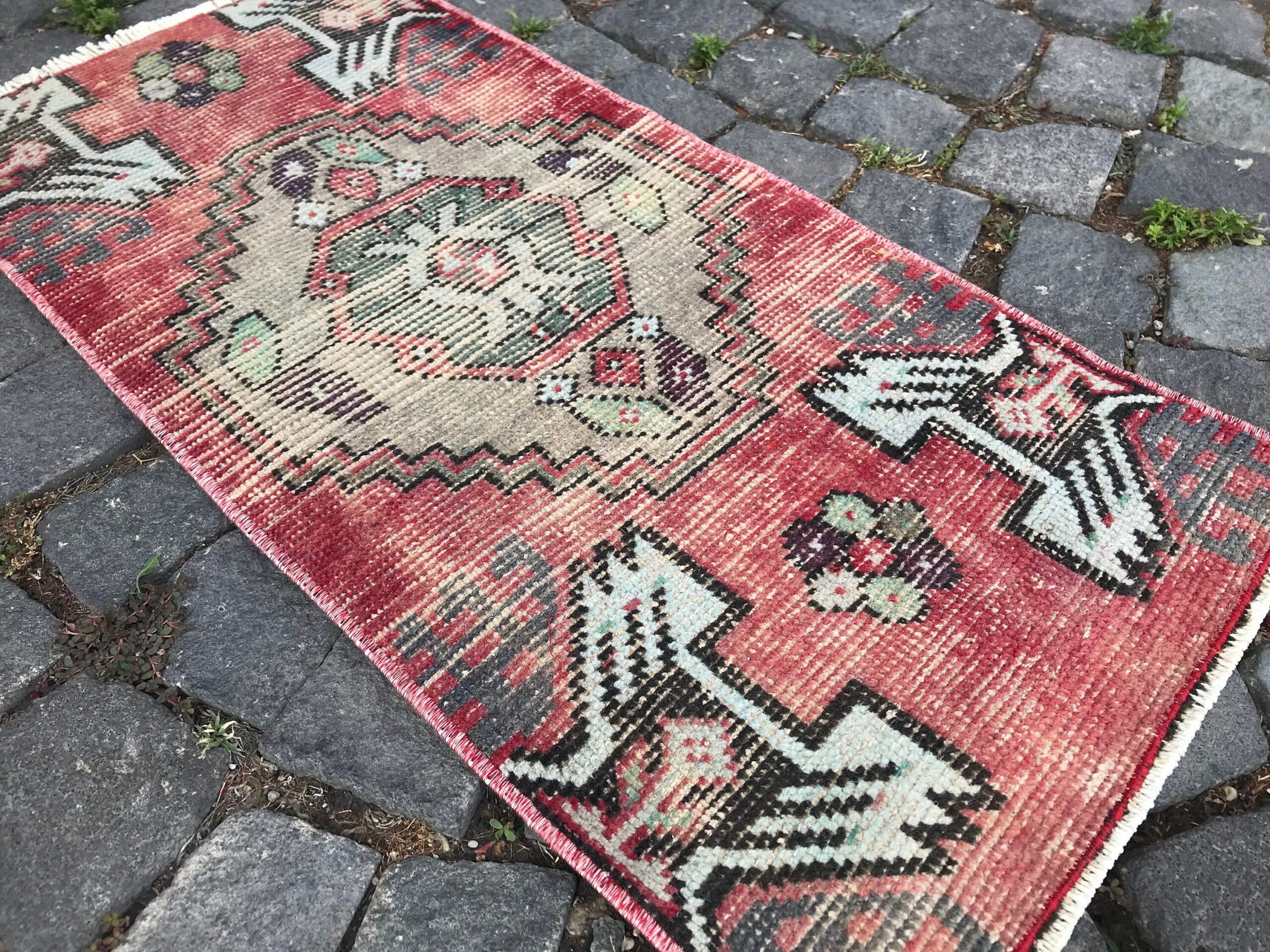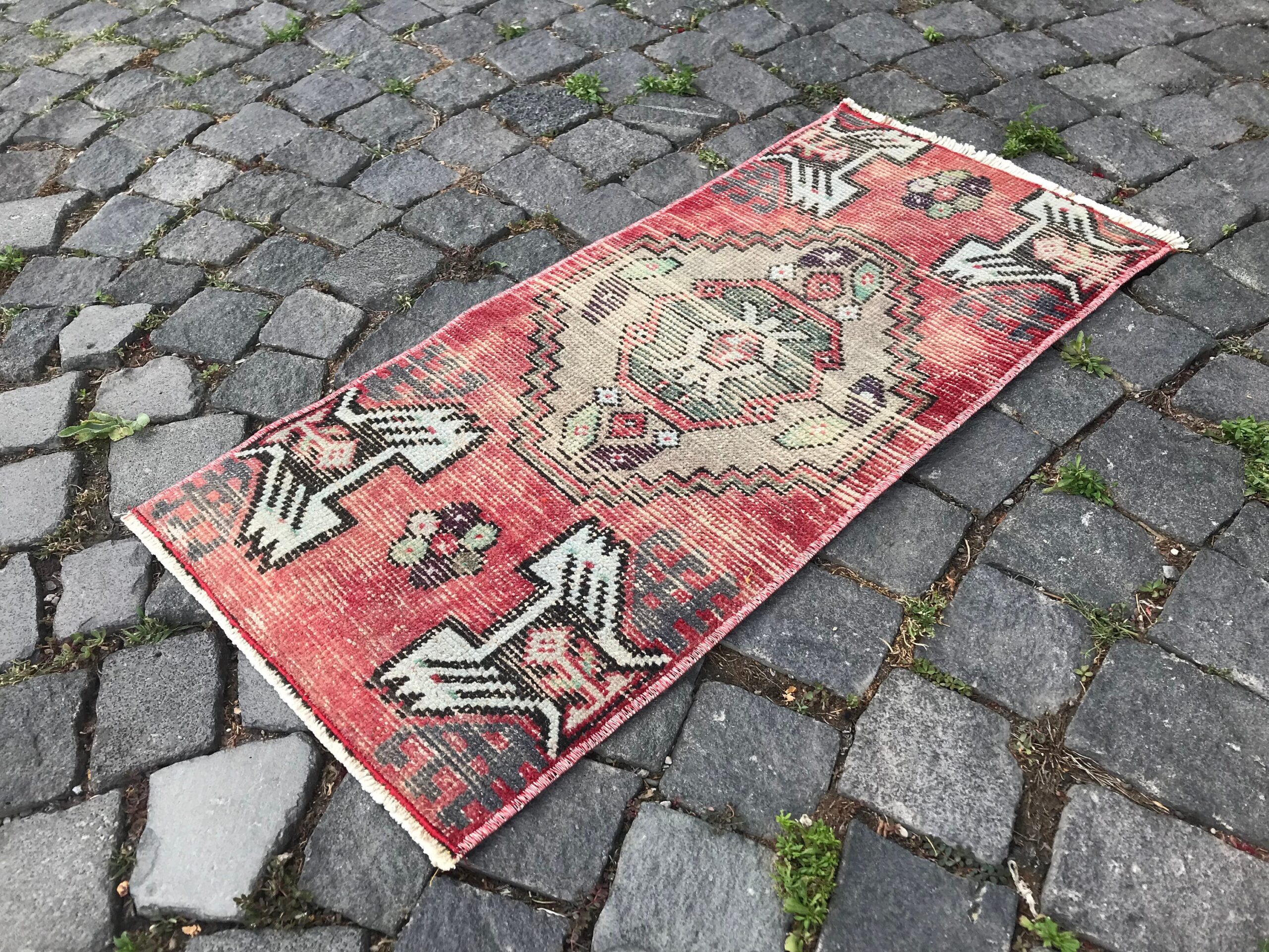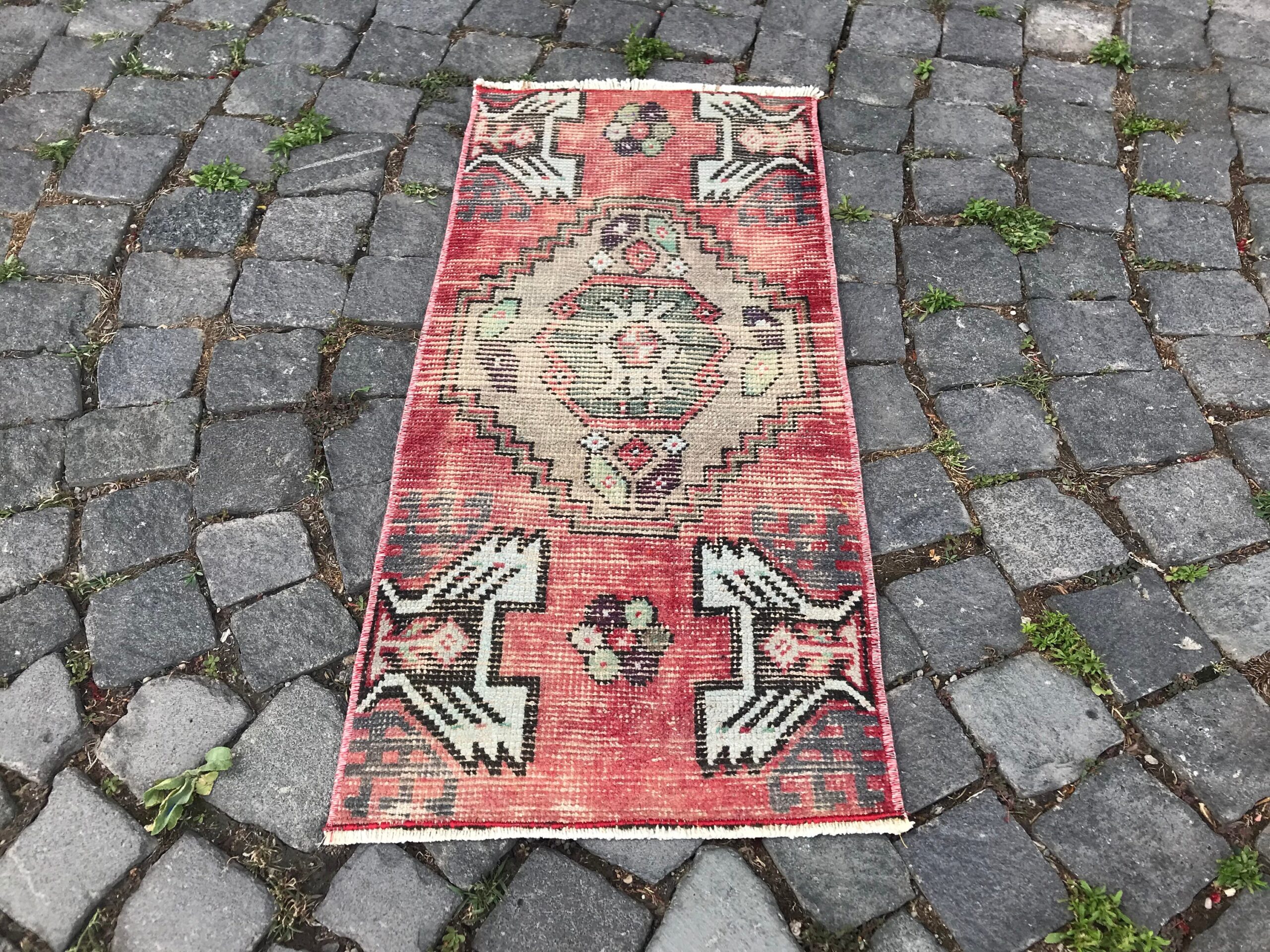 Lovely and unique 1.4 ft. x 3 ft. (42 cm x 90 cm) vintage Turkish rug hand-knotted in Turkey from organic wool. This is an authentic vintage Turkish rug from the 1980s that has worn beautifully to perfection.