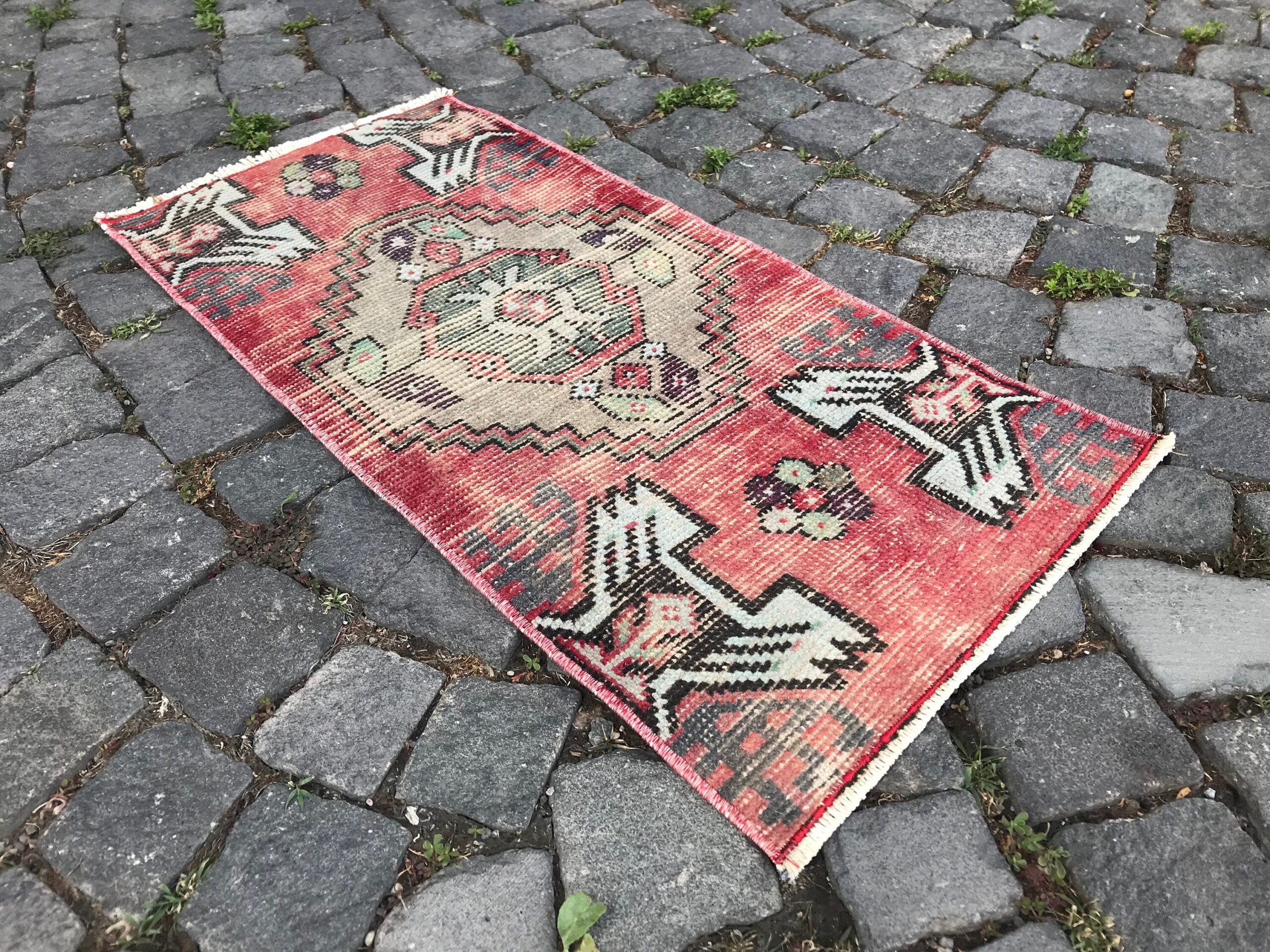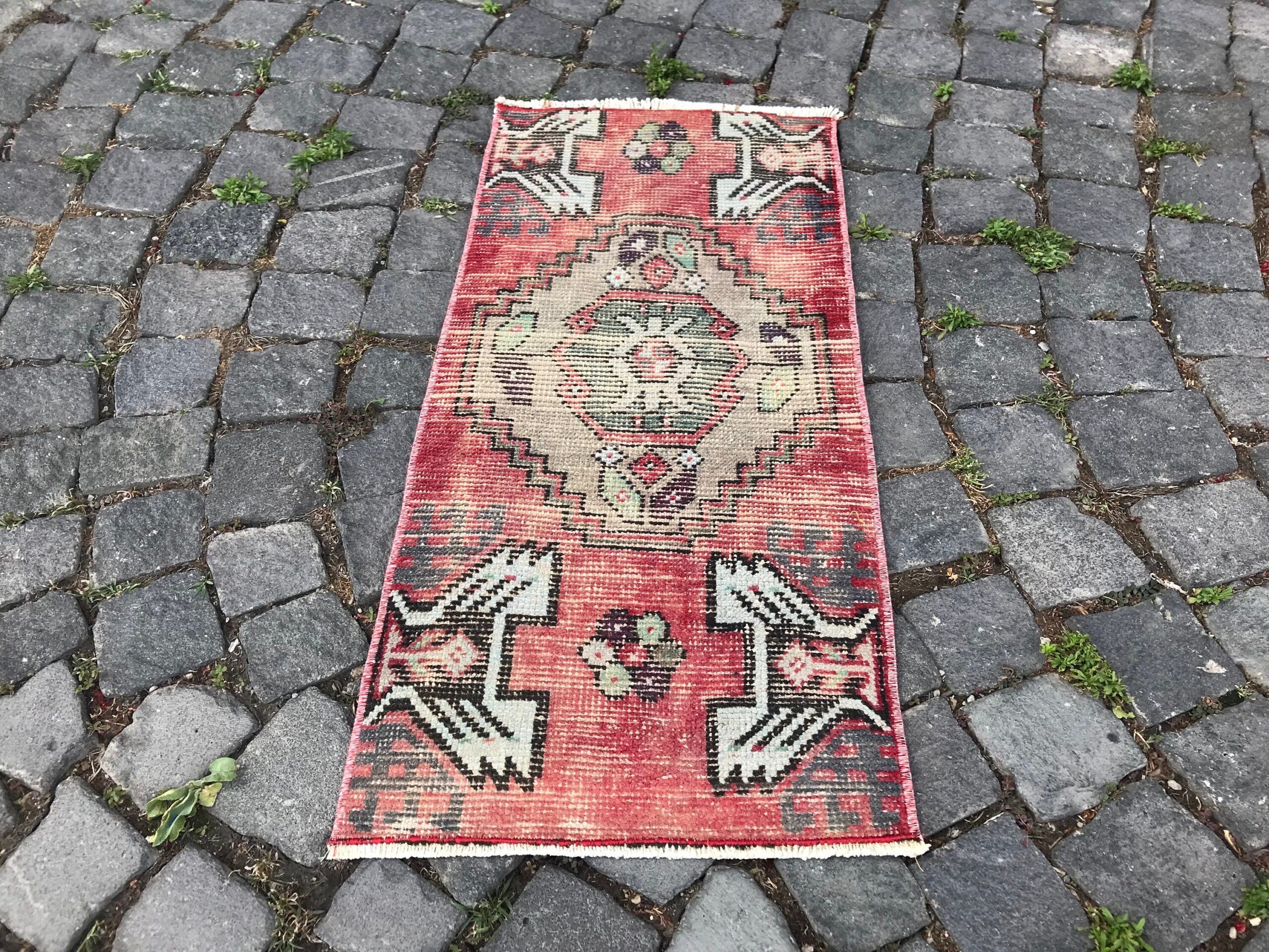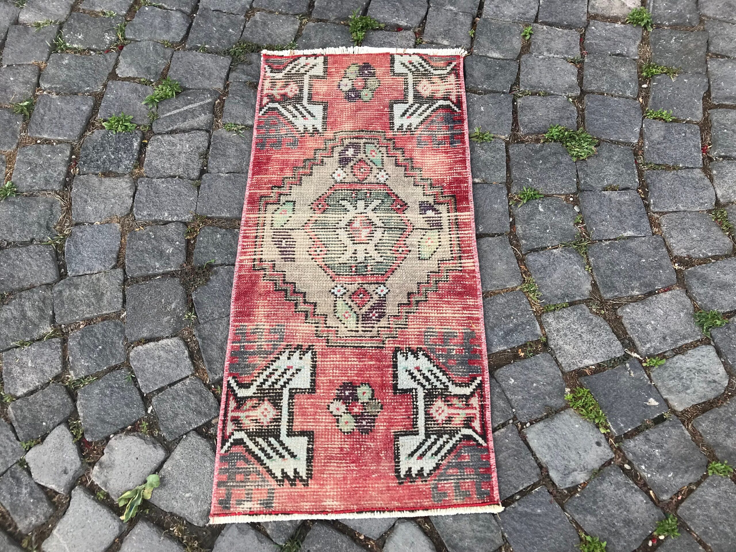 Lovely and unique 1.4 ft. x 3 ft. (42 cm x 90 cm) vintage Turkish rug hand-knotted in Turkey from organic wool. This is an authentic vintage Turkish rug from the 1980s that has worn beautifully to perfection.