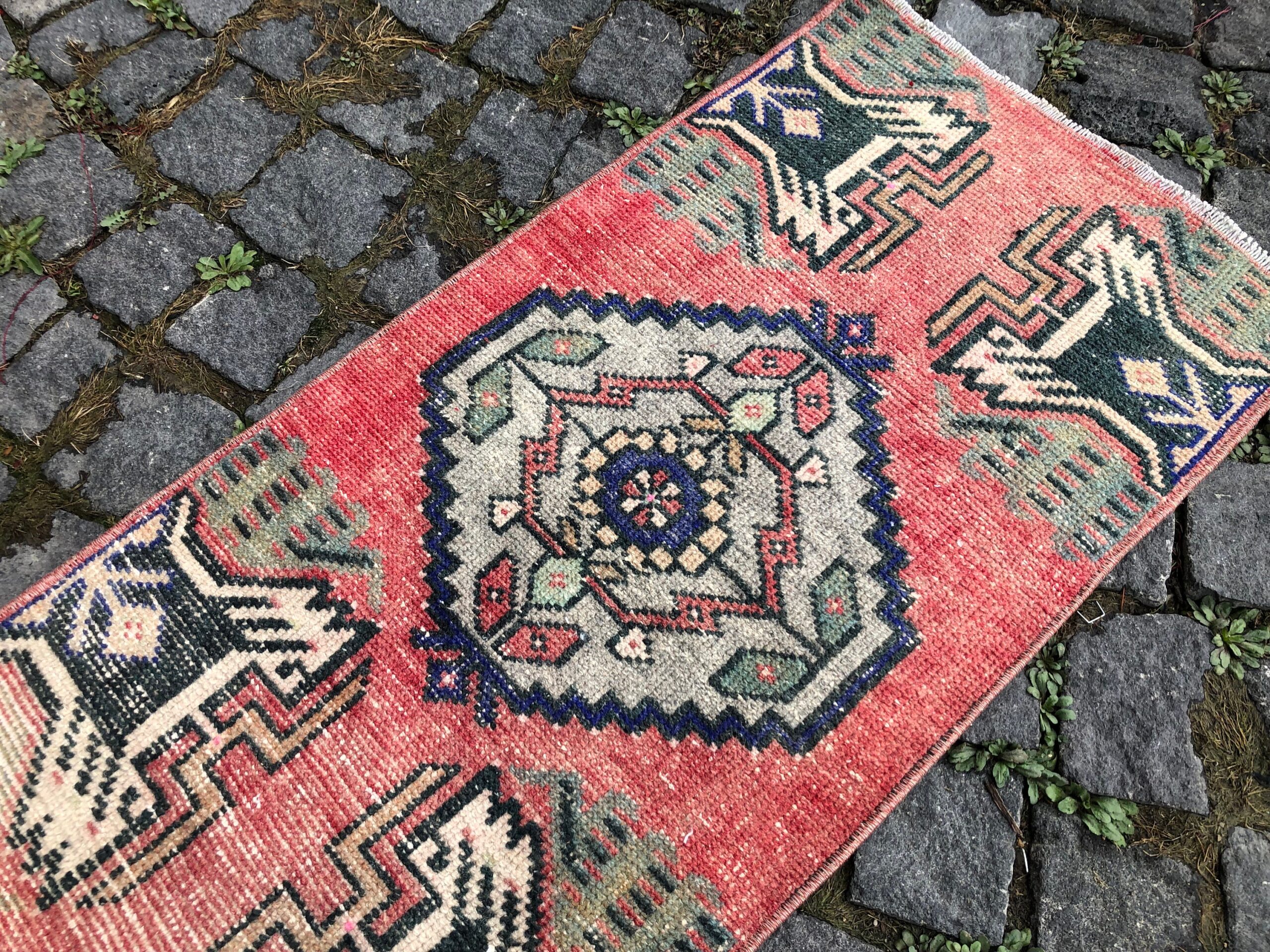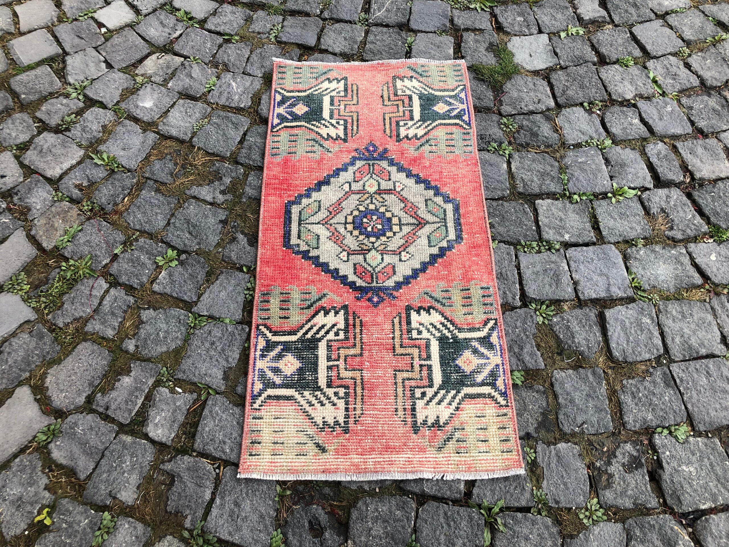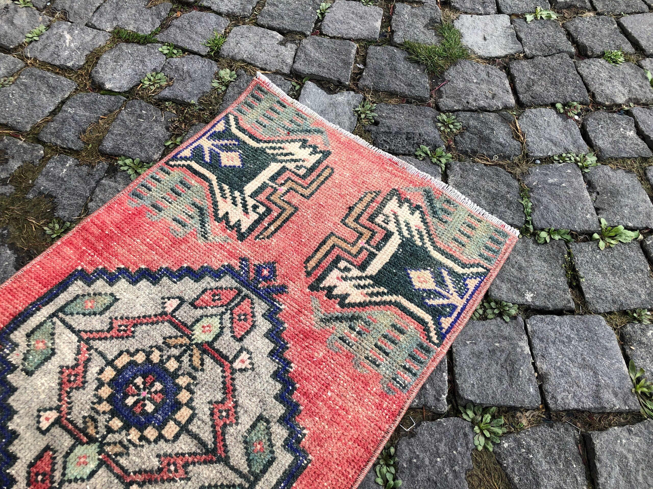 Lovely and unique 1.5 ft. x 3 ft. (45 cm x 91 cm) vintage Turkish rug hand-knotted in Turkey from organic wool. This is an authentic vintage Turkish rug from the 1980s that has worn beautifully to perfection.