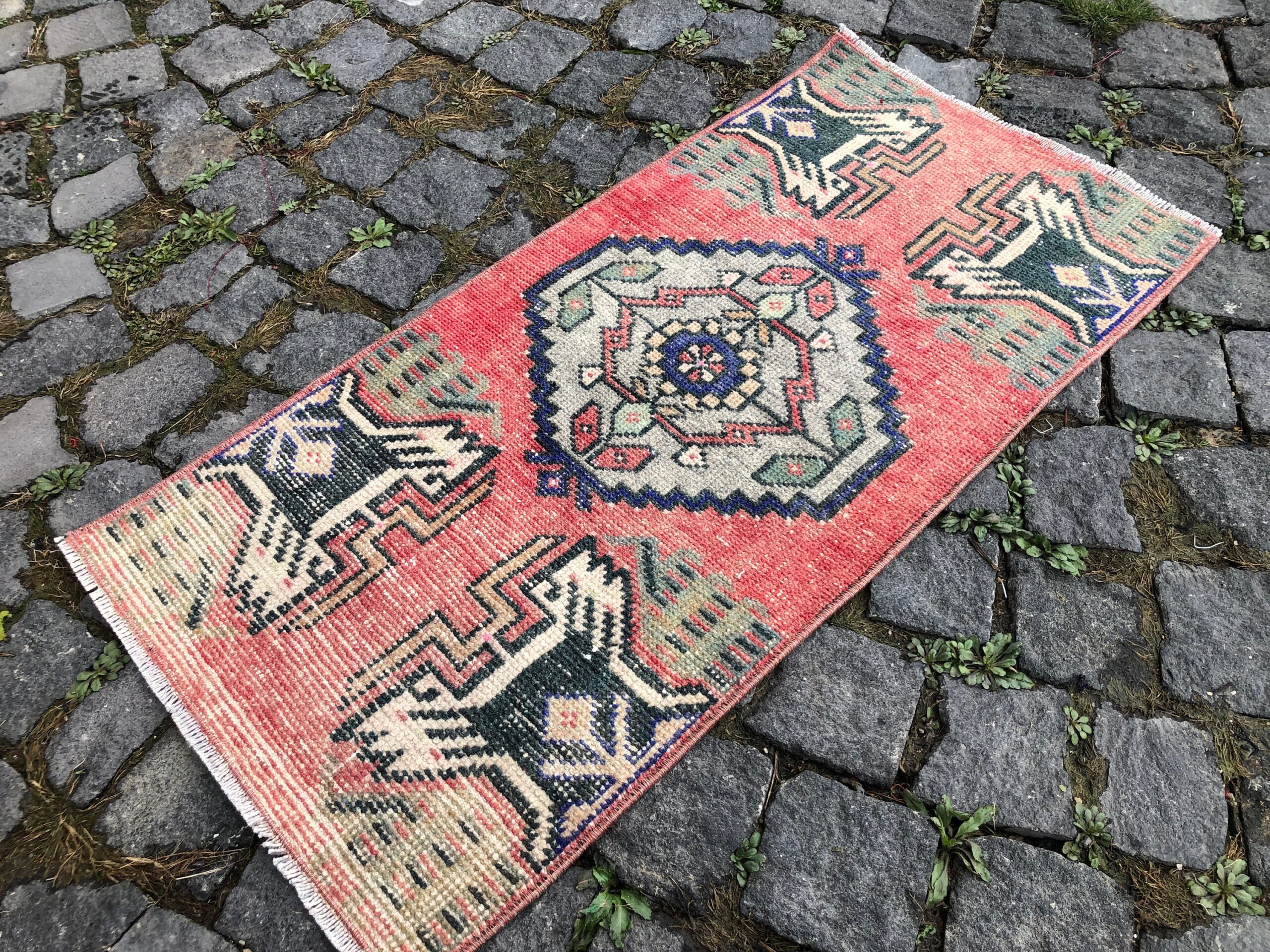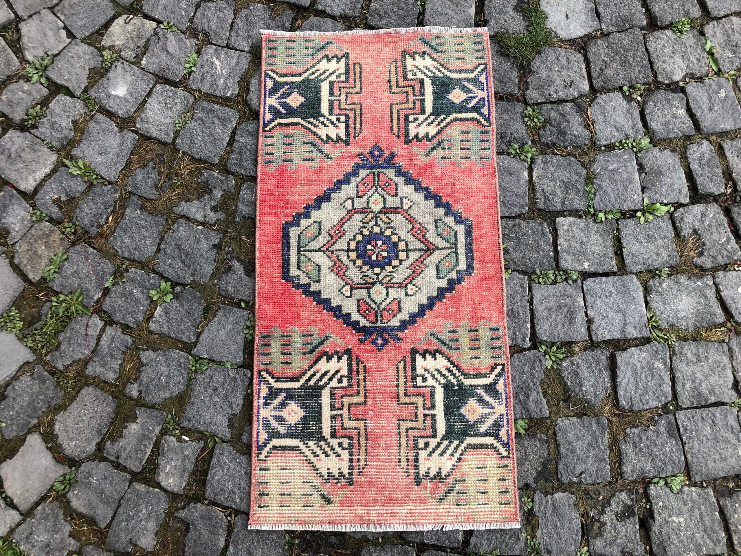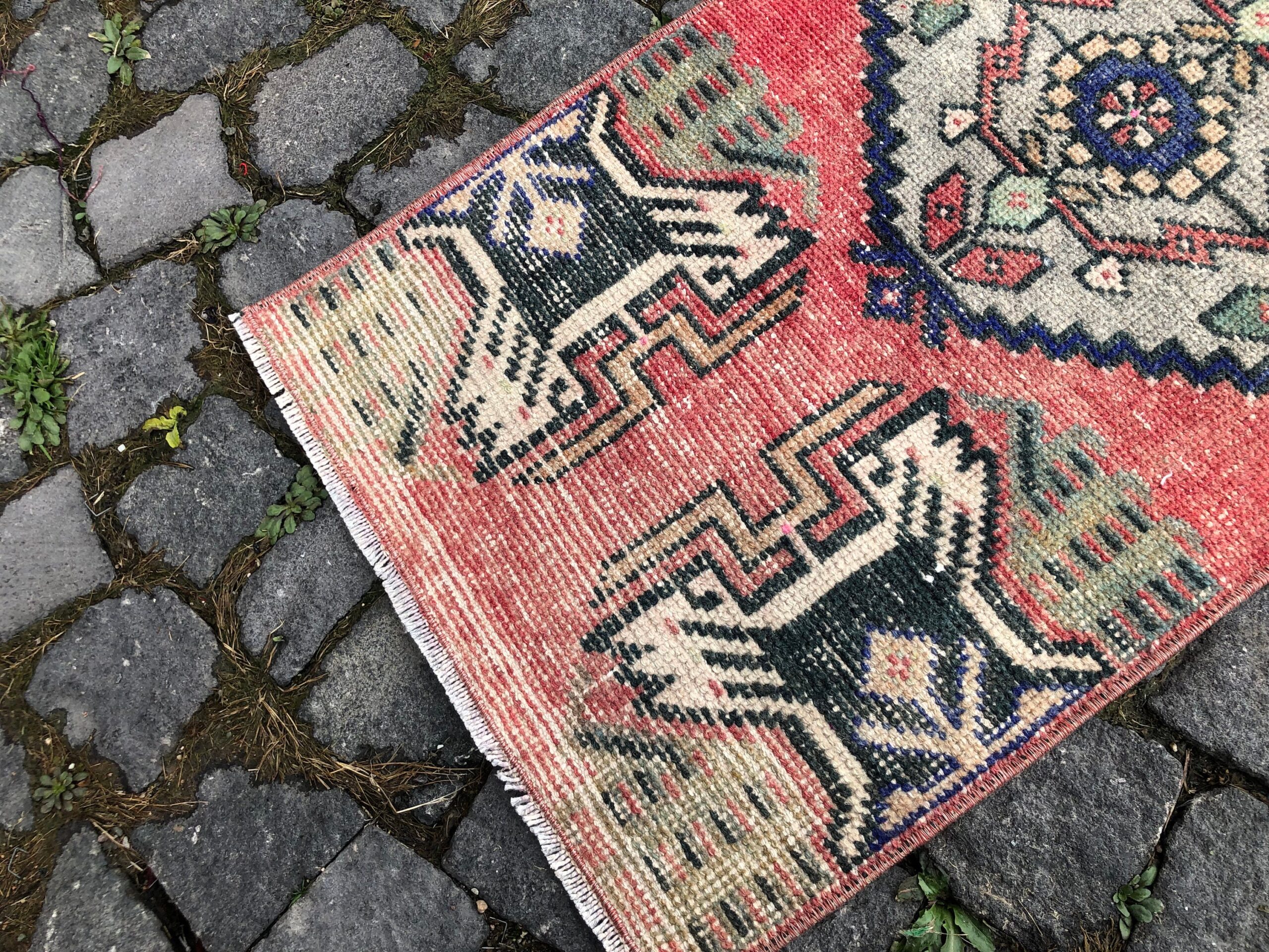 Lovely and unique 1.5 ft. x 3 ft. (45 cm x 91 cm) vintage Turkish rug hand-knotted in Turkey from organic wool. This is an authentic vintage Turkish rug from the 1980s that has worn beautifully to perfection.