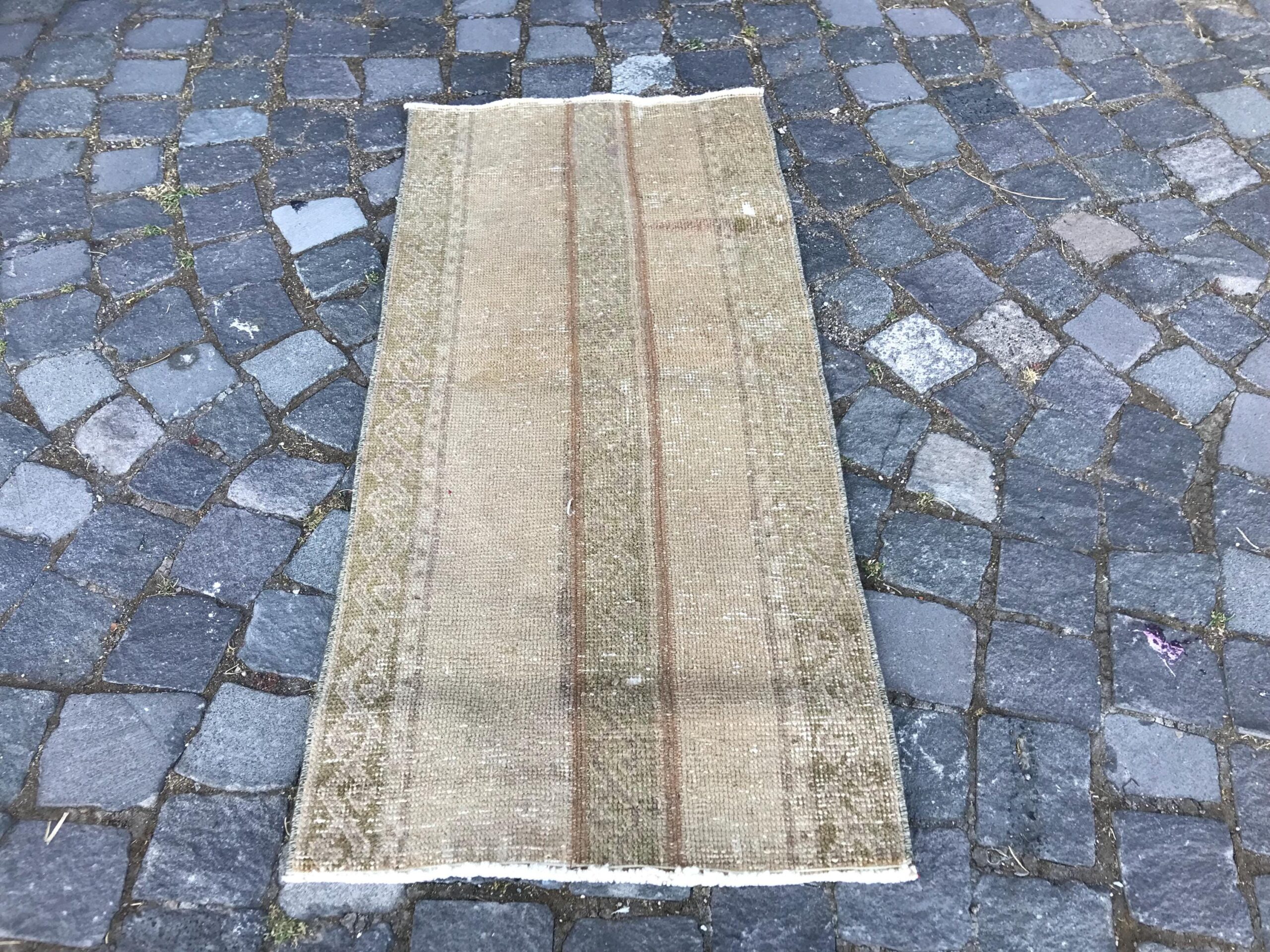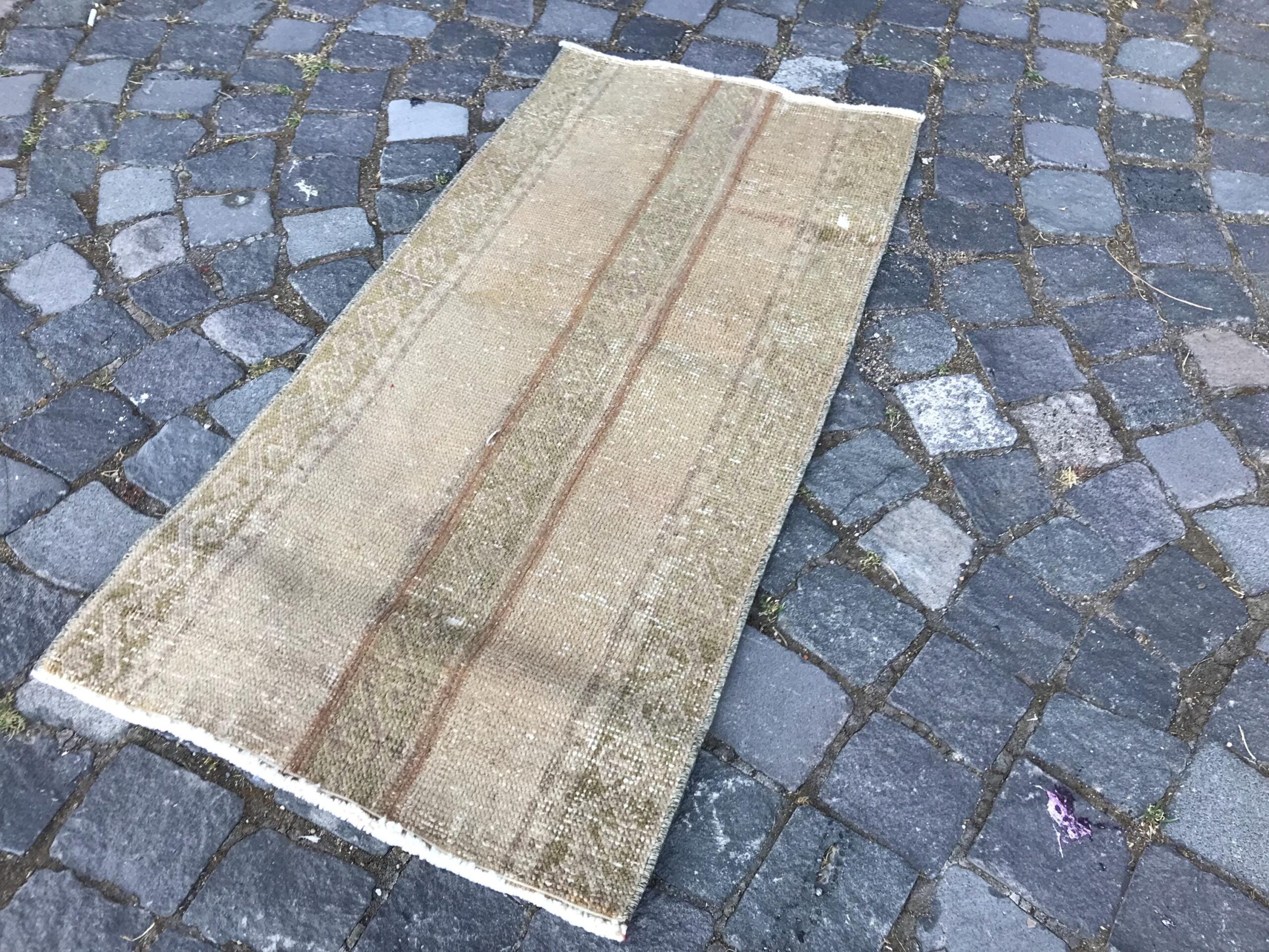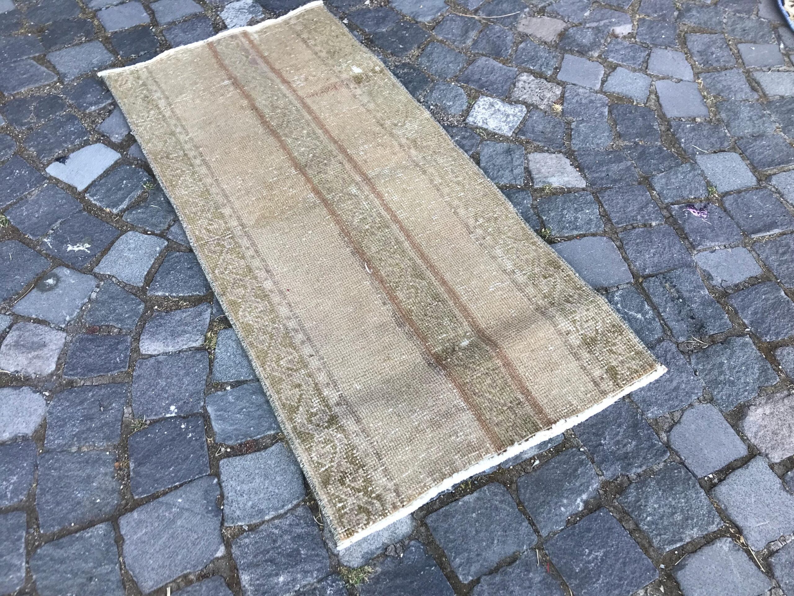 Beautiful 1.7 ft. x 3.7 ft. (53 cm x 112 cm) patchwork rug made from different pieces of hand-knotted vintage Turkish rugs to end-up with an admirable unique piece of art.
