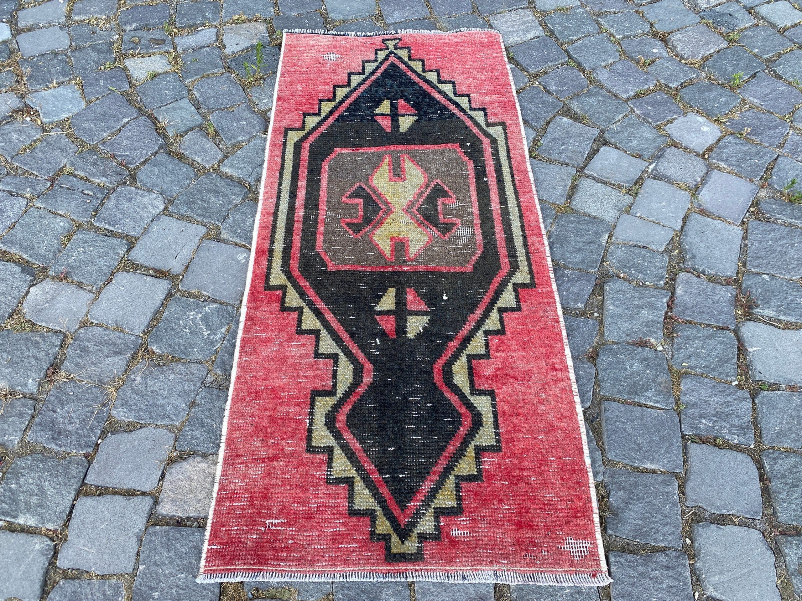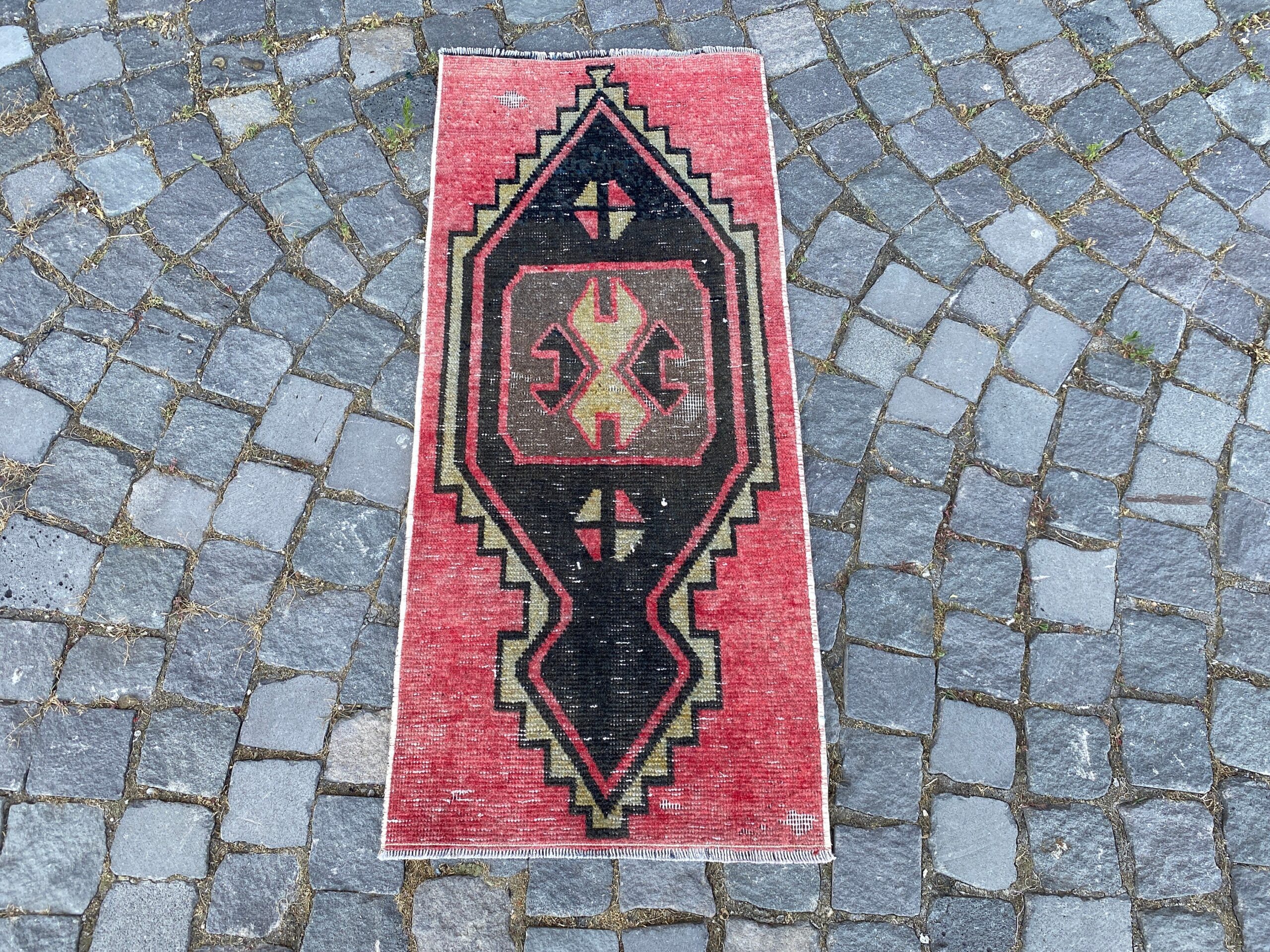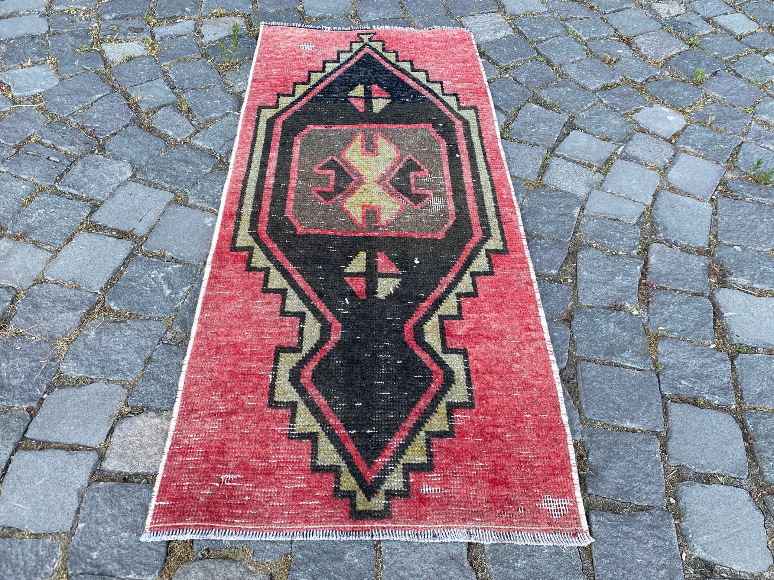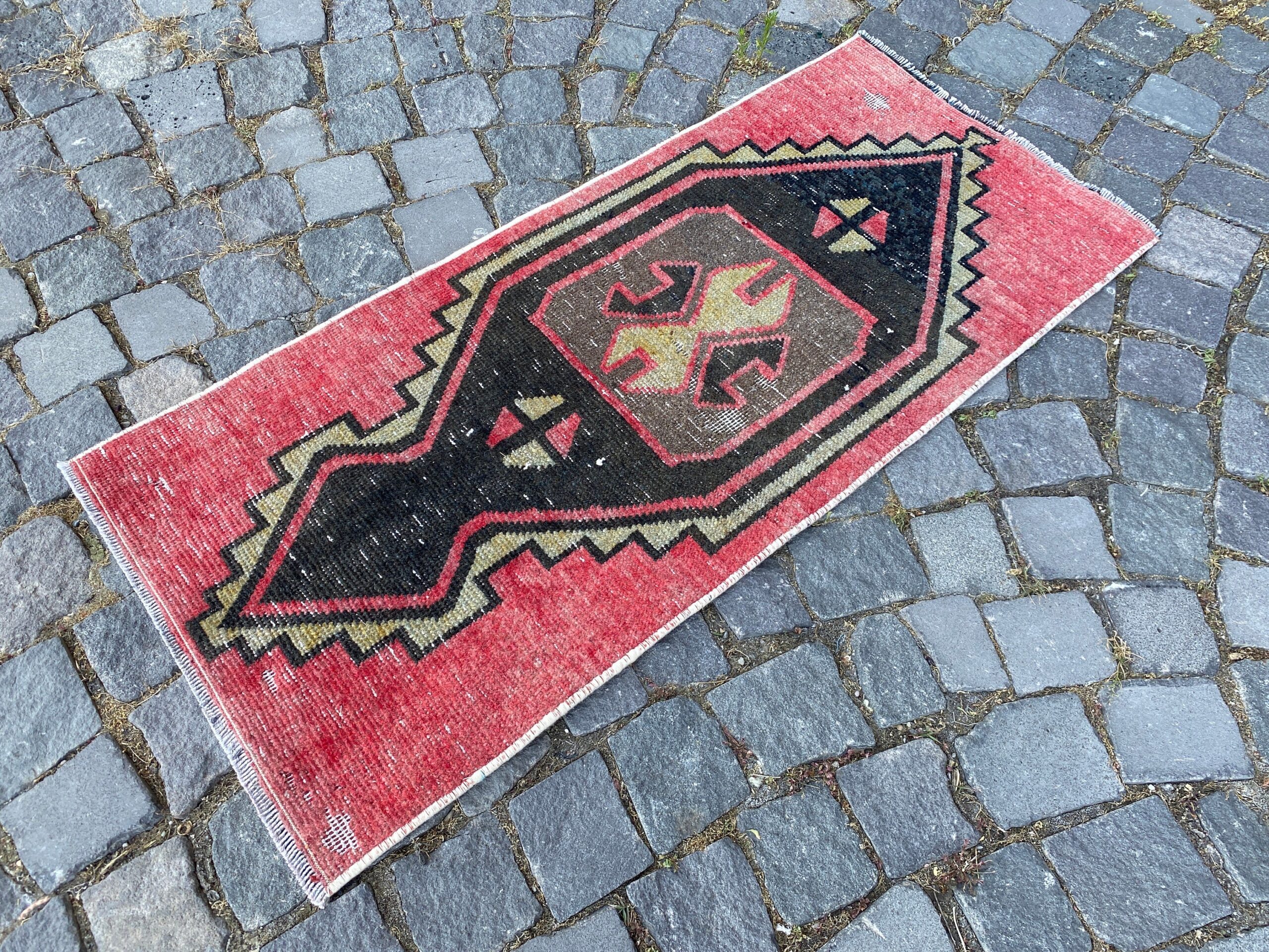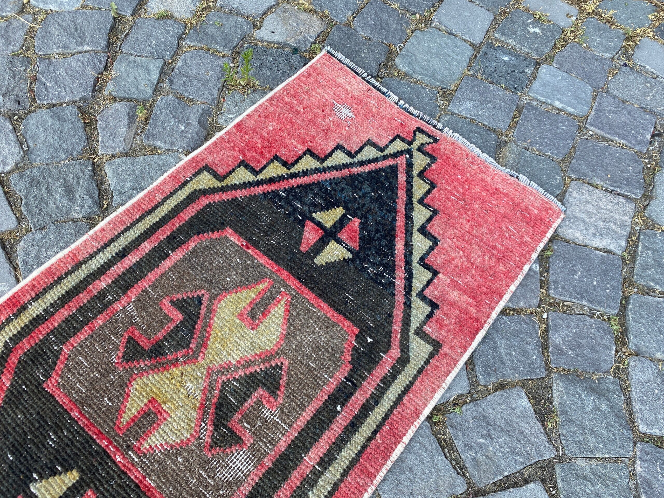Pretty and one-of-a-kind 1.7 ft. x 3.8 ft. (52 cm x 117 cm) vintage Turkish rug hand-knotted in Turkey from organic wool. This is an authentic vintage Turkish rug from the 1980s that has worn splendidly to perfection.