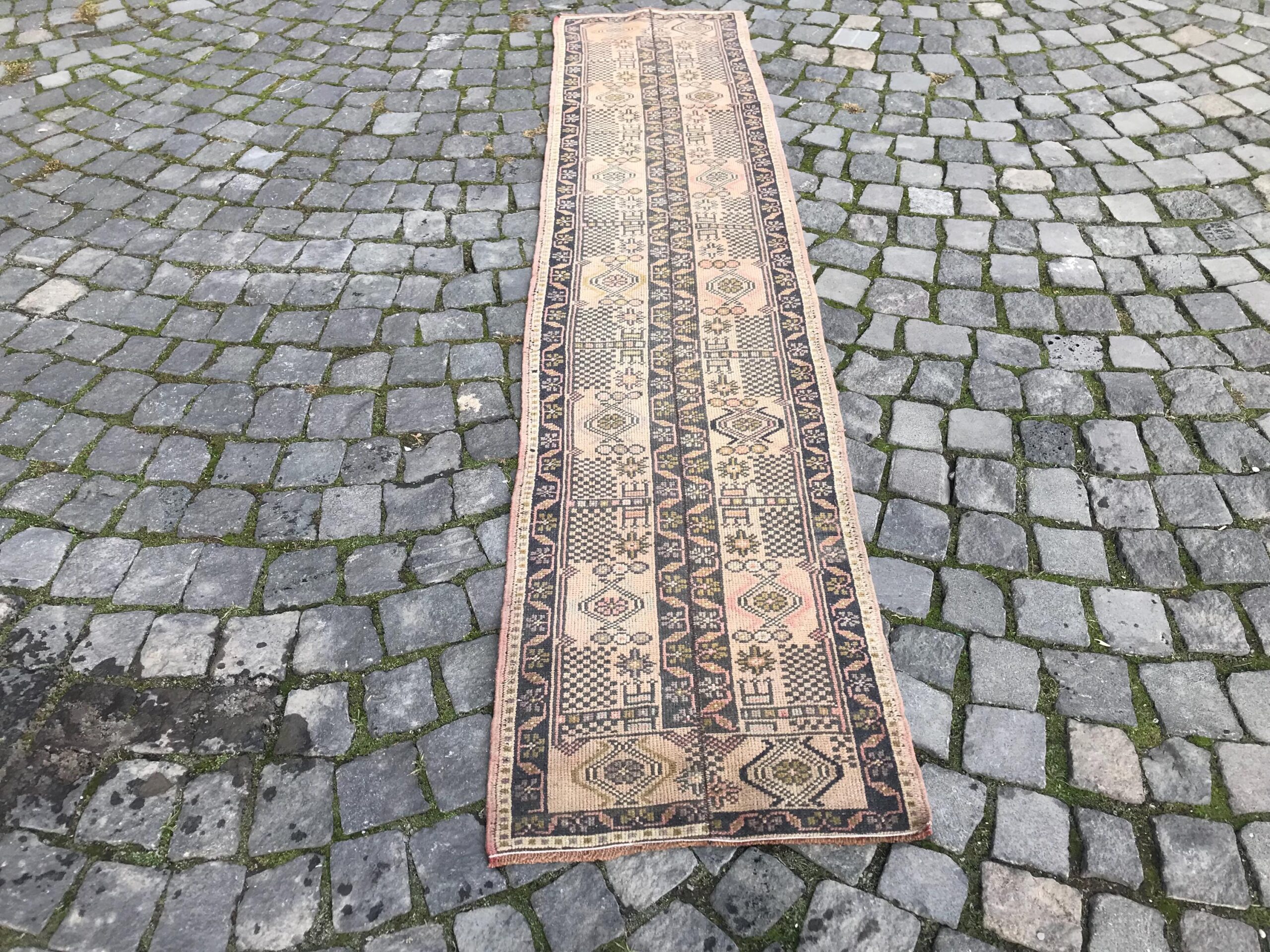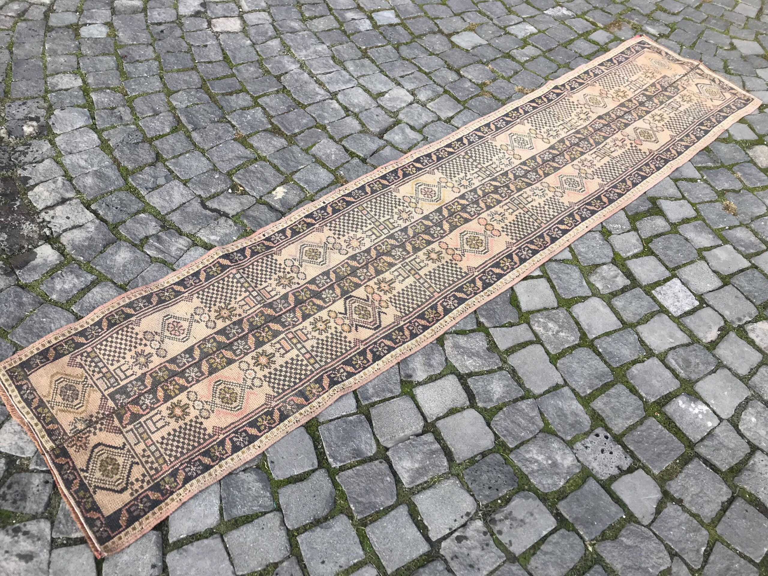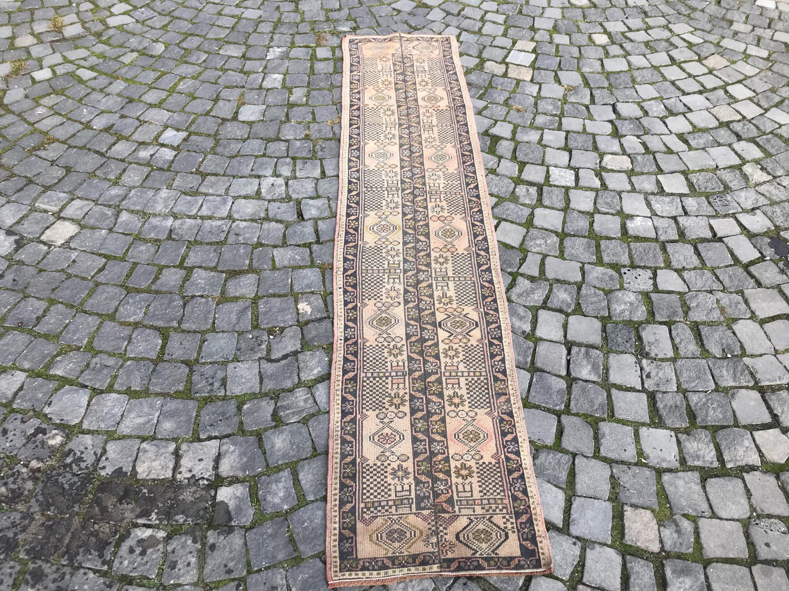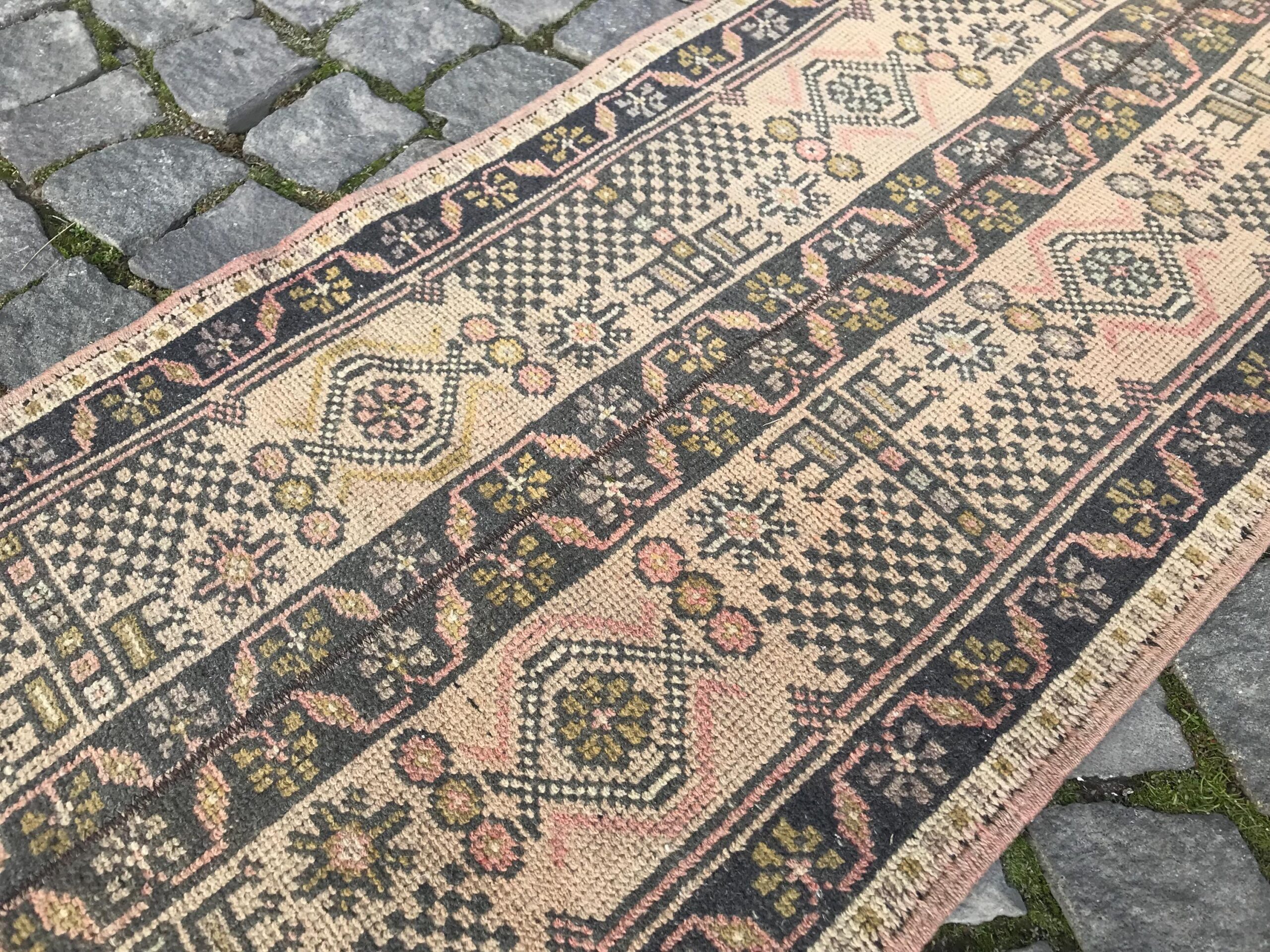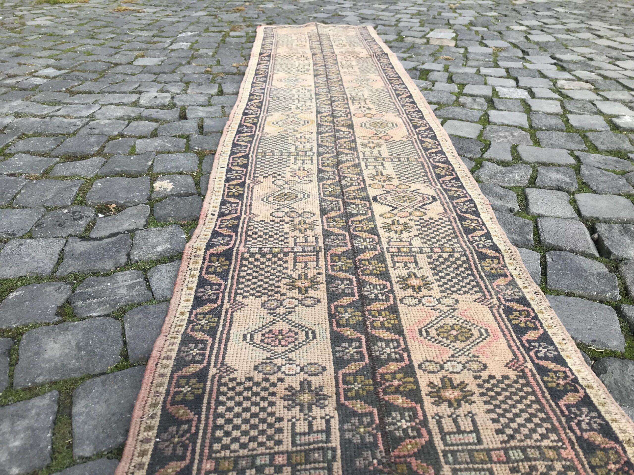 Lovely 1.8 ft. x 8.2 ft. (56 cm x 250 cm) patchwork rug made from different pieces of hand-knotted vintage Turkish rugs to end-up with a beautiful one-of-a-kind piece of art.