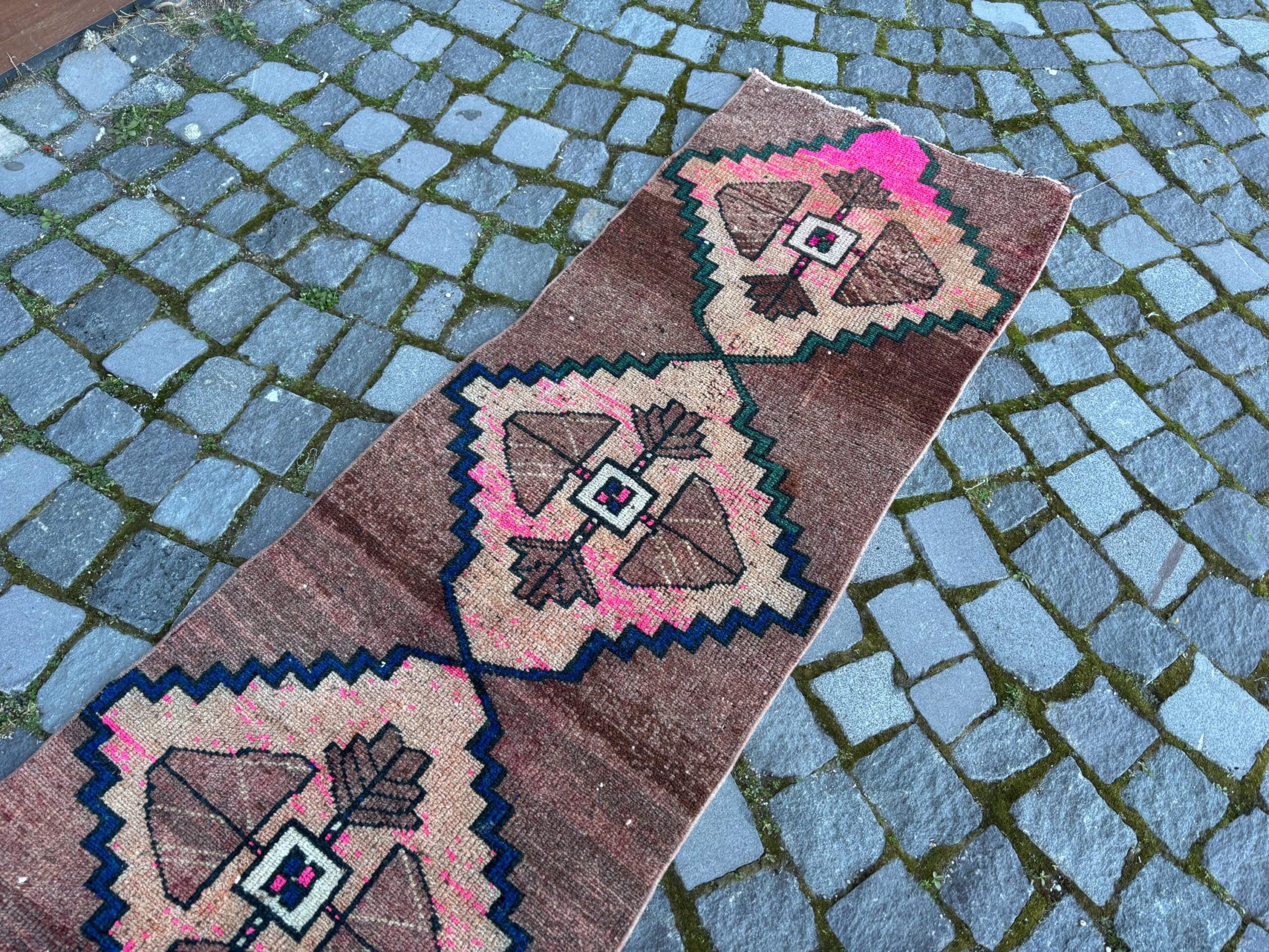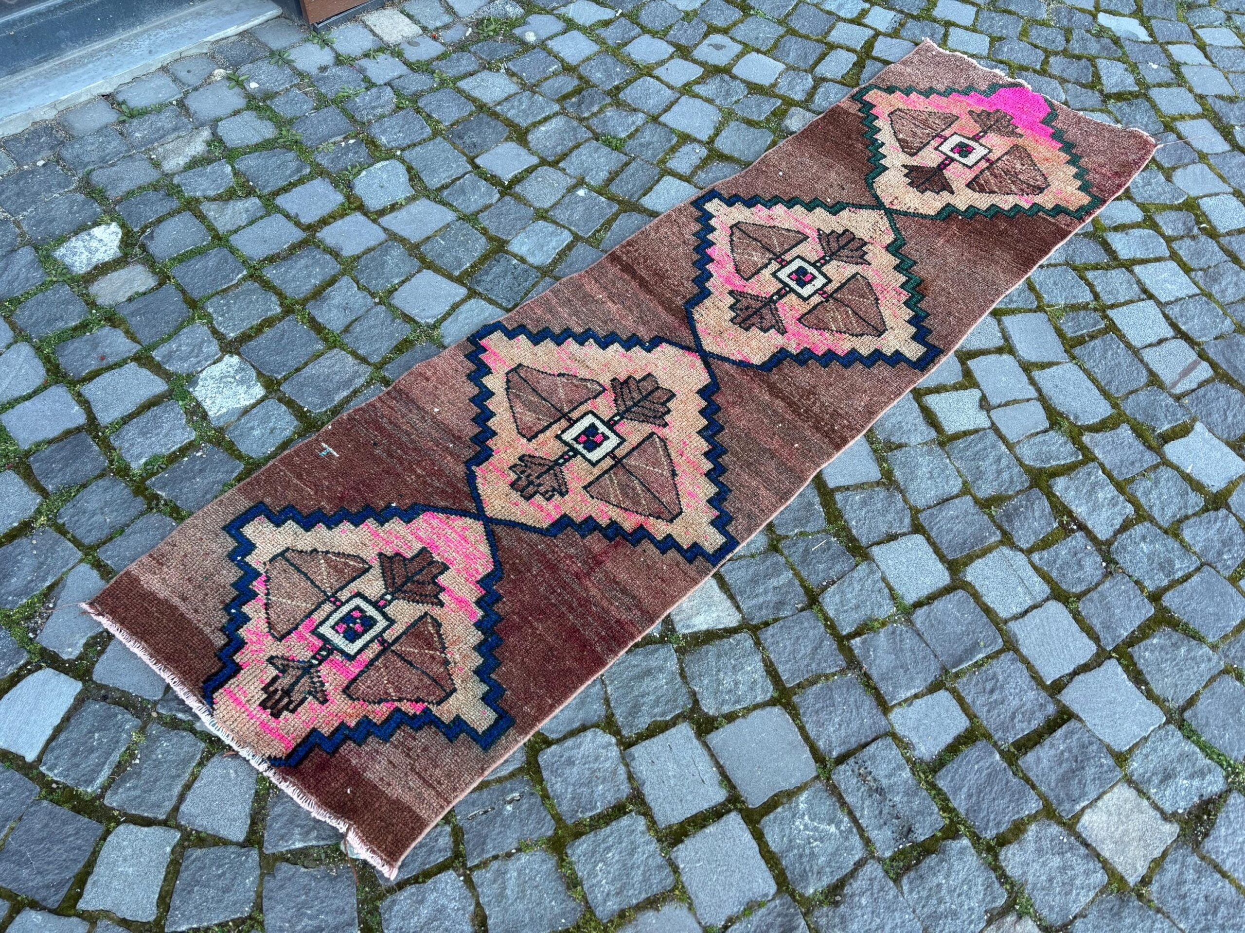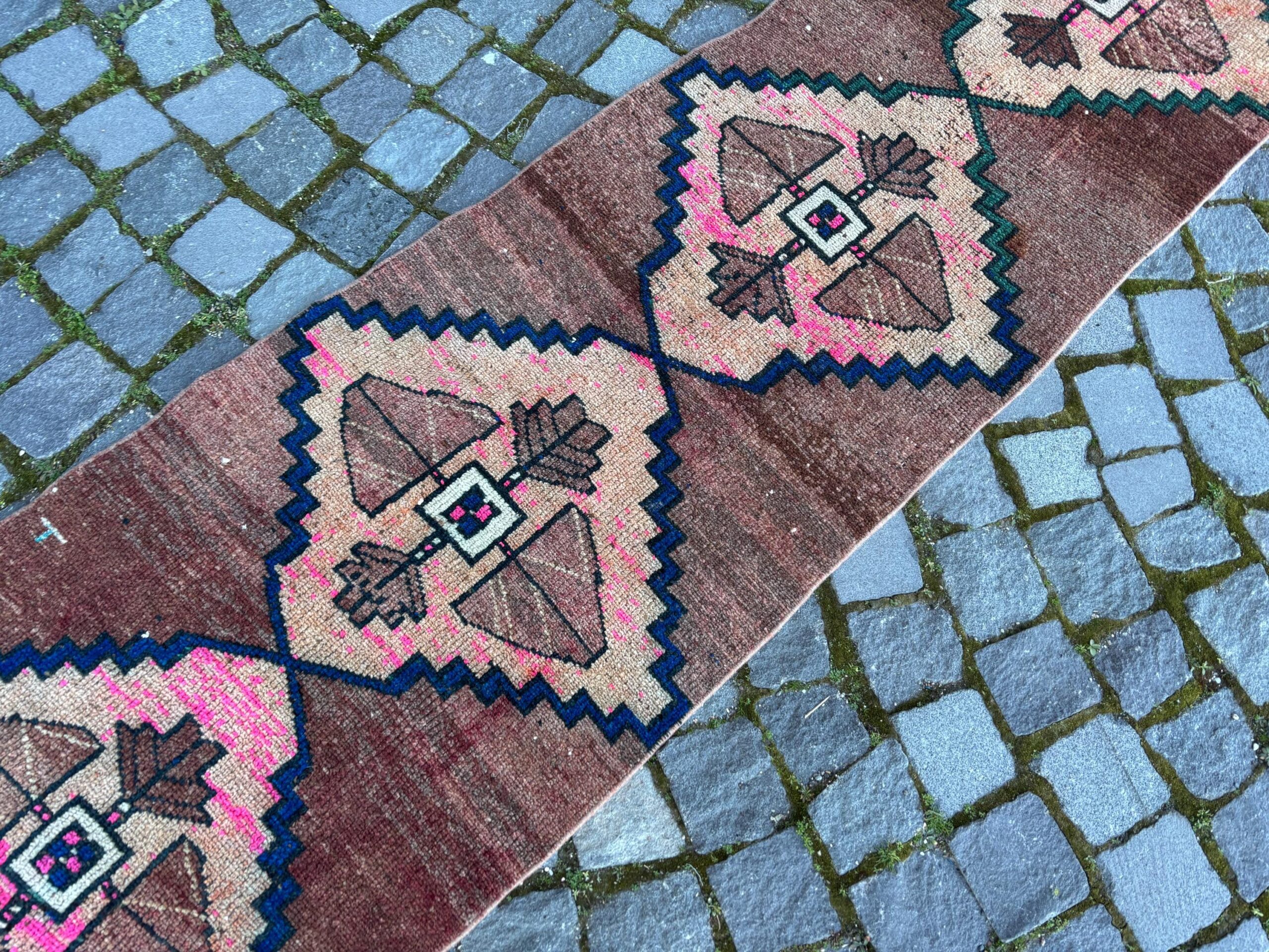 Pretty and one-of-a-kind 1.9 ft. x 6.6 ft. (59 cm x 201 cm) vintage Turkish rug hand-knotted in Turkey from organic wool. This is an authentic vintage Turkish rug from the 1980s that has worn splendidly to perfection.