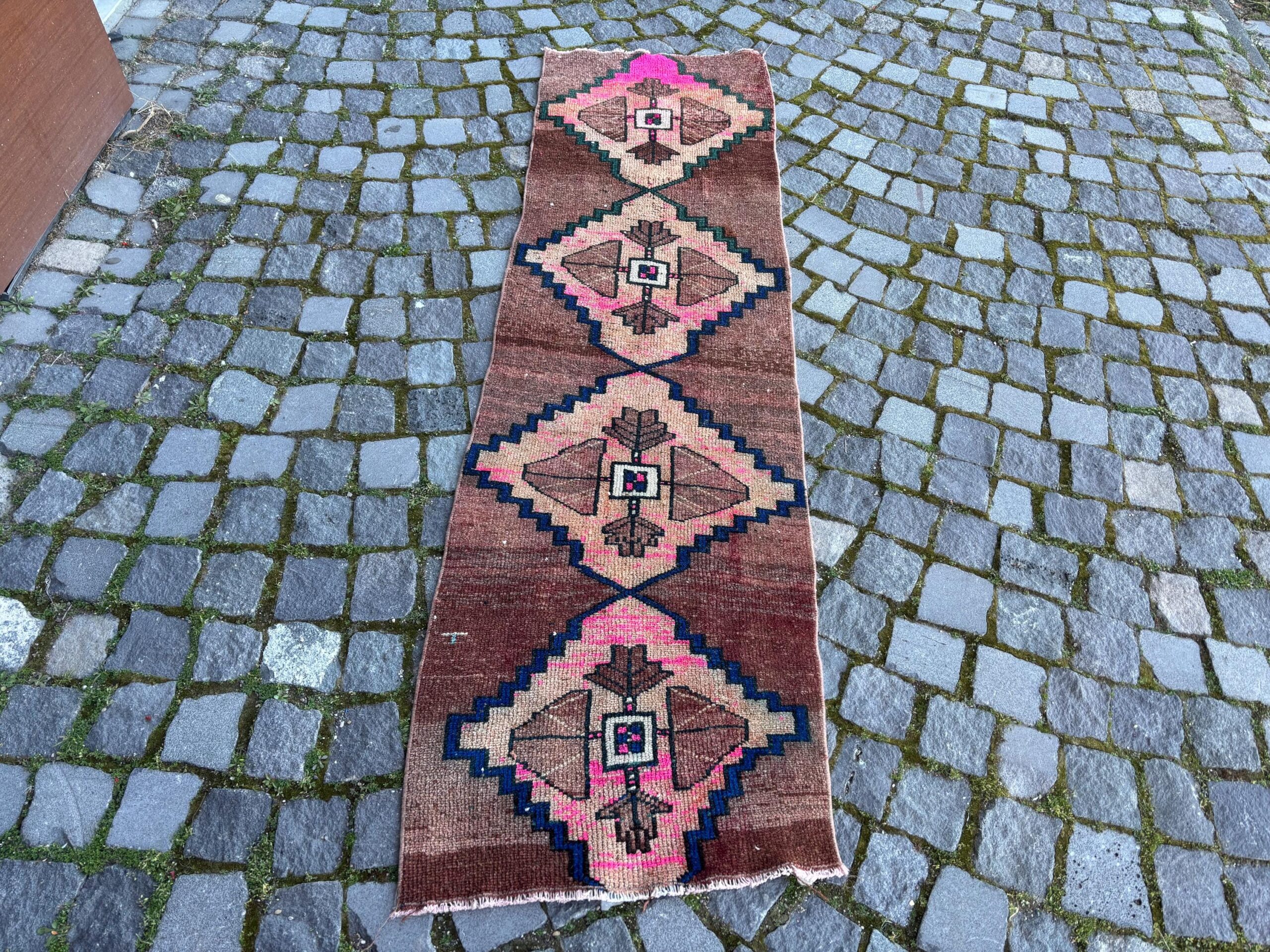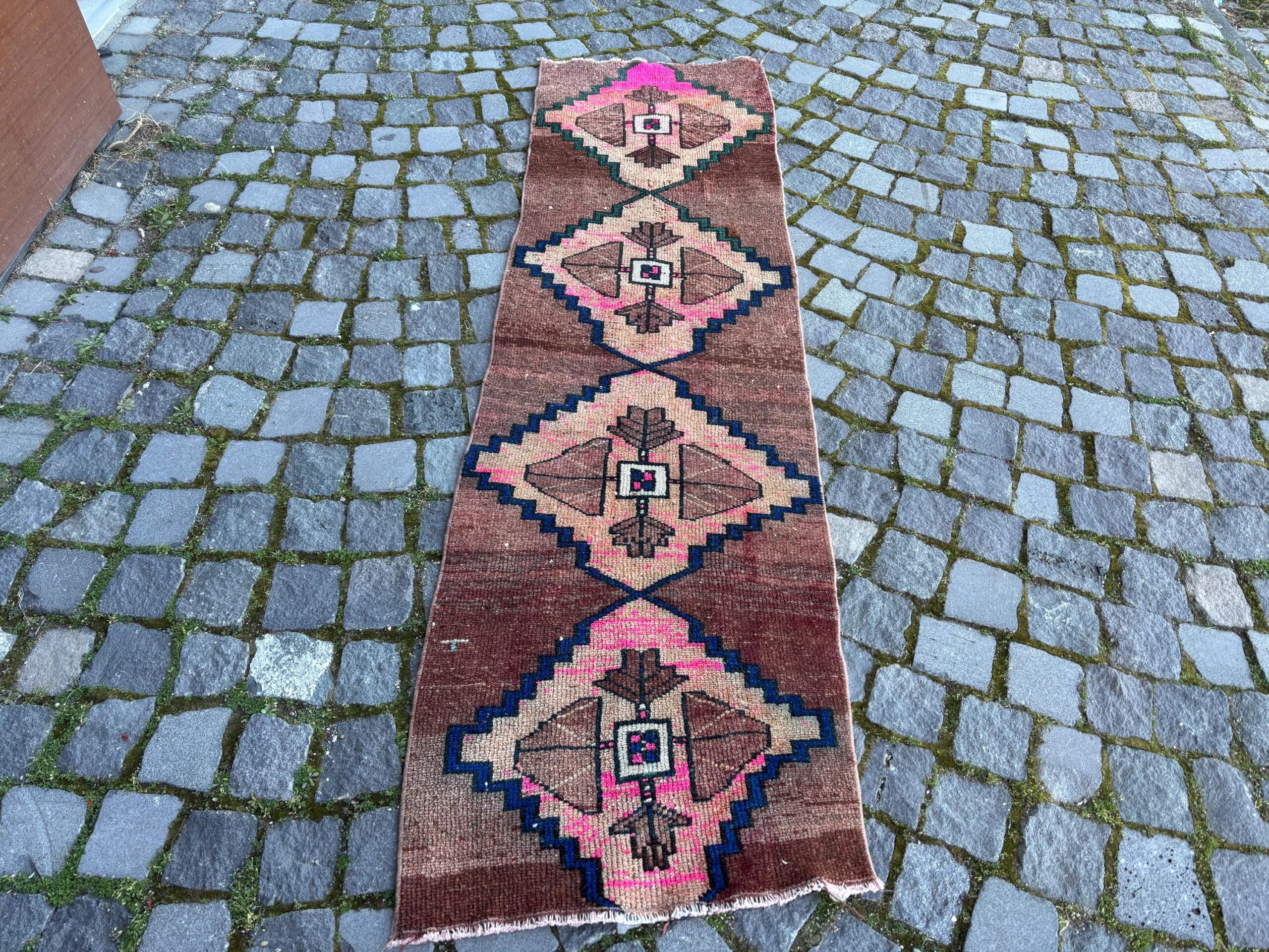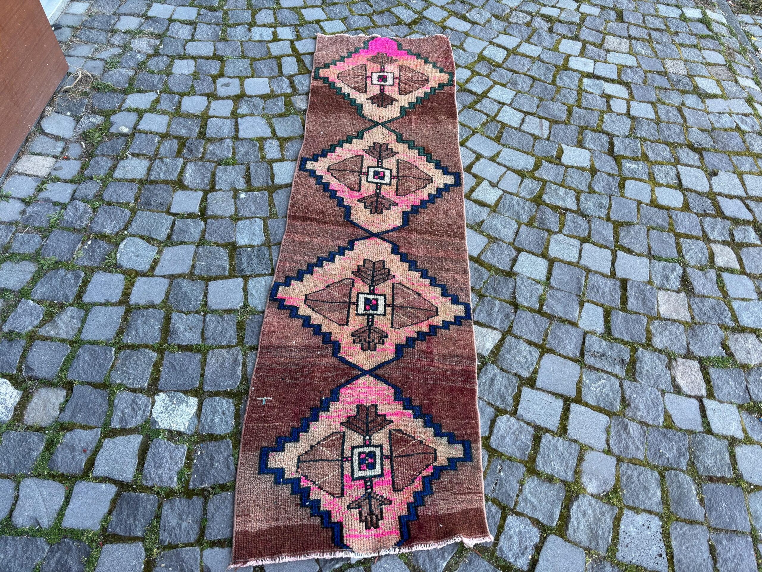 Pretty and one-of-a-kind 1.9 ft. x 6.6 ft. (59 cm x 201 cm) vintage Turkish rug hand-knotted in Turkey from organic wool. This is an authentic vintage Turkish rug from the 1980s that has worn splendidly to perfection.