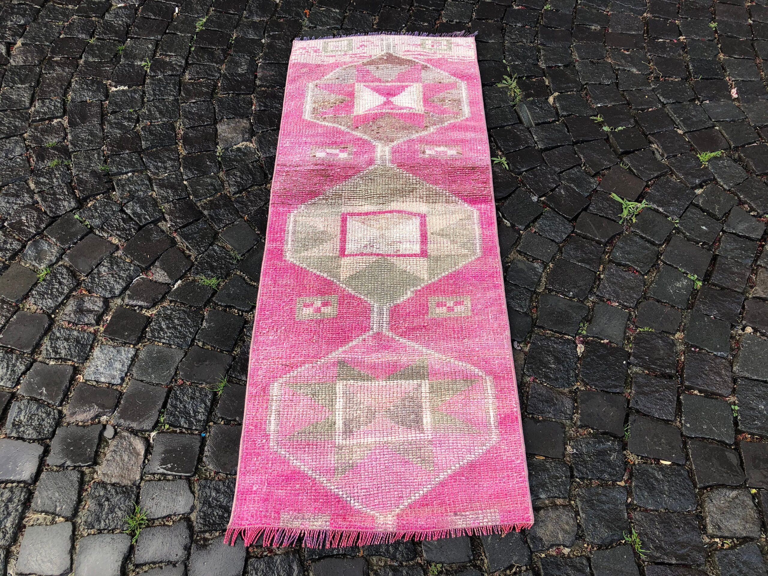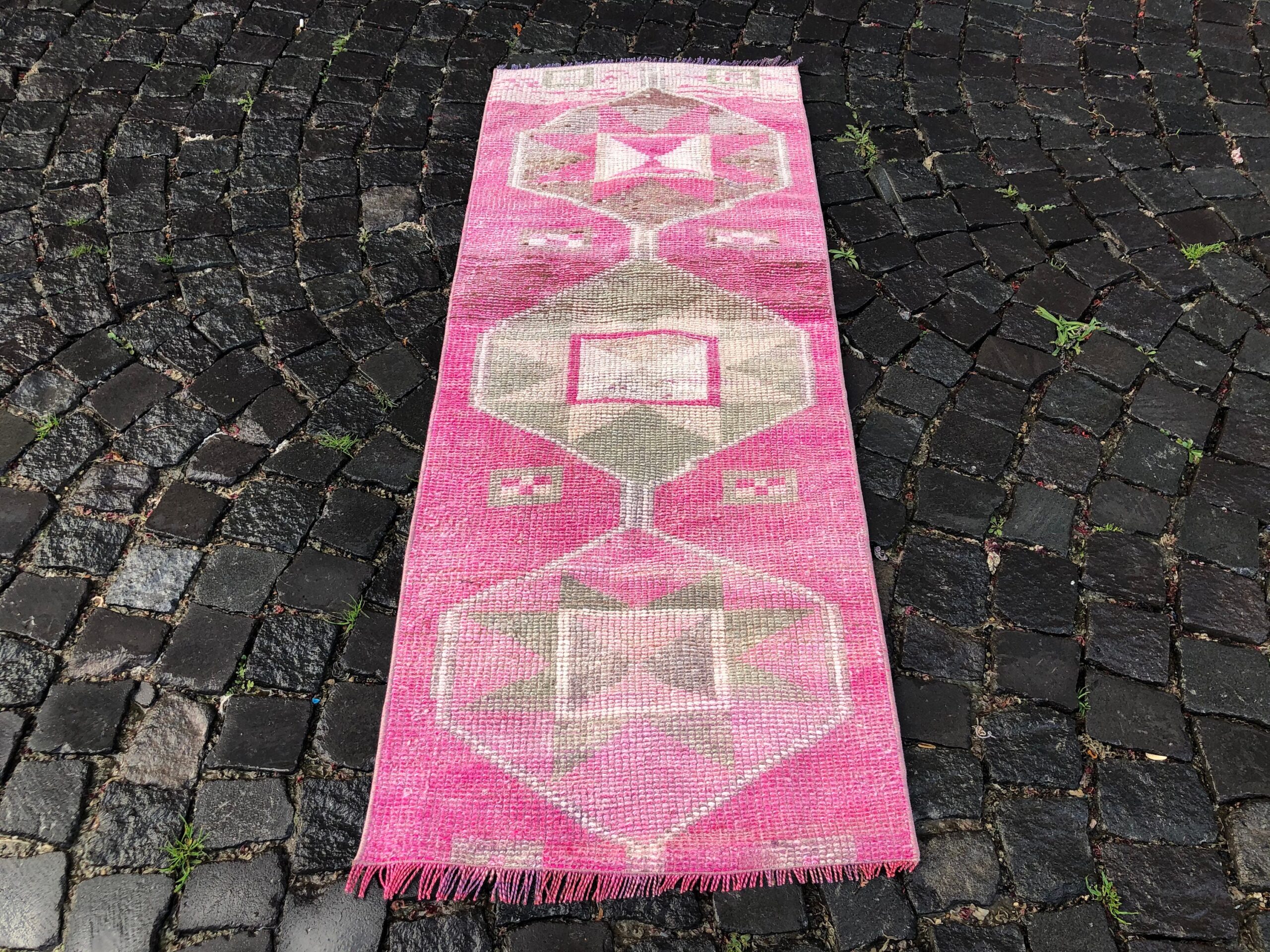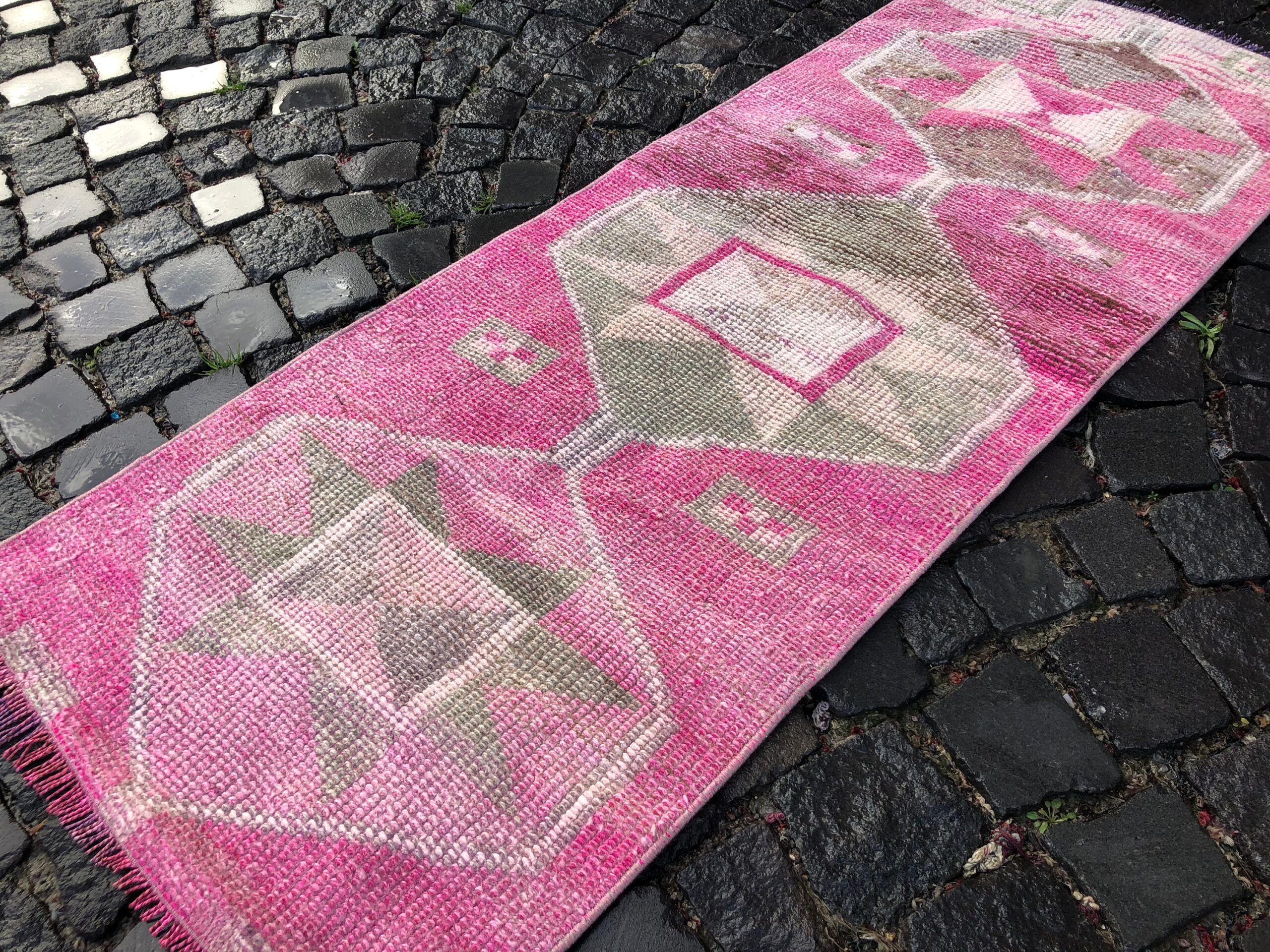 Lovely and unique 2.1 ft. x 5.3 ft. (64 cm x 161 cm) vintage Turkish rug hand-knotted in Turkey from organic wool. This is an authentic vintage Turkish rug from the 1980s that has worn beautifully to perfection.