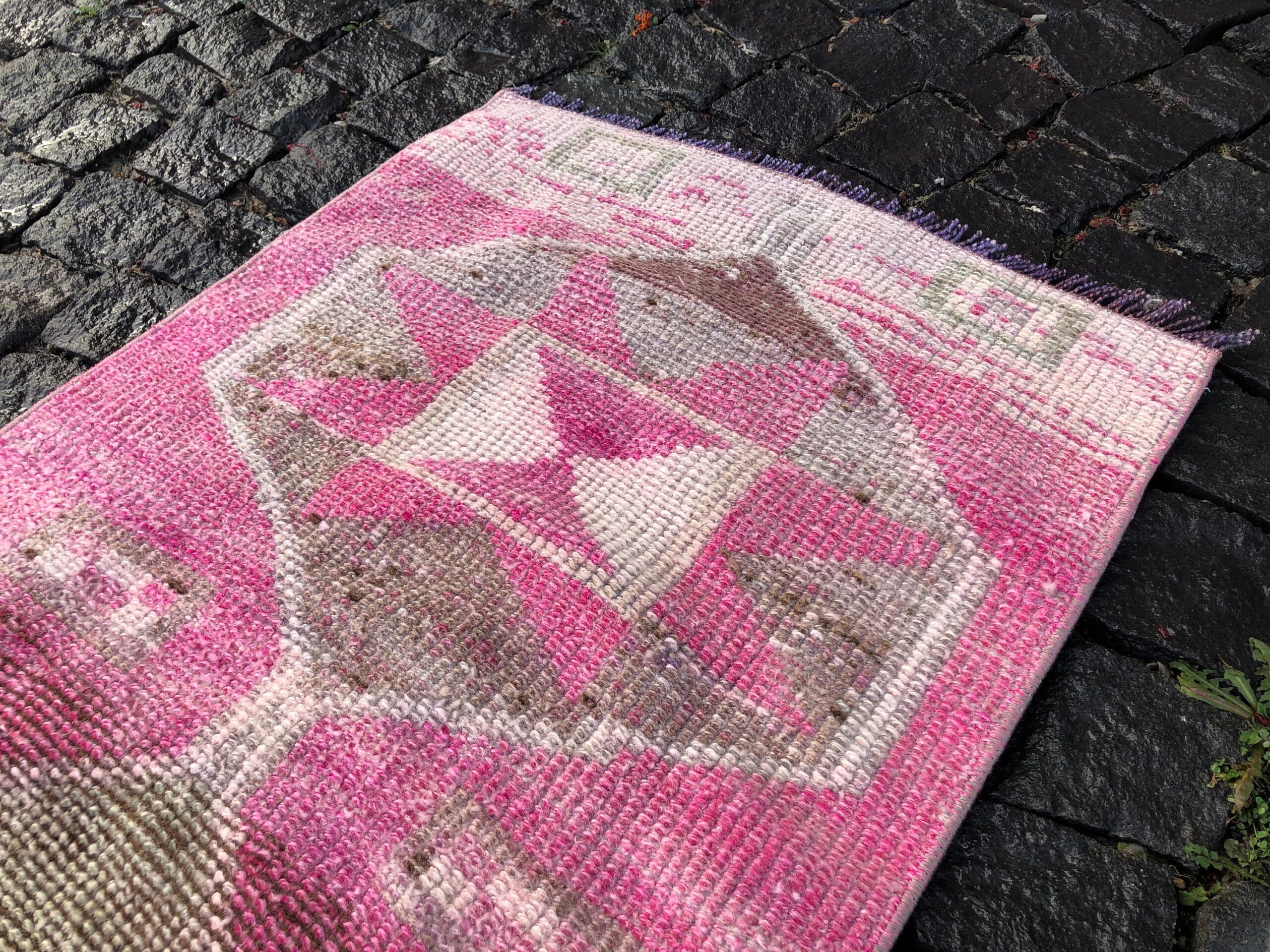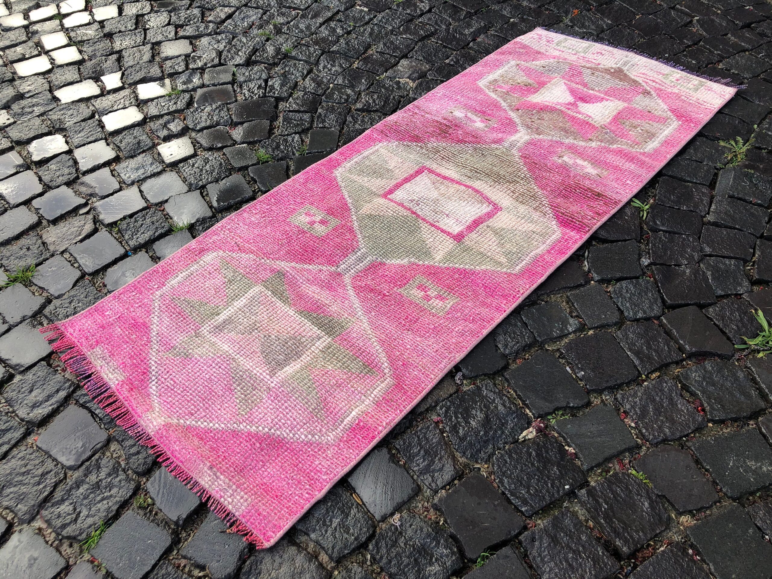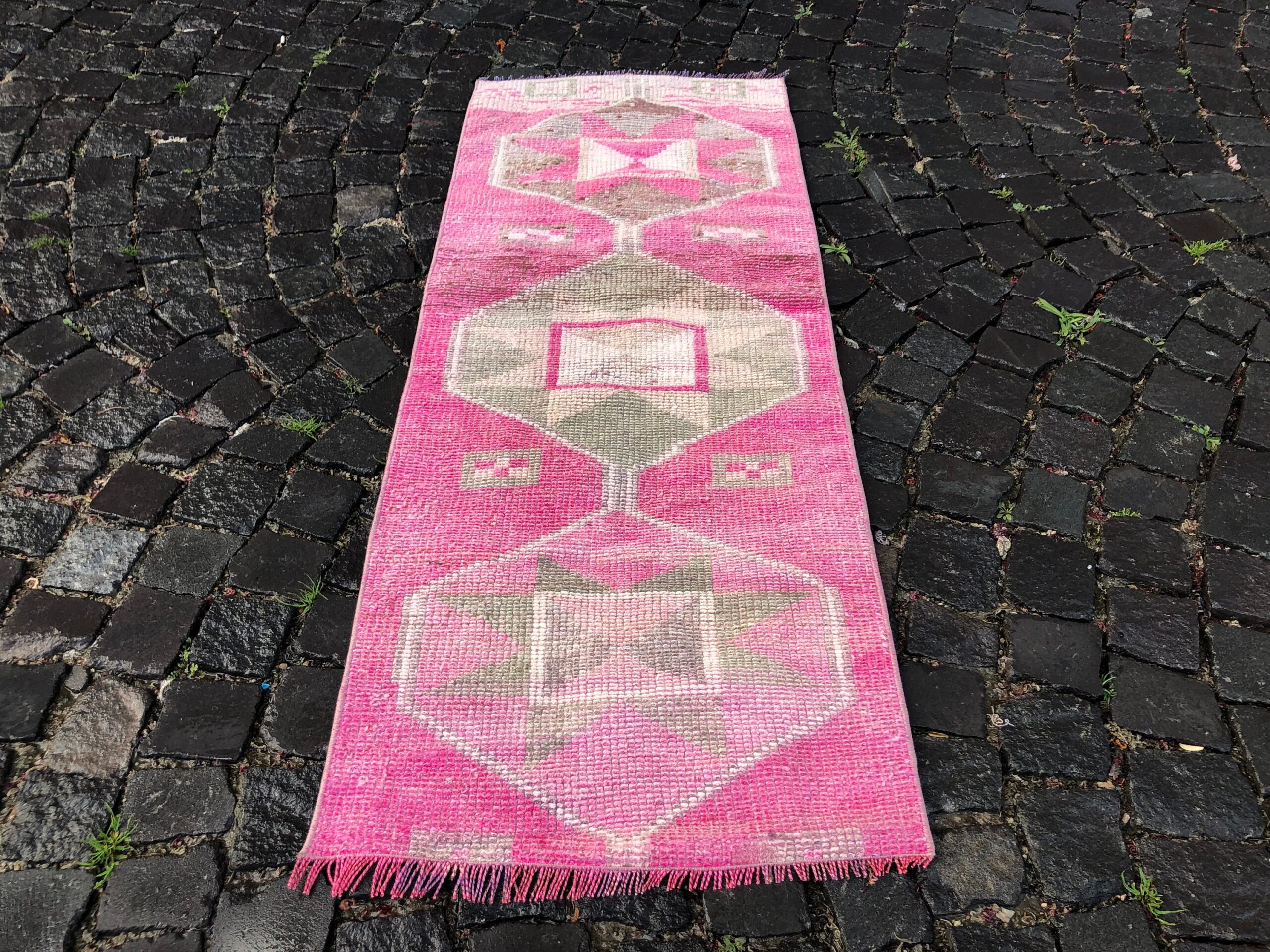 Lovely and unique 2.1 ft. x 5.3 ft. (64 cm x 161 cm) vintage Turkish rug hand-knotted in Turkey from organic wool. This is an authentic vintage Turkish rug from the 1980s that has worn beautifully to perfection.