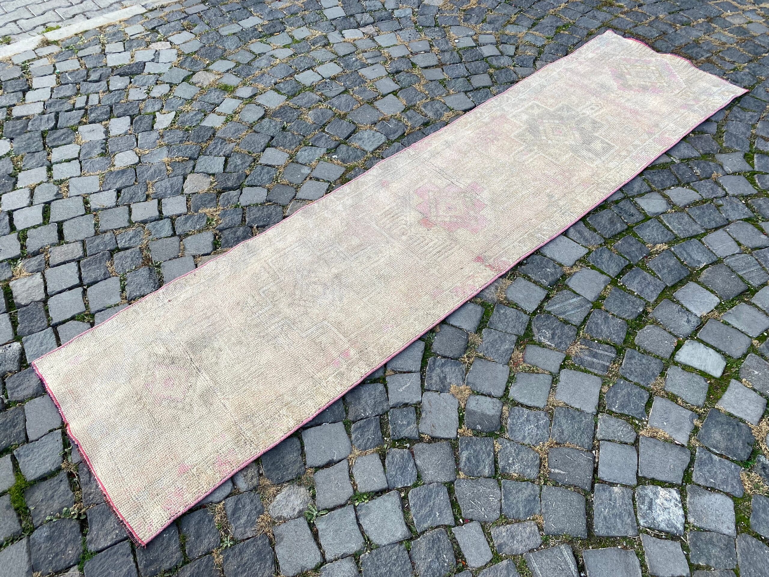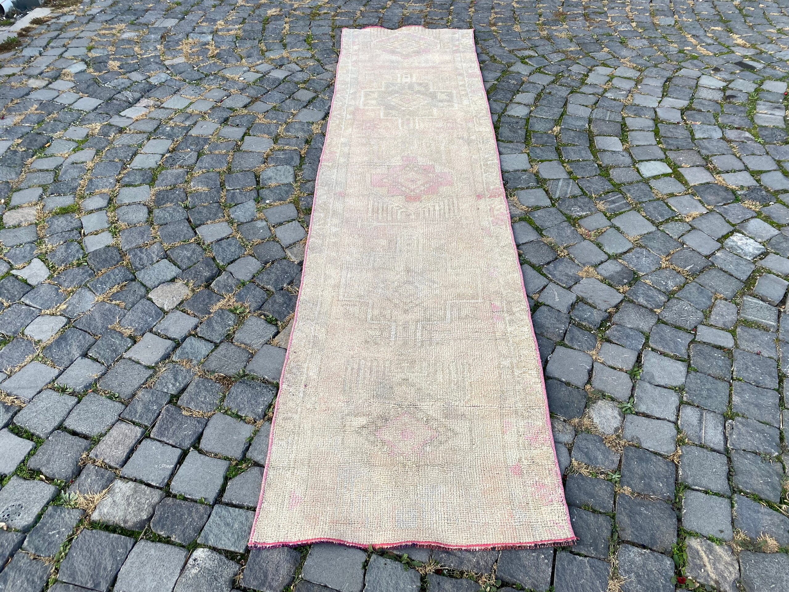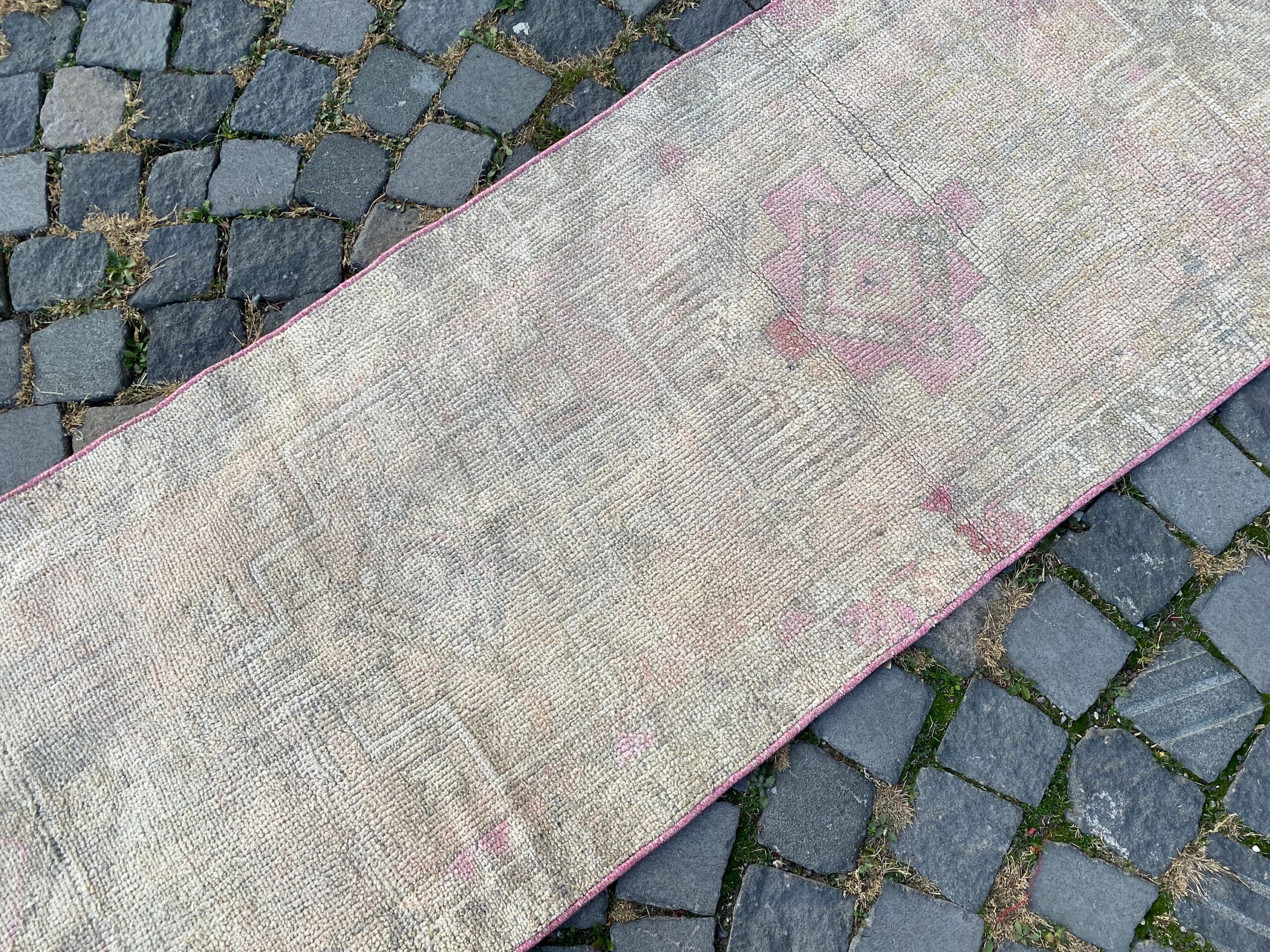 Beautiful and one-of-a-kind 2.1 ft. x 8.8 ft. (65 cm x 268 cm) vintage Turkish rug hand-knotted in Turkey from organic wool. This is an authentic vintage Turkish rug from the 1970s that has worn admirably to perfection.