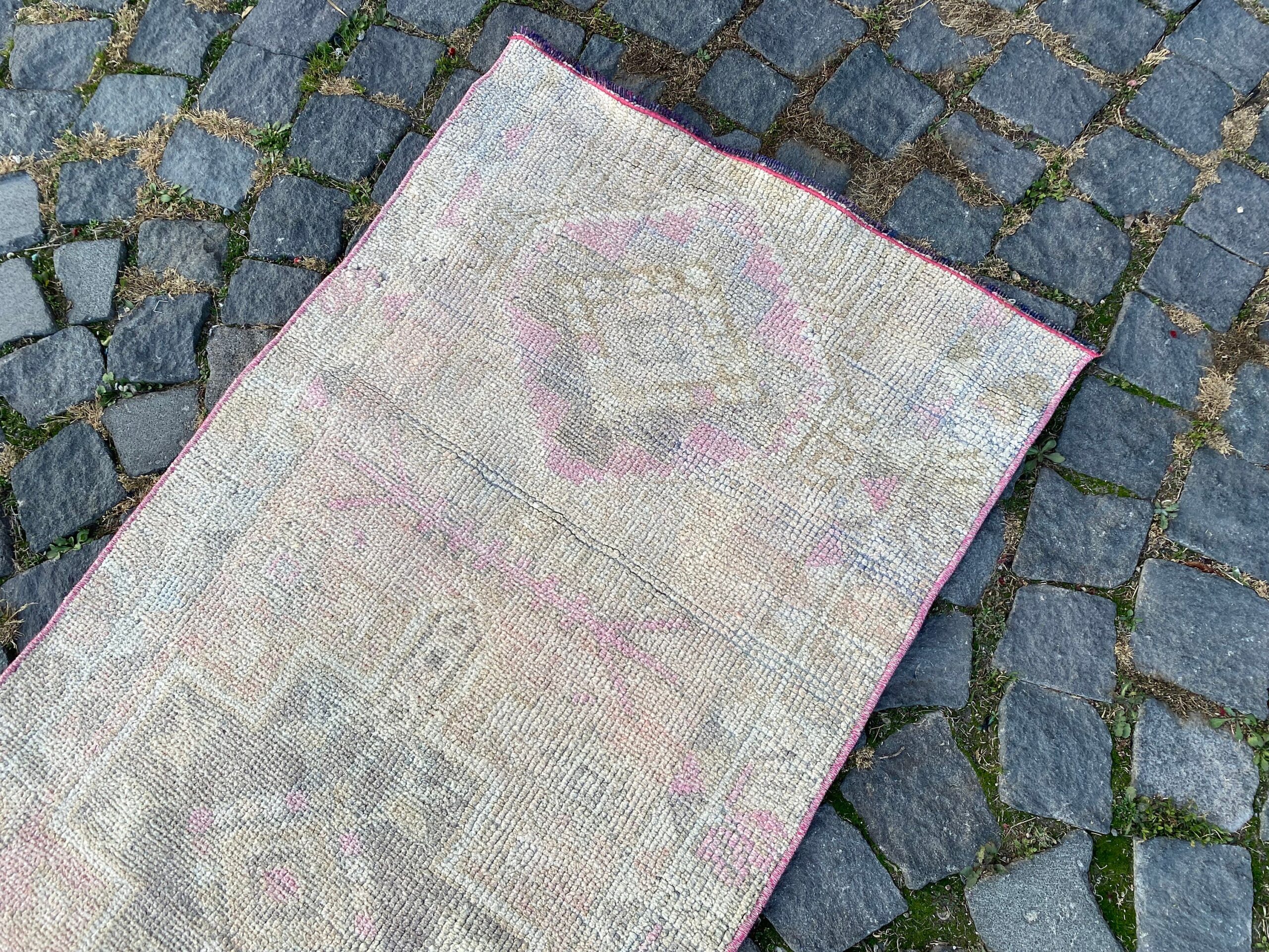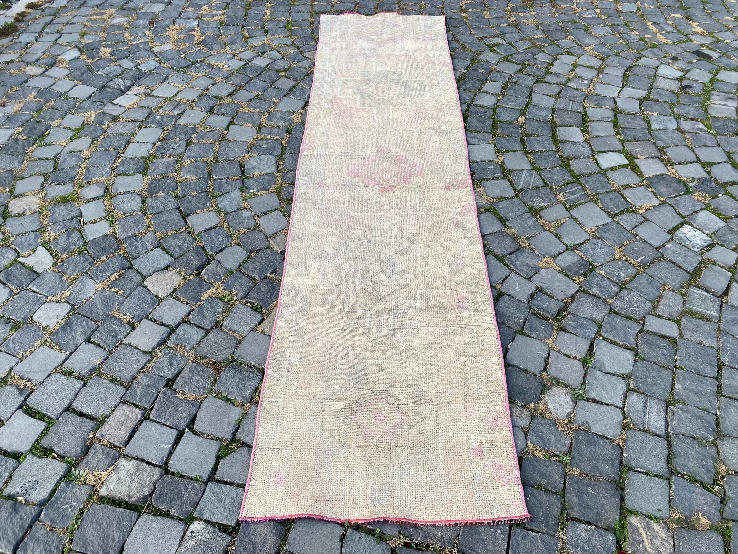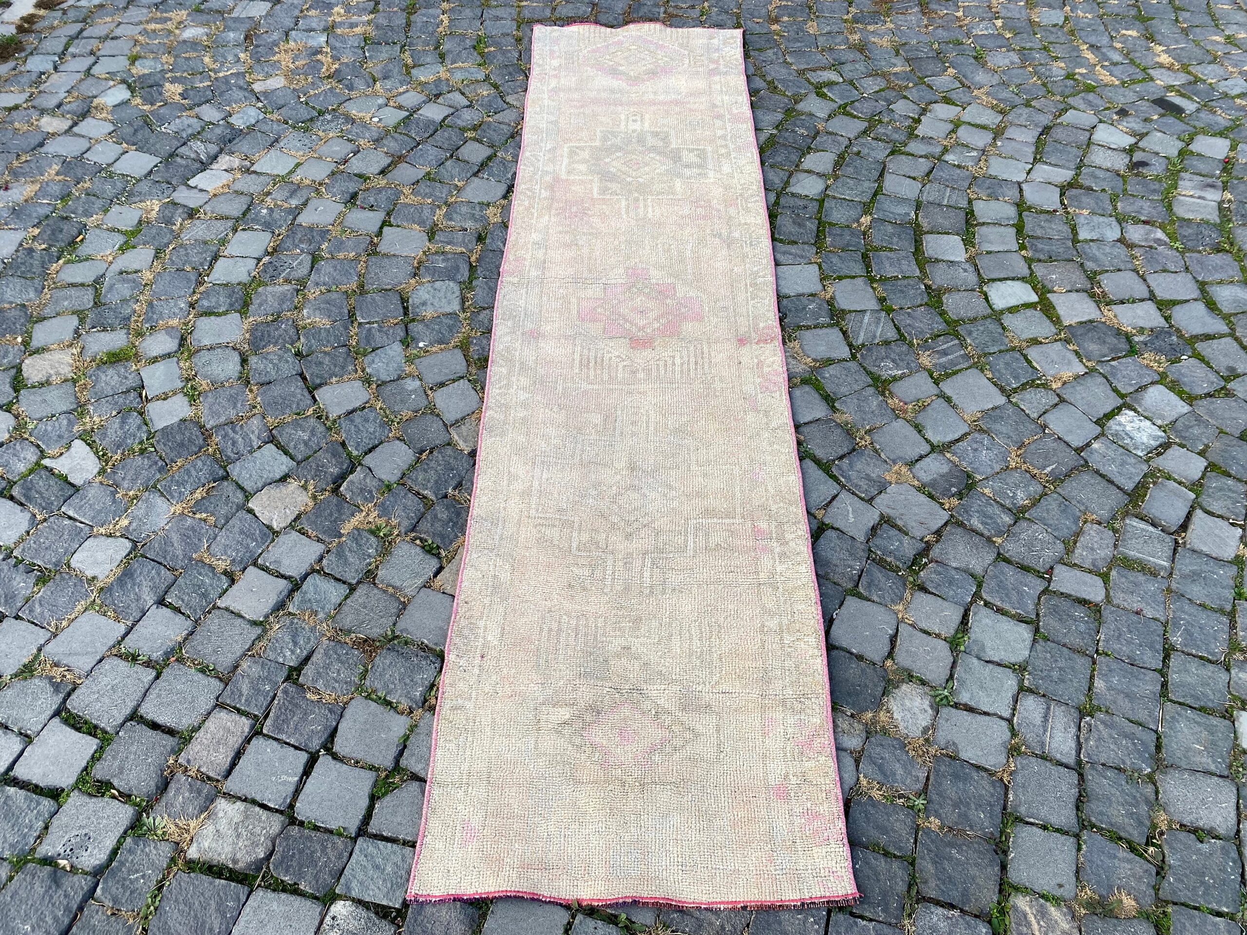 Beautiful and one-of-a-kind 2.1 ft. x 8.8 ft. (65 cm x 268 cm) vintage Turkish rug hand-knotted in Turkey from organic wool. This is an authentic vintage Turkish rug from the 1970s that has worn admirably to perfection.