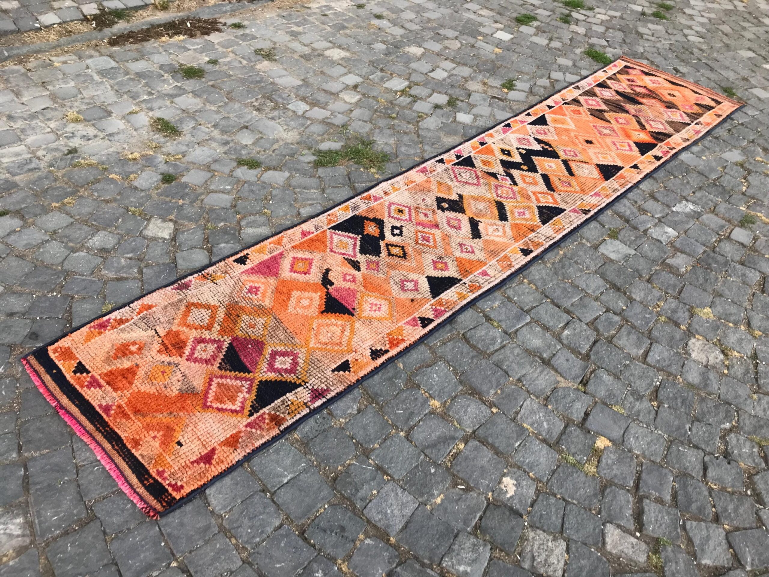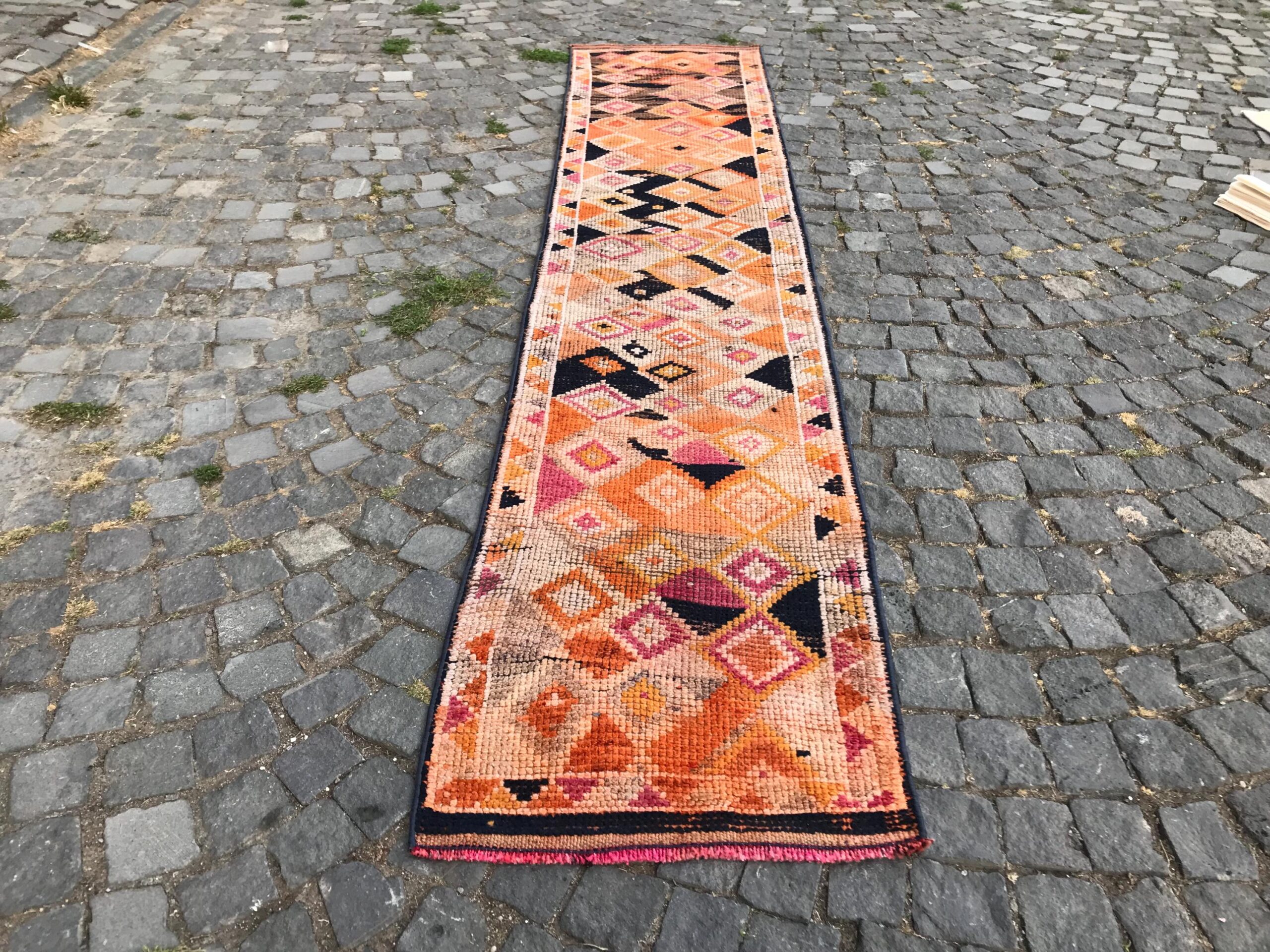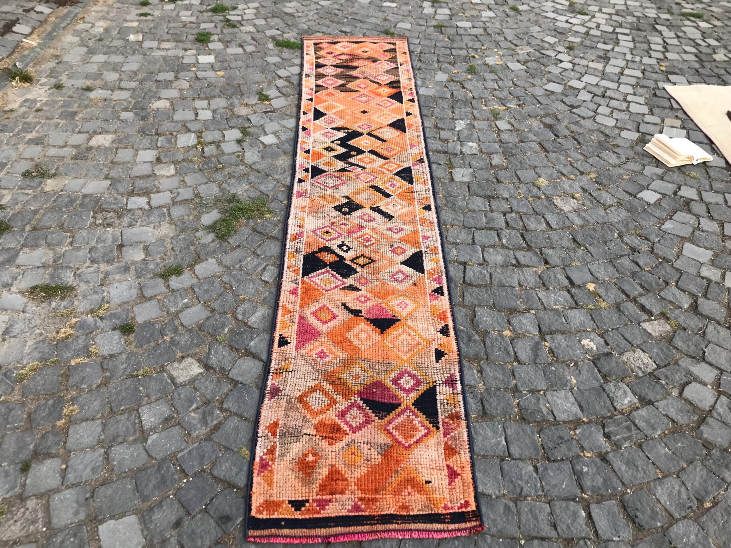 Lovely and unique 2.2 ft. x 11 ft. (68 cm x 336 cm) vintage Turkish rug hand-knotted in Turkey from organic wool. This is an authentic vintage Turkish rug from the 1980s that has worn beautifully to perfection.