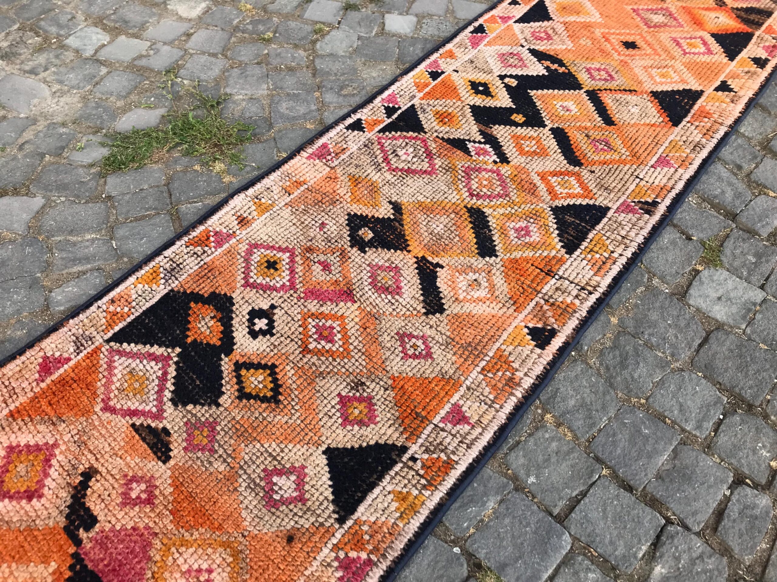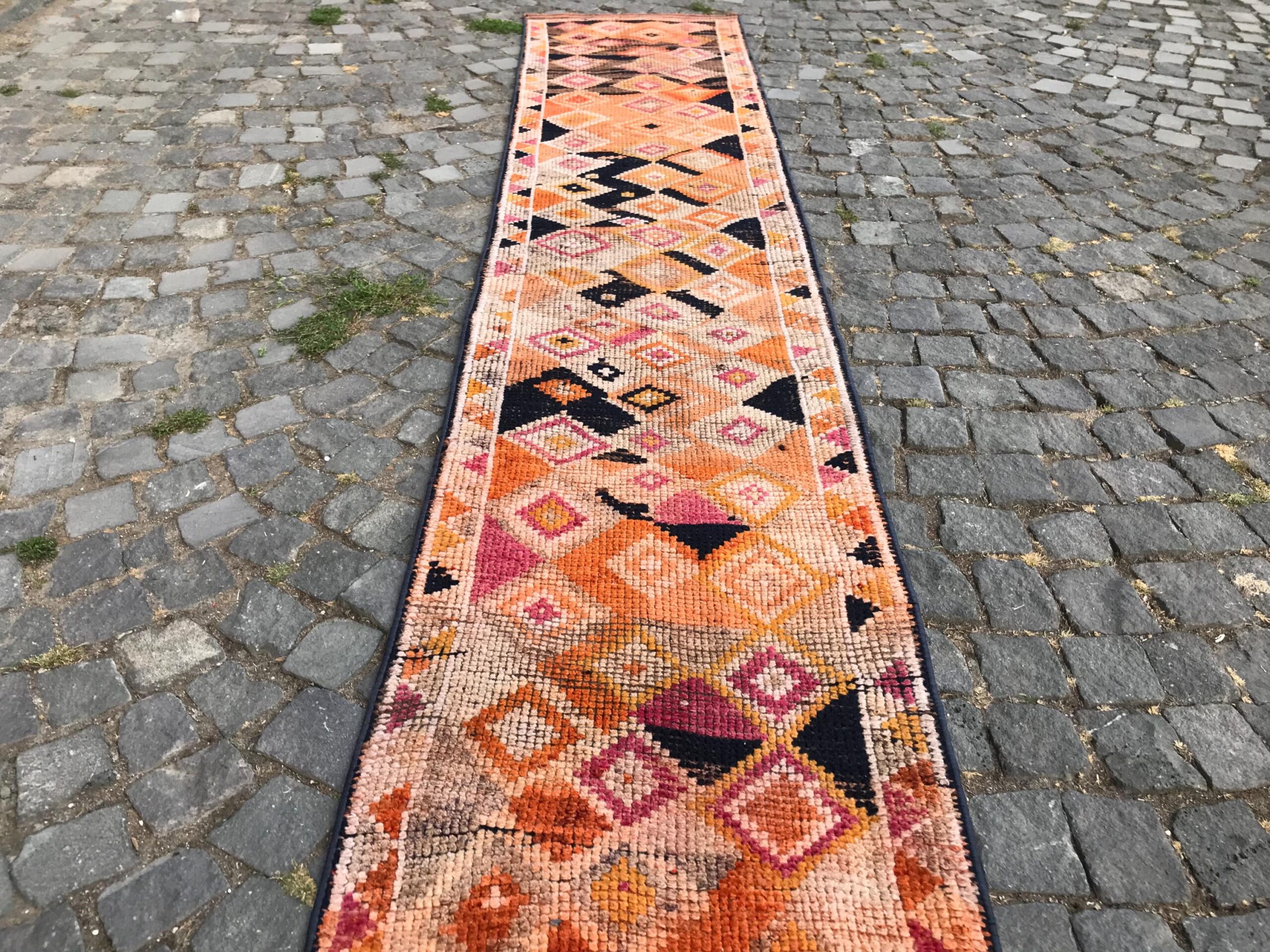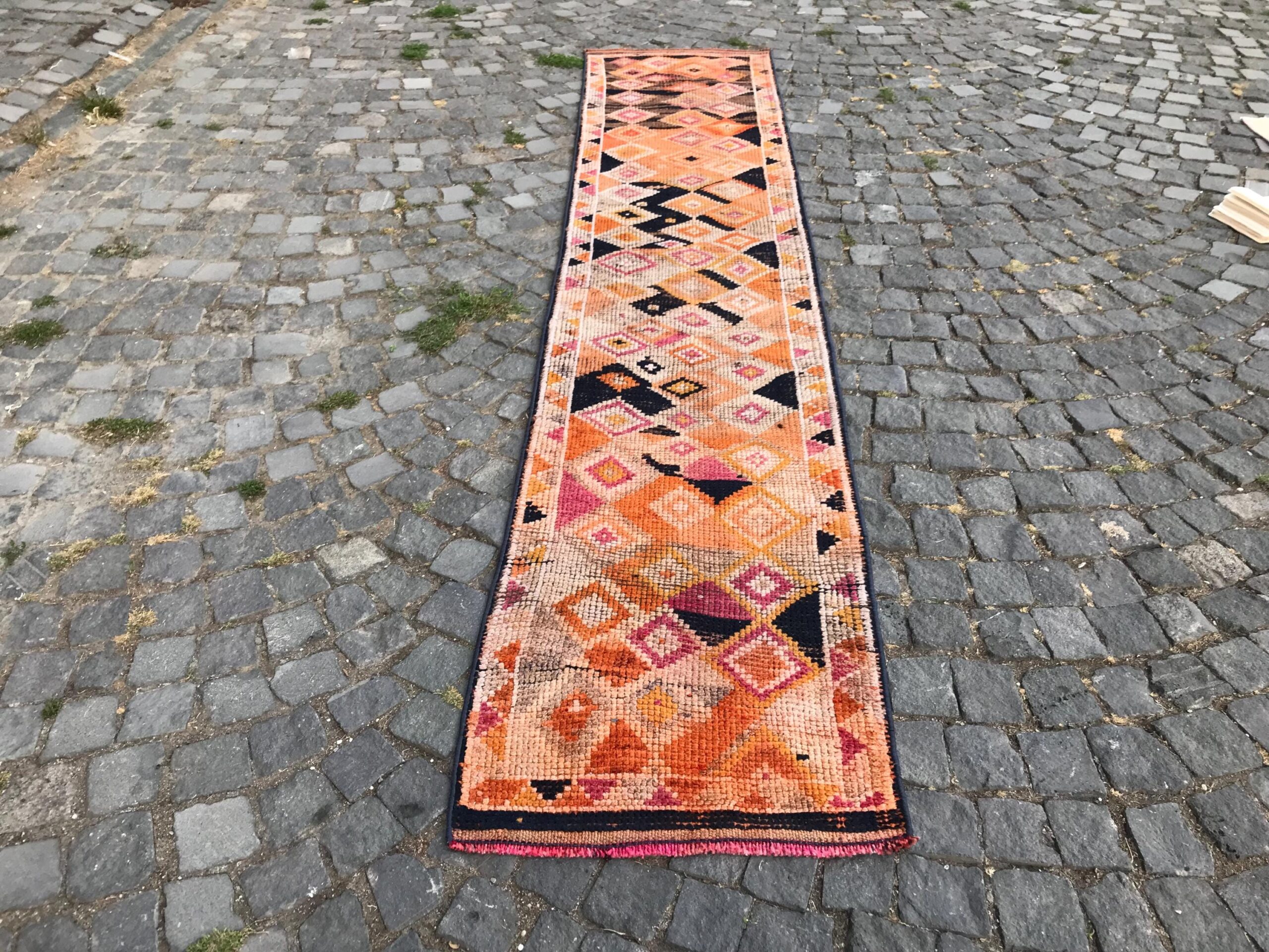 Lovely and unique 2.2 ft. x 11 ft. (68 cm x 336 cm) vintage Turkish rug hand-knotted in Turkey from organic wool. This is an authentic vintage Turkish rug from the 1980s that has worn beautifully to perfection.