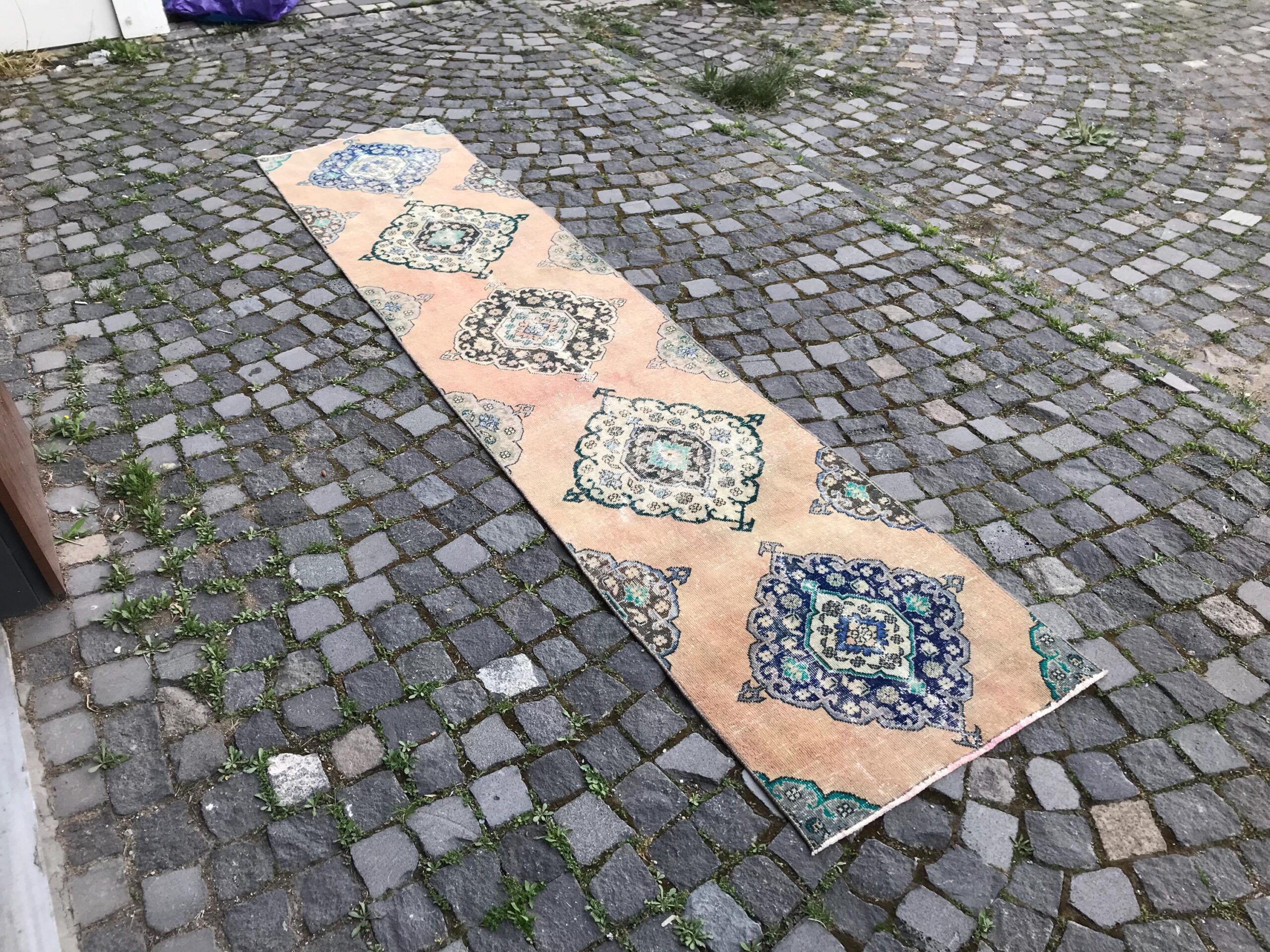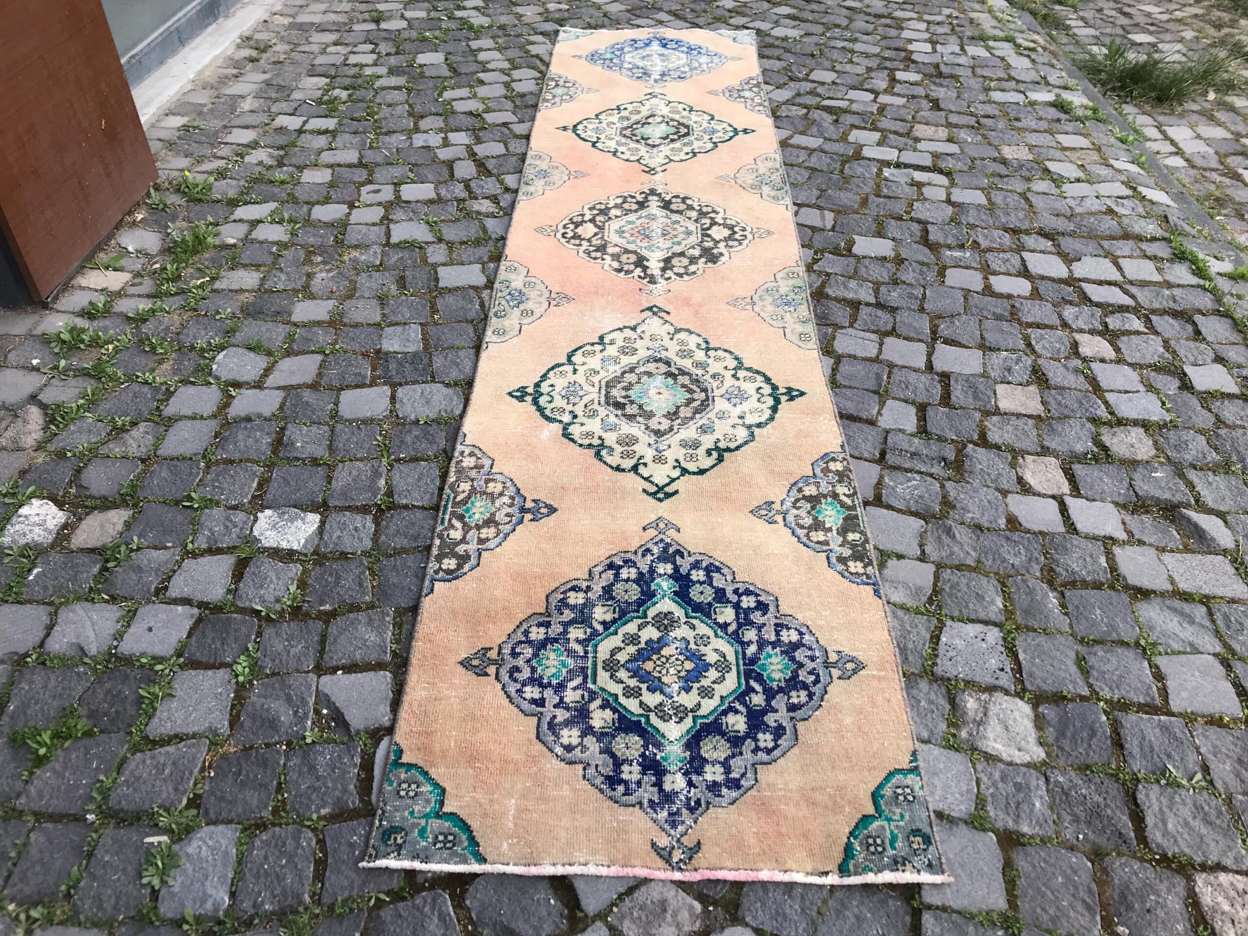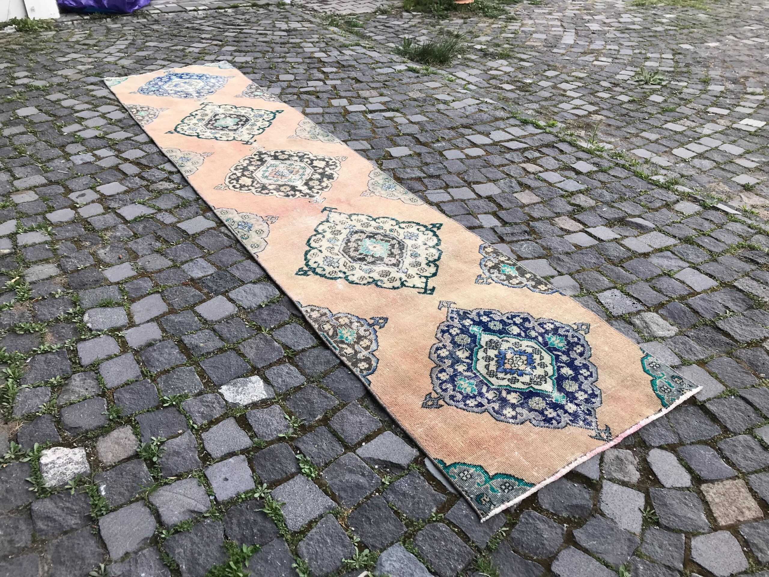 Pretty and one-of-a-kind 2.4 ft. x 11 ft. (74 cm x 336 cm) vintage Turkish rug hand-knotted in Turkey from organic wool. This is an authentic vintage Turkish rug from the 1980s that has worn splendidly to perfection.