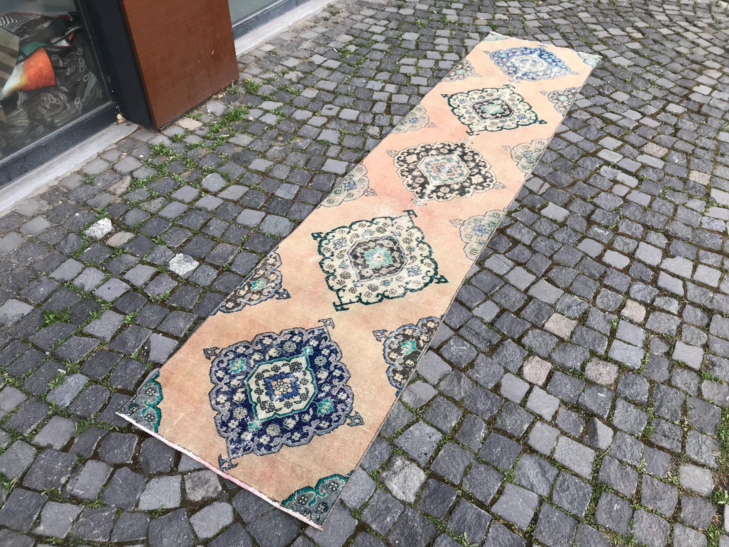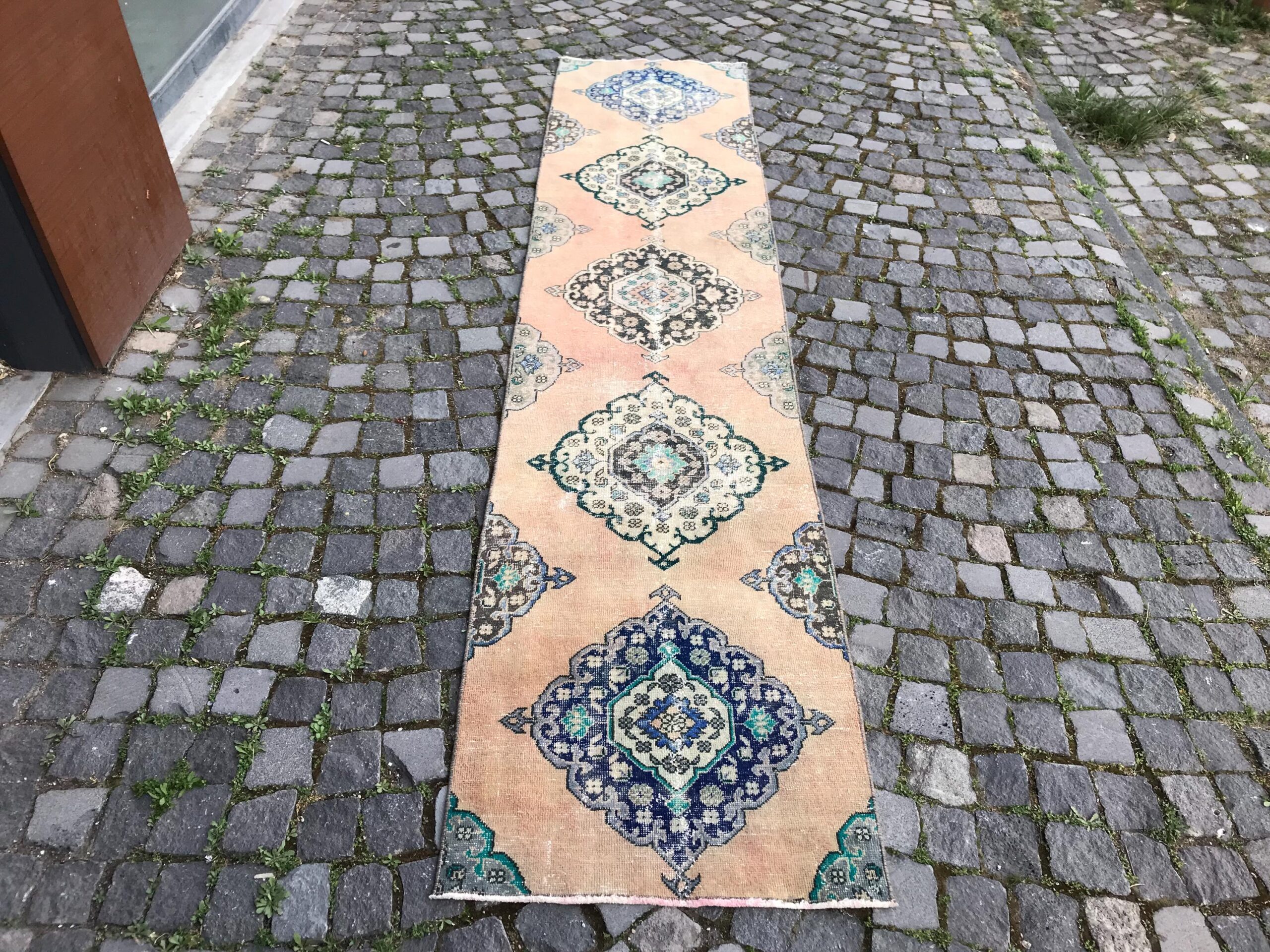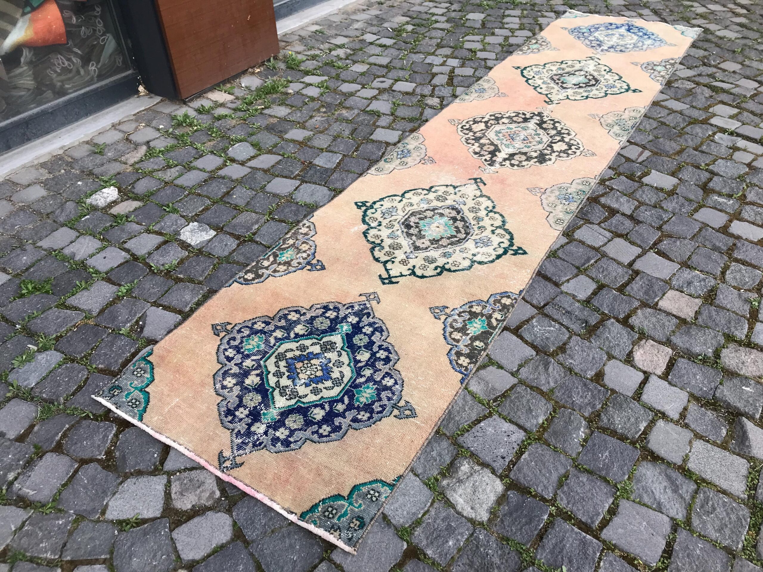 Pretty and one-of-a-kind 2.4 ft. x 11 ft. (74 cm x 336 cm) vintage Turkish rug hand-knotted in Turkey from organic wool. This is an authentic vintage Turkish rug from the 1980s that has worn splendidly to perfection.