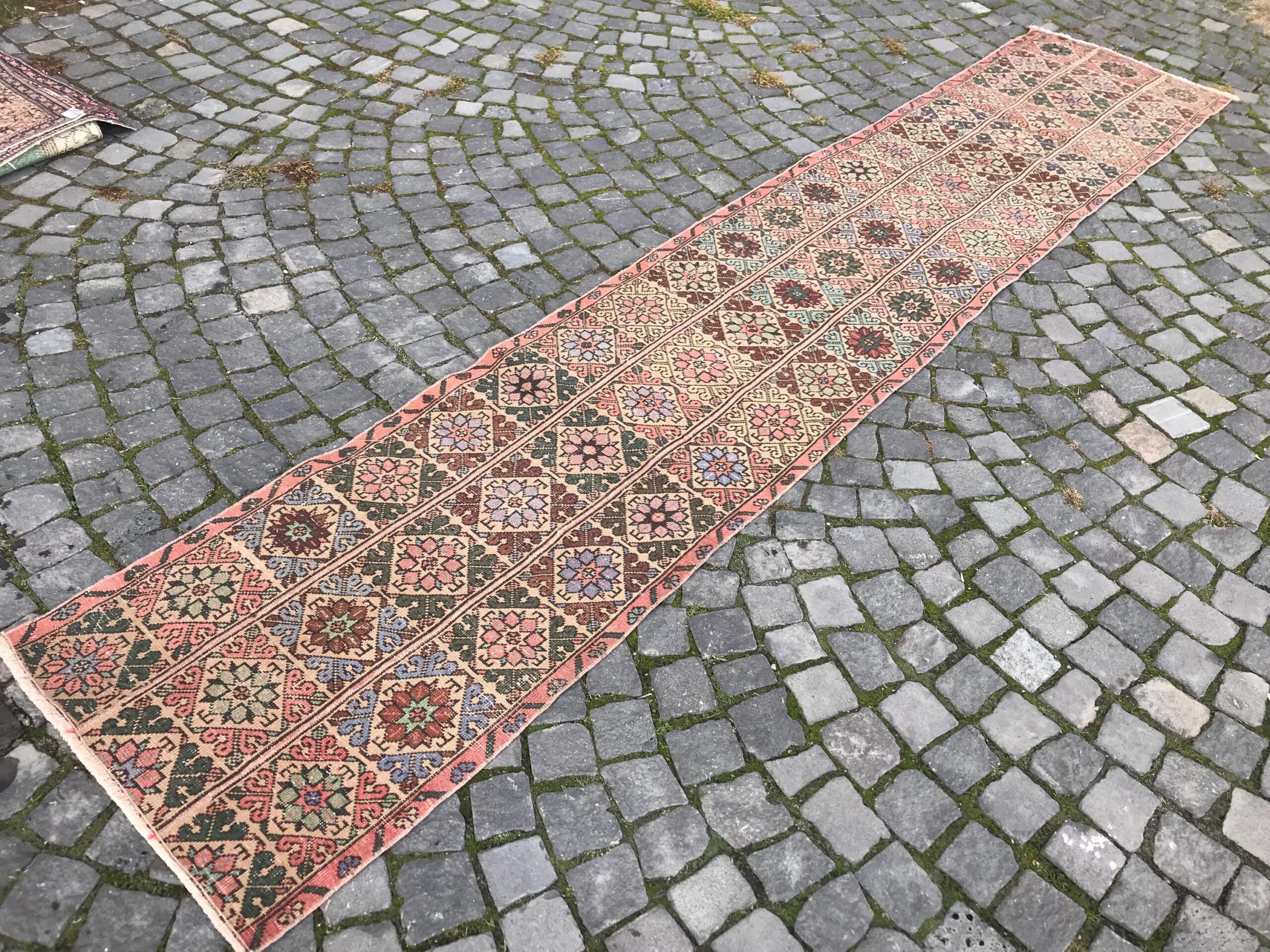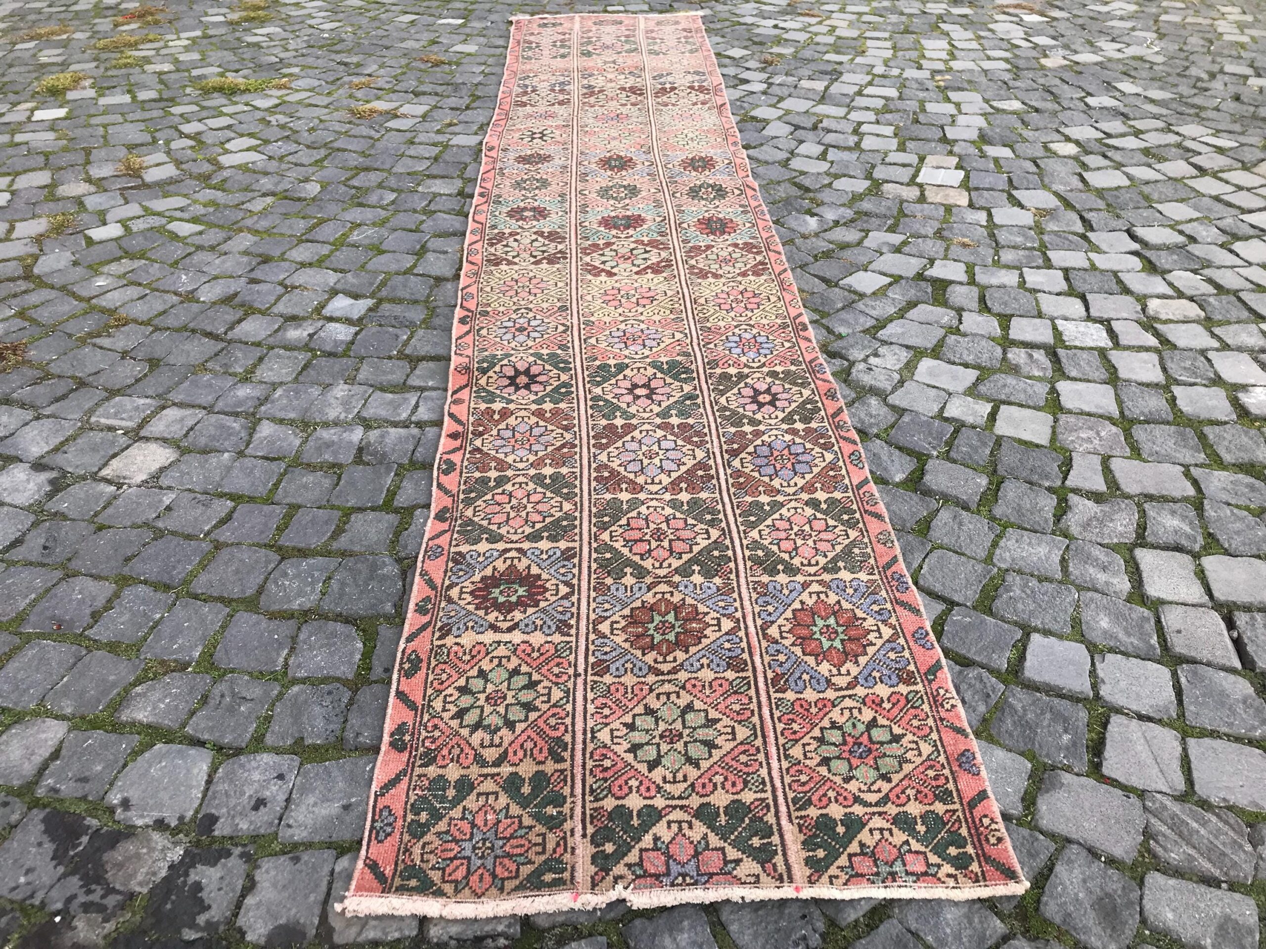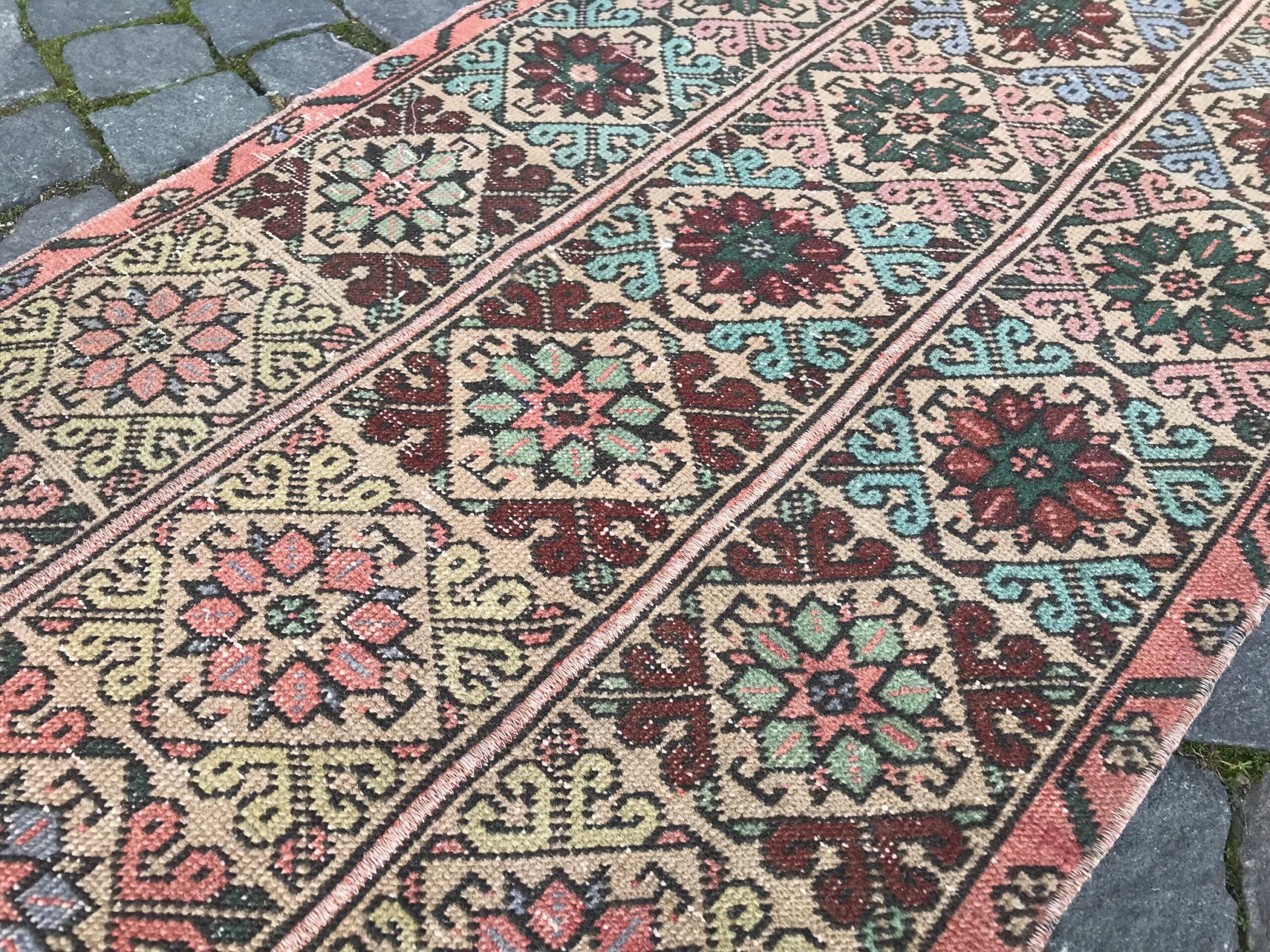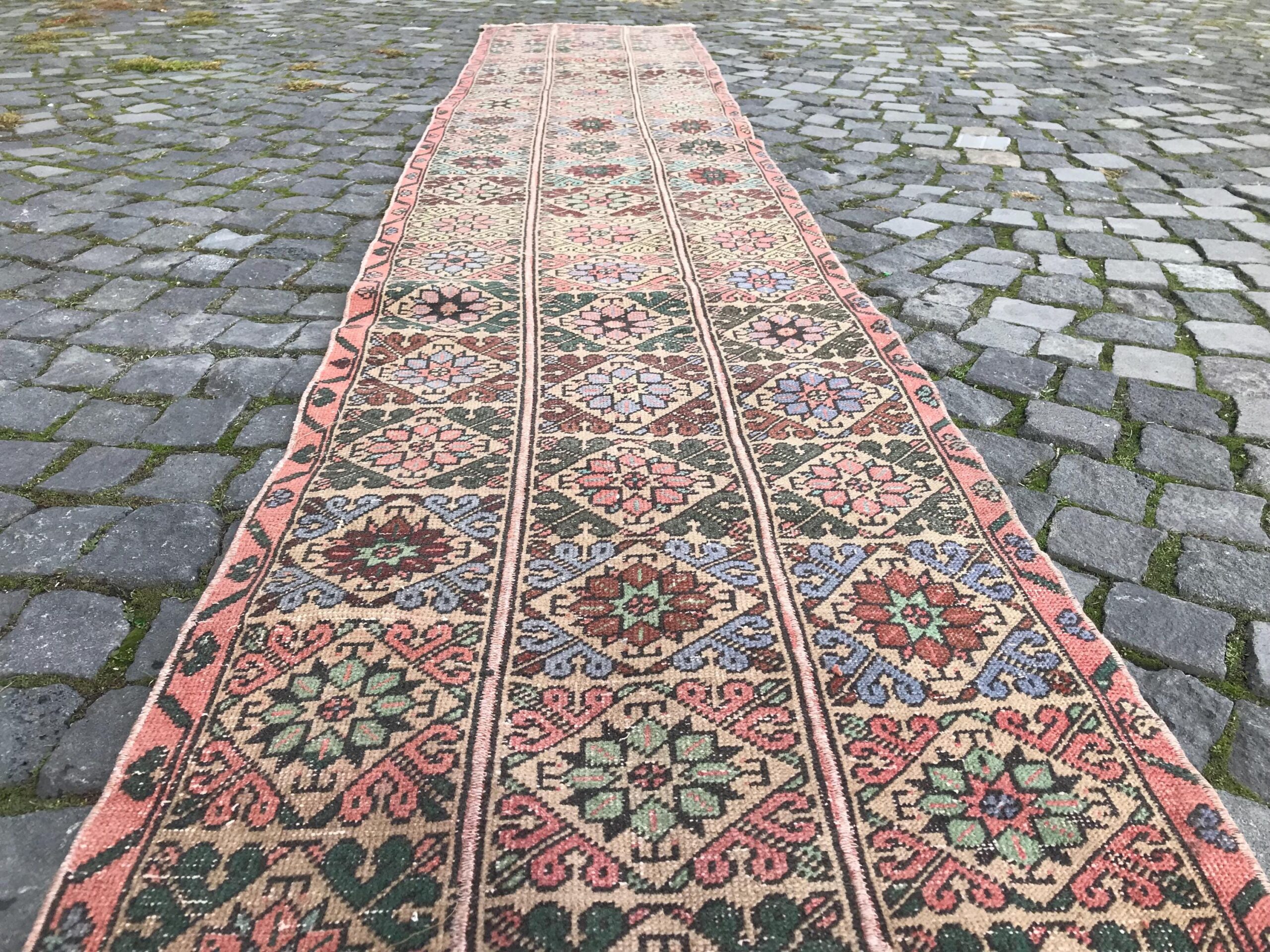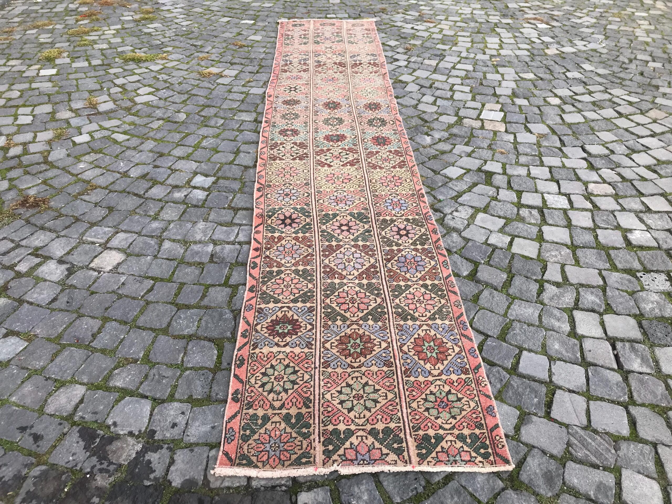 Lovely and unique 2.5 ft. x 12.7 ft. (75 cm x 386 cm) vintage Turkish rug hand-knotted in Turkey from organic wool. This is an authentic vintage Turkish rug from the 1980s that has worn beautifully to perfection.