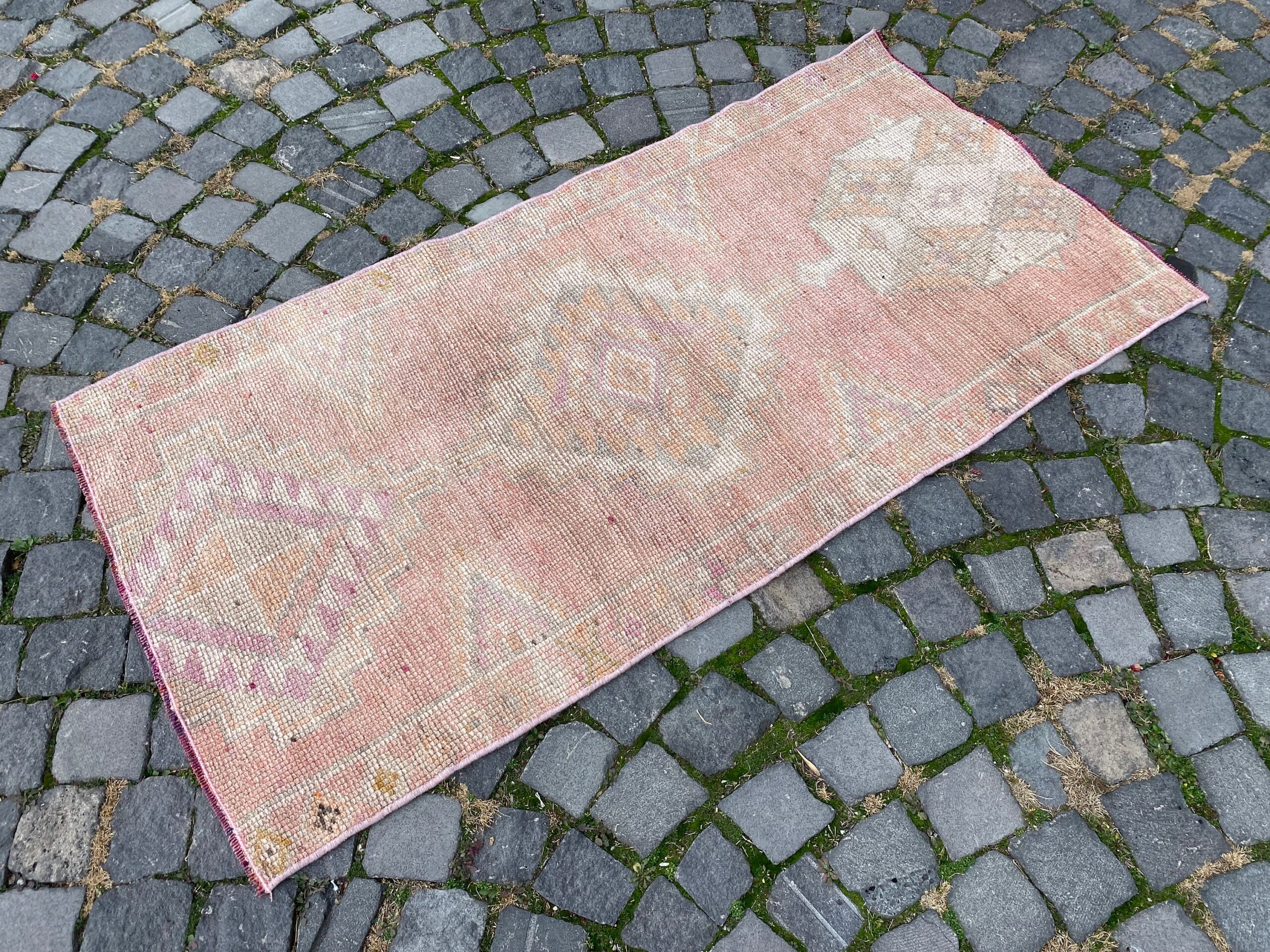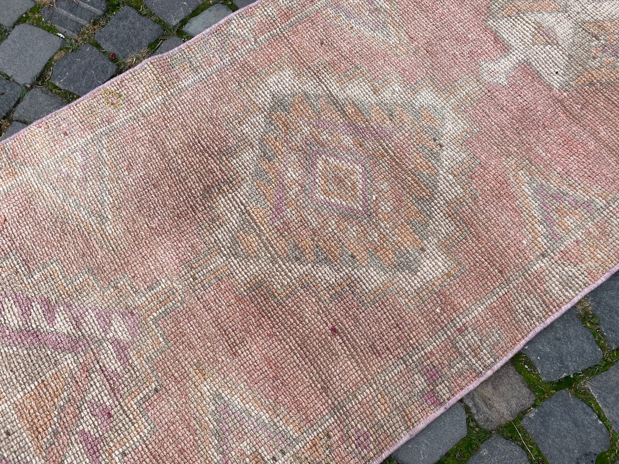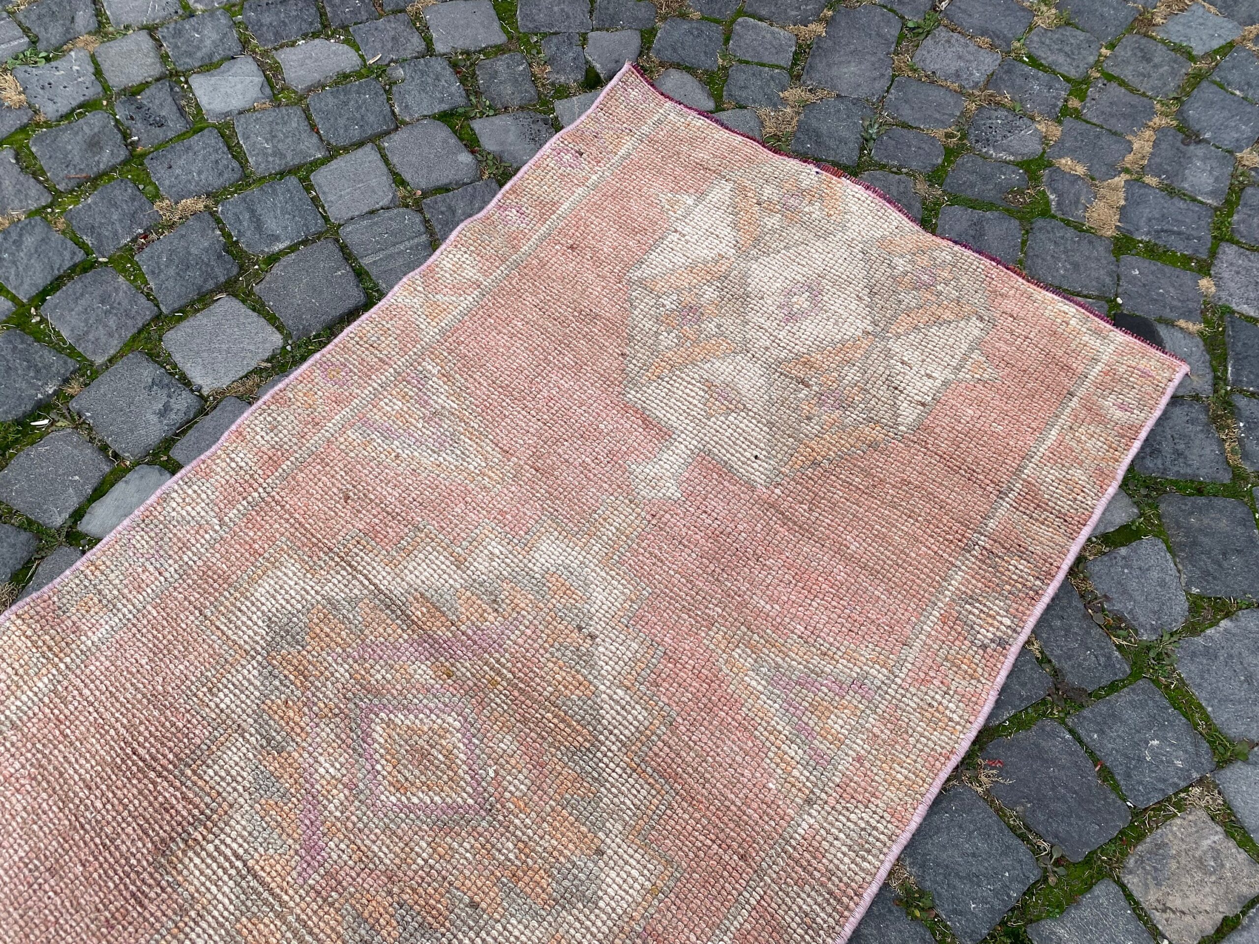Pretty and one-of-a-kind 2.5 ft. x 5.1 ft. (76 cm x 154 cm) vintage Turkish rug hand-knotted in Turkey from organic wool. This is an authentic vintage Turkish rug from the 1980s that has worn splendidly to perfection.