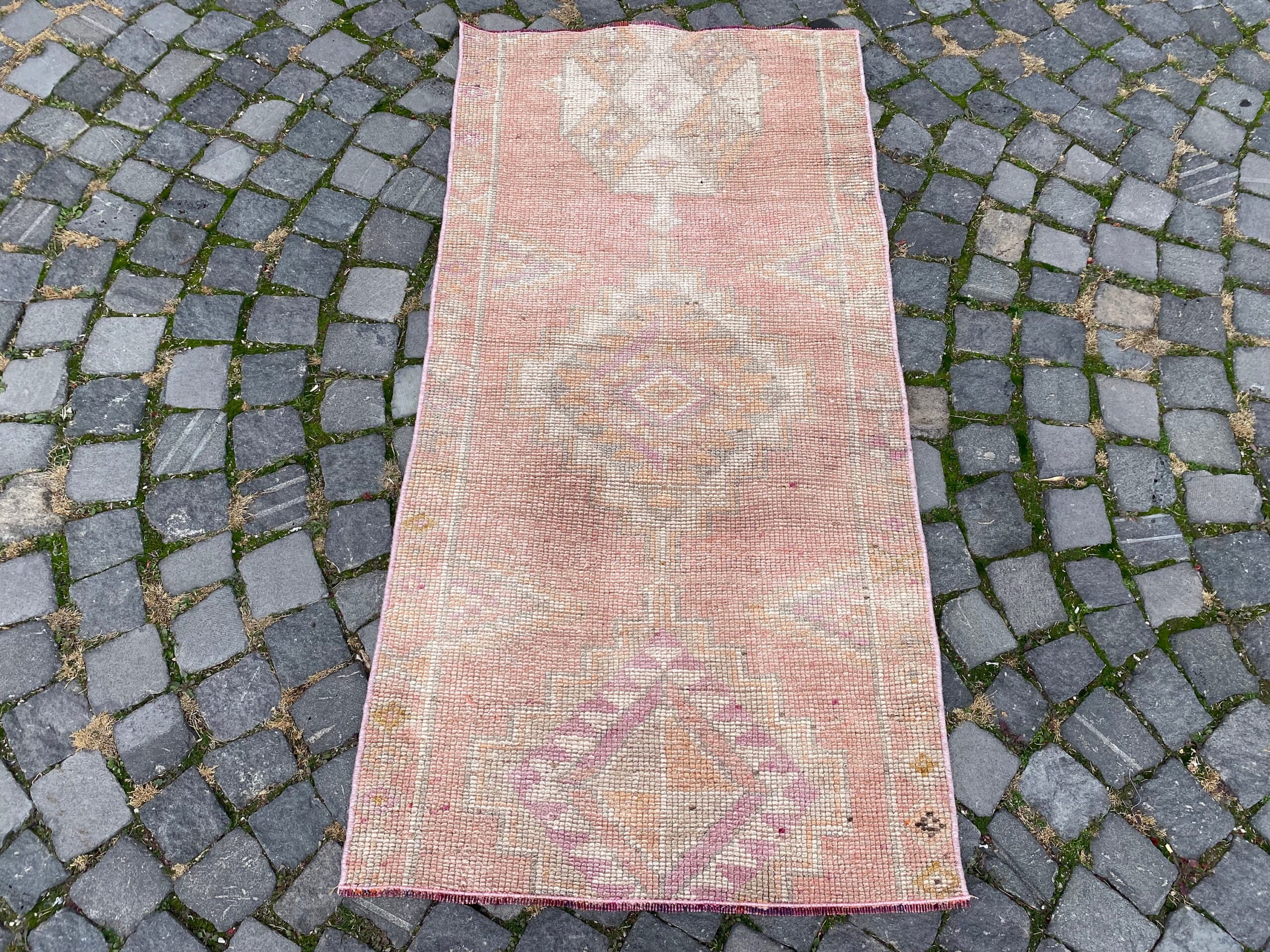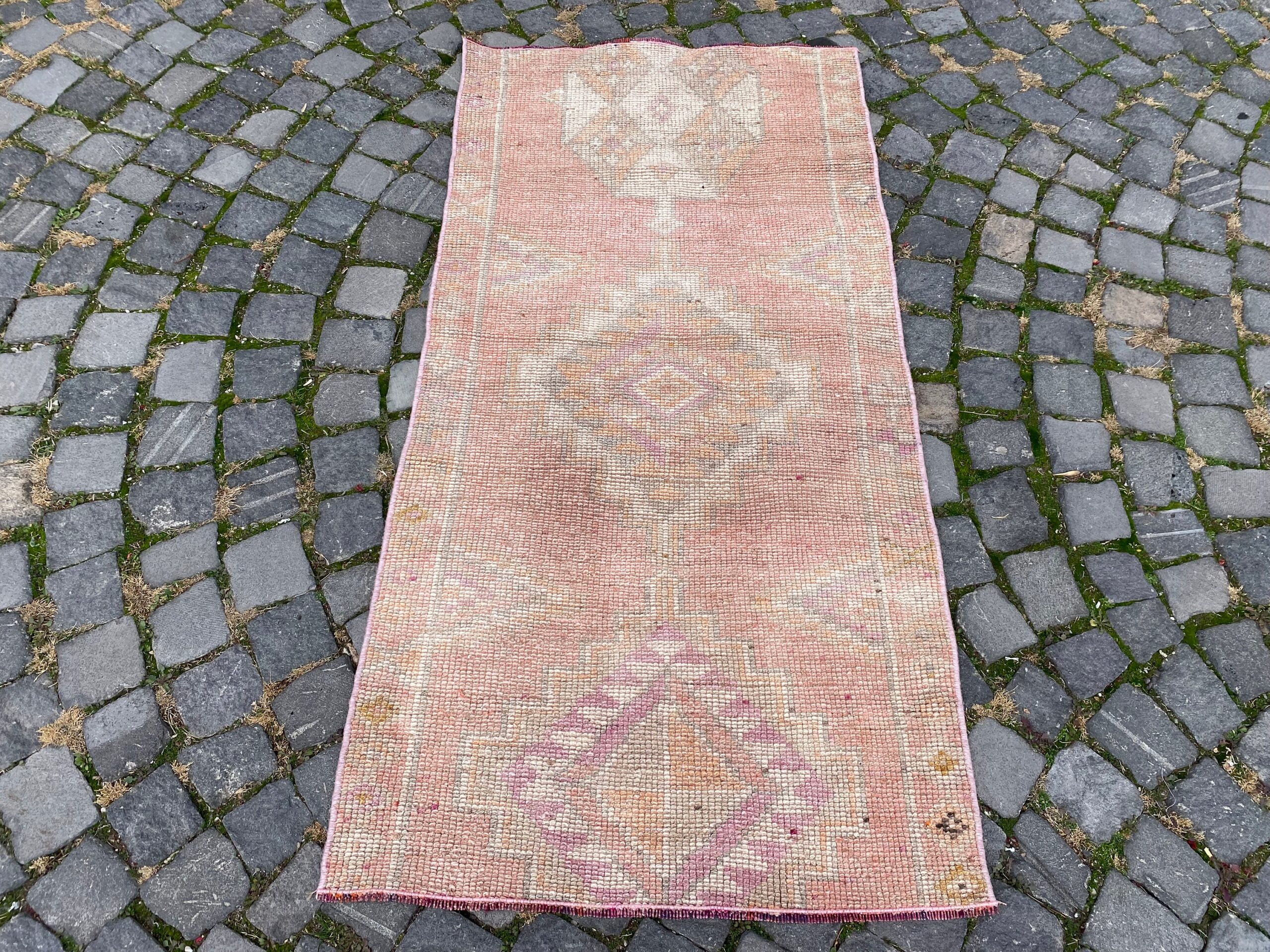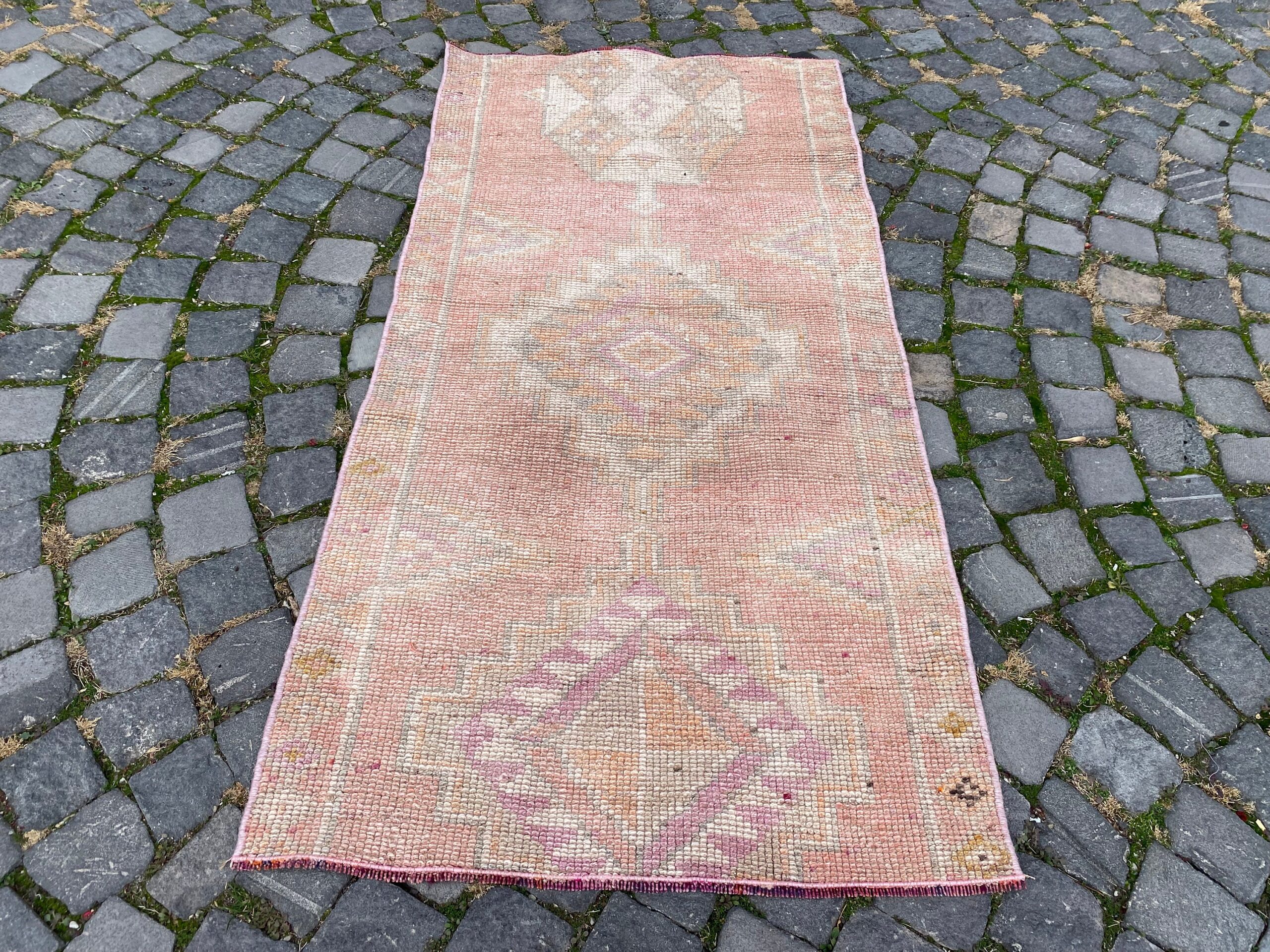 Pretty and one-of-a-kind 2.5 ft. x 5.1 ft. (76 cm x 154 cm) vintage Turkish rug hand-knotted in Turkey from organic wool. This is an authentic vintage Turkish rug from the 1980s that has worn splendidly to perfection.