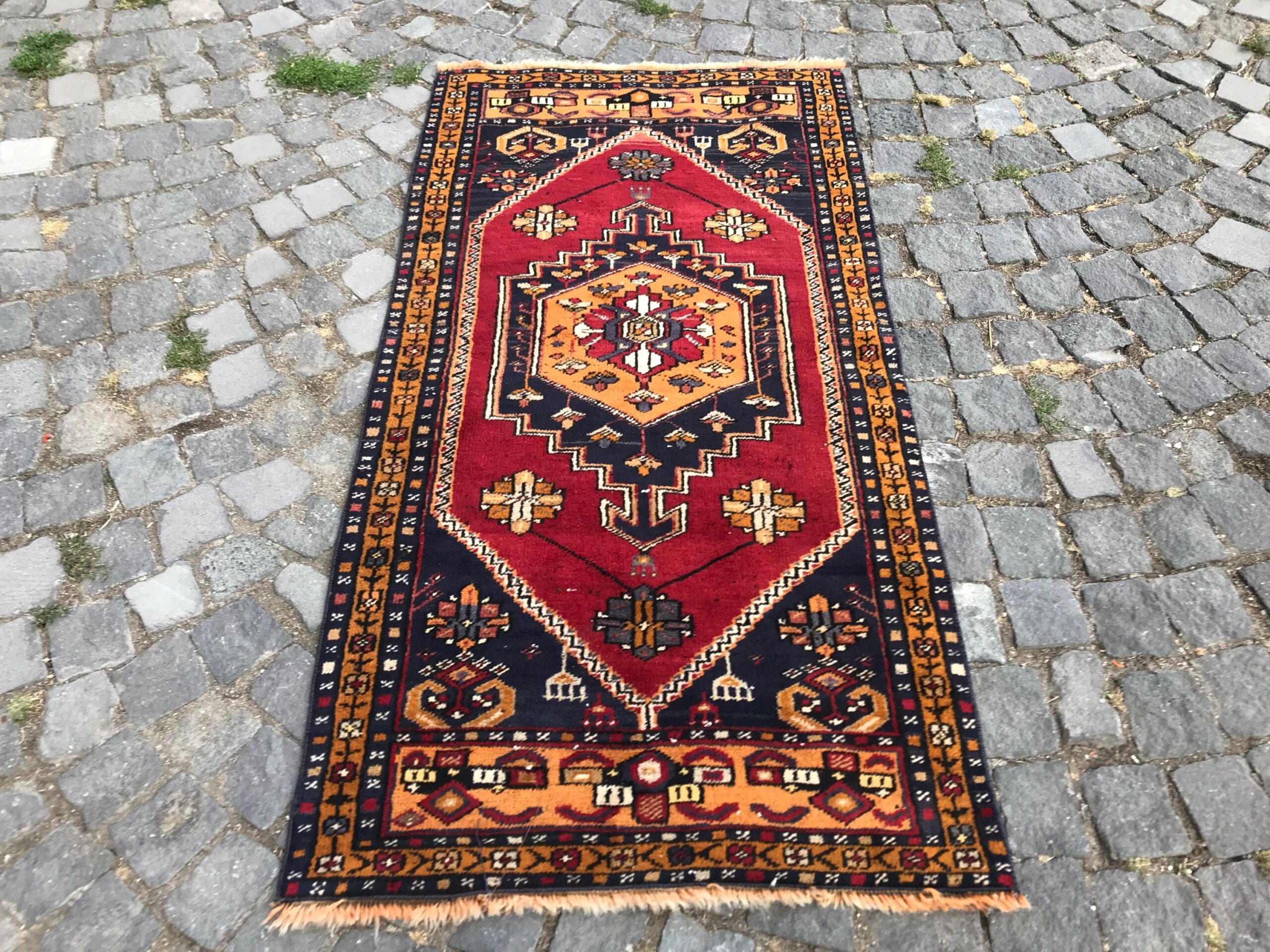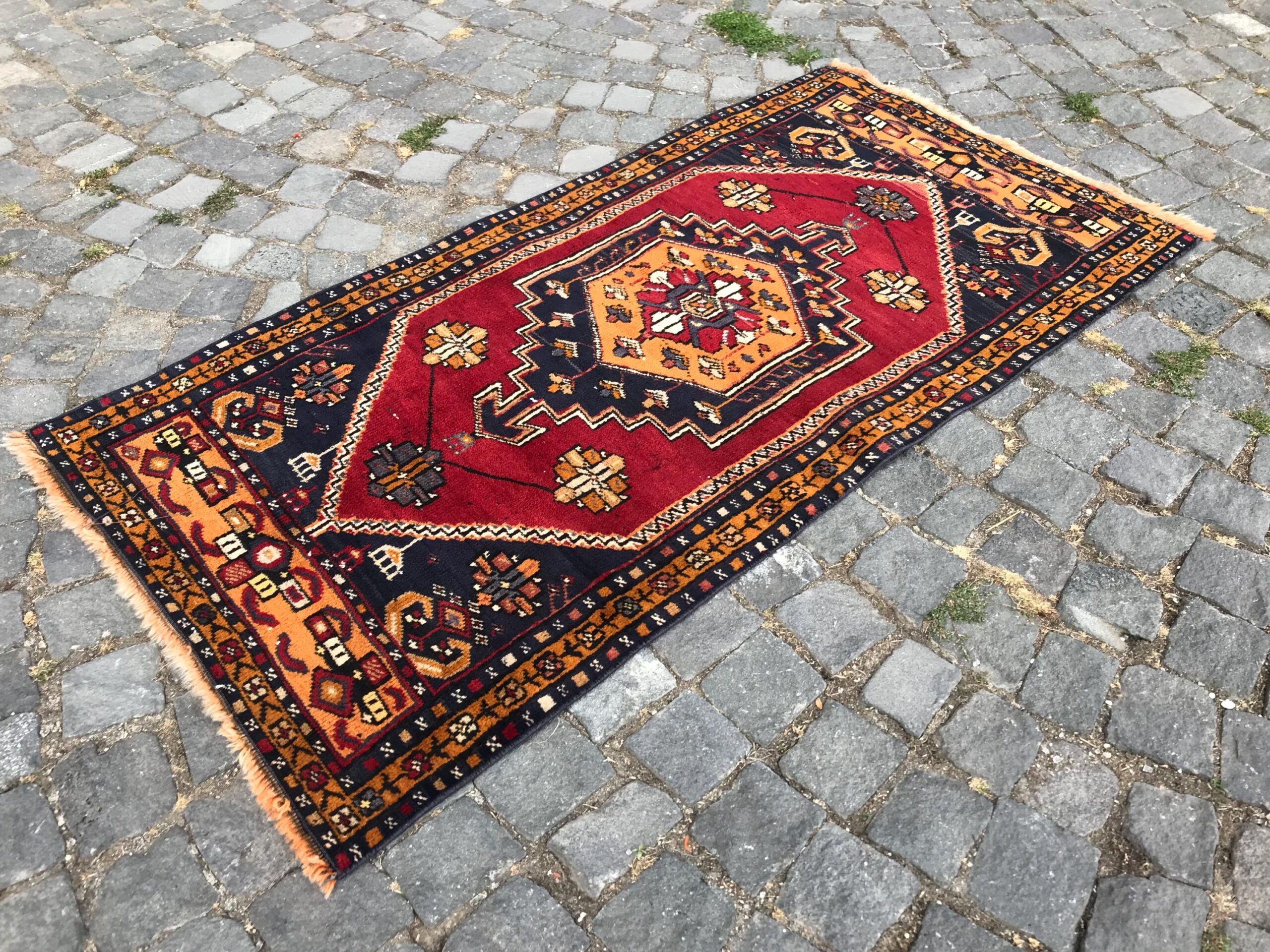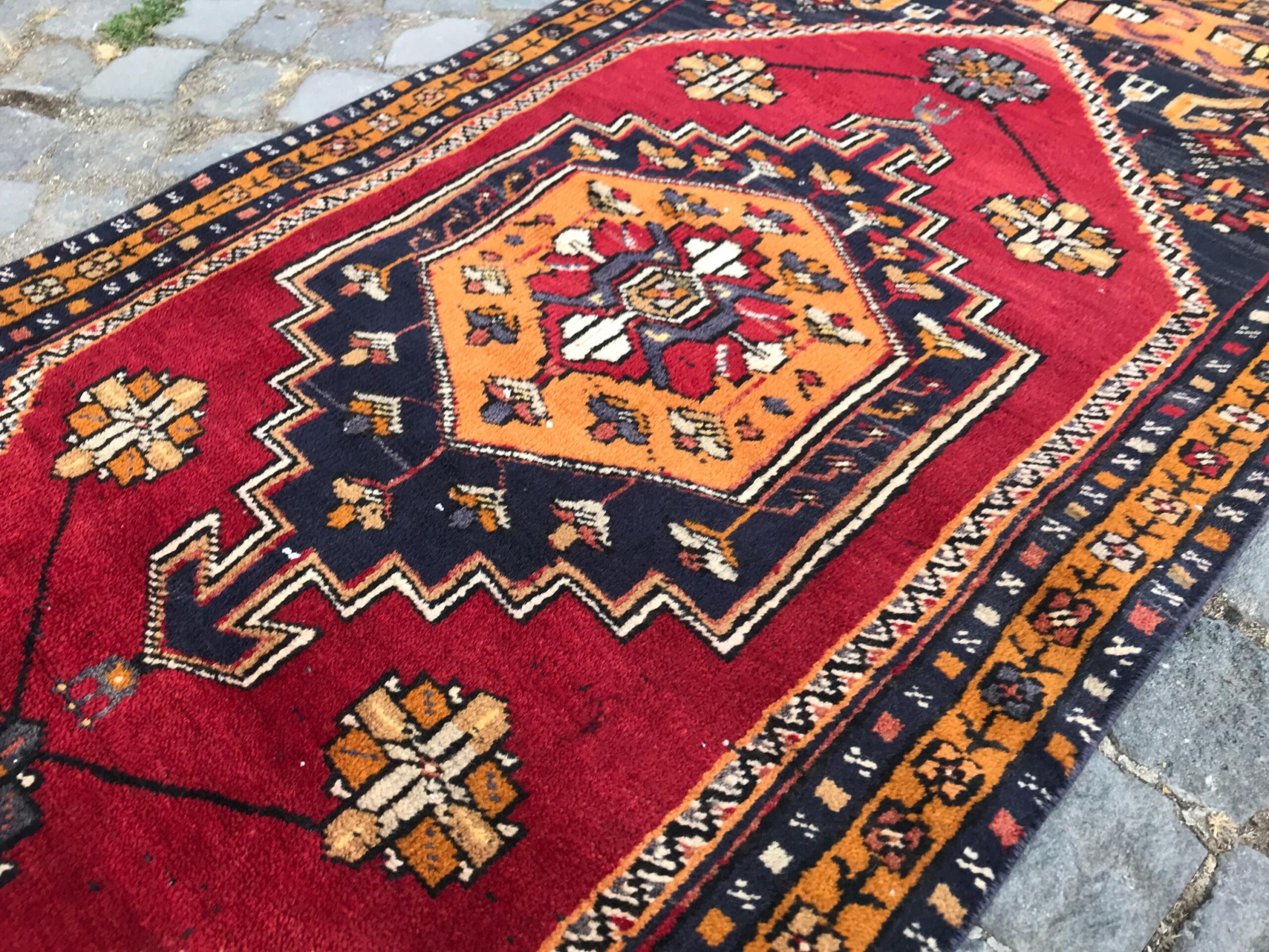 This is a vintage Turkish rug hand-knotted in a small village in Turkey by skilled Anatolian women during around the 1990s. It is made from natural wool (sheep) and dyed using all-natural (vegetable) dyes. Natural materials are more durable than synthetic materials guaranteeing a rug that can last for years while natural dyes provide colors that gets more beautiful as years pass by especially when in direct sunlight.