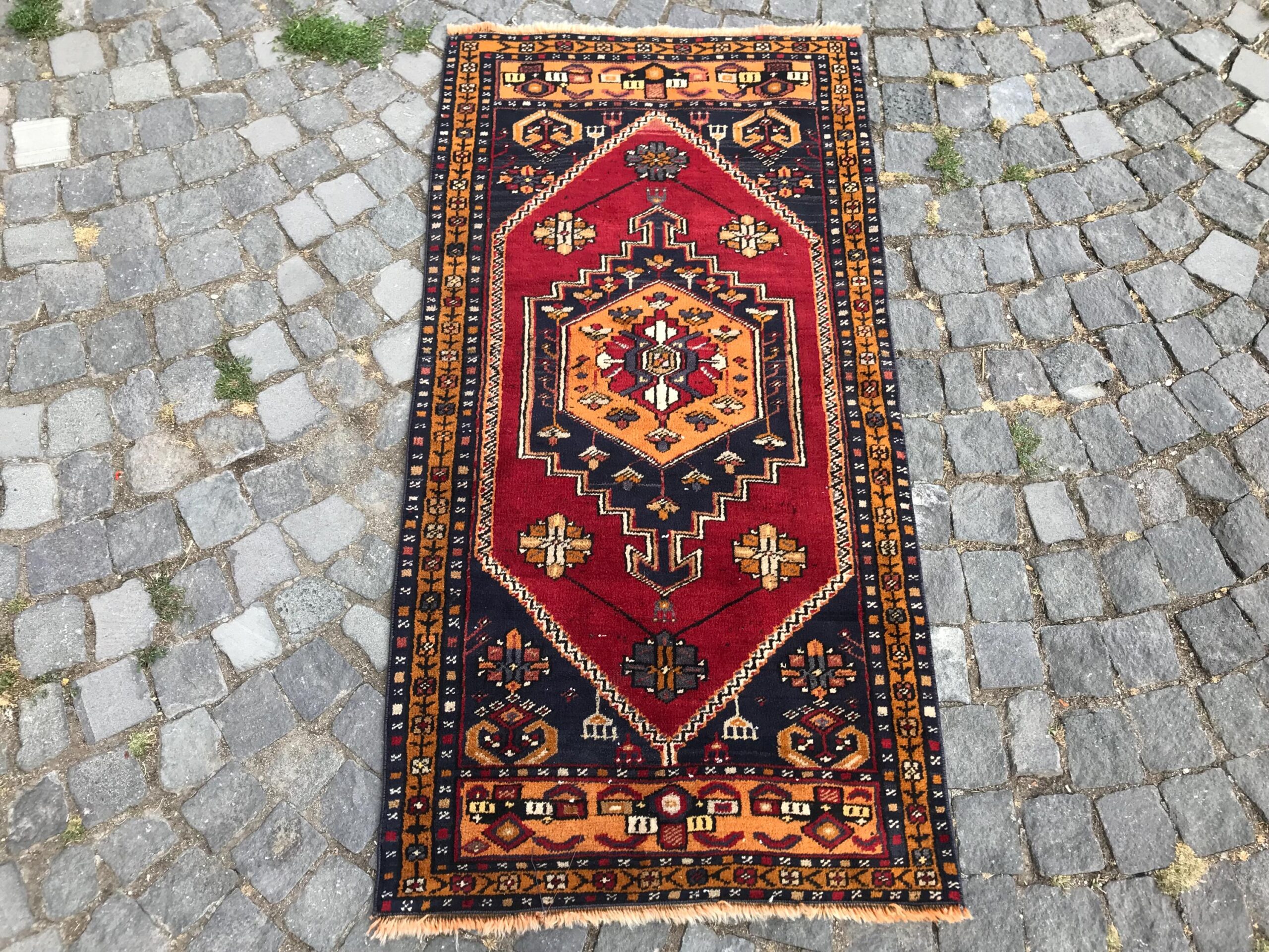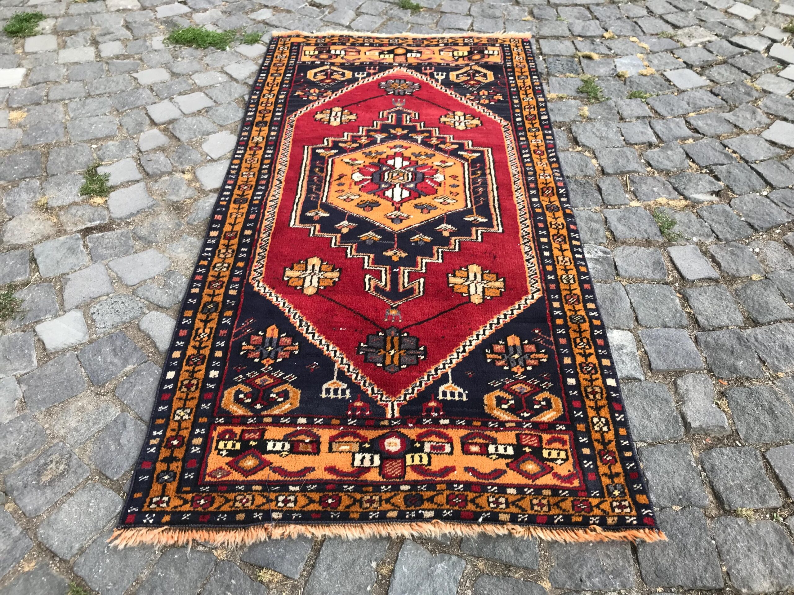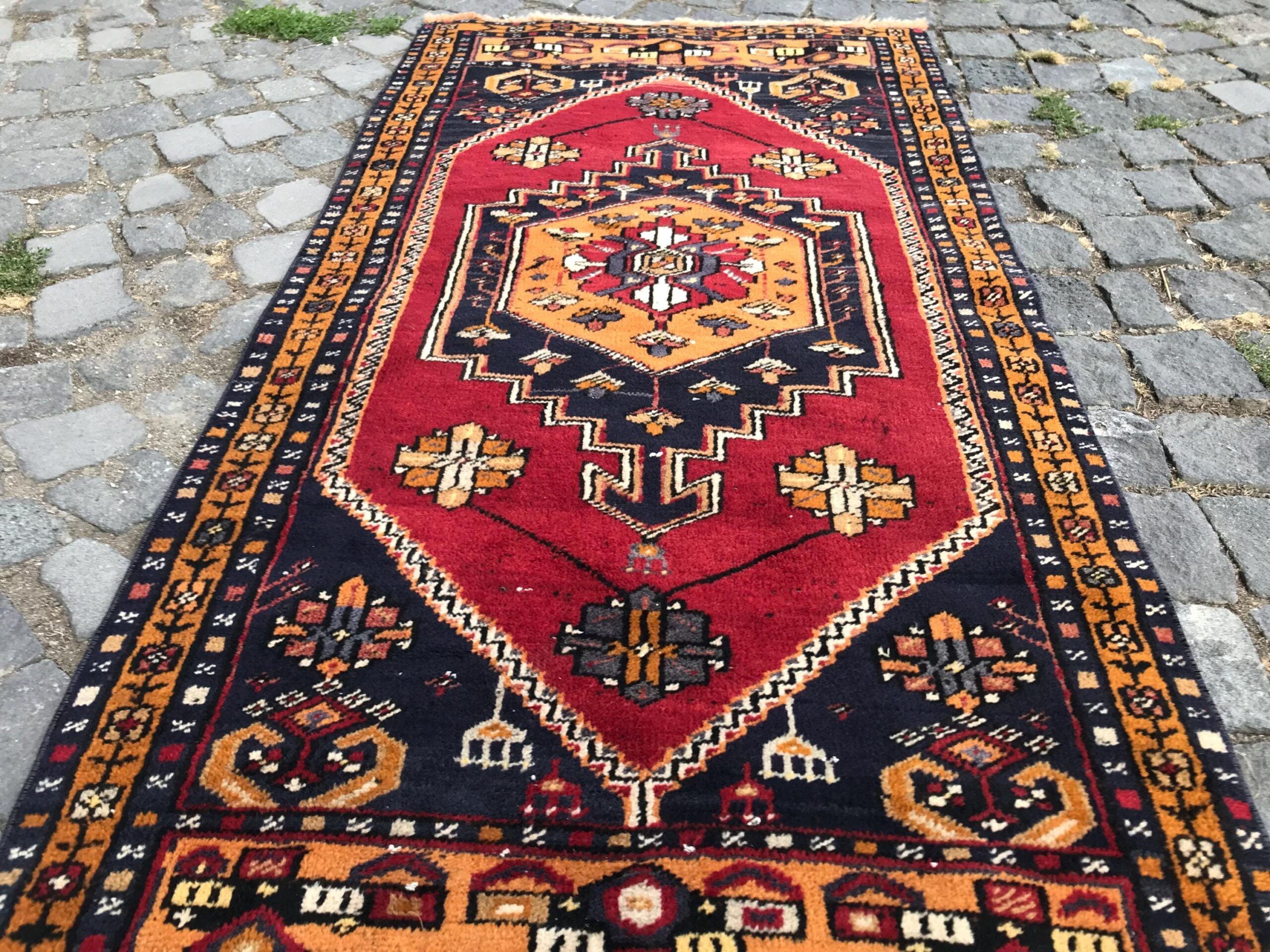 This is a vintage Turkish rug hand-knotted in a small village in Turkey by skilled Anatolian women during around the 1990s. It is made from natural wool (sheep) and dyed using all-natural (vegetable) dyes. Natural materials are more durable than synthetic materials guaranteeing a rug that can last for years while natural dyes provide colors that gets more beautiful as years pass by especially when in direct sunlight.