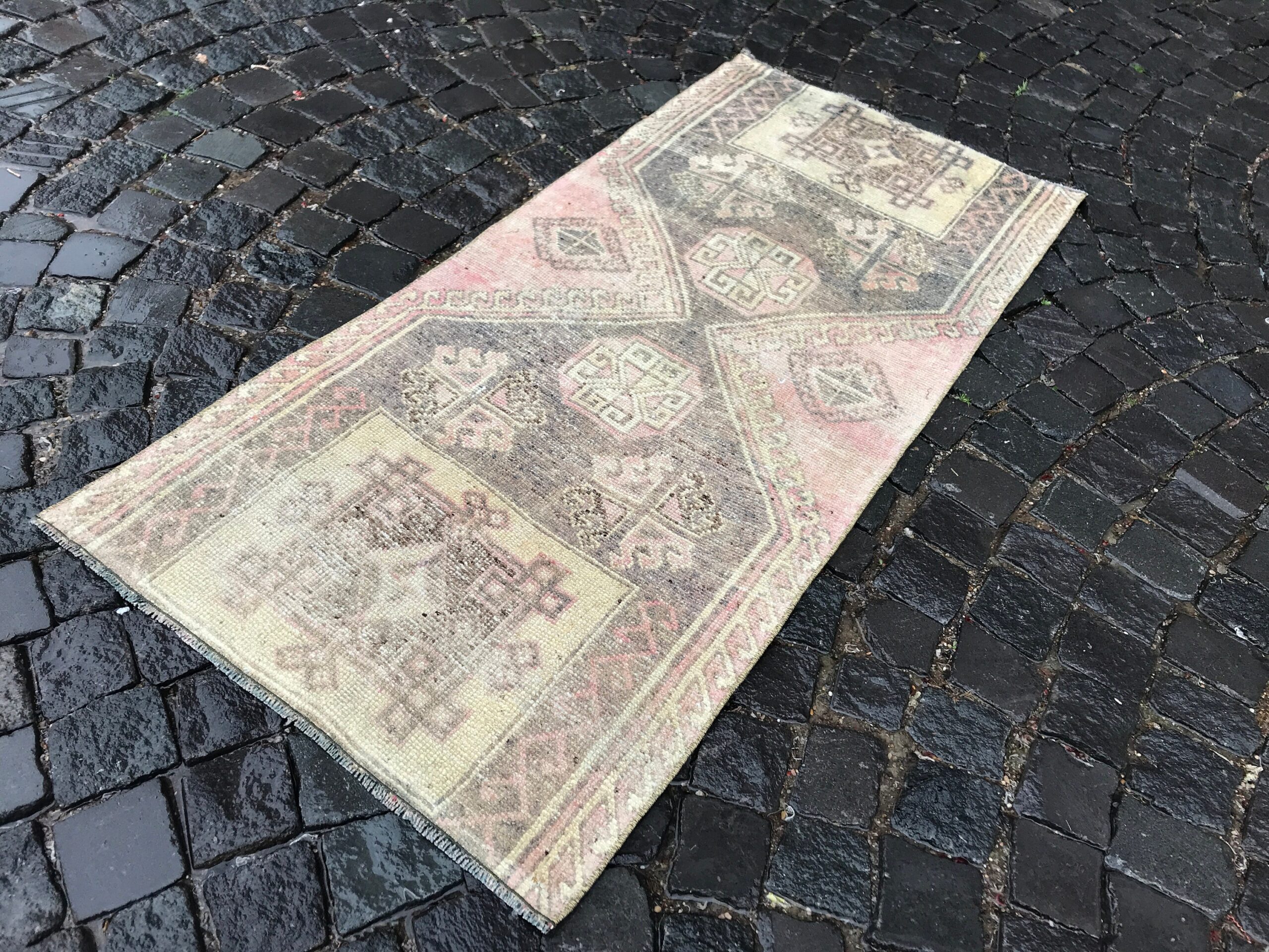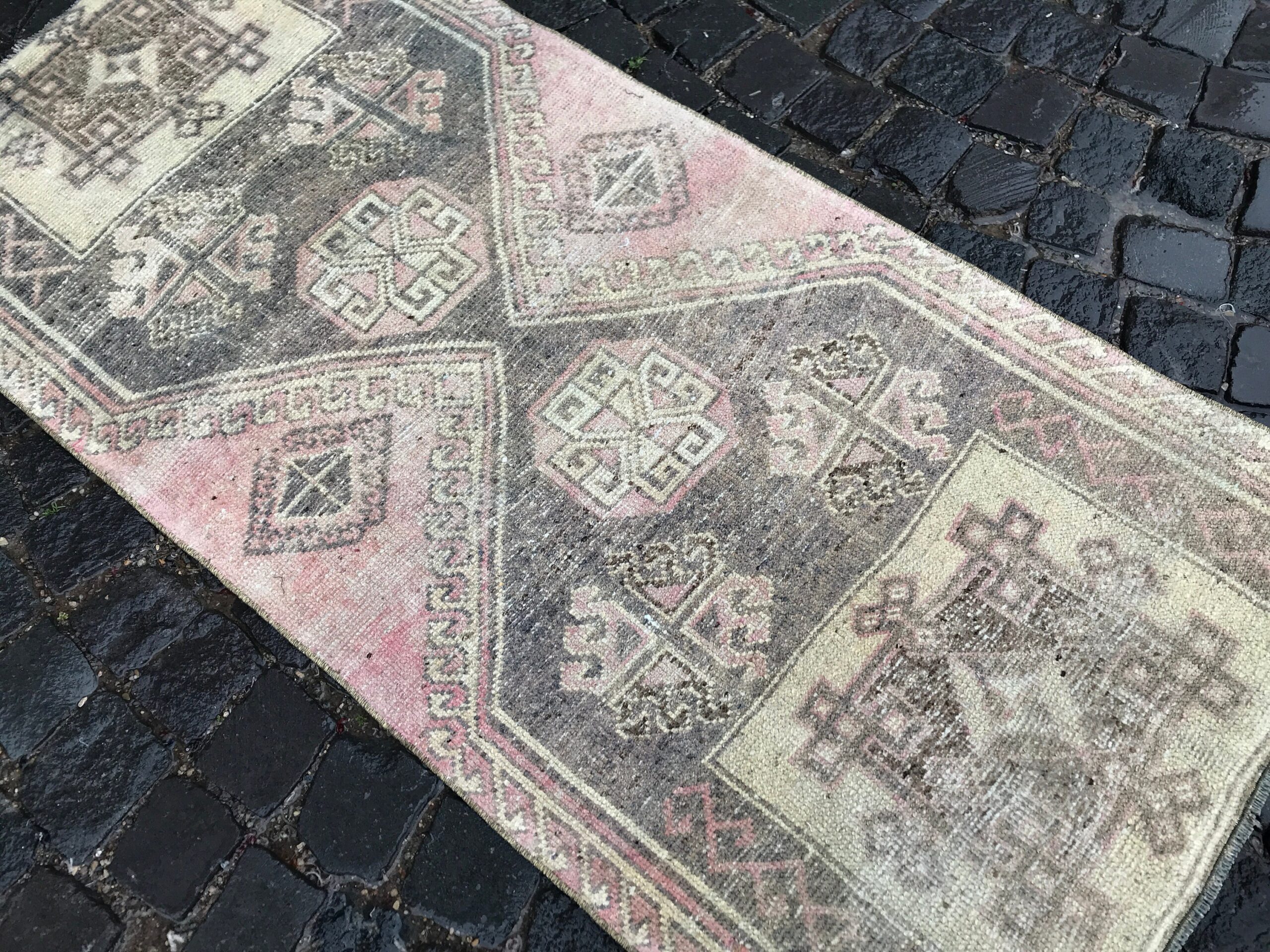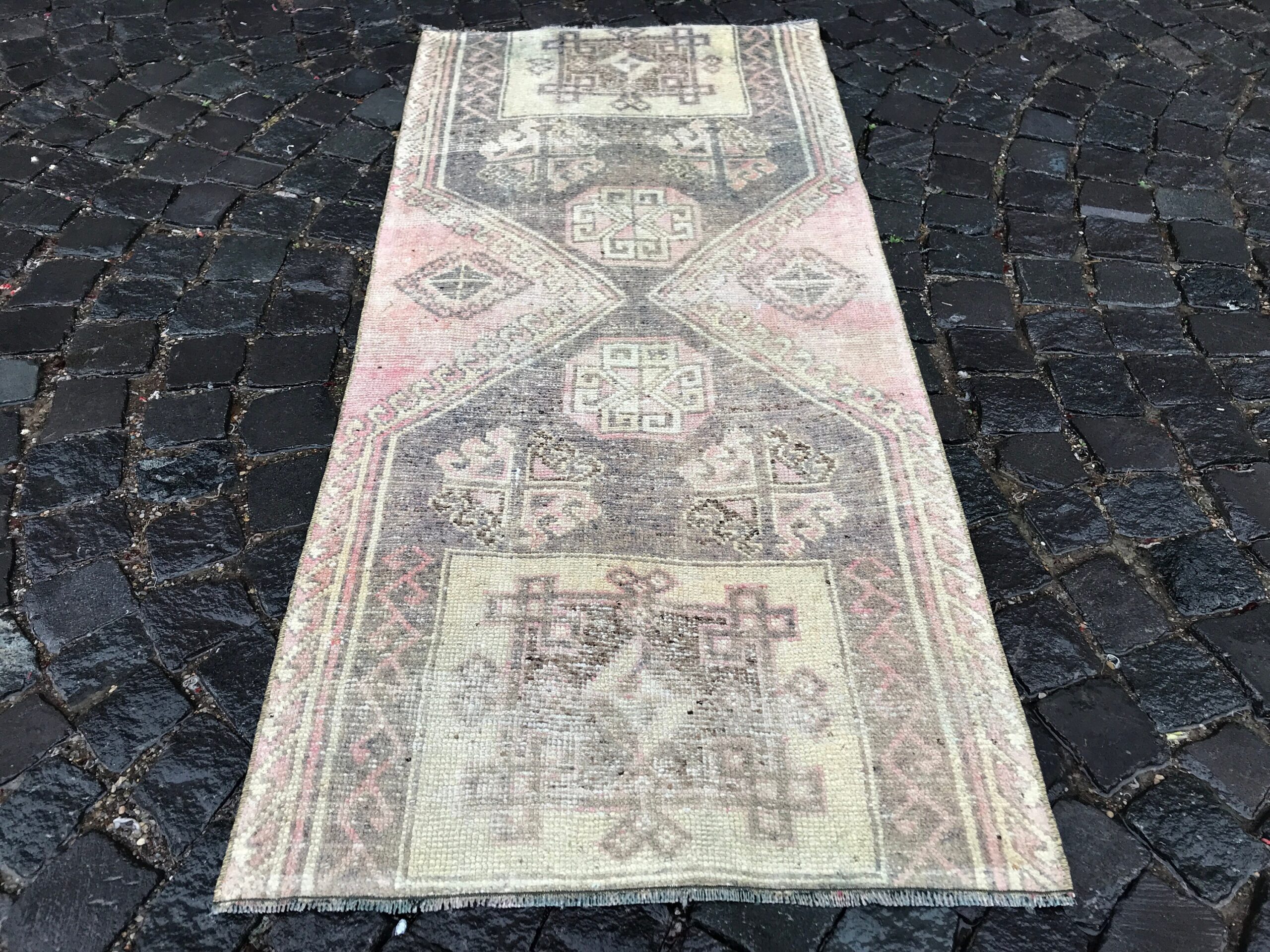 Lovely and unique 2.6 ft. x 5.5 ft. (78 cm x 168 cm) vintage Turkish rug hand-knotted in Turkey from organic wool. This is an authentic vintage Turkish rug from the 1970s that has worn beautifully to perfection.