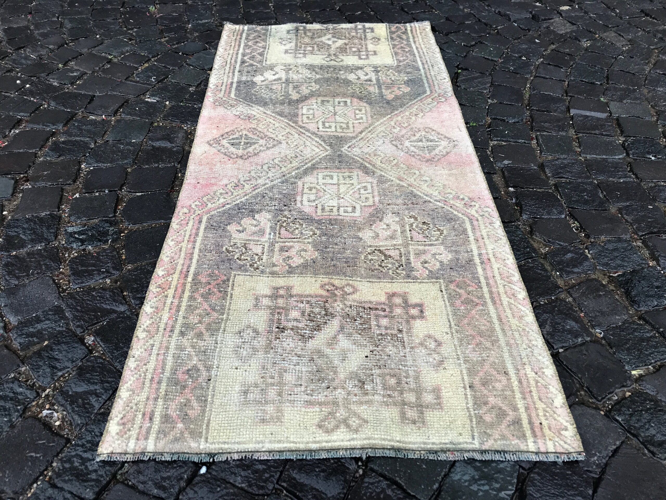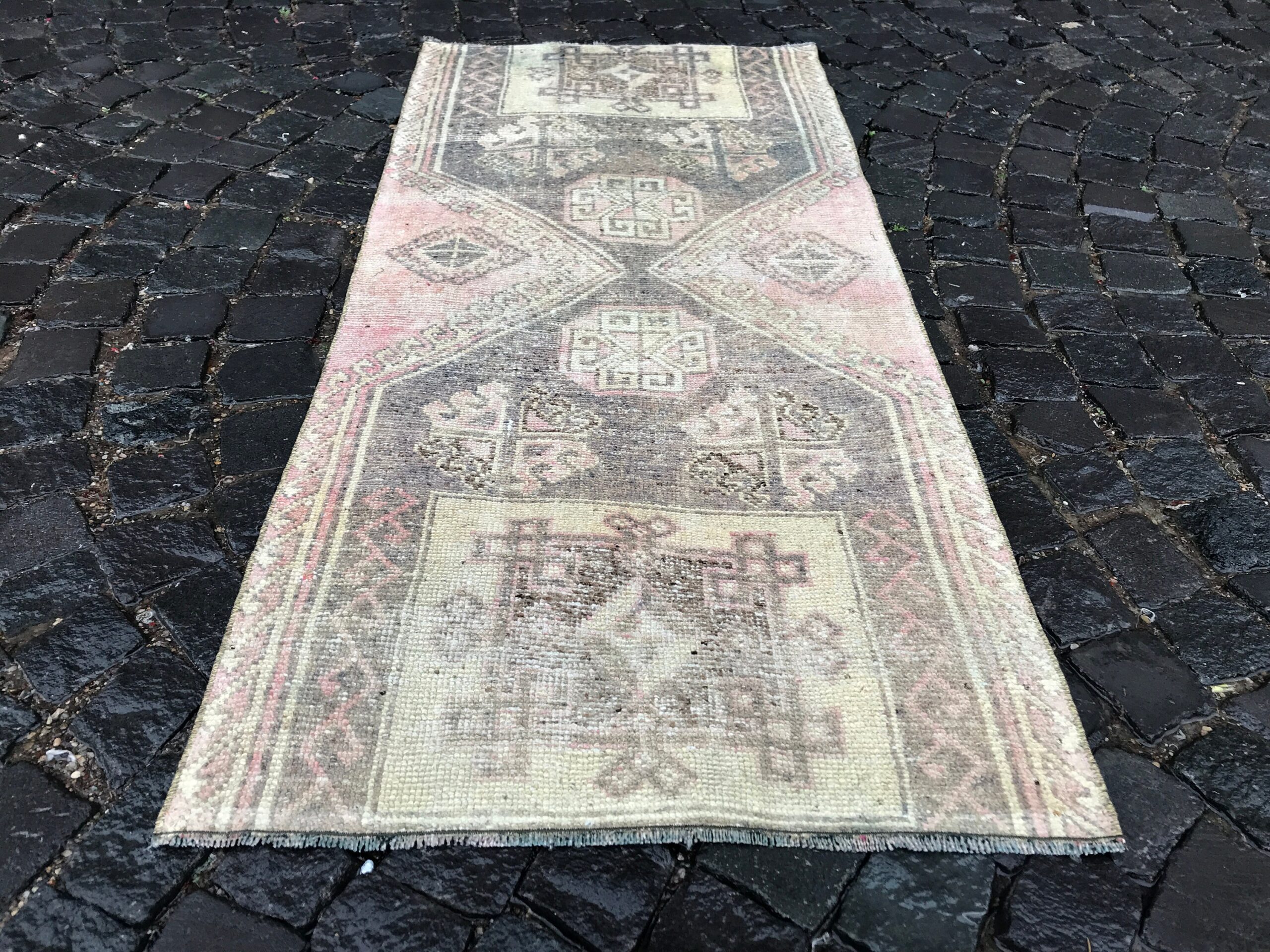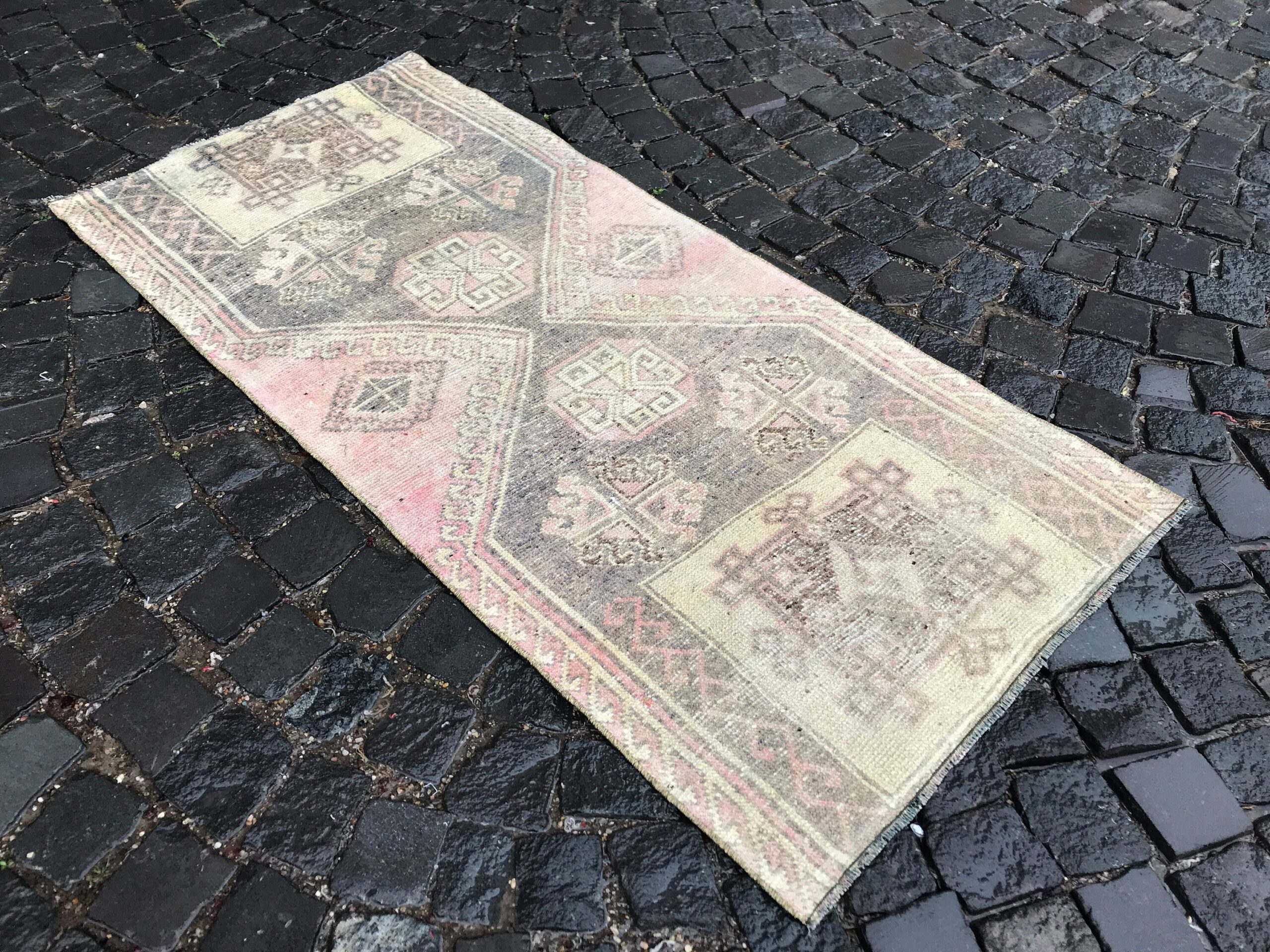Lovely and unique 2.6 ft. x 5.5 ft. (78 cm x 168 cm) vintage Turkish rug hand-knotted in Turkey from organic wool. This is an authentic vintage Turkish rug from the 1970s that has worn beautifully to perfection.