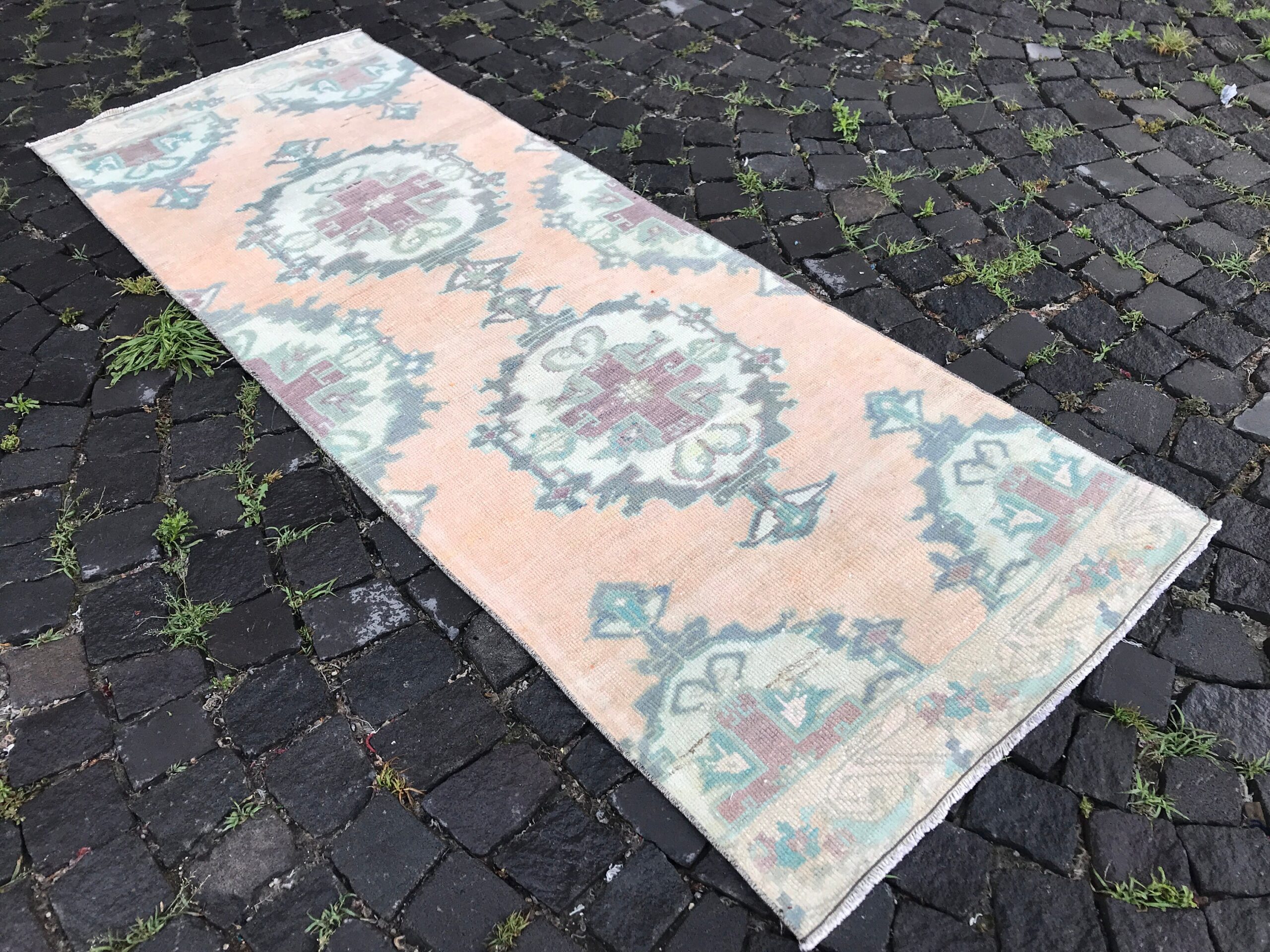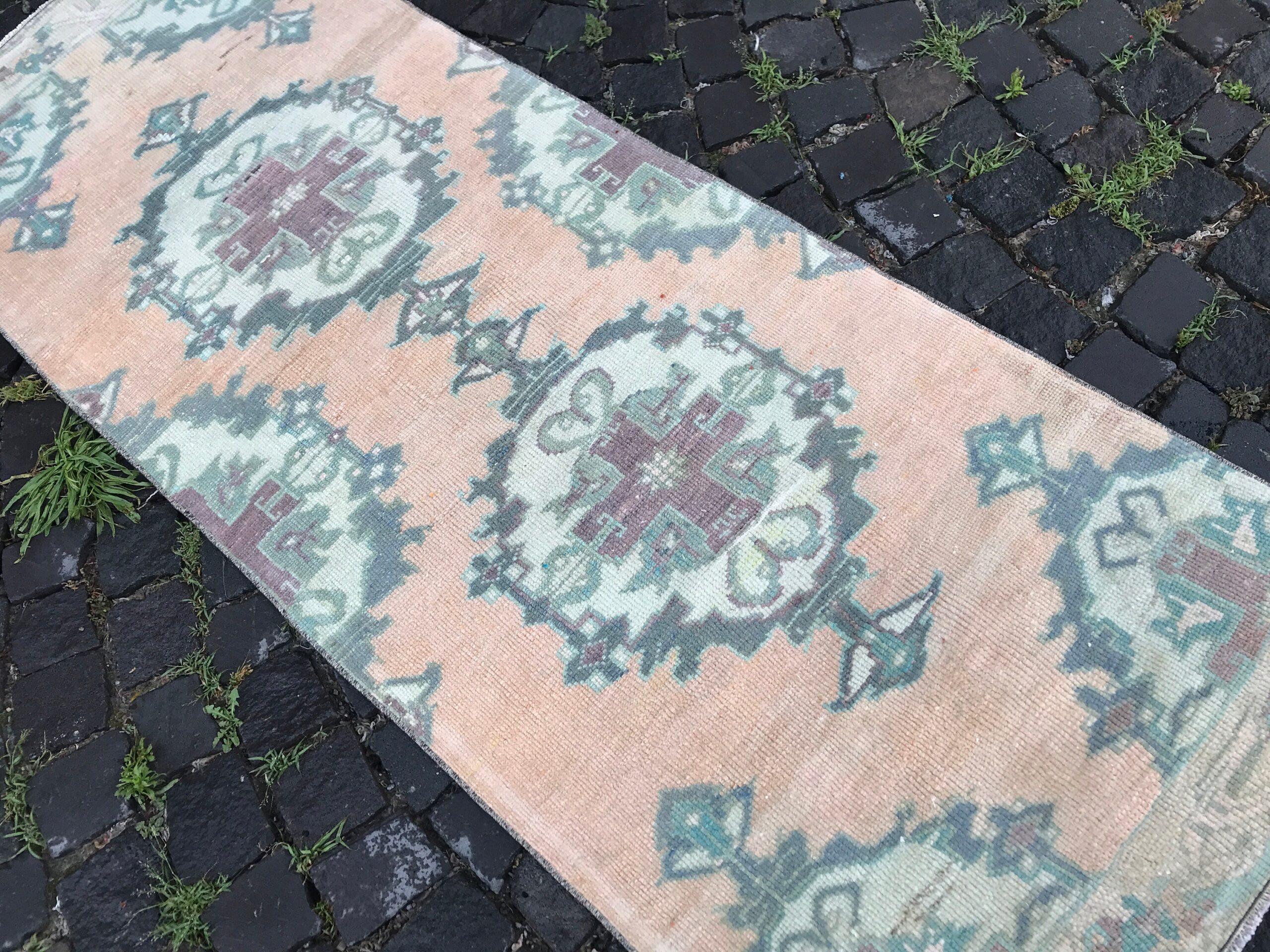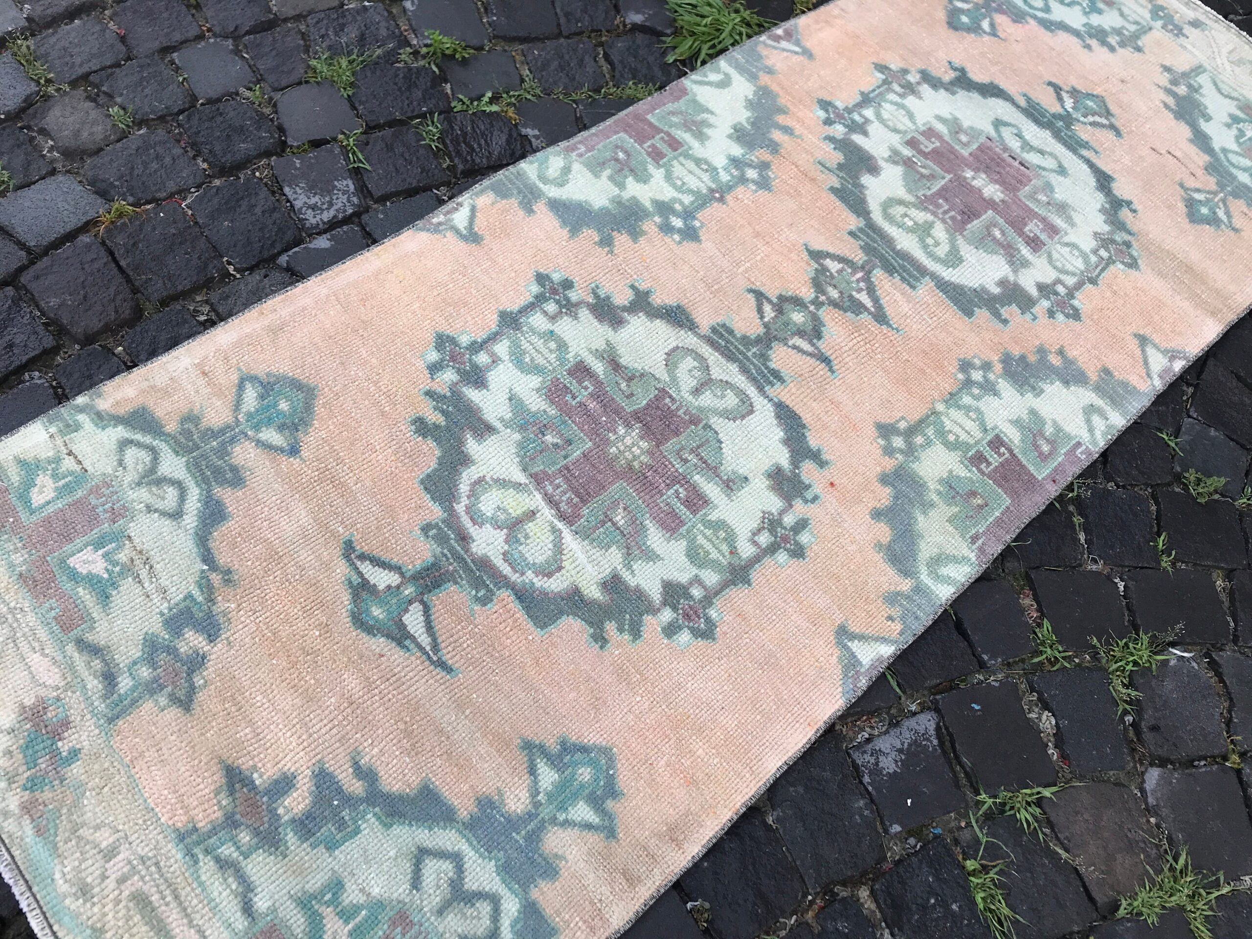 Lovely and unique 2.6 ft. x 6.9 ft. (78 cm x 209 cm) vintage Turkish rug hand-knotted in Turkey from organic wool. This is an authentic vintage Turkish rug from the 1980s that has worn beautifully to perfection.