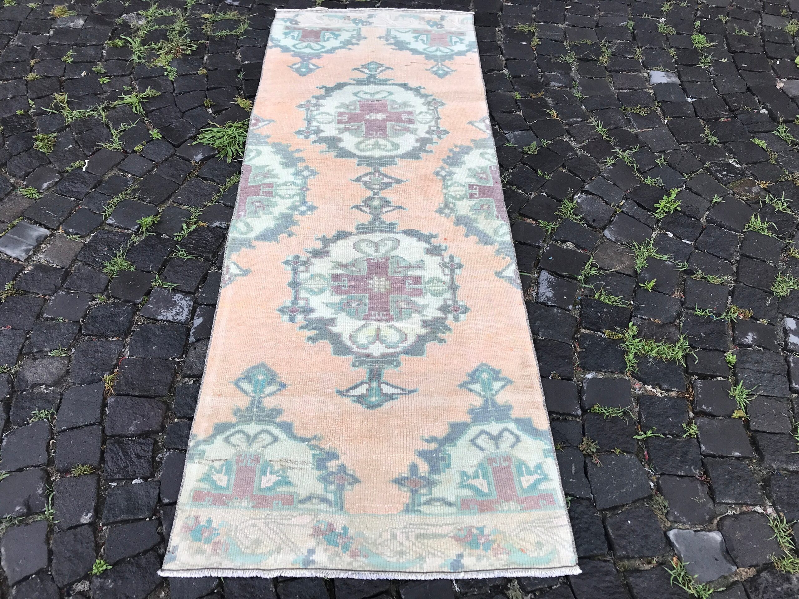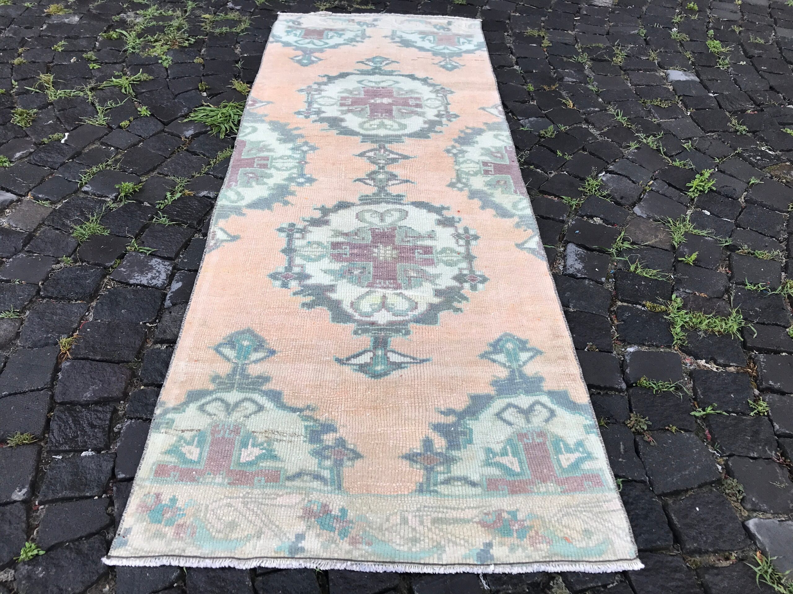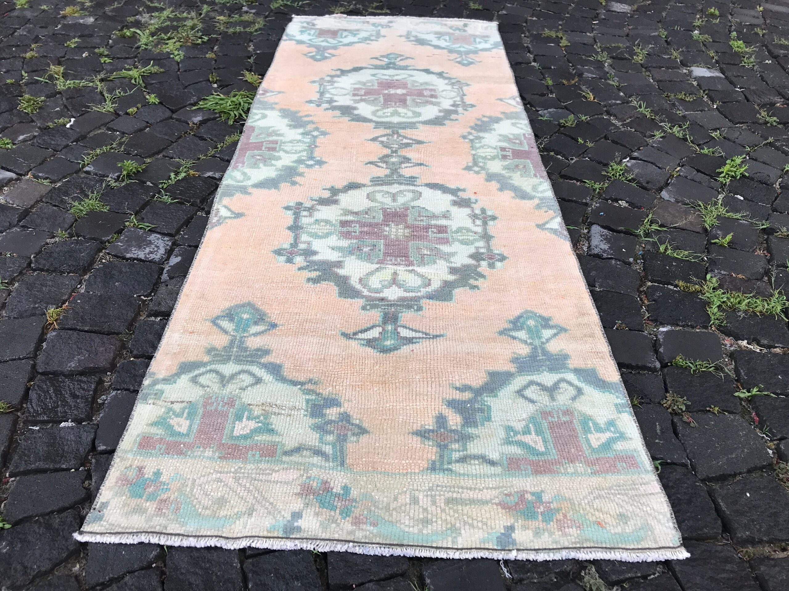 Lovely and unique 2.6 ft. x 6.9 ft. (78 cm x 209 cm) vintage Turkish rug hand-knotted in Turkey from organic wool. This is an authentic vintage Turkish rug from the 1980s that has worn beautifully to perfection.