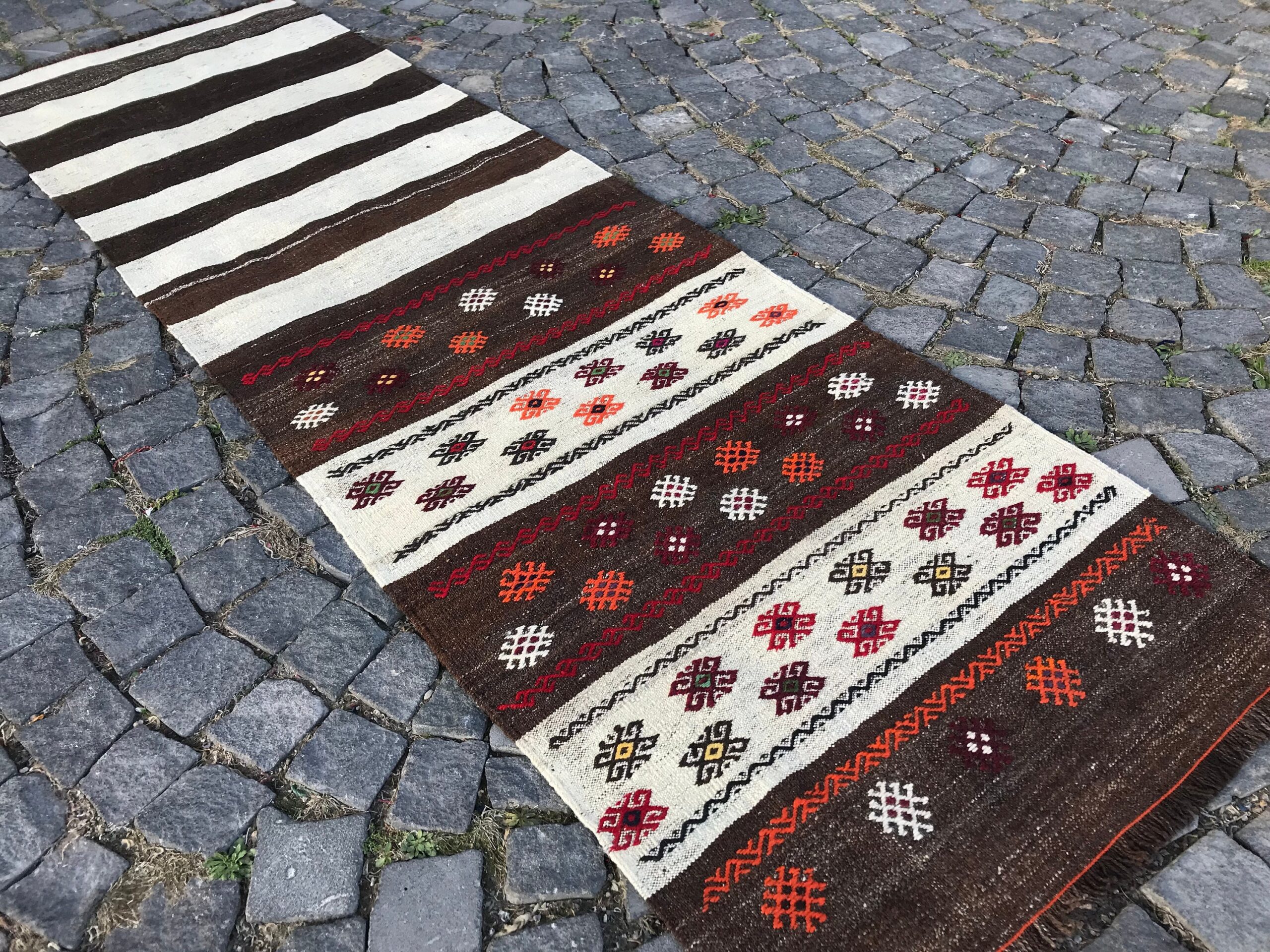 This is a vintage kilim rug hand-woven in a small village in Turkey by skilled Anatolian women during around the 1980s. It is made from natural wool (sheep) and dyed using all-natural (vegetable) dyes. Natural materials are more durable than synthetic materials guaranteeing a rug that can last for years while natural dyes provide colors that gets more beautiful as years pass by especially when in direct sunlight.